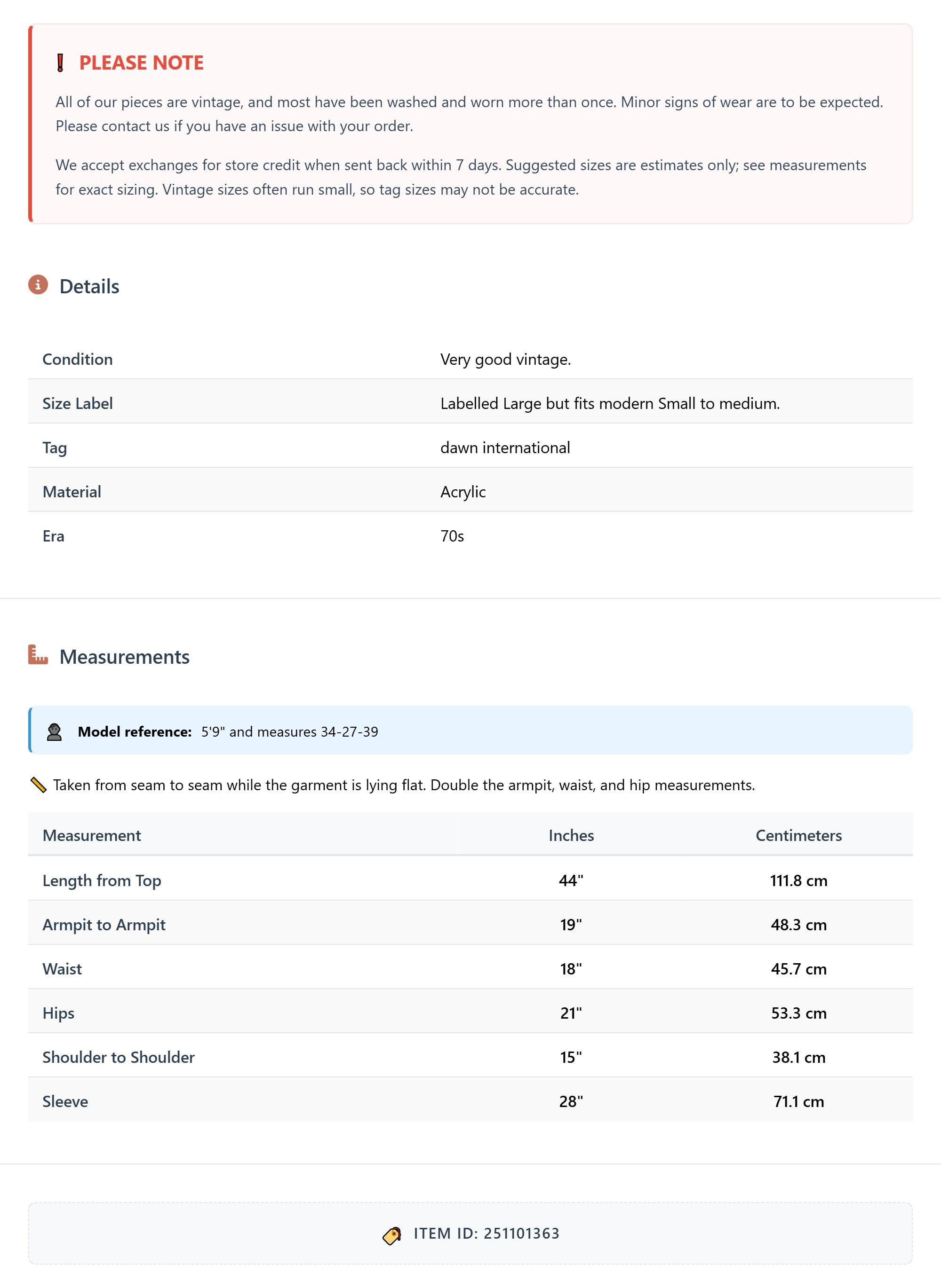 All of our pieces are vintage, and most have been washed and worn more than once. Minor signs of wear are to be expected. Please contact us if you have an issue with your order. We accept exchanges for store credit when sent back within 7 days.