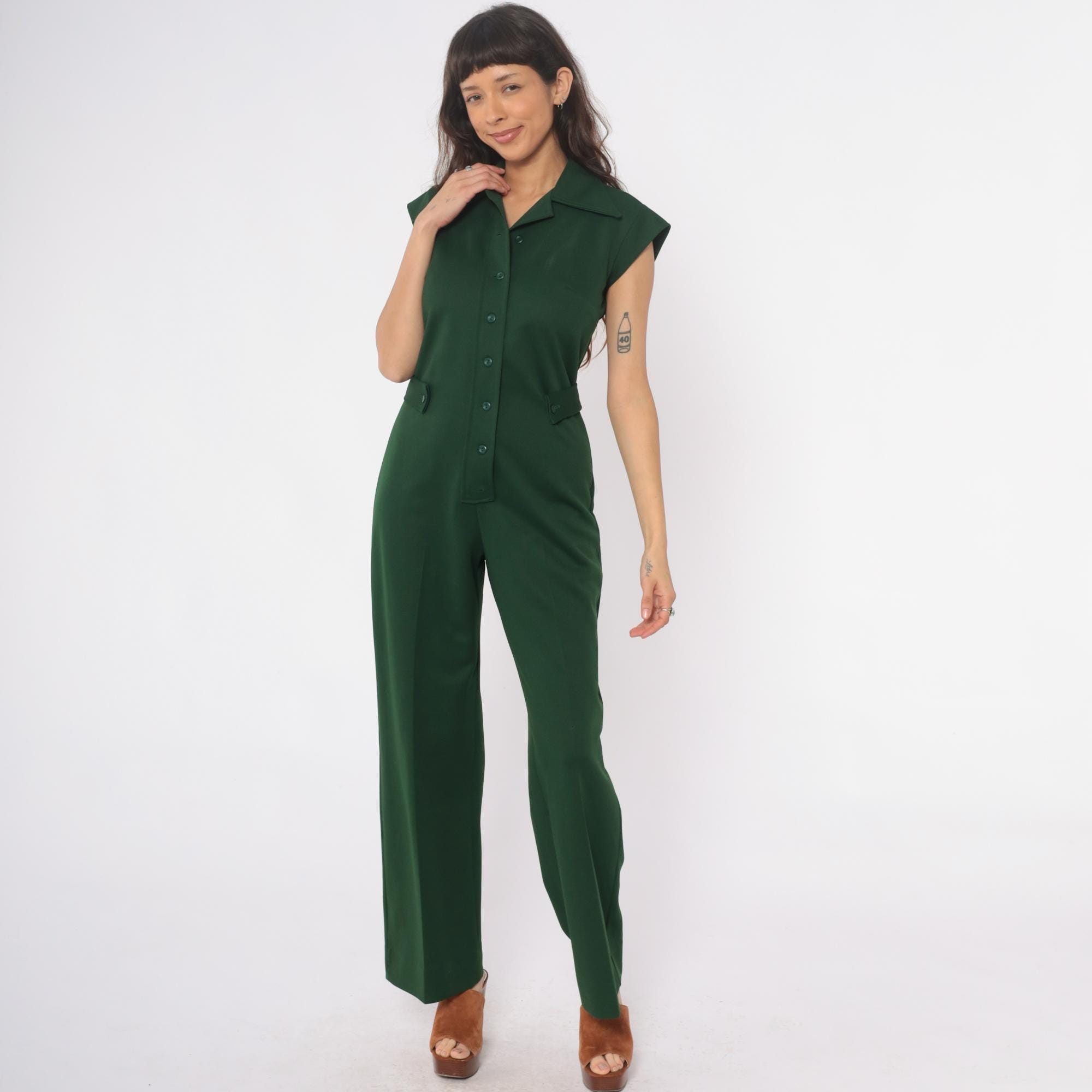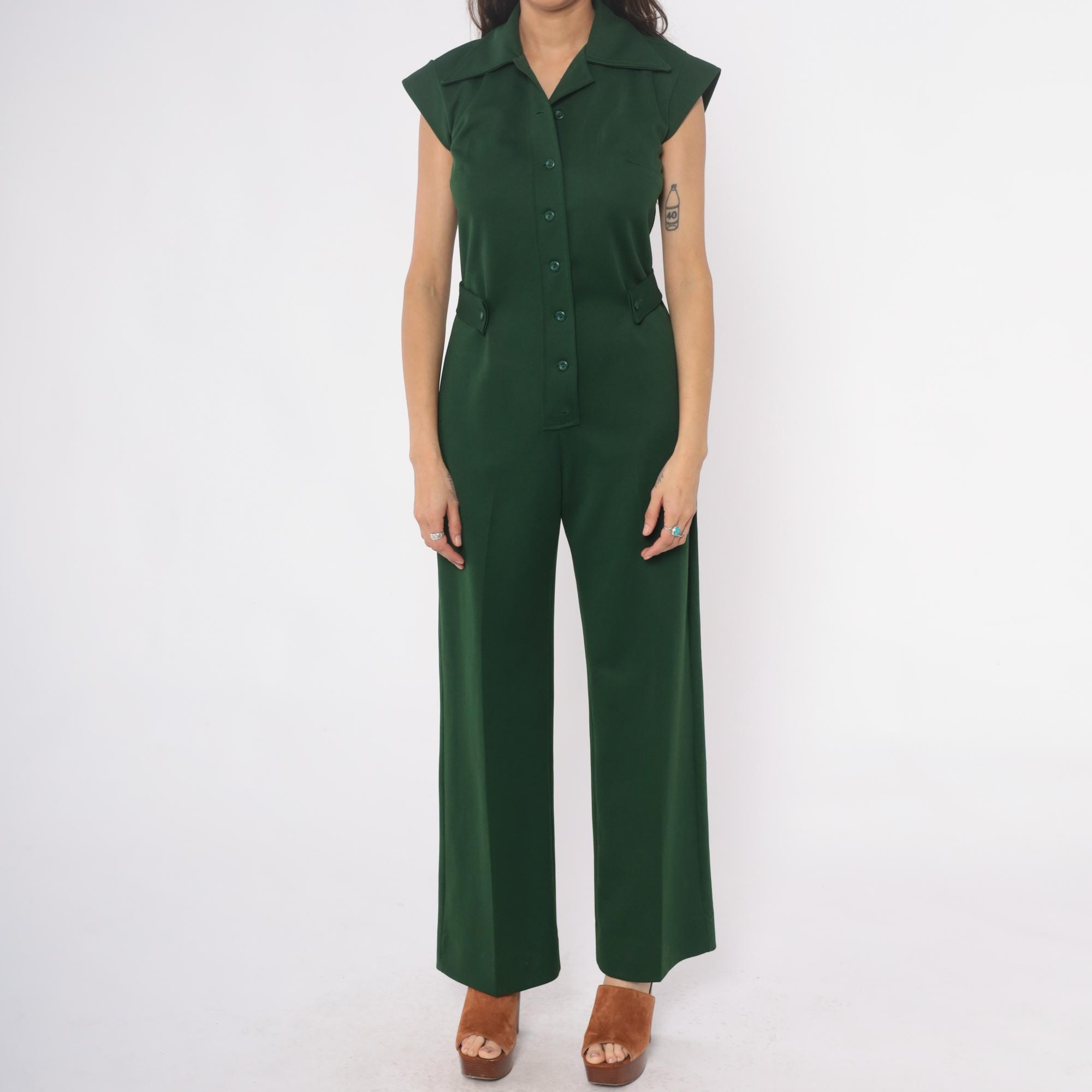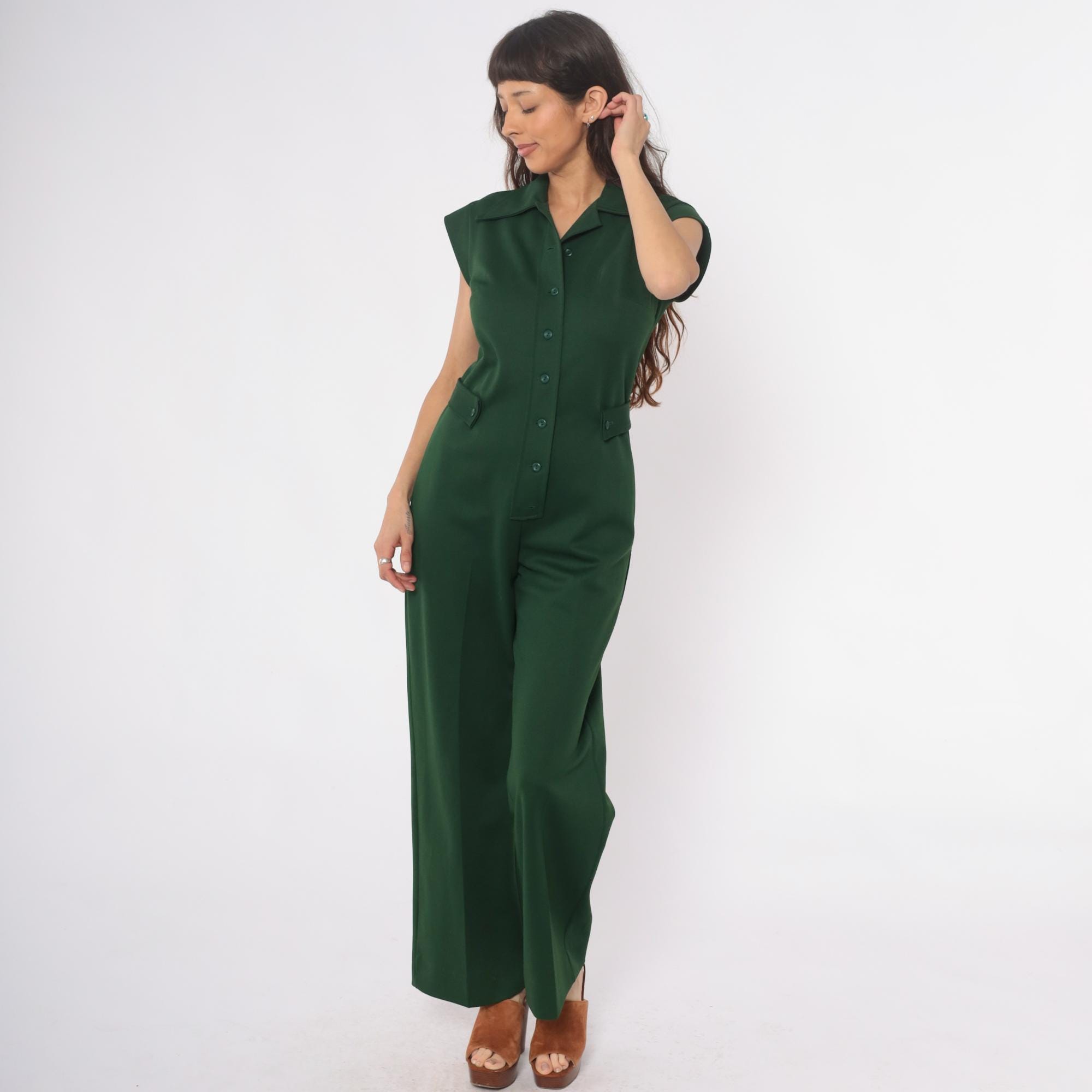 70s forest green jumpsuit in polyester with wide pointed collar and button front closure. Short cap sleeves, belt with button tabs at waist, wide leg pants. Hip pockets with button closures.