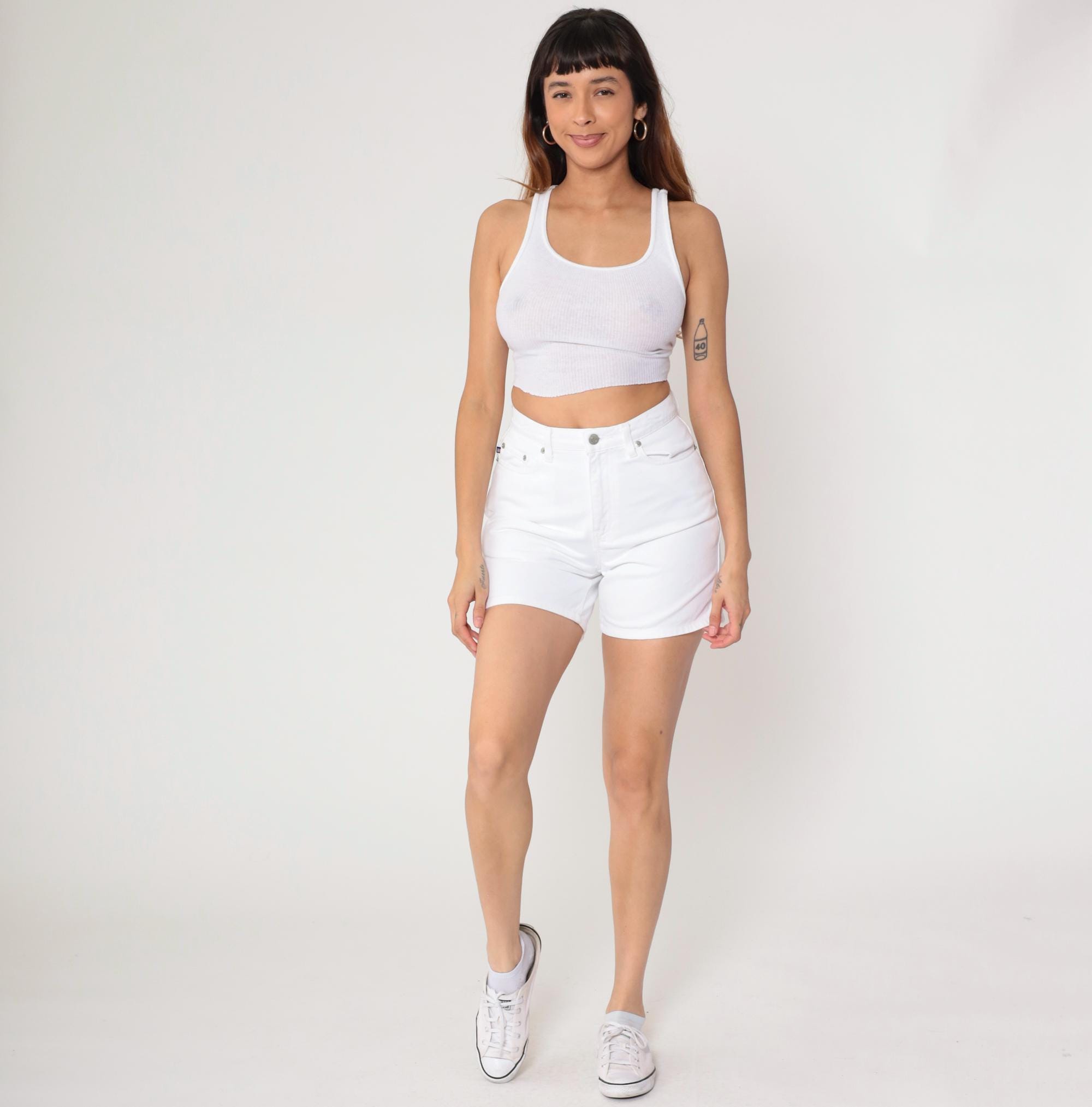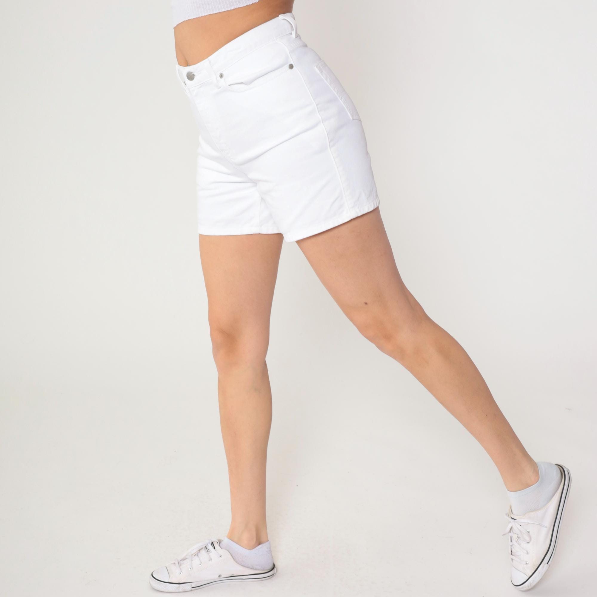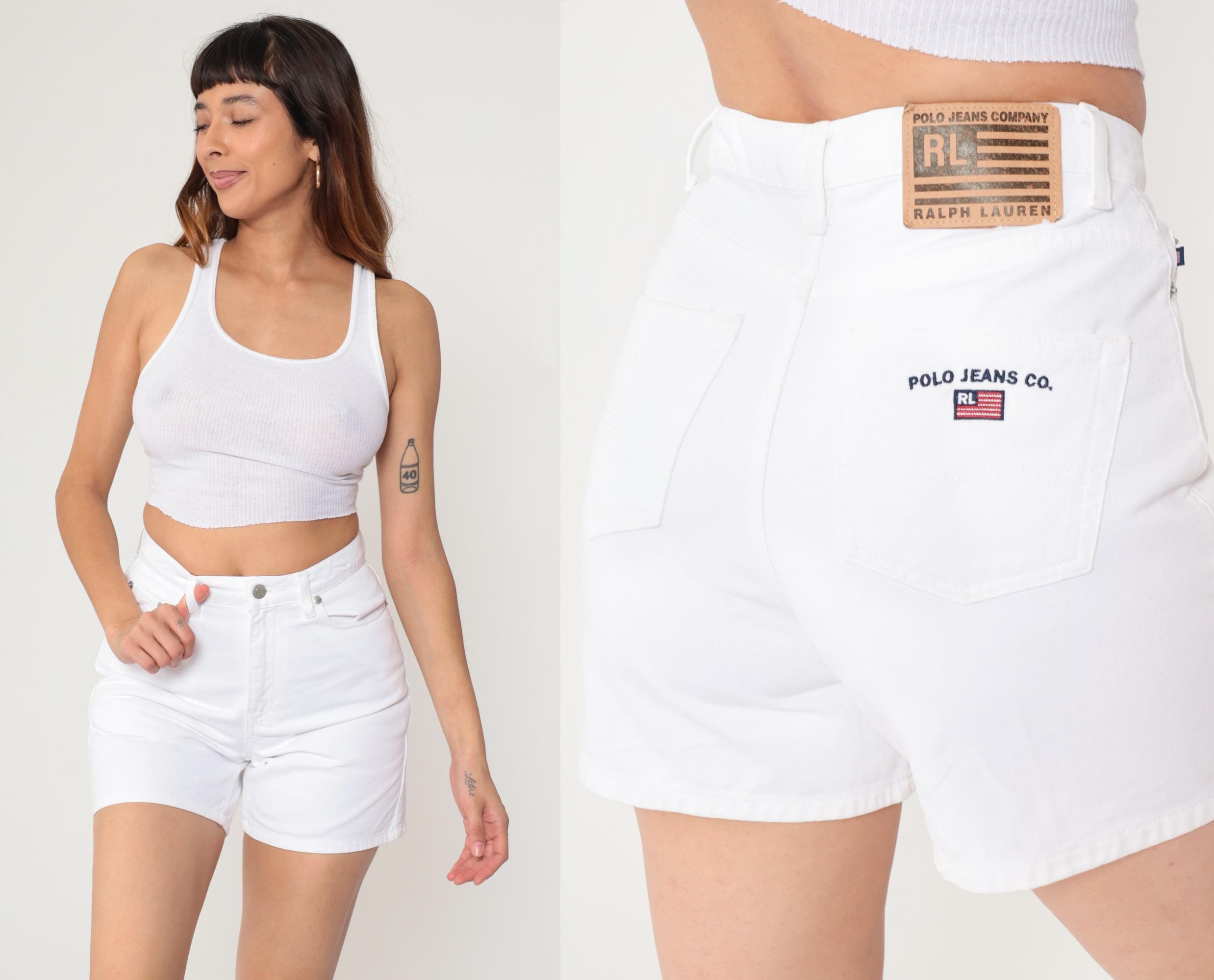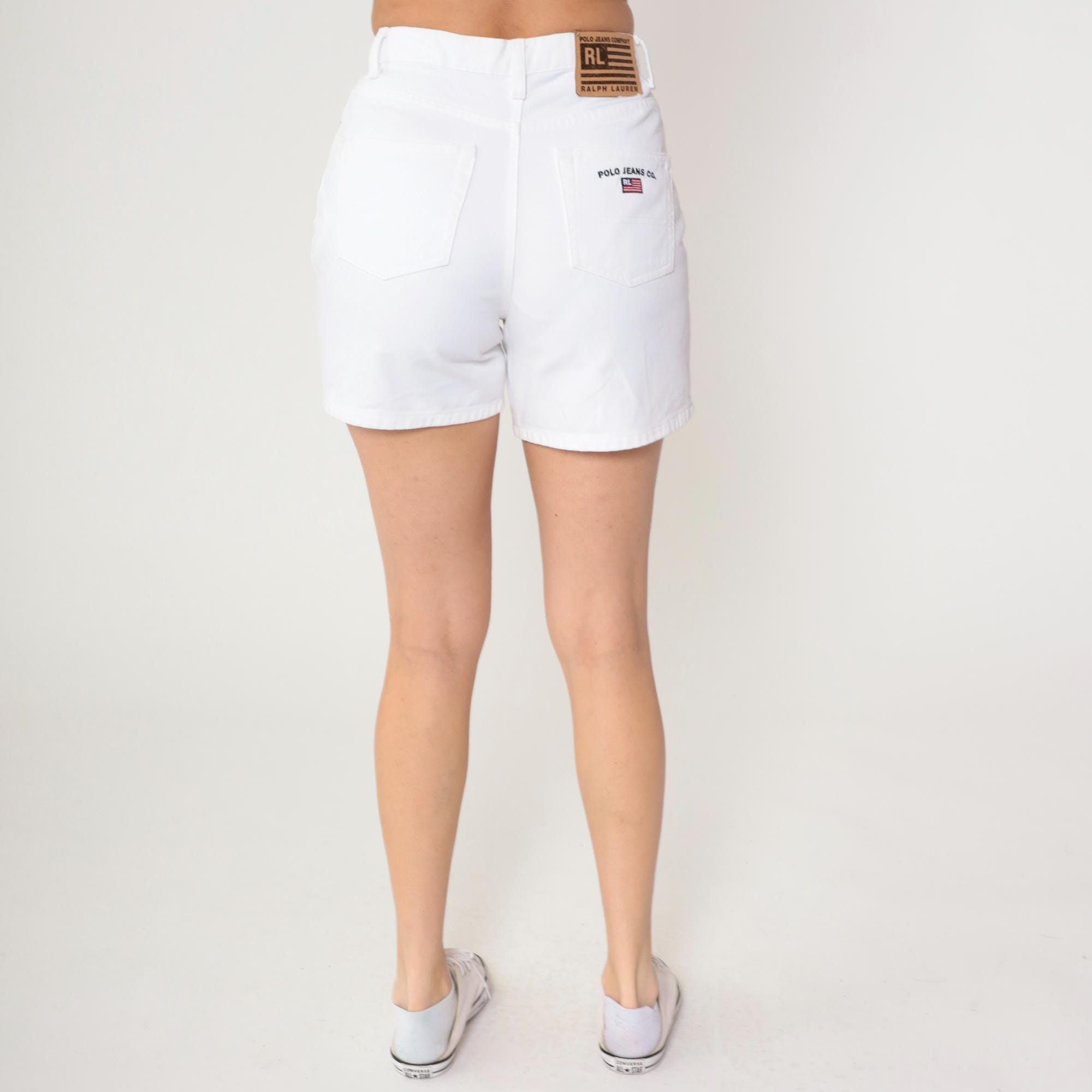90s white shorts from Polo Ralph Lauren Jeans Co. with high waist and five-pocket construction. Button fly closure, small American flag embroidery on back pocket, brown leather patch at back waistband with brand logo.
