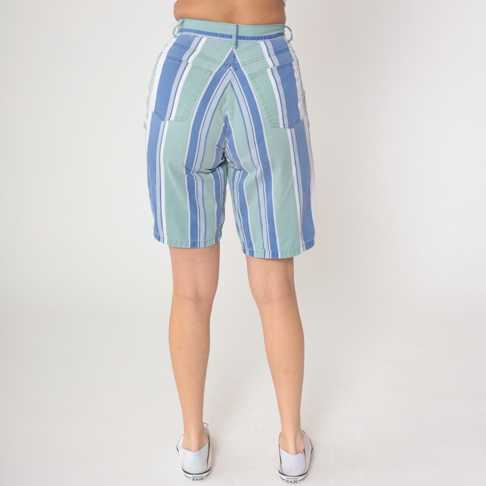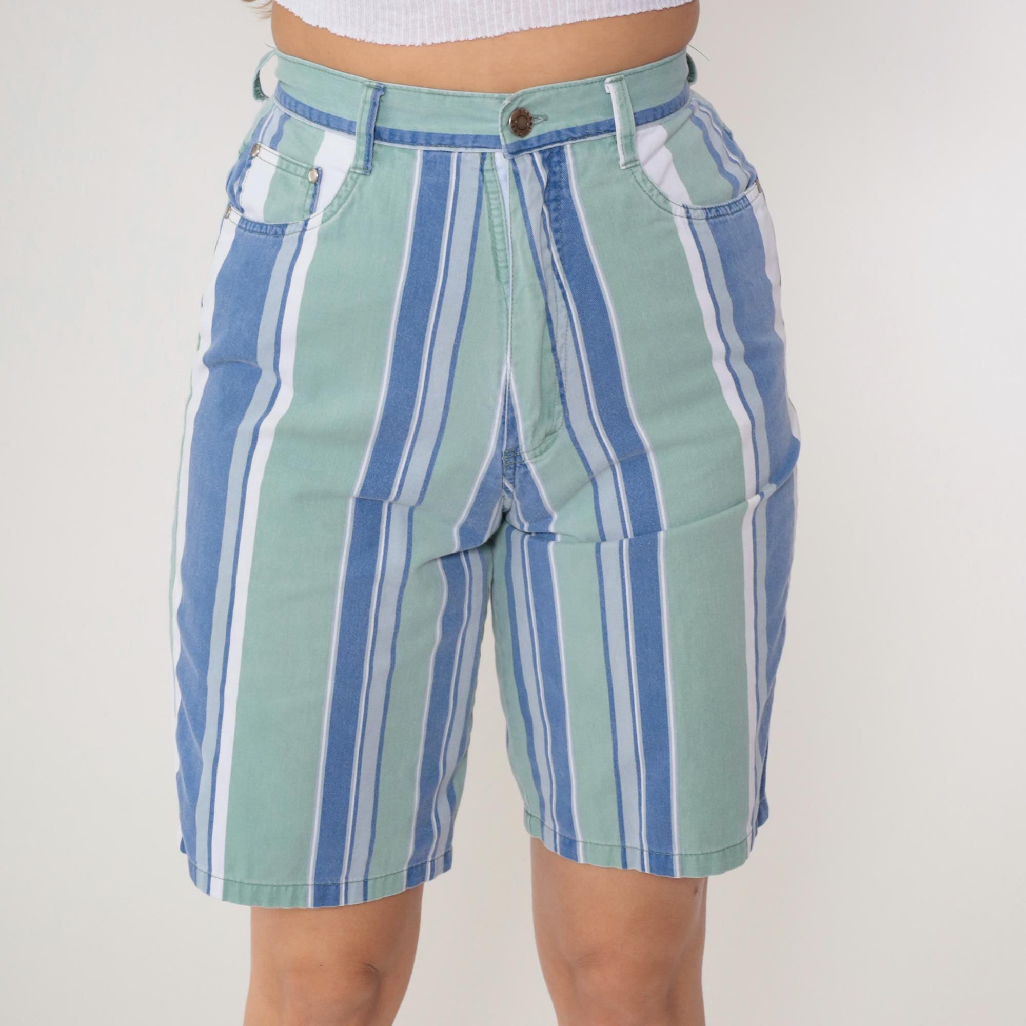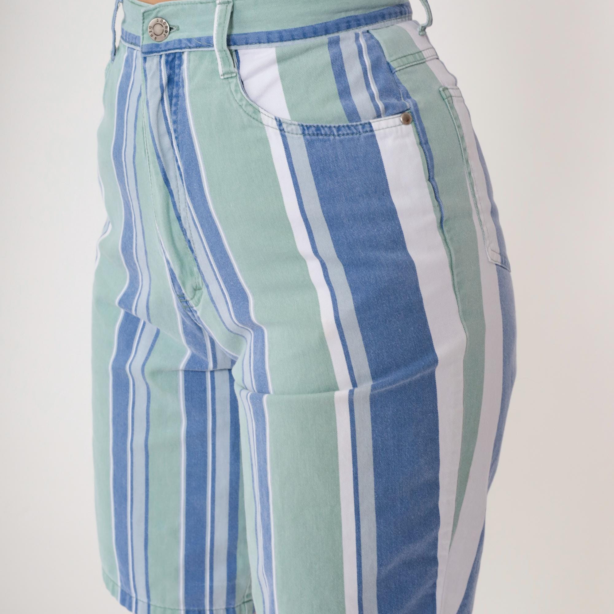 Y2K striped Bermuda shorts from Anchor Blue in blue, mint green, and white vertical stripes. High waisted with button and zip fly closure, belt loops, front slash pockets, and back patch pockets.