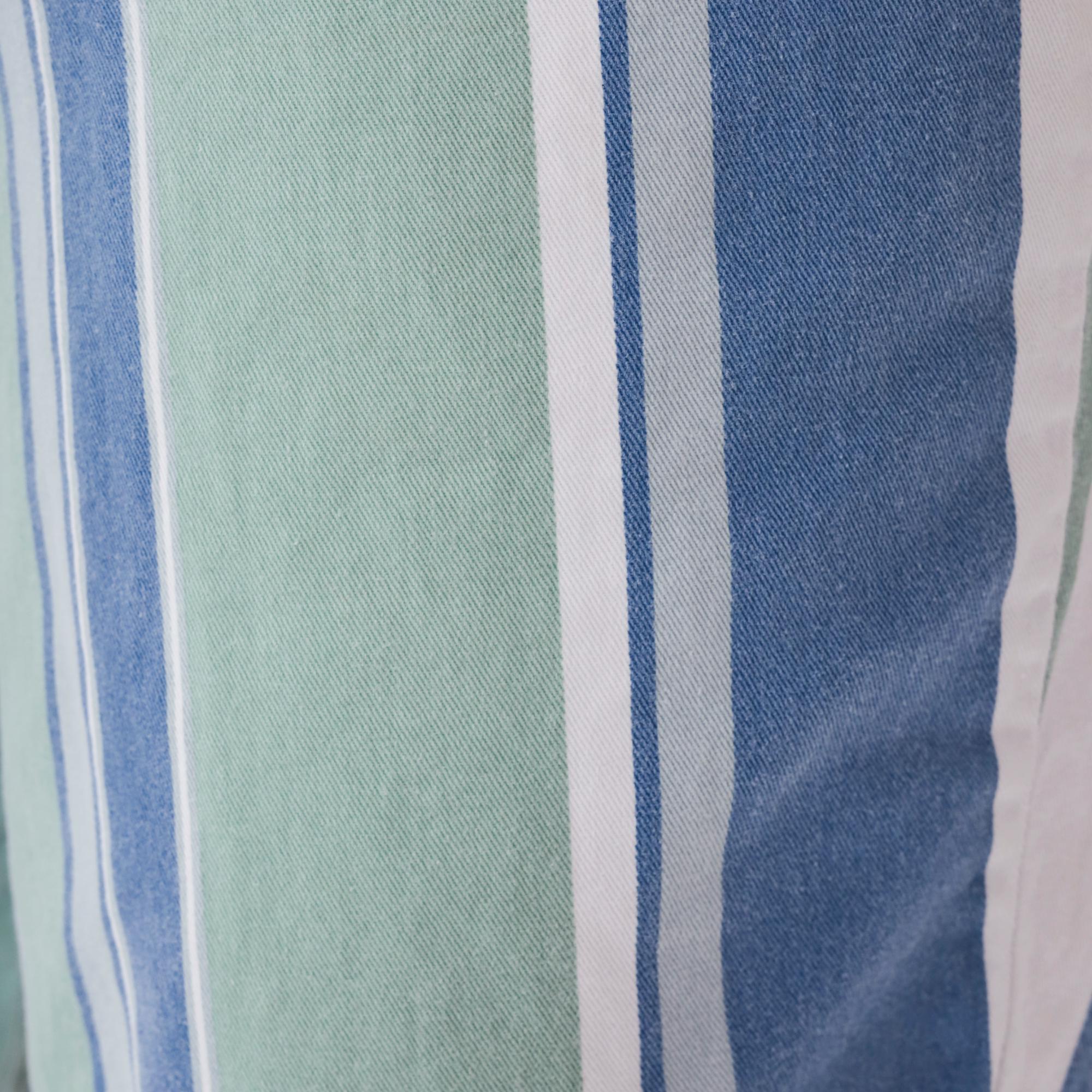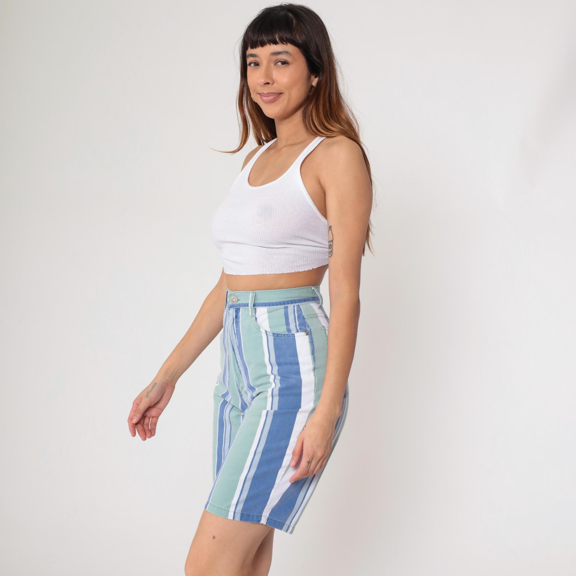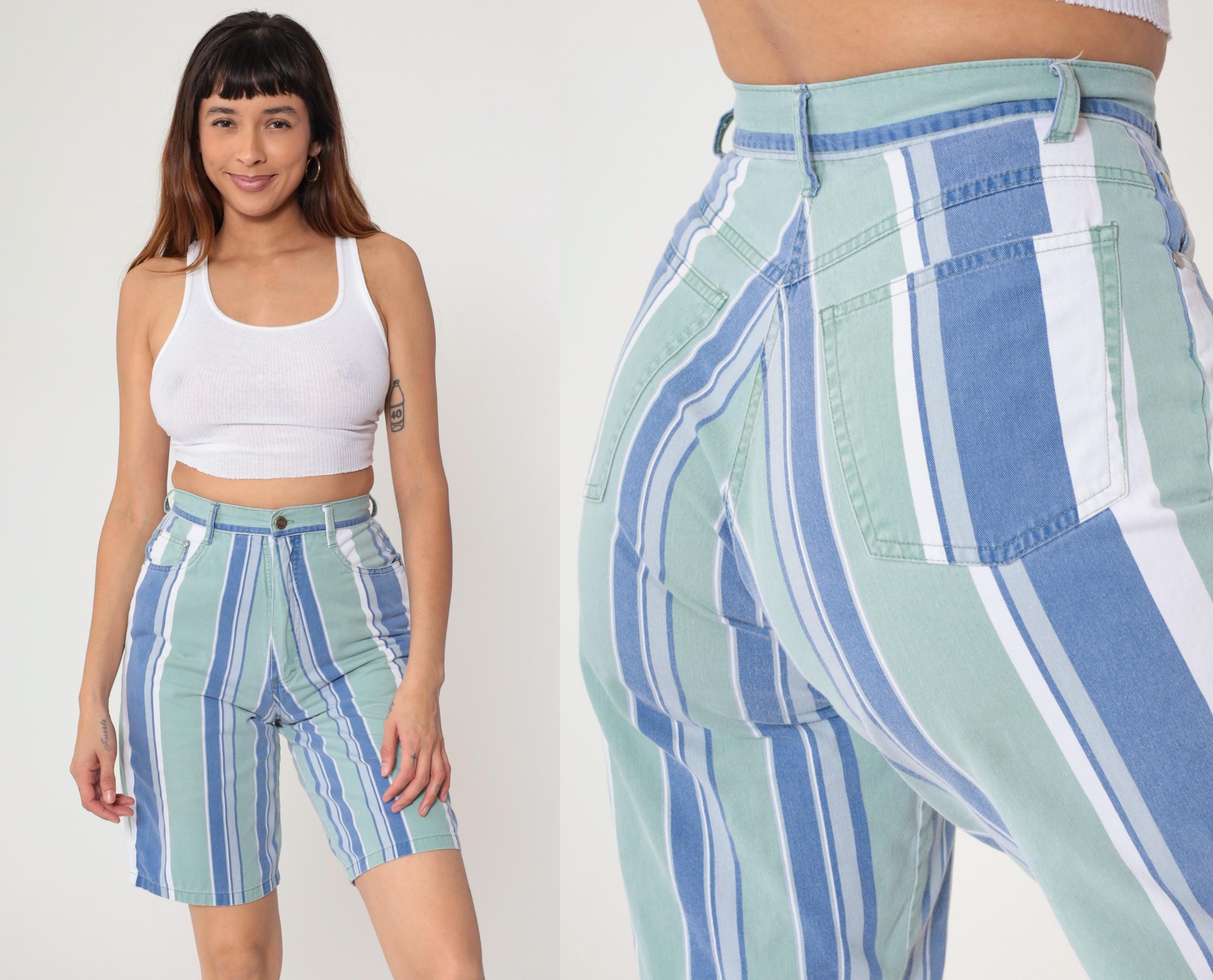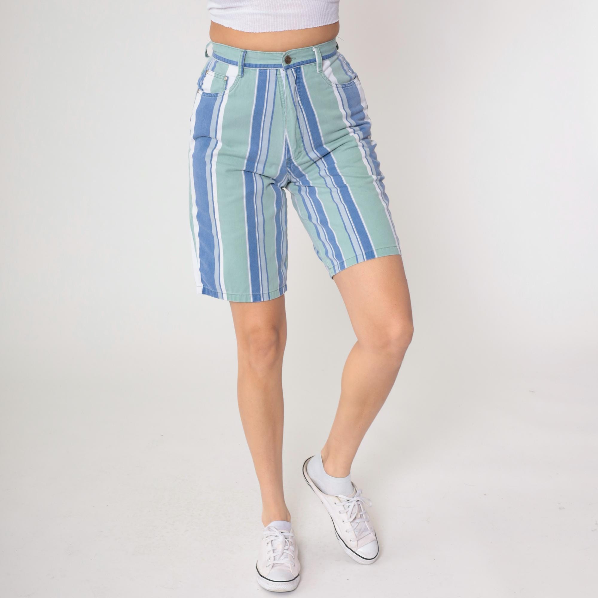 Y2K striped Bermuda shorts from Anchor Blue in blue, mint green, and white vertical stripes. High waisted with button and zip fly closure, belt loops, front slash pockets, and back patch pockets.