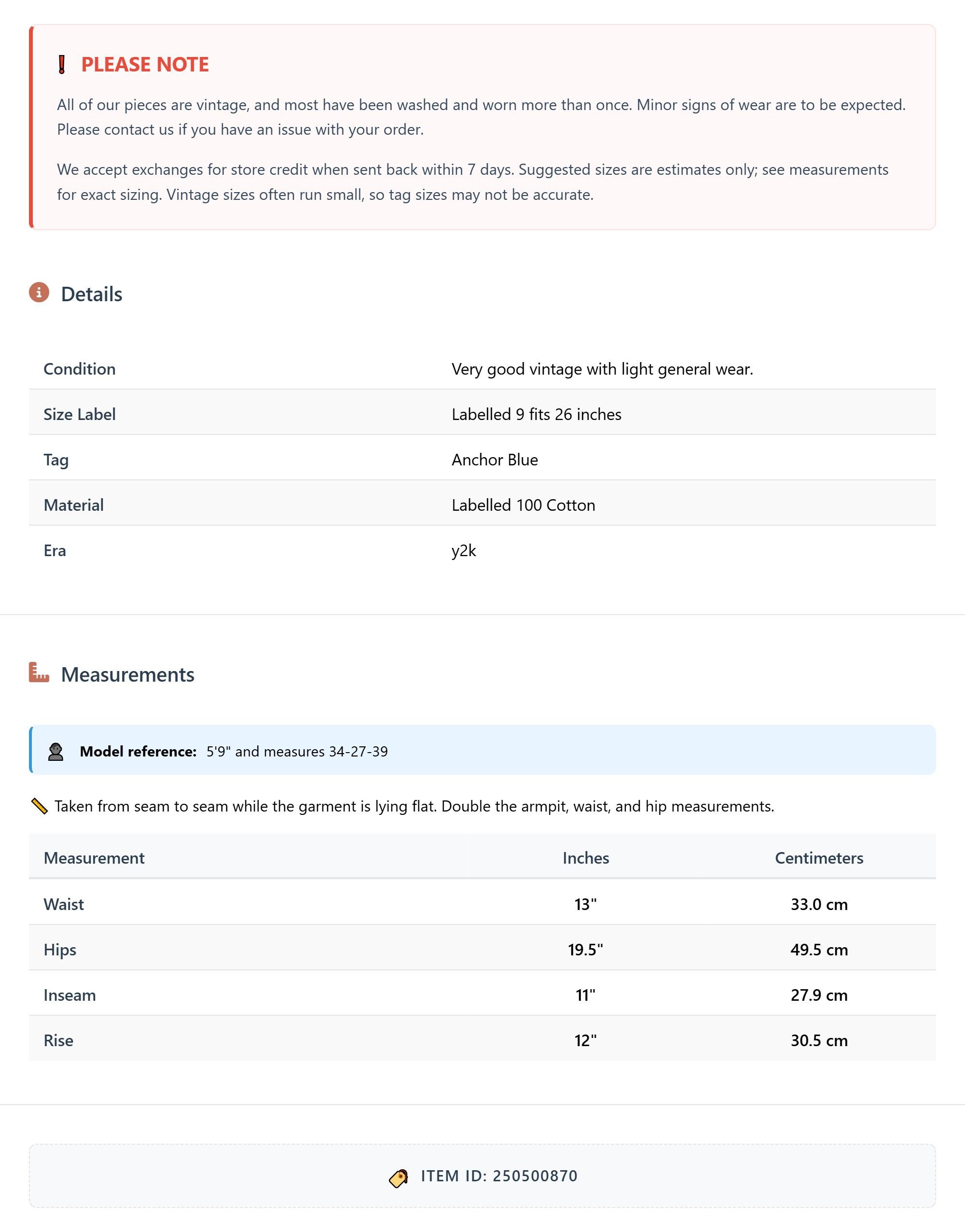 All of our pieces are vintage, and most have been washed and worn more than once. Minor signs of wear are to be expected. Please contact us if you have an issue with your order. We accept exchanges for store credit when sent back within 7 days.