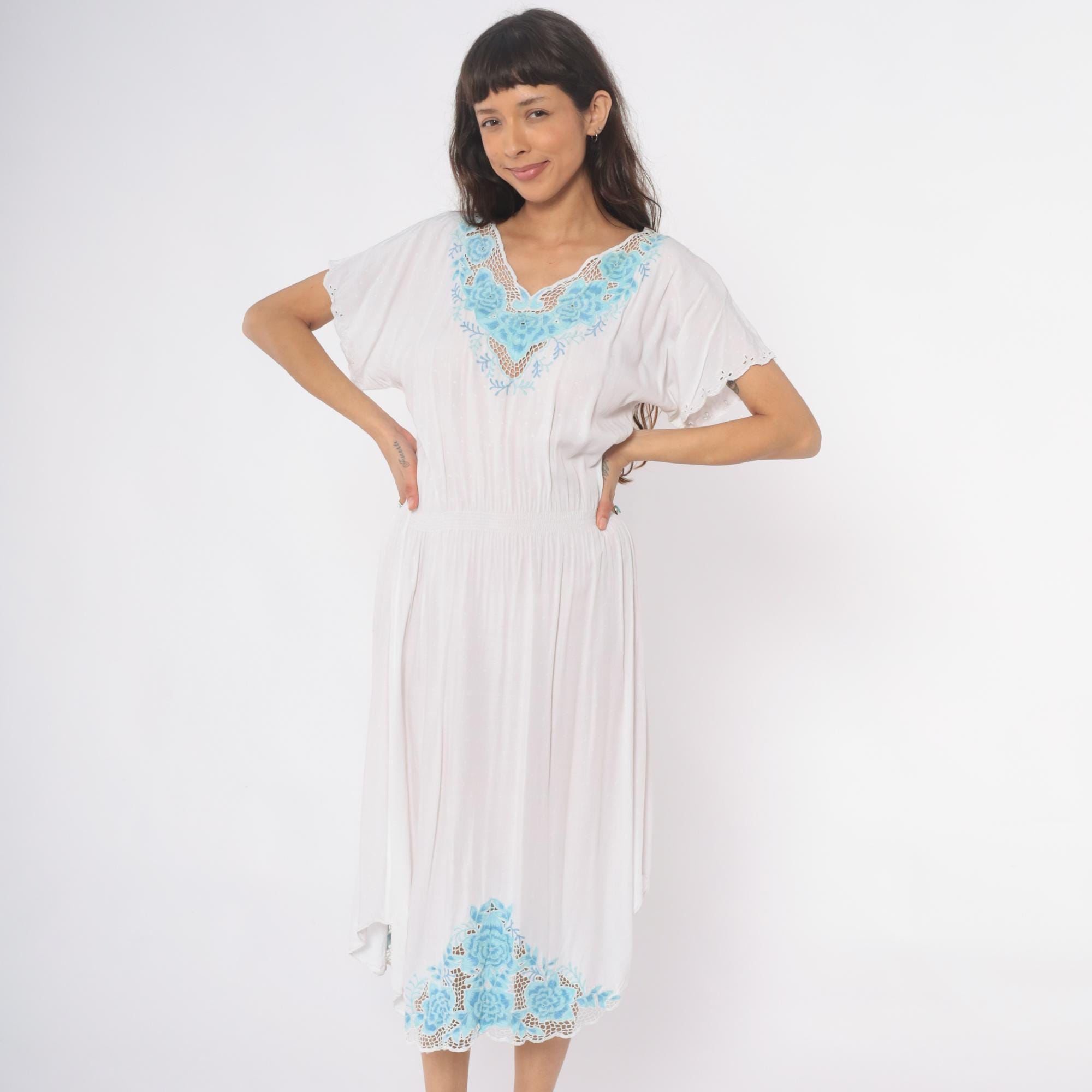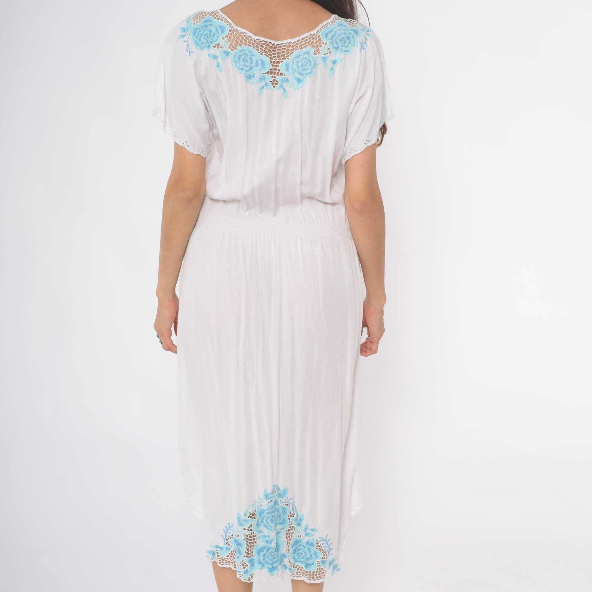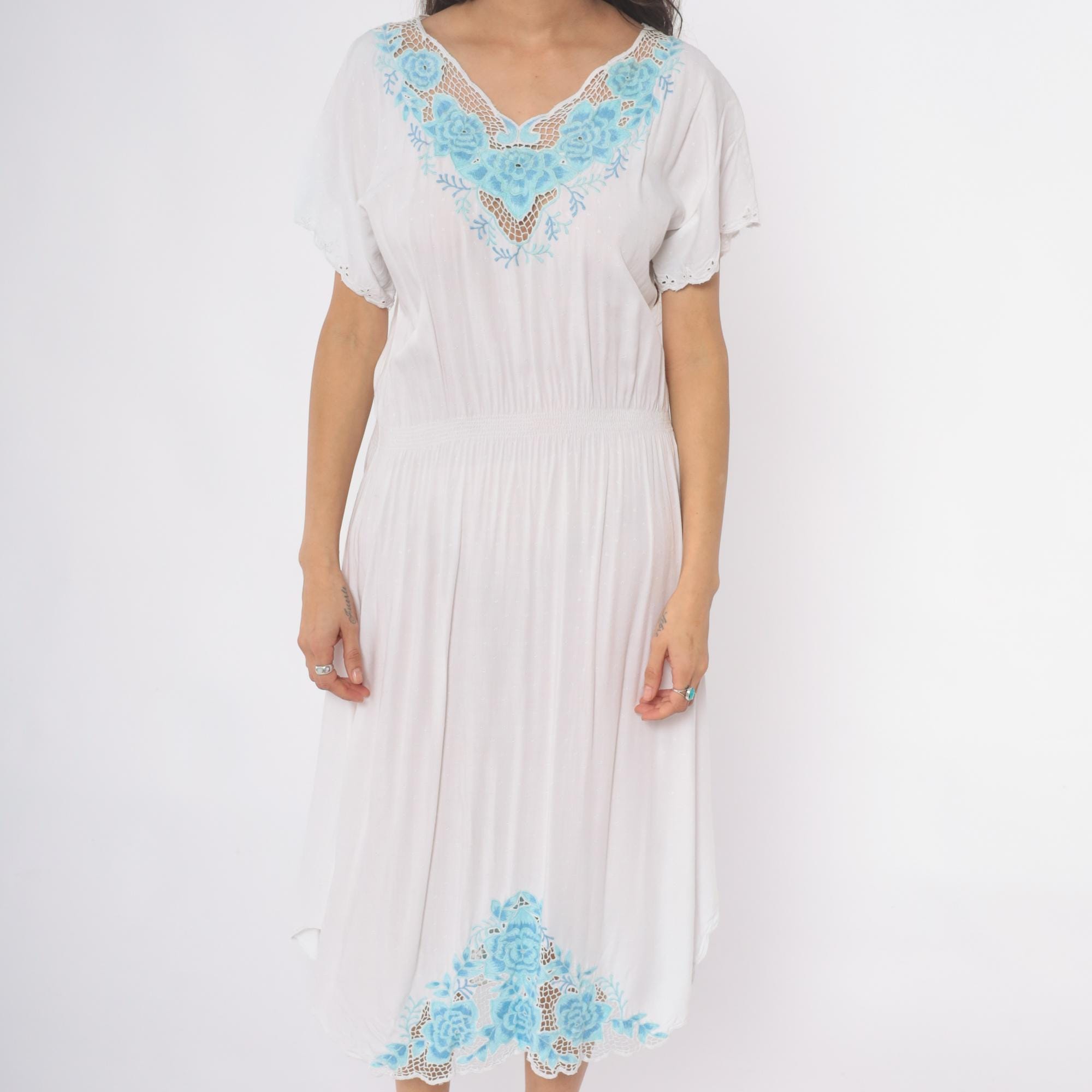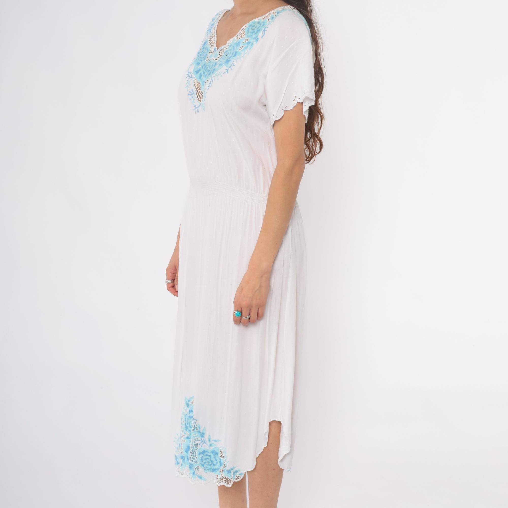 Vintage 80s dress in white with mesh cut outs and floral embroidery. High elastic waist, slouchy bodice, midi length.
