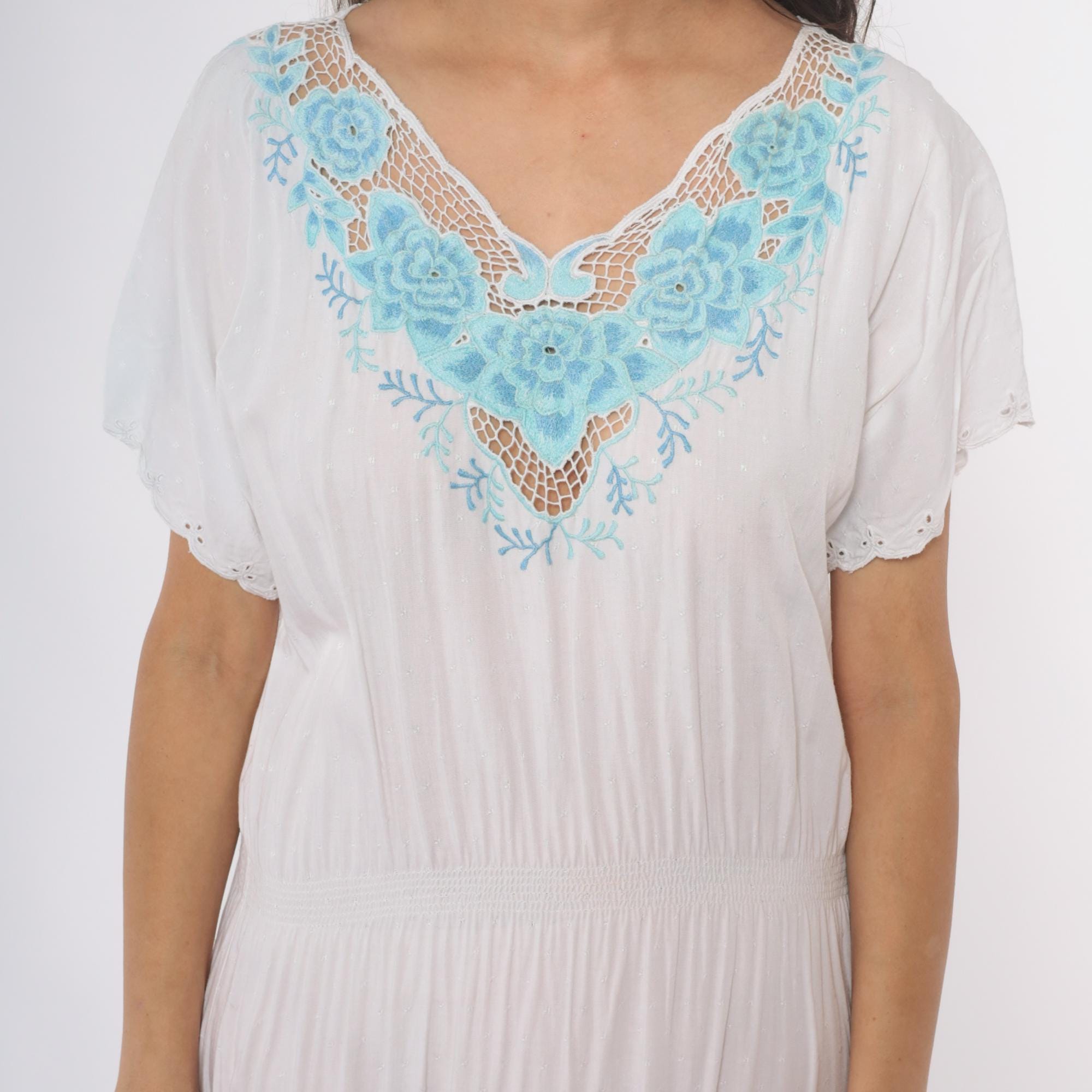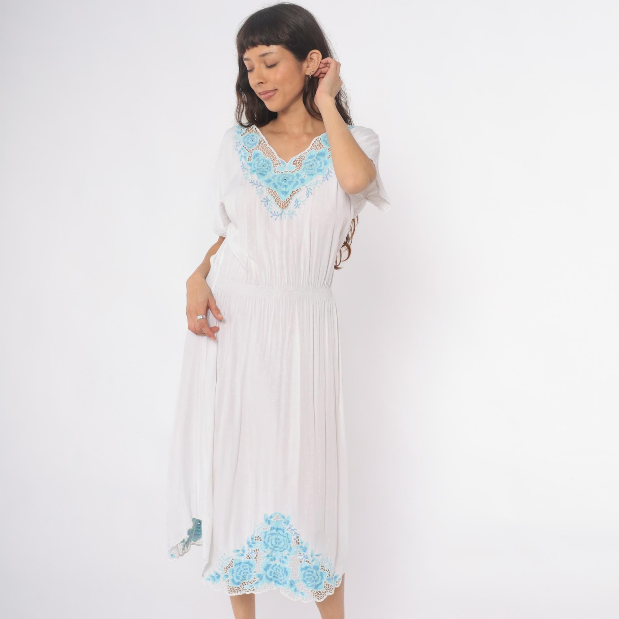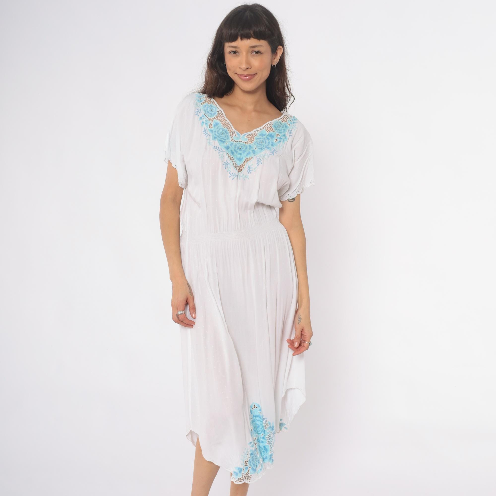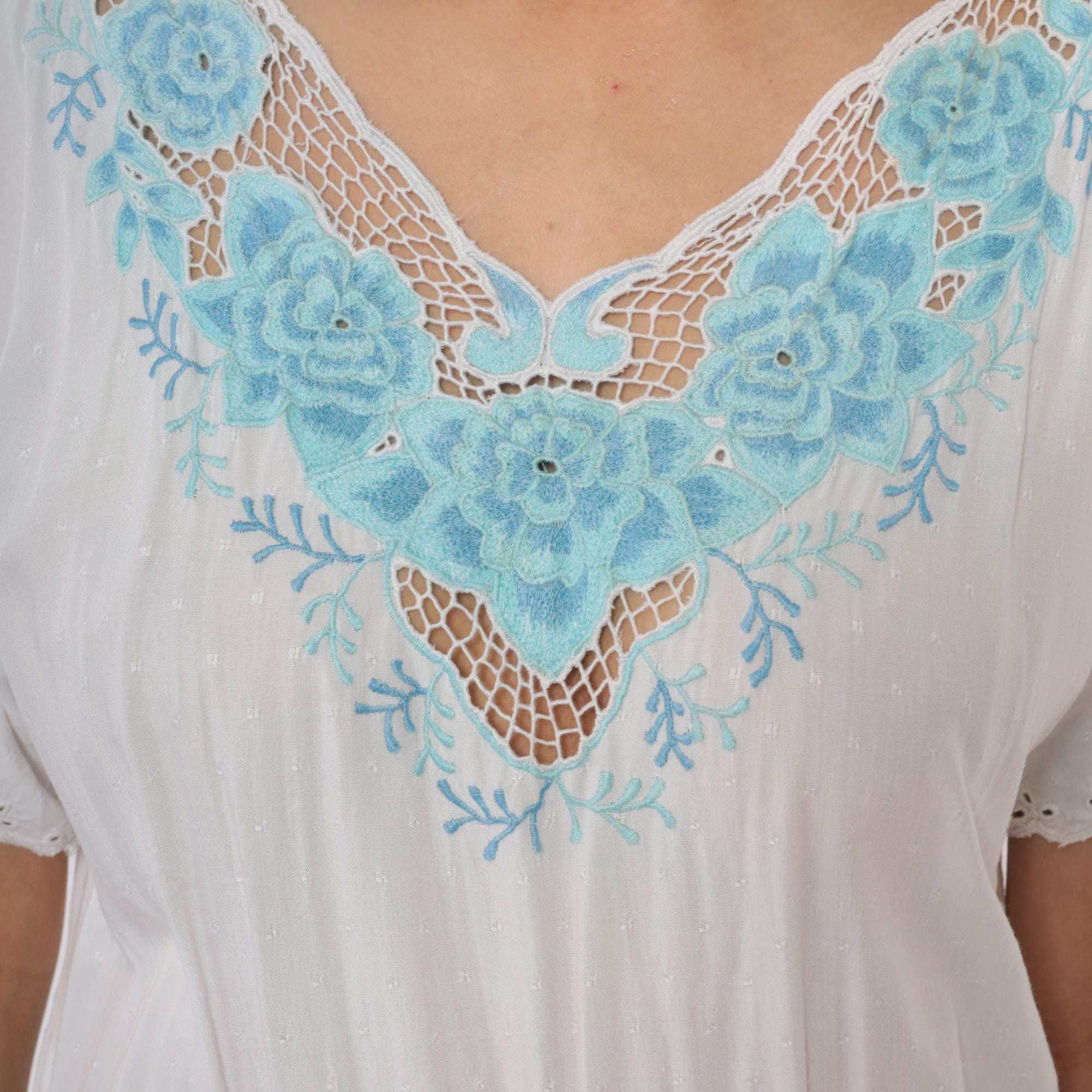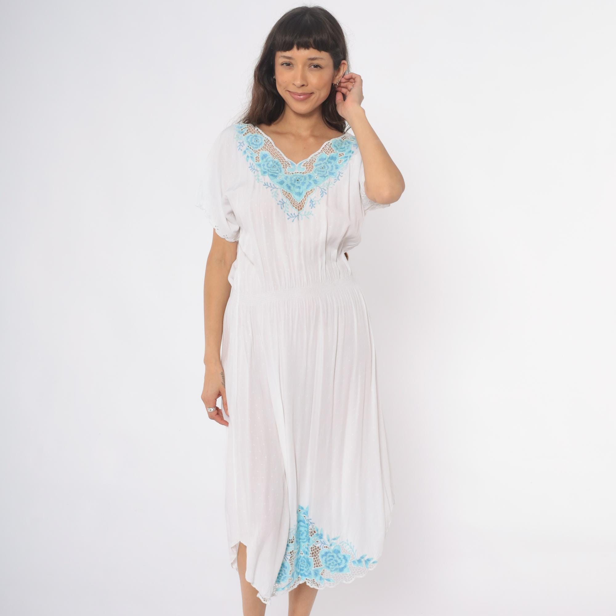 Vintage 80s dress in white with mesh cut outs and floral embroidery. High elastic waist, slouchy bodice, midi length.