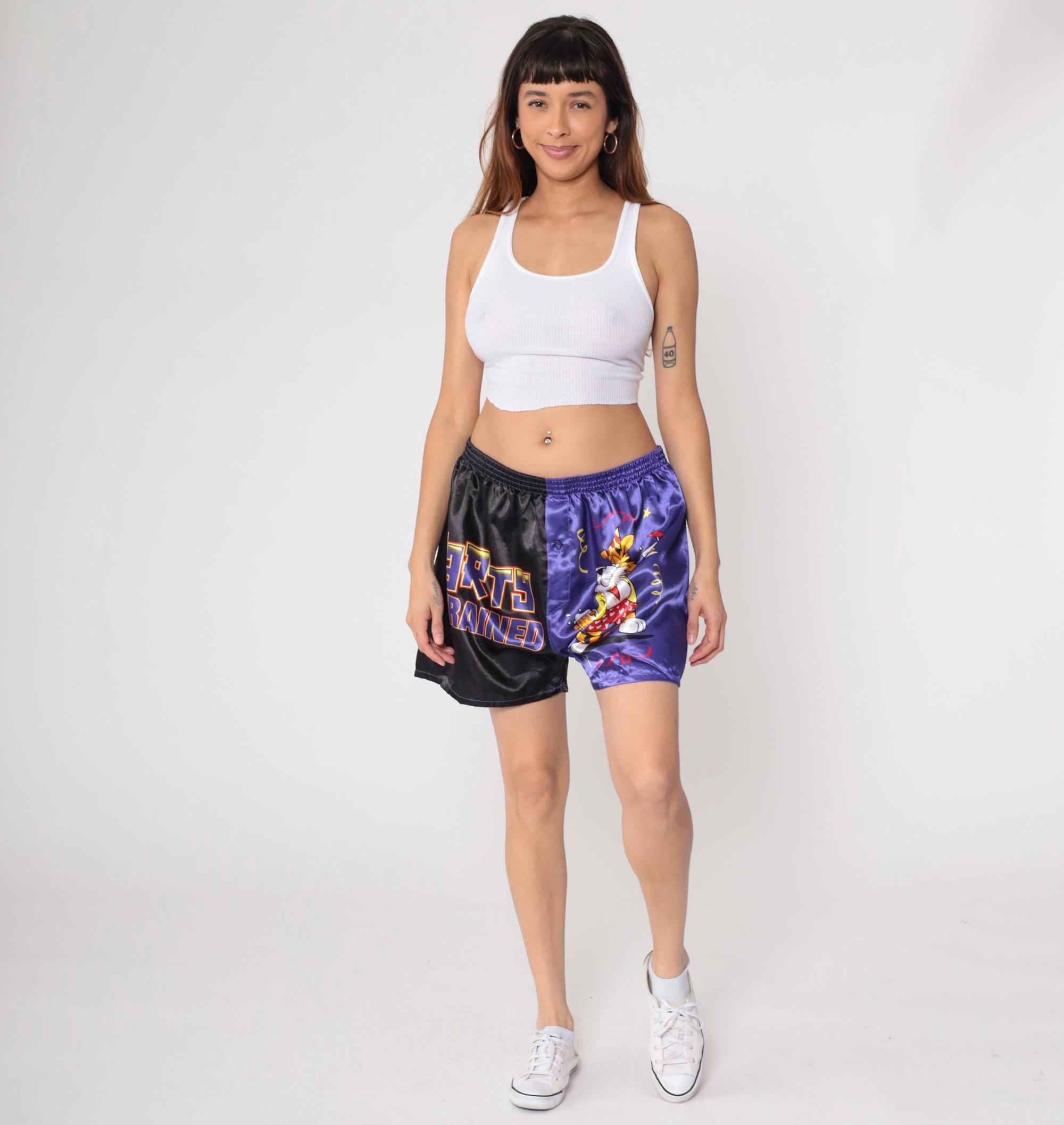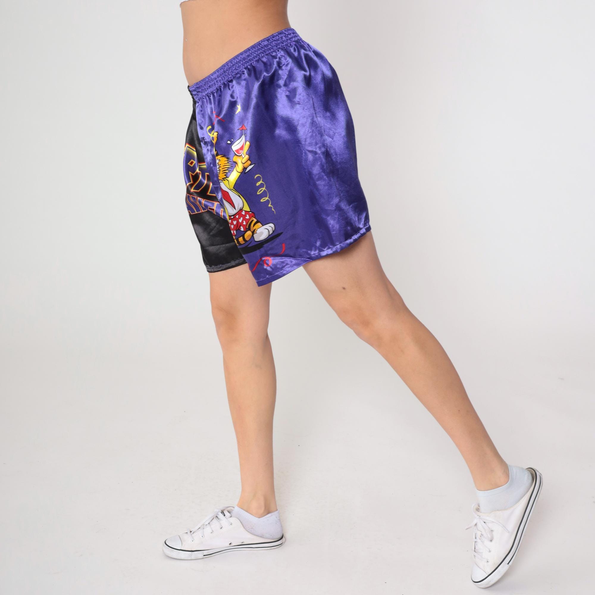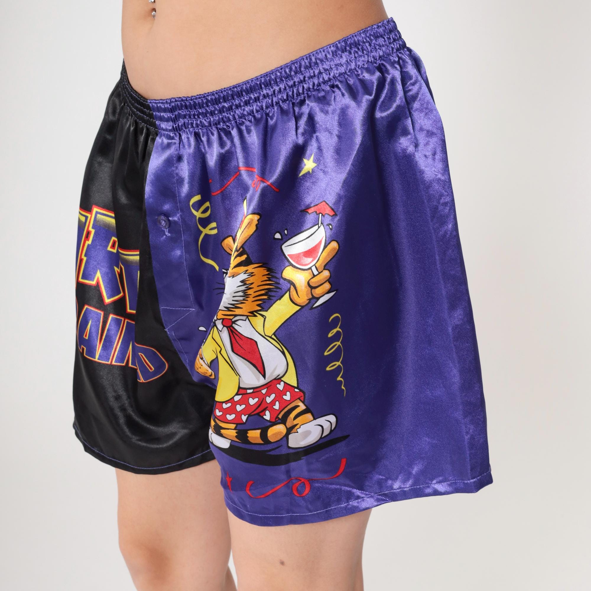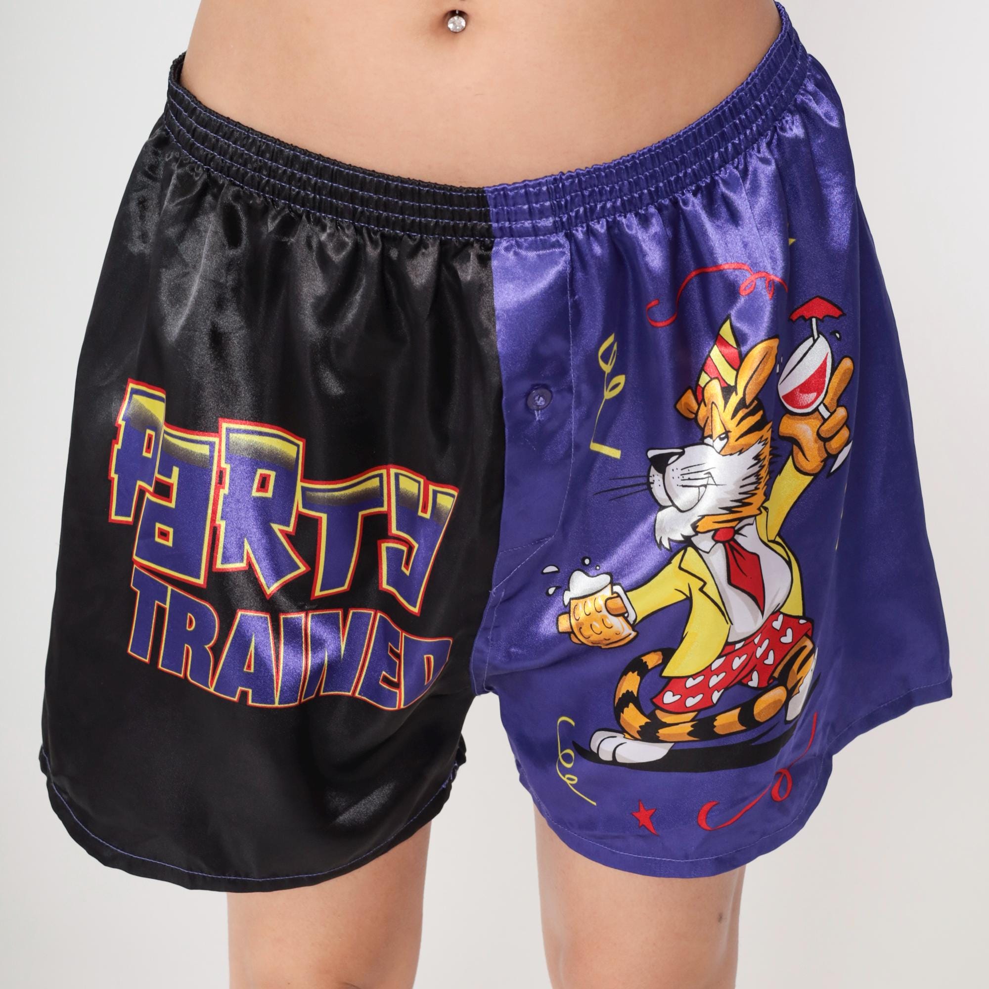 90s split-color boxing shorts in purple and black with novelty party graphics. Purple side features a cartoon tiger holding beer with stars and swirls, black side reads "PARTY TRAINED" in bold outlined lettering. Elastic waistband, loose athletic fit with split leg construction.