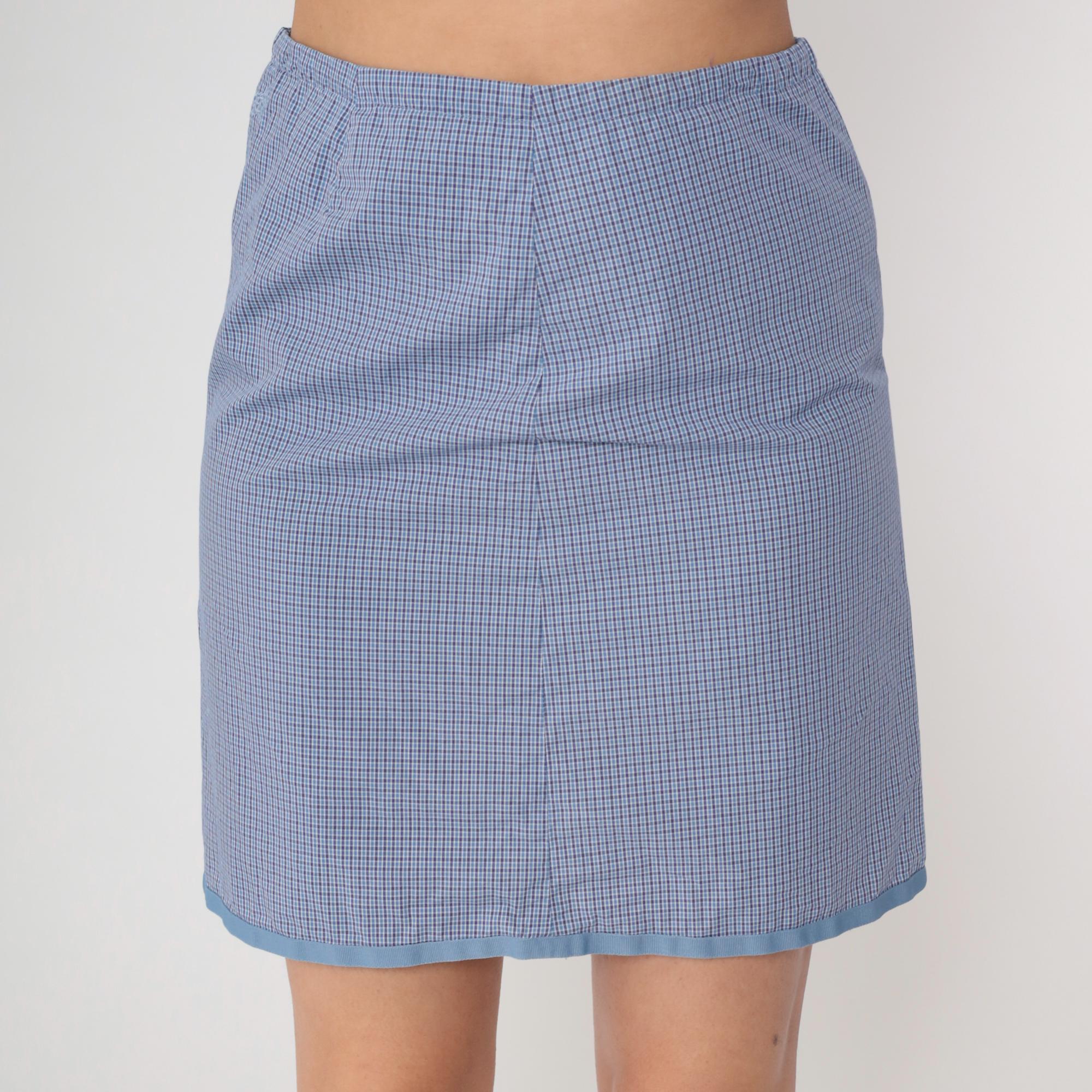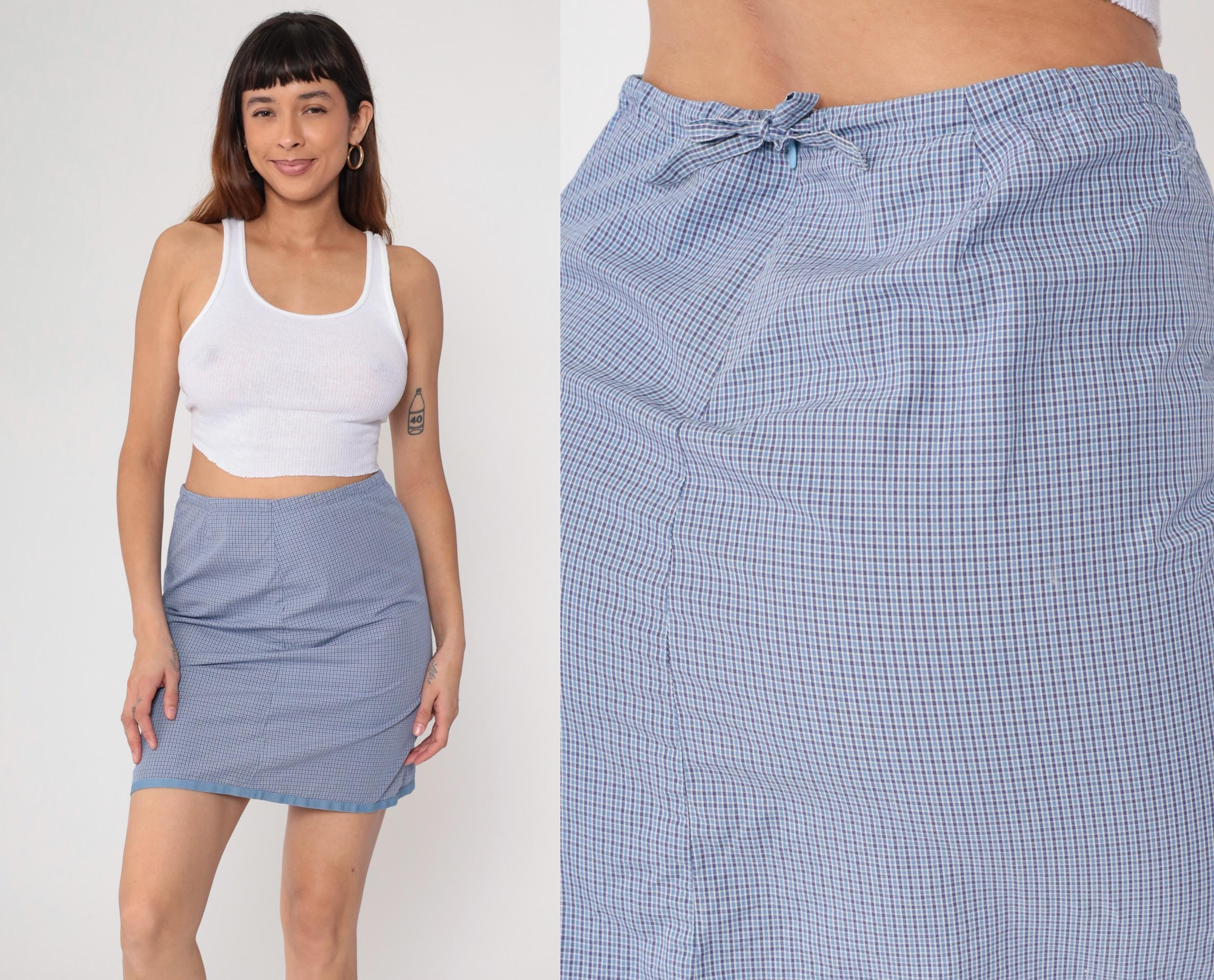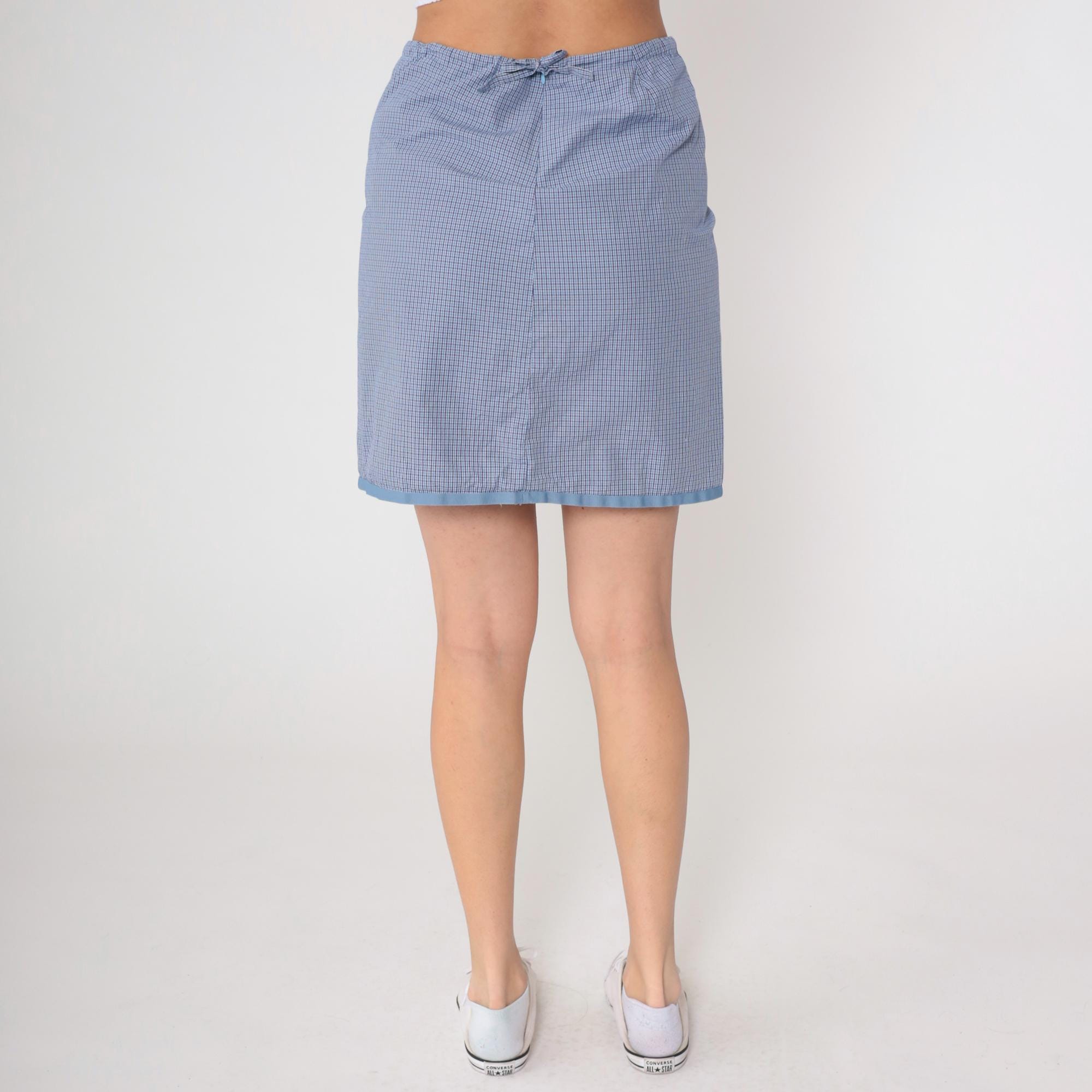 90s blue and white gingham mini skirt from Horny Toad with elastic waistband and matching drawstring tie at center front. A-line silhouette with small check pattern throughout.