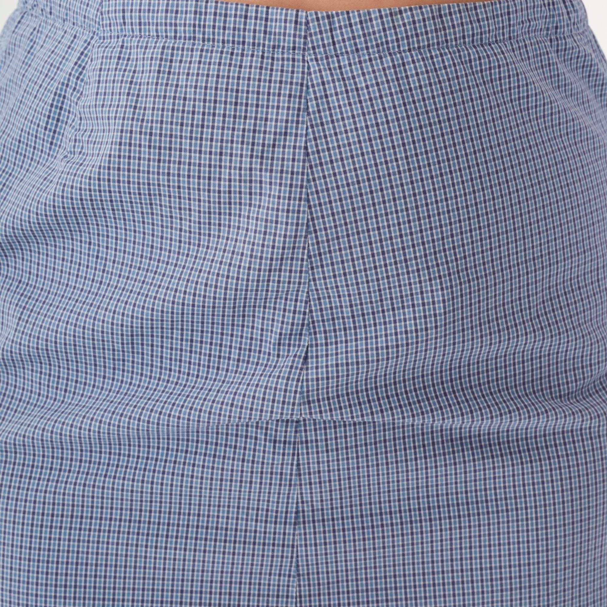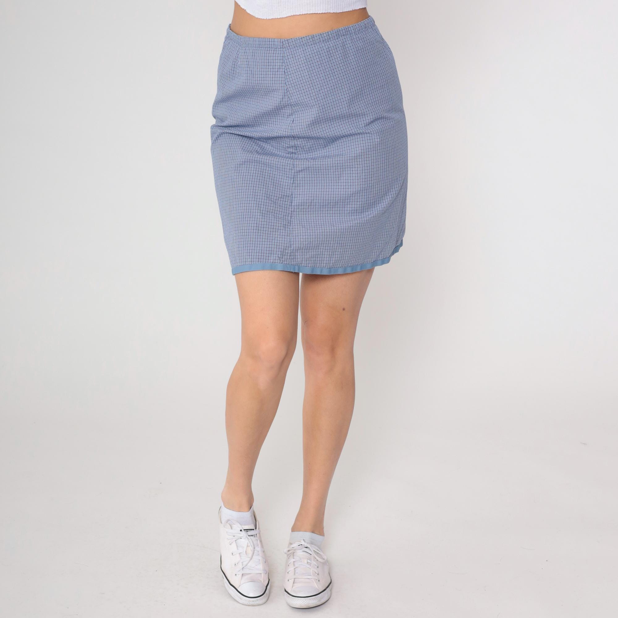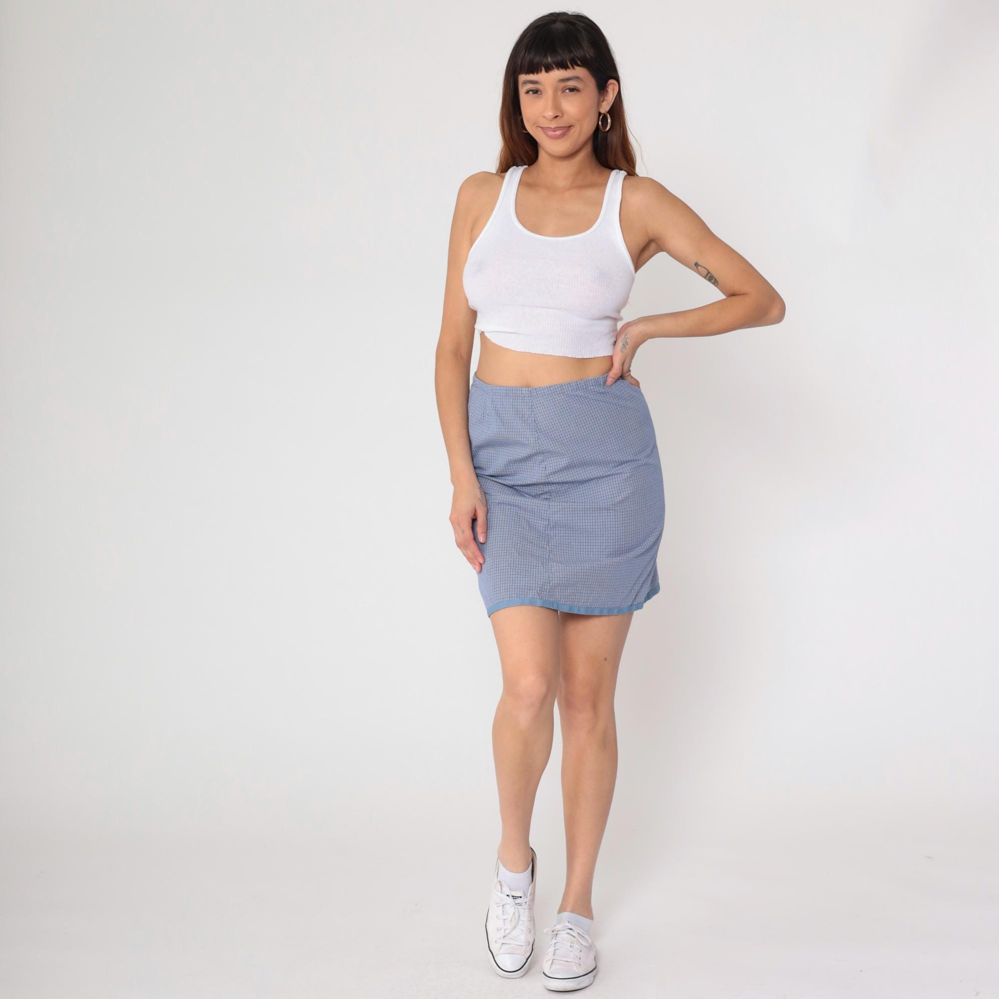 90s blue and white gingham mini skirt from Horny Toad with elastic waistband and matching drawstring tie at center front. A-line silhouette with small check pattern throughout.