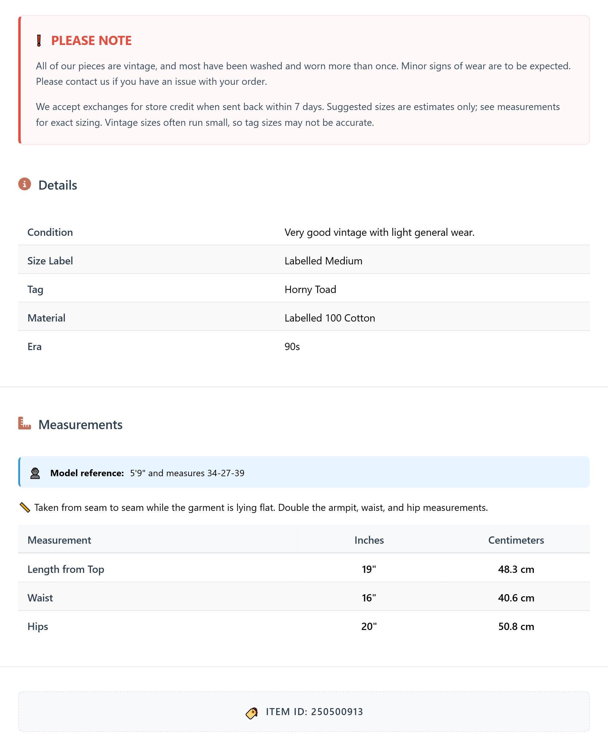 All of our pieces are vintage, and most have been washed and worn more than once. Minor signs of wear are to be expected. Please contact us if you have an issue with your order. We accept exchanges for store credit when sent back within 7 days.