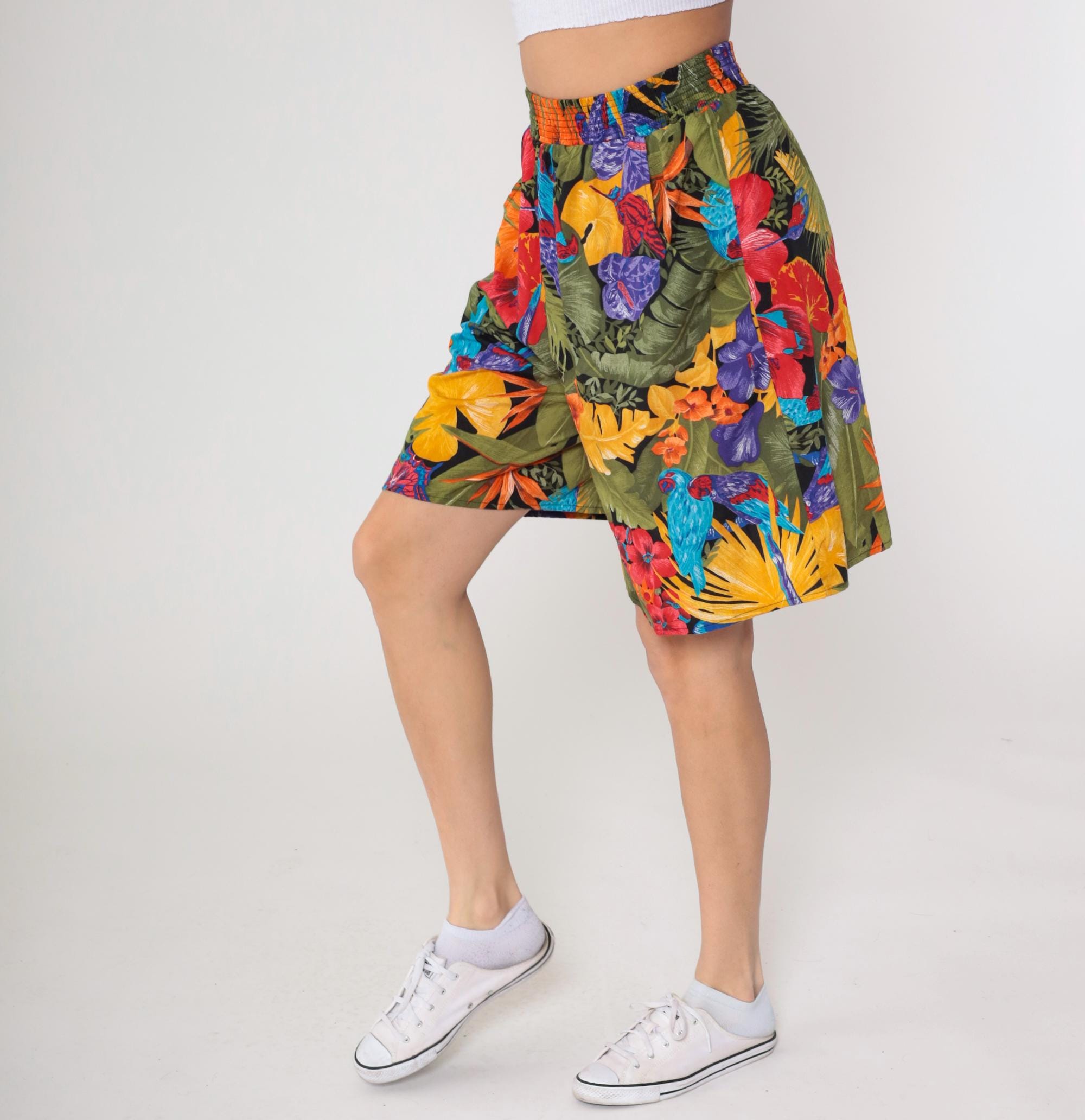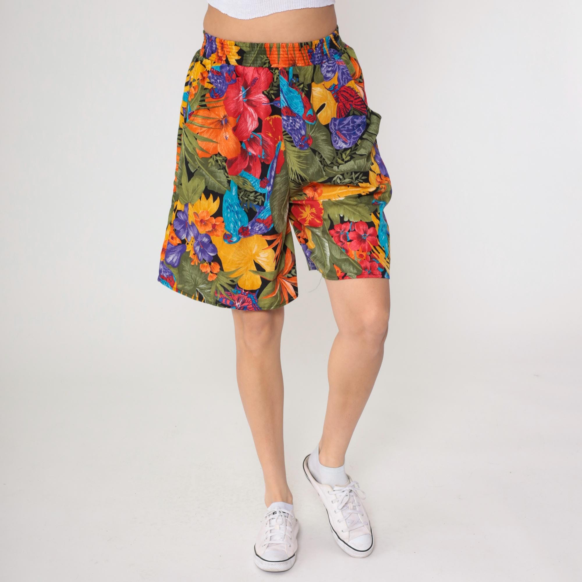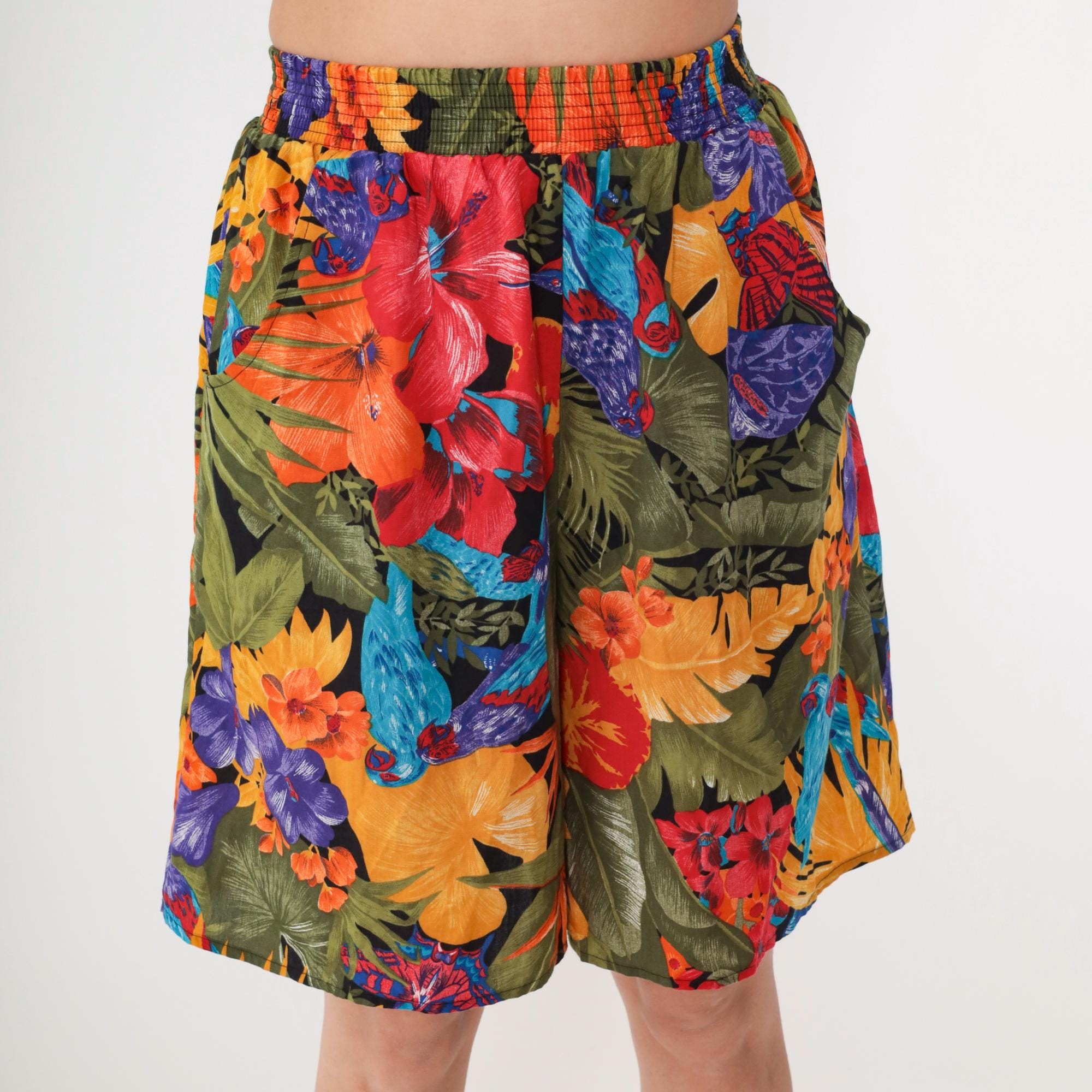 90s tropical floral shorts from Connections with bold botanical print featuring large-scale flowers and leaves in yellow, red, purple, orange, and blue against an olive green base.
