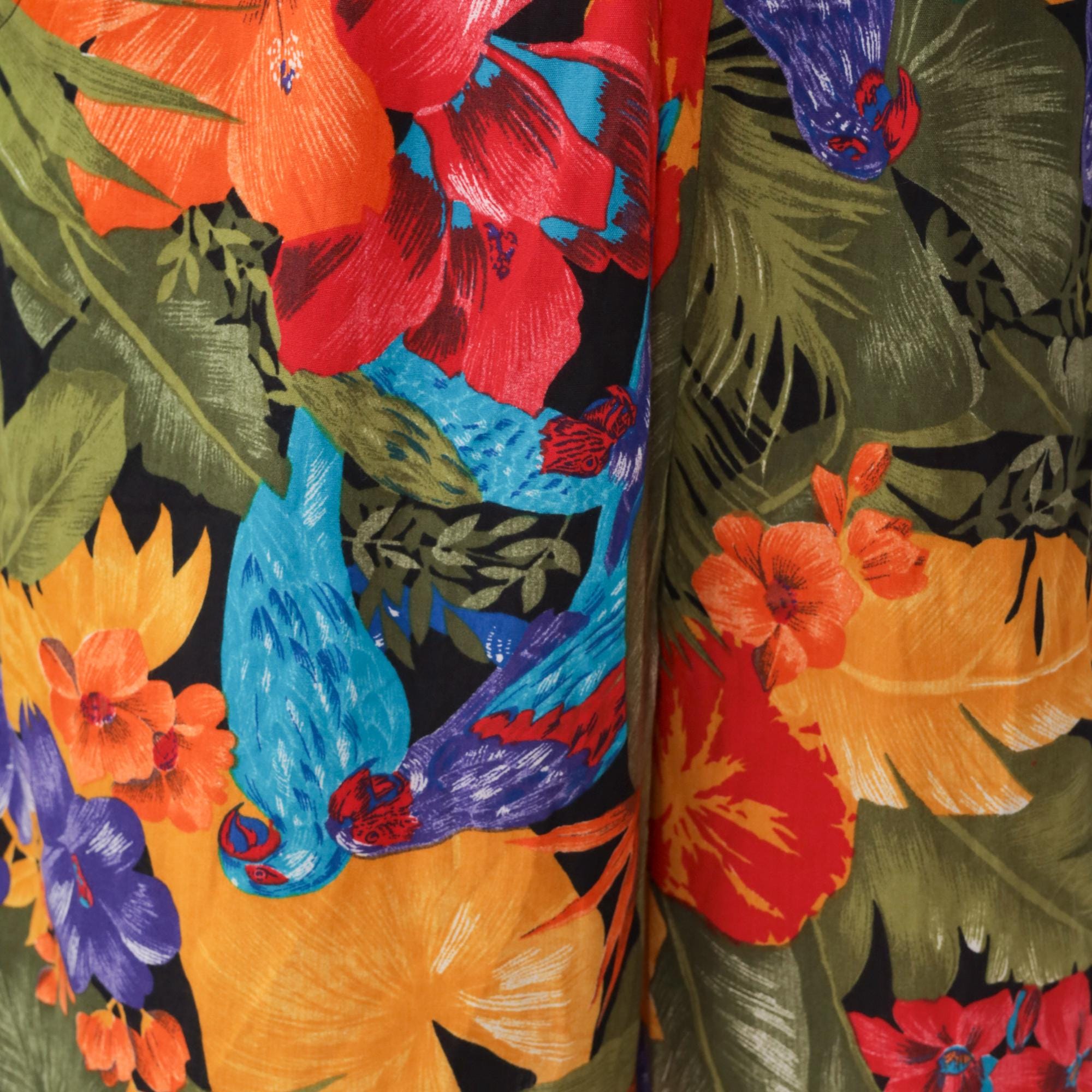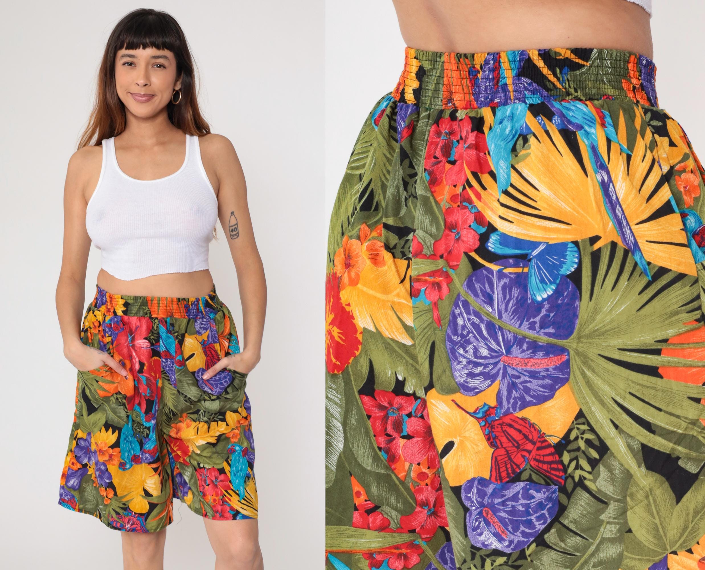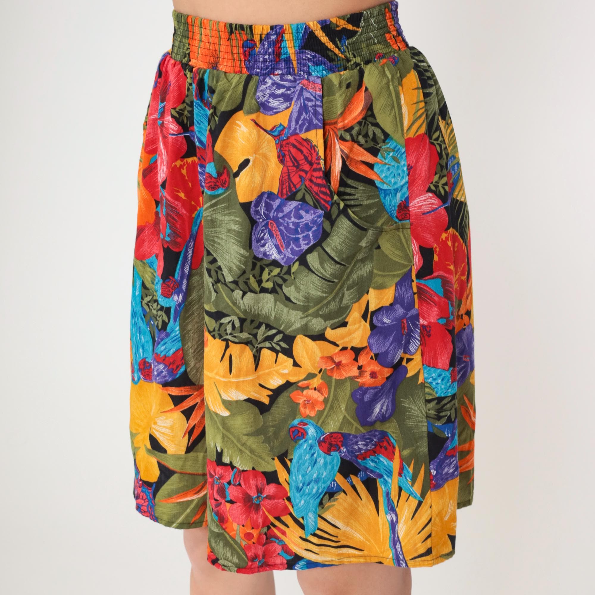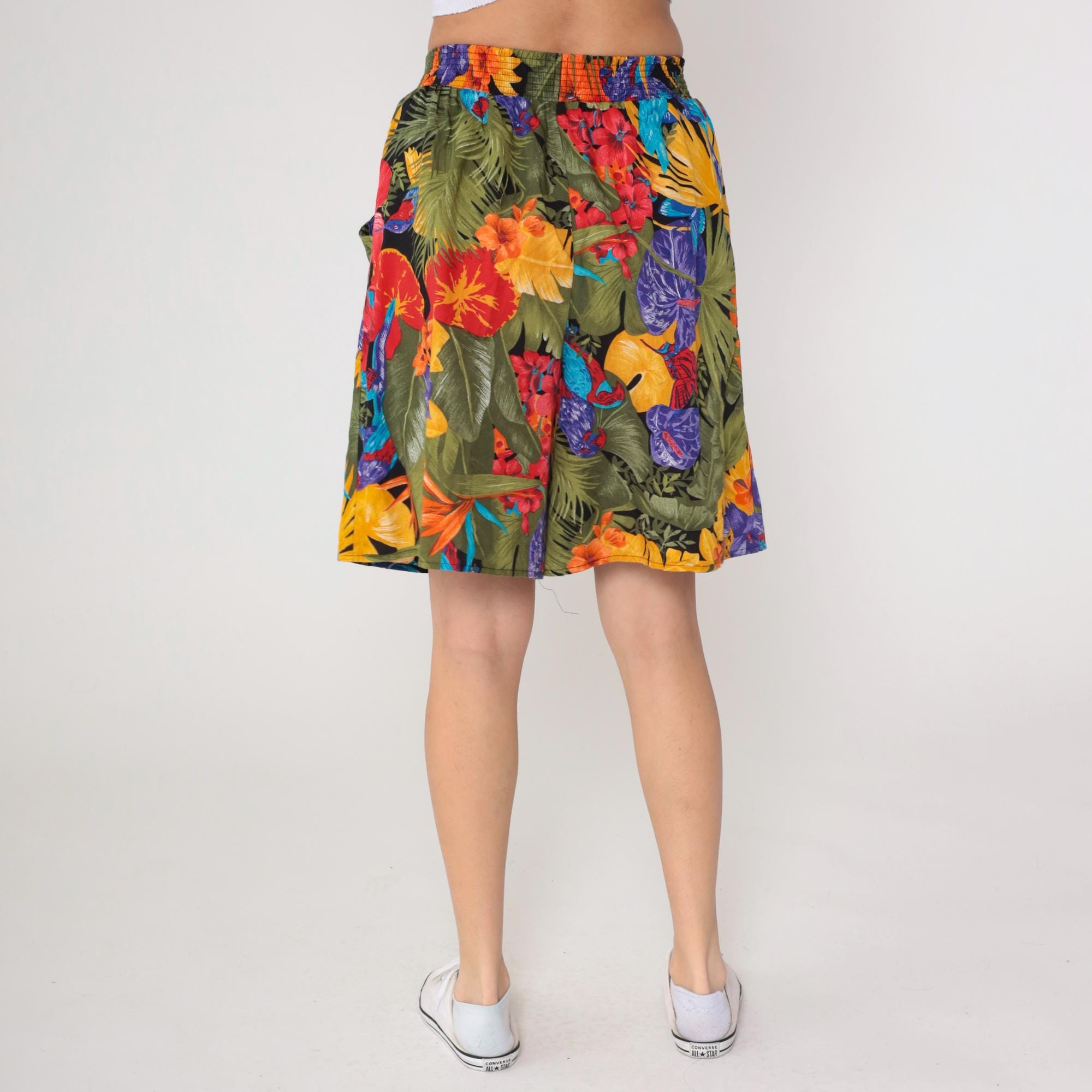 90s tropical floral shorts from Connections with bold botanical print featuring large-scale flowers and leaves in yellow, red, purple, orange, and blue against an olive green base.