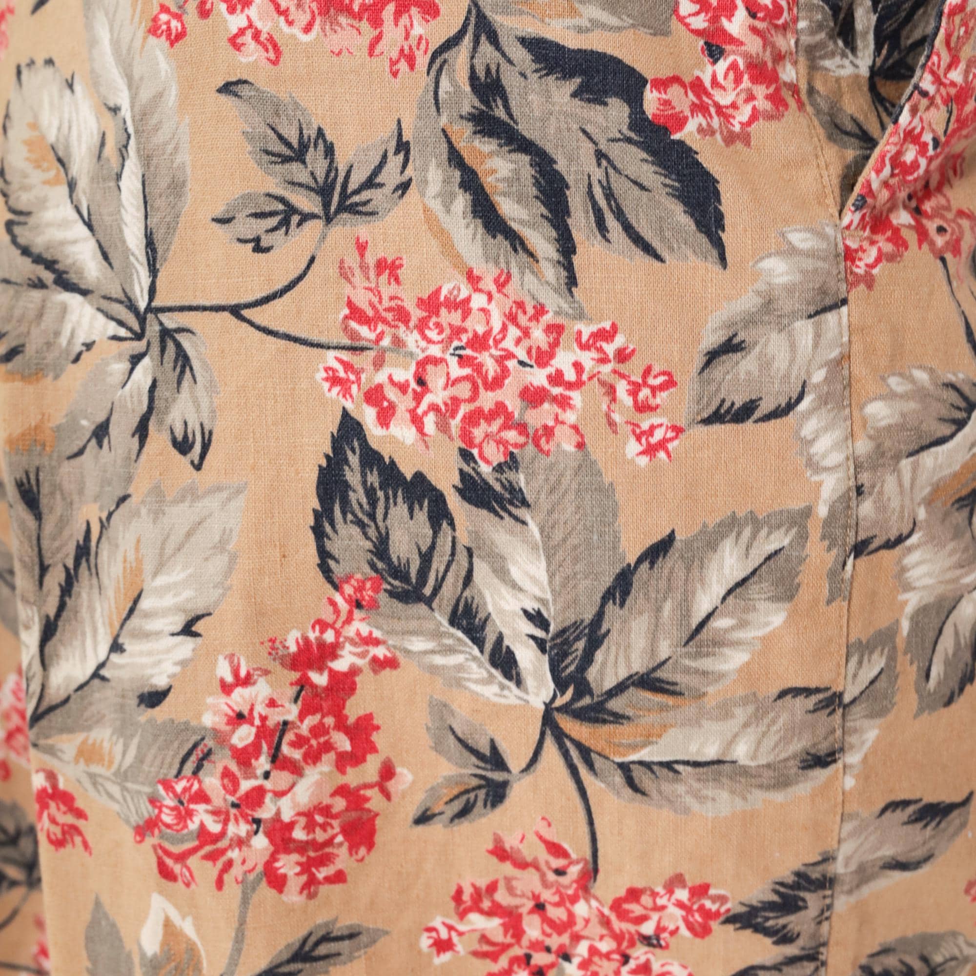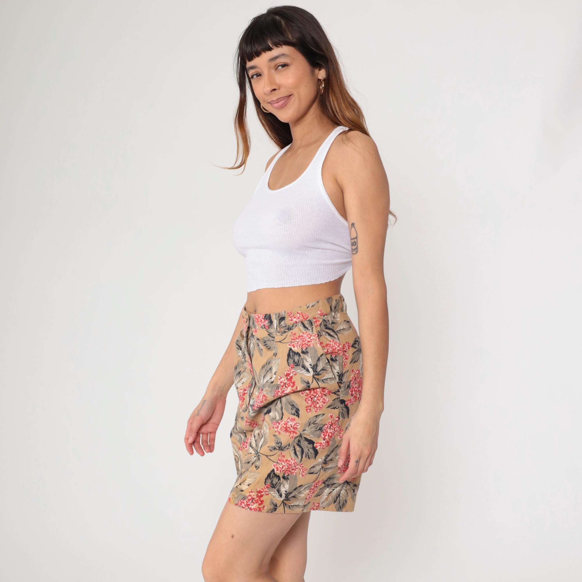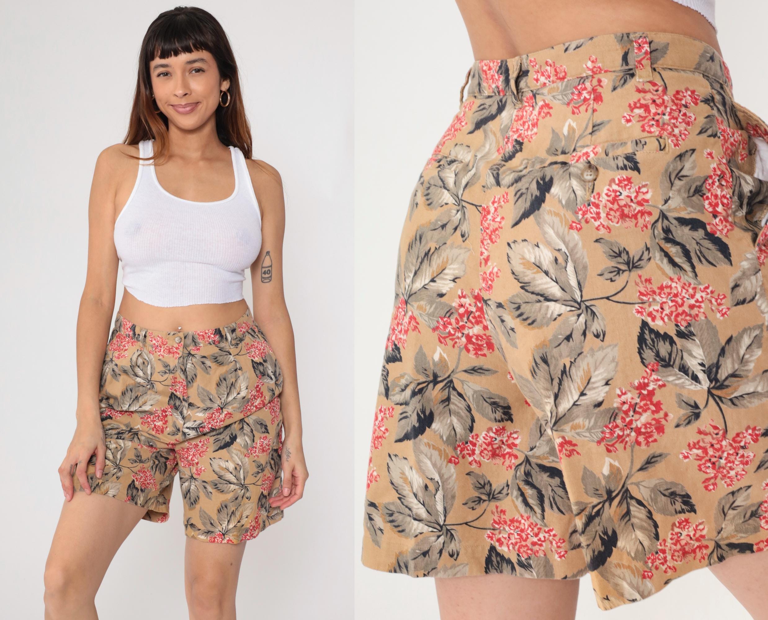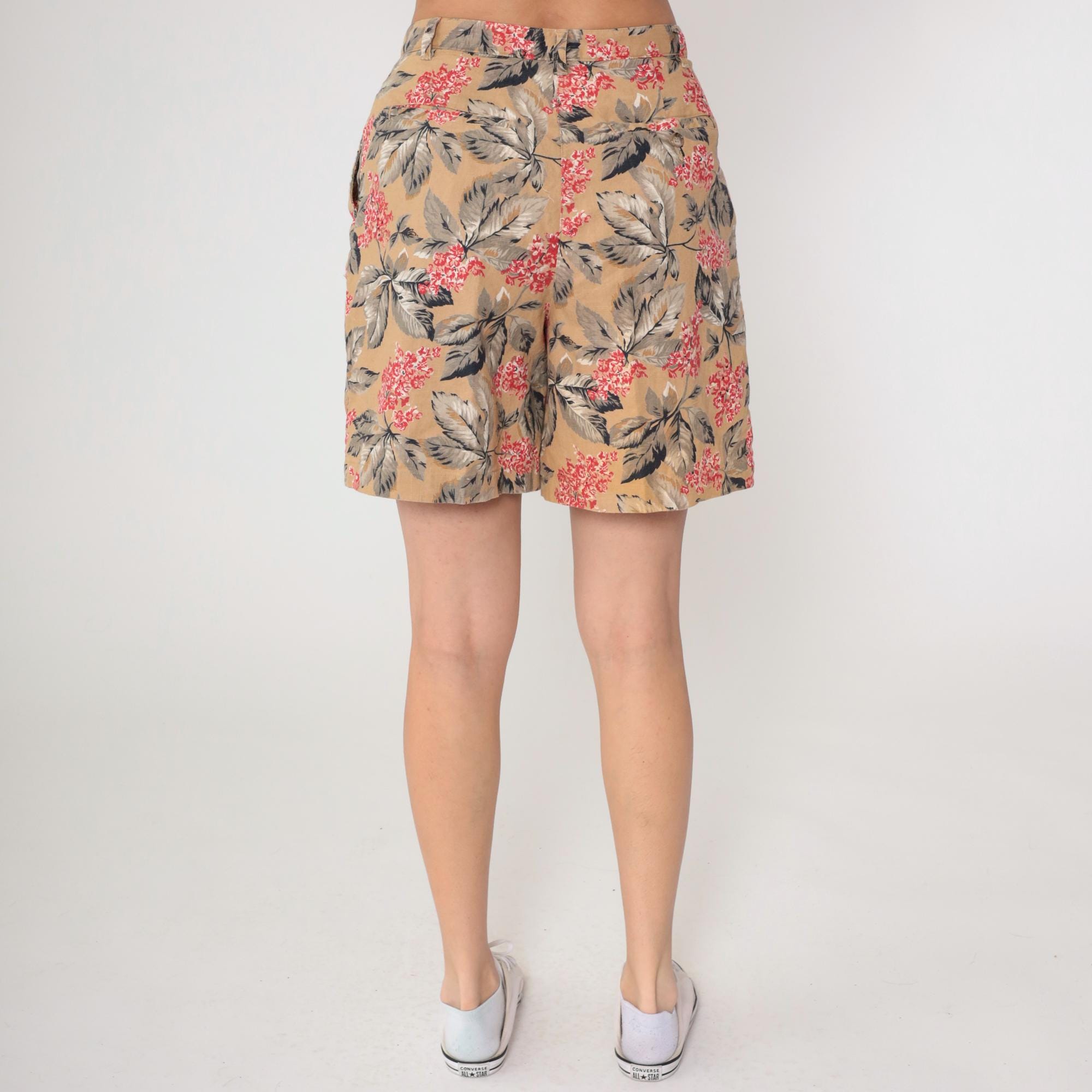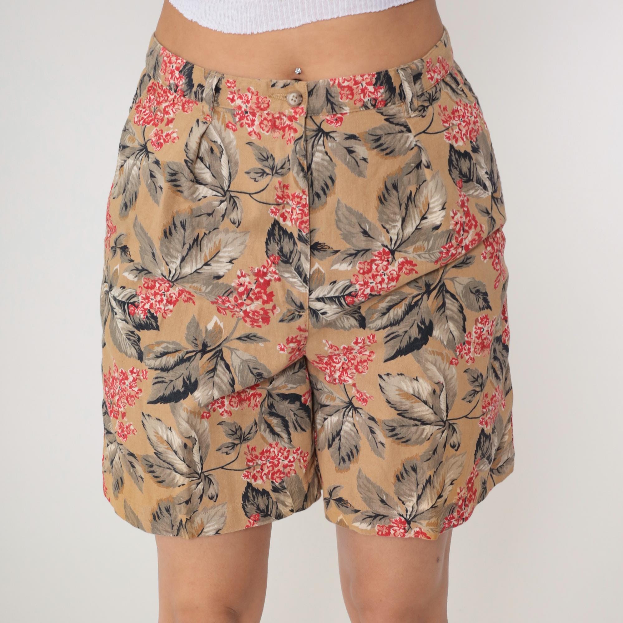 Y2K tan floral print shorts from Jones New York with red and pink flowers and gray leaves across the fabric. High-waisted wide leg silhouette with pleated front, button and zip closure, side pockets.