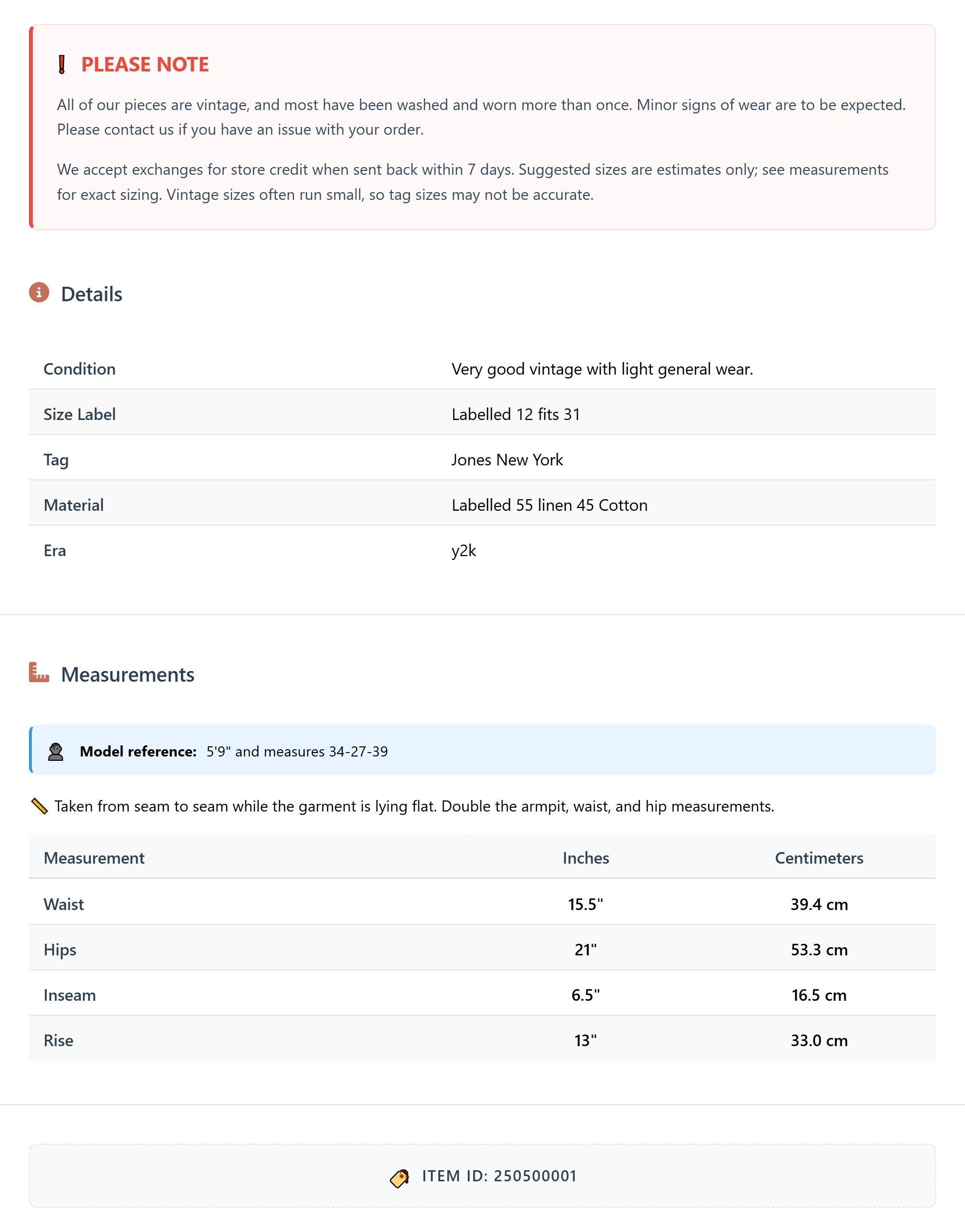 Vintage denim was usually made without any stretch, unlike modern jeans. Check the measurements to ensure proper fit, and remember to give yourself a little wiggle room in the waist and hips, depending on your preferred fit.