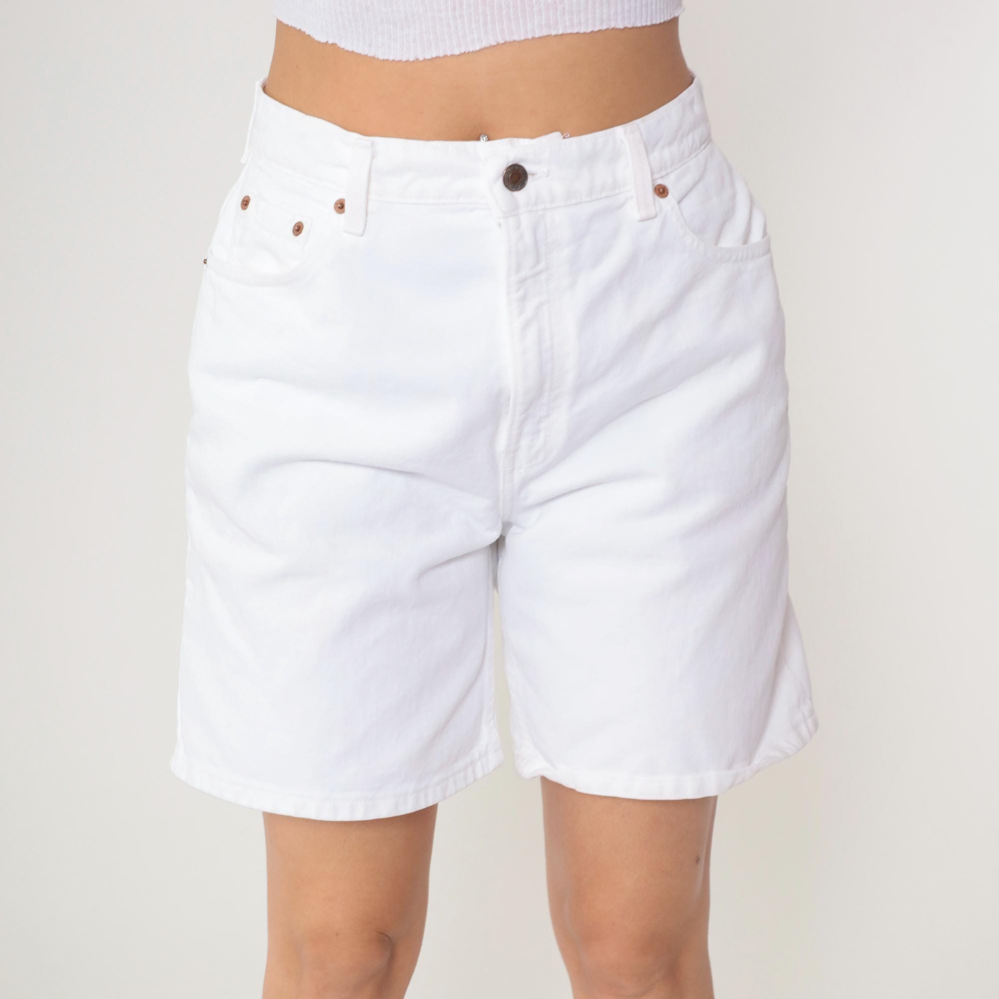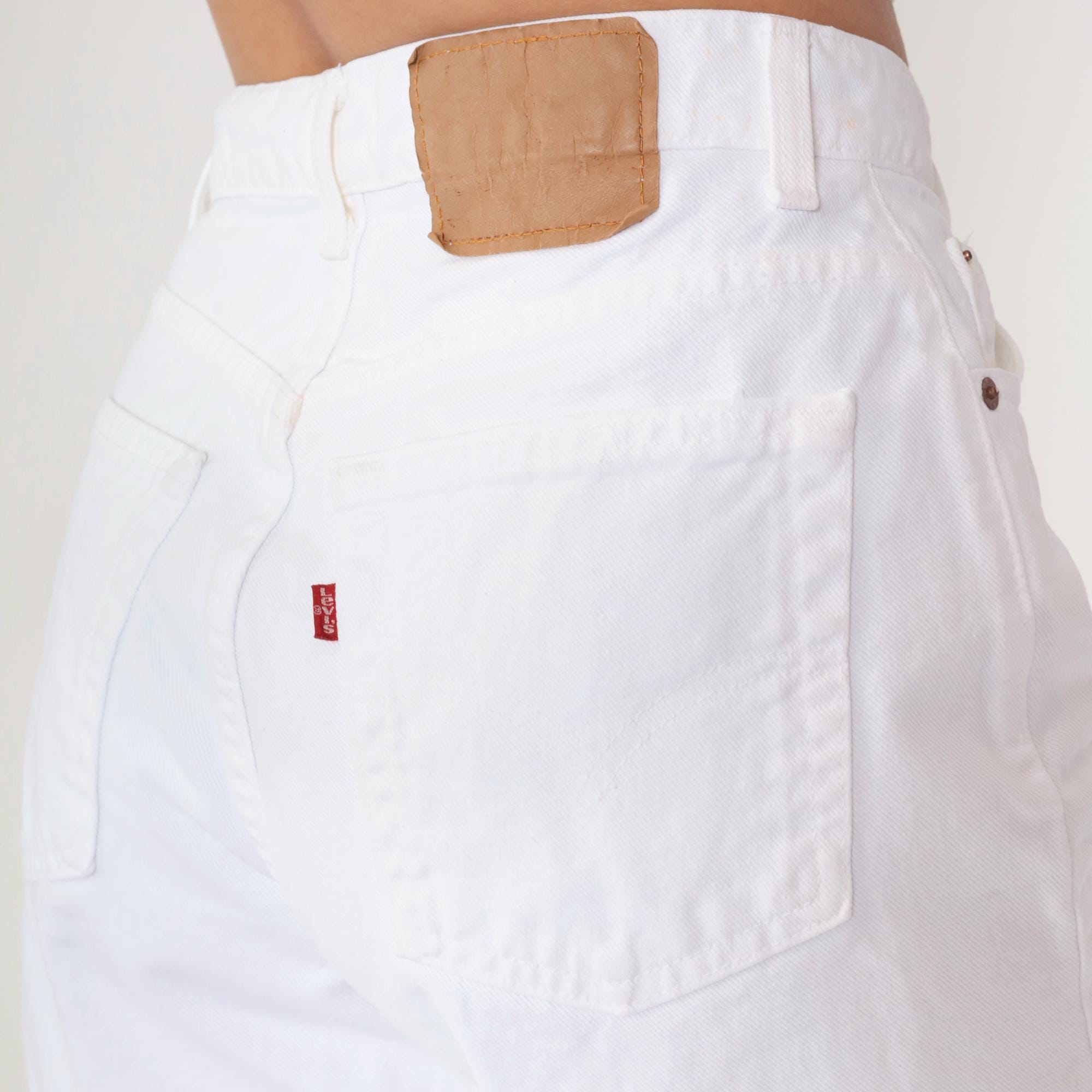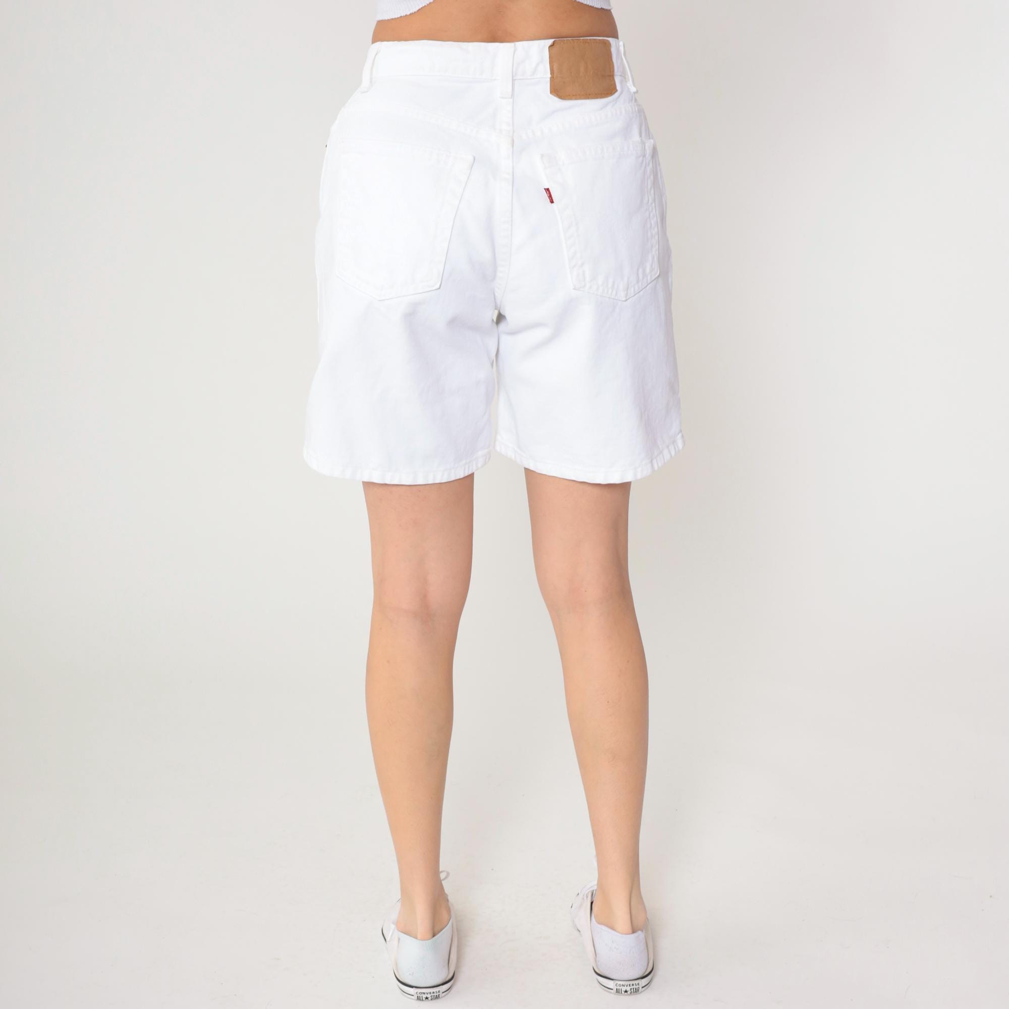 90s white denim shorts from Levi's in relaxed fit silhouette with mid-thigh length. Five-pocket styling with button fly closure, copper rivets, and tan leather back waistband patch with red Levi's tab on back pocket.