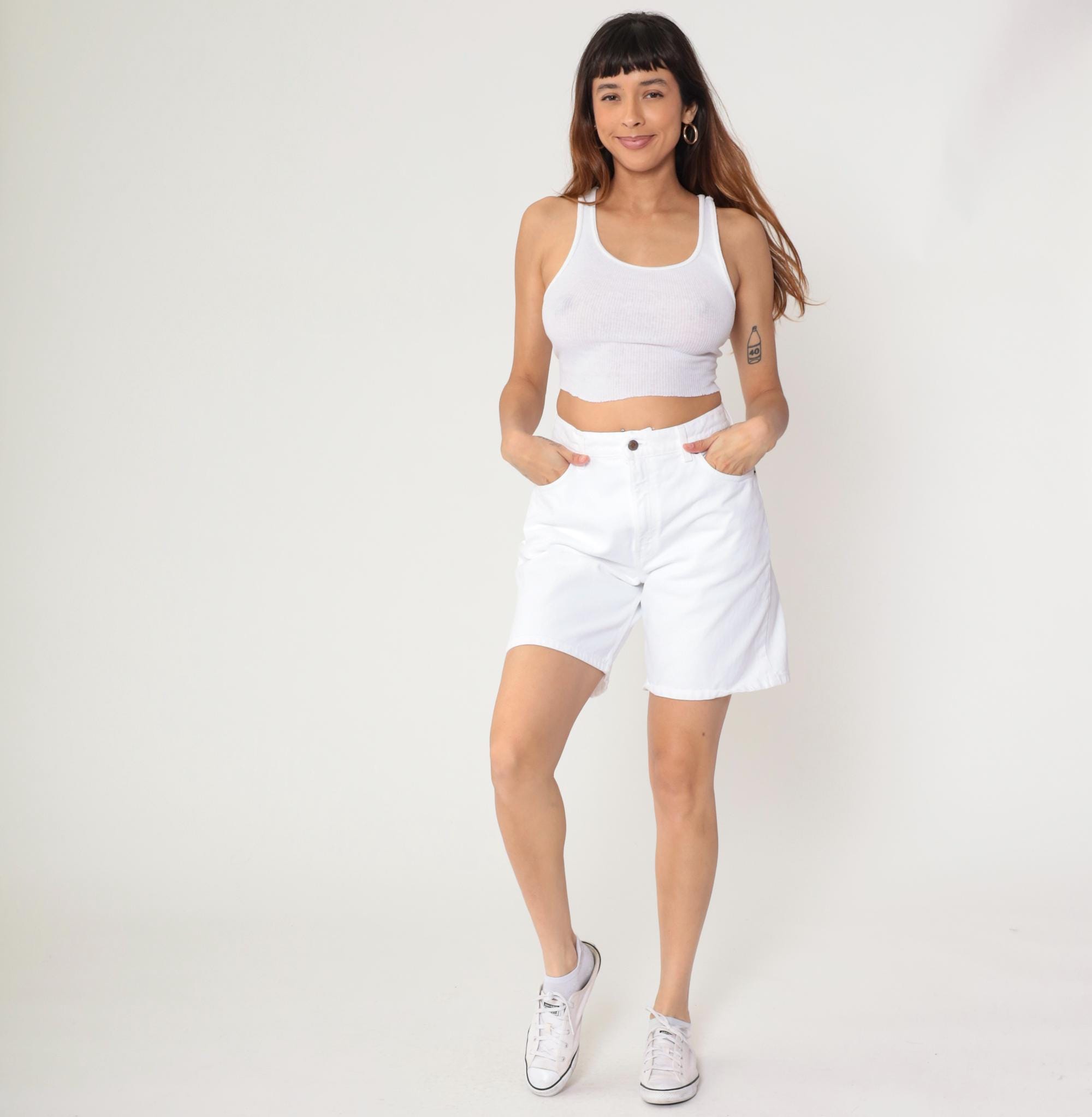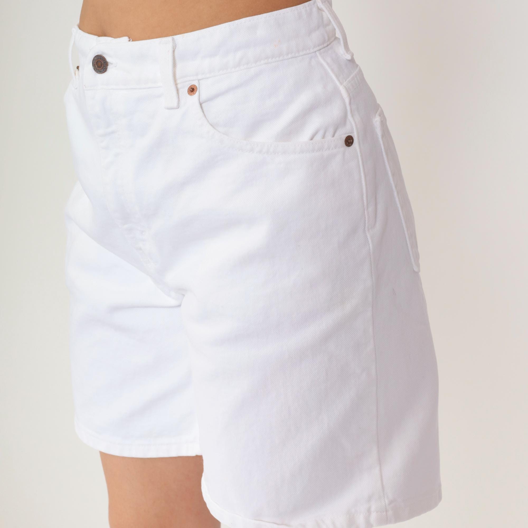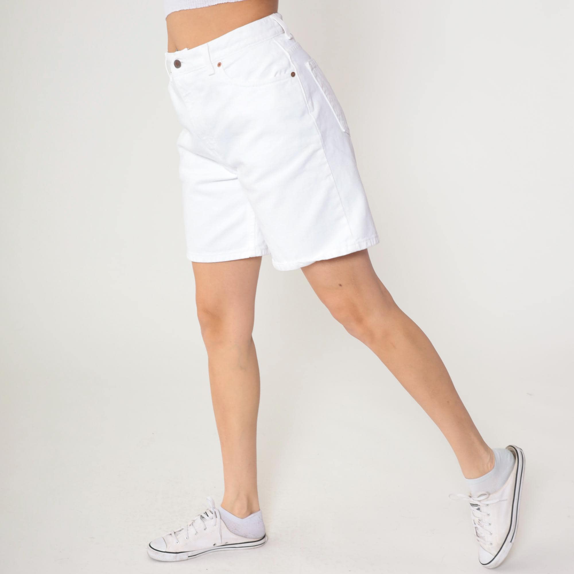 90s white denim shorts from Levi's in relaxed fit silhouette with mid-thigh length. Five-pocket styling with button fly closure, copper rivets, and tan leather back waistband patch with red Levi's tab on back pocket.