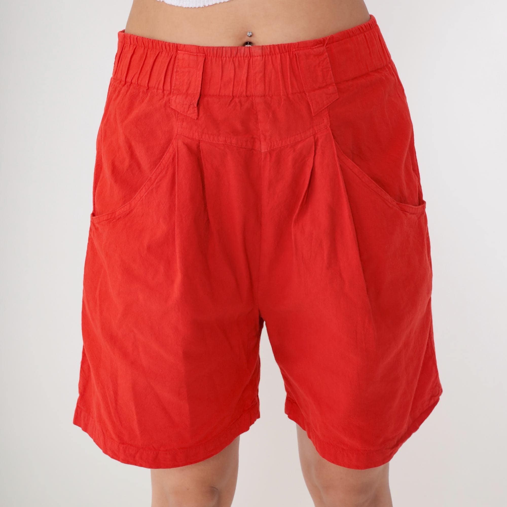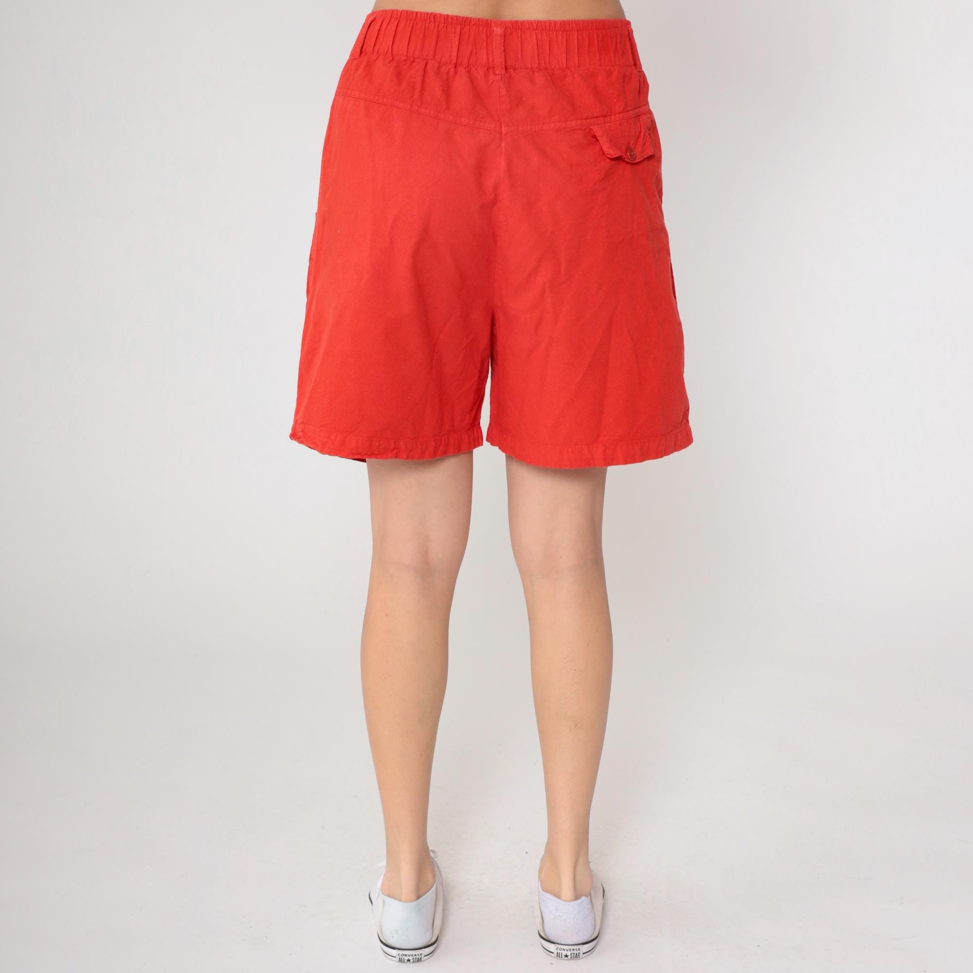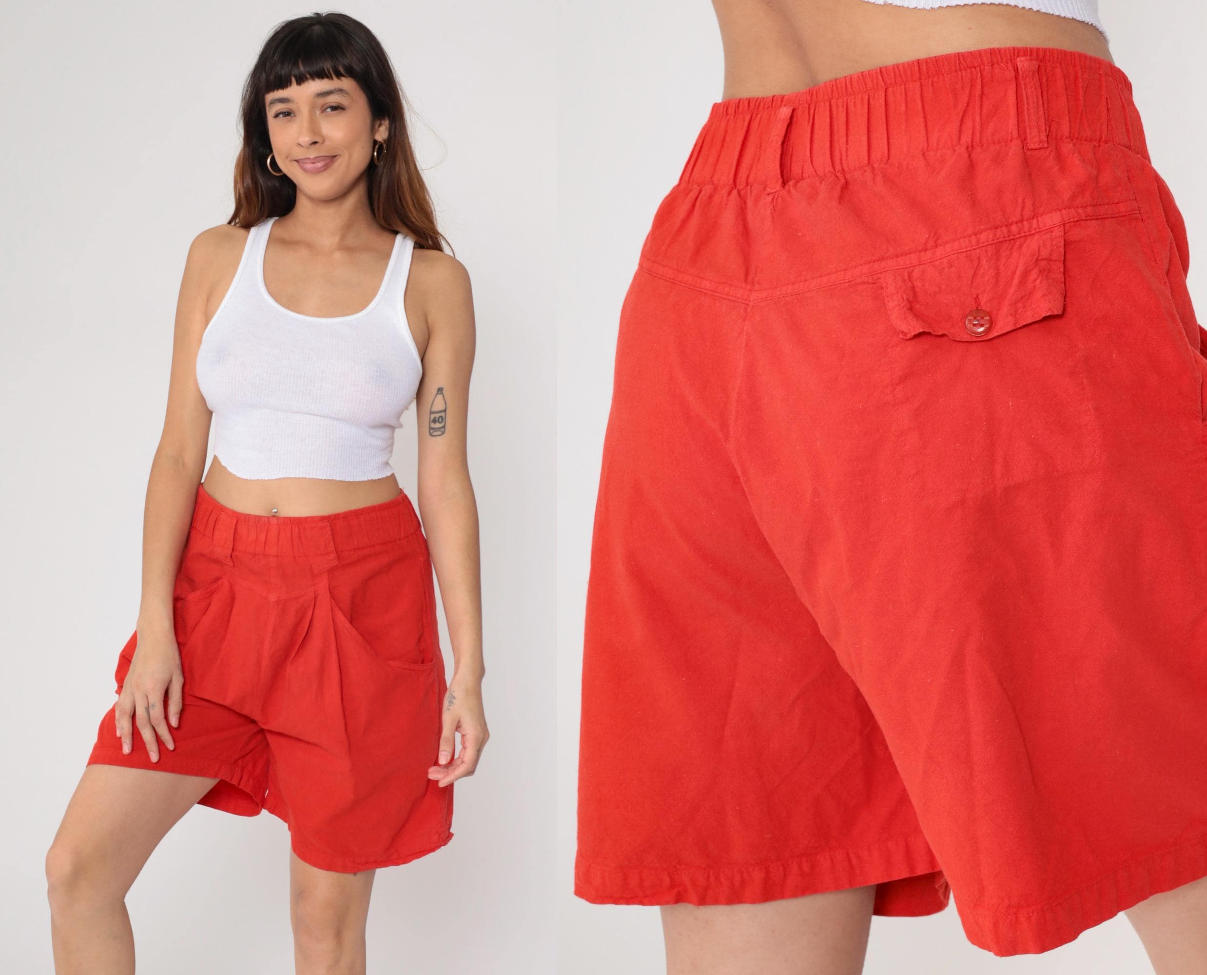 90s red elastic waist shorts from energie with front pockets and back button-flap pocket. Wide leg cut with relaxed fit through hip and thigh.