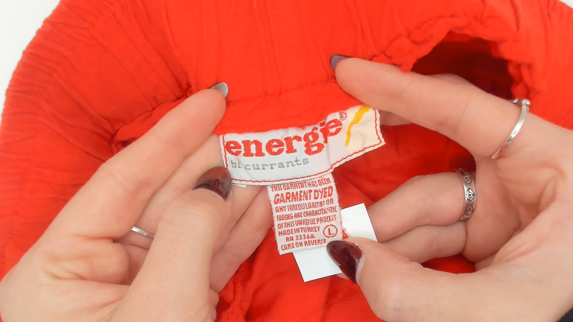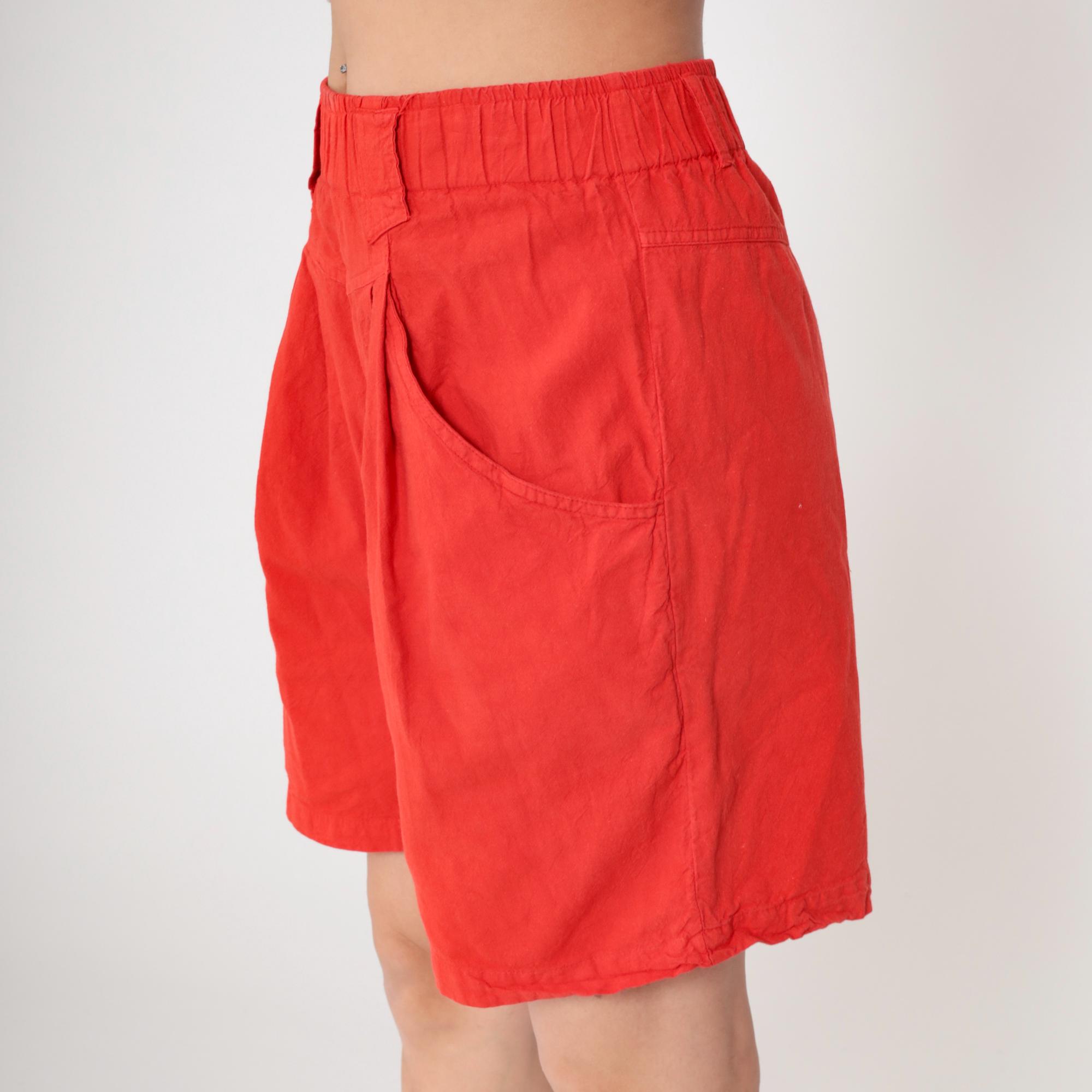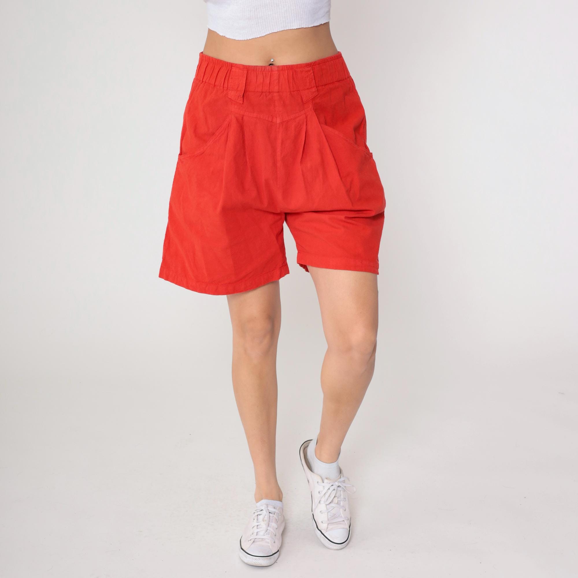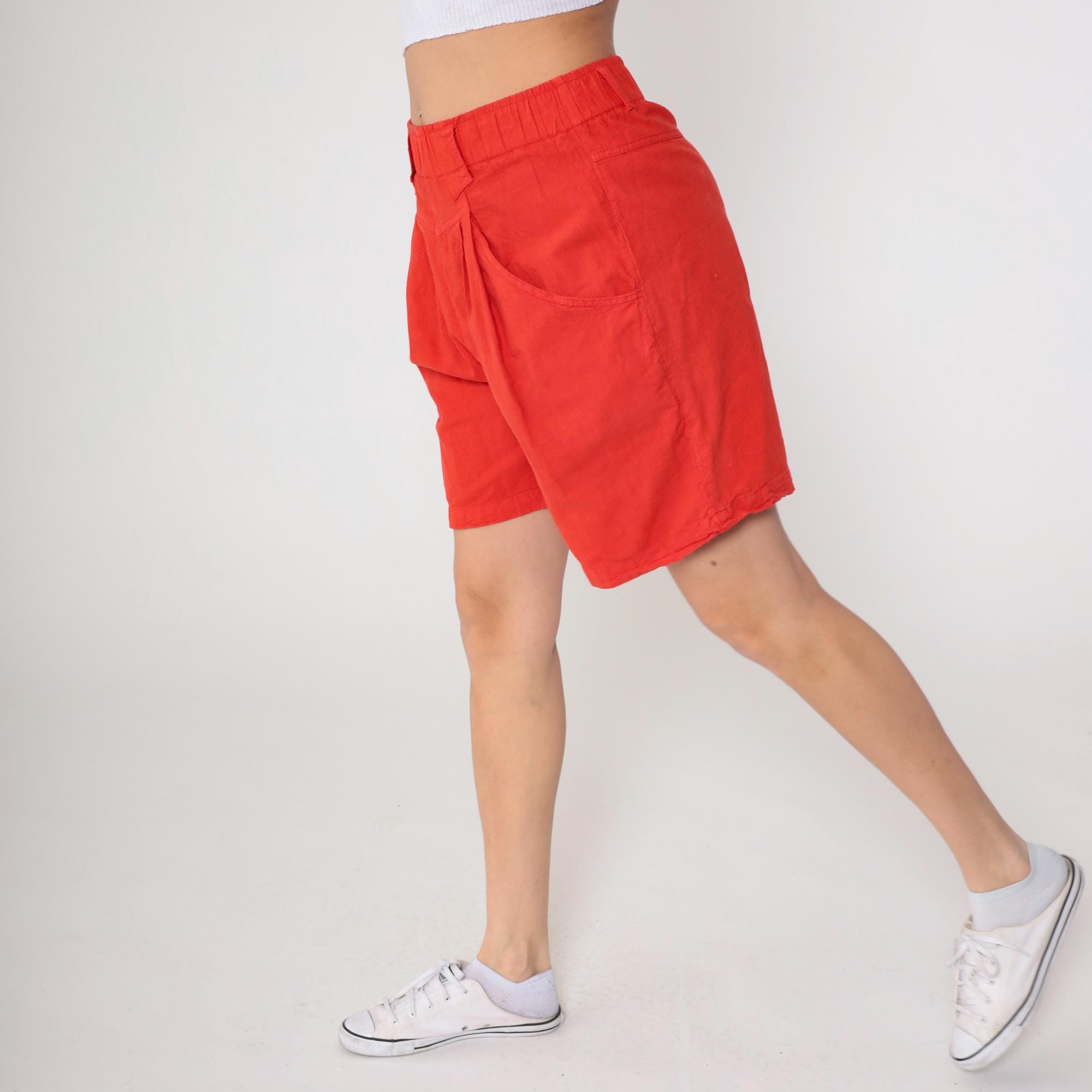 90s red elastic waist shorts from energie with front pockets and back button-flap pocket. Wide leg cut with relaxed fit through hip and thigh.