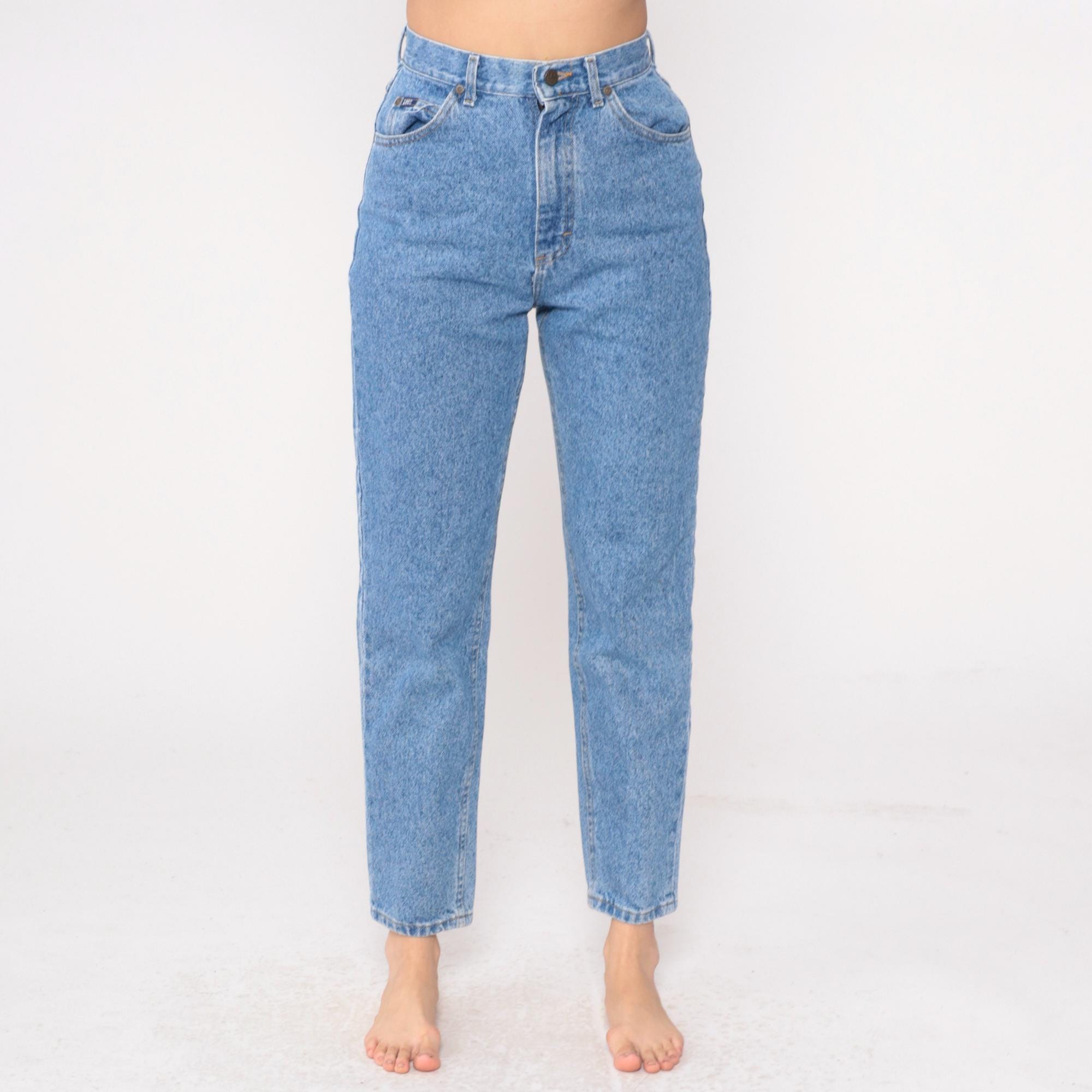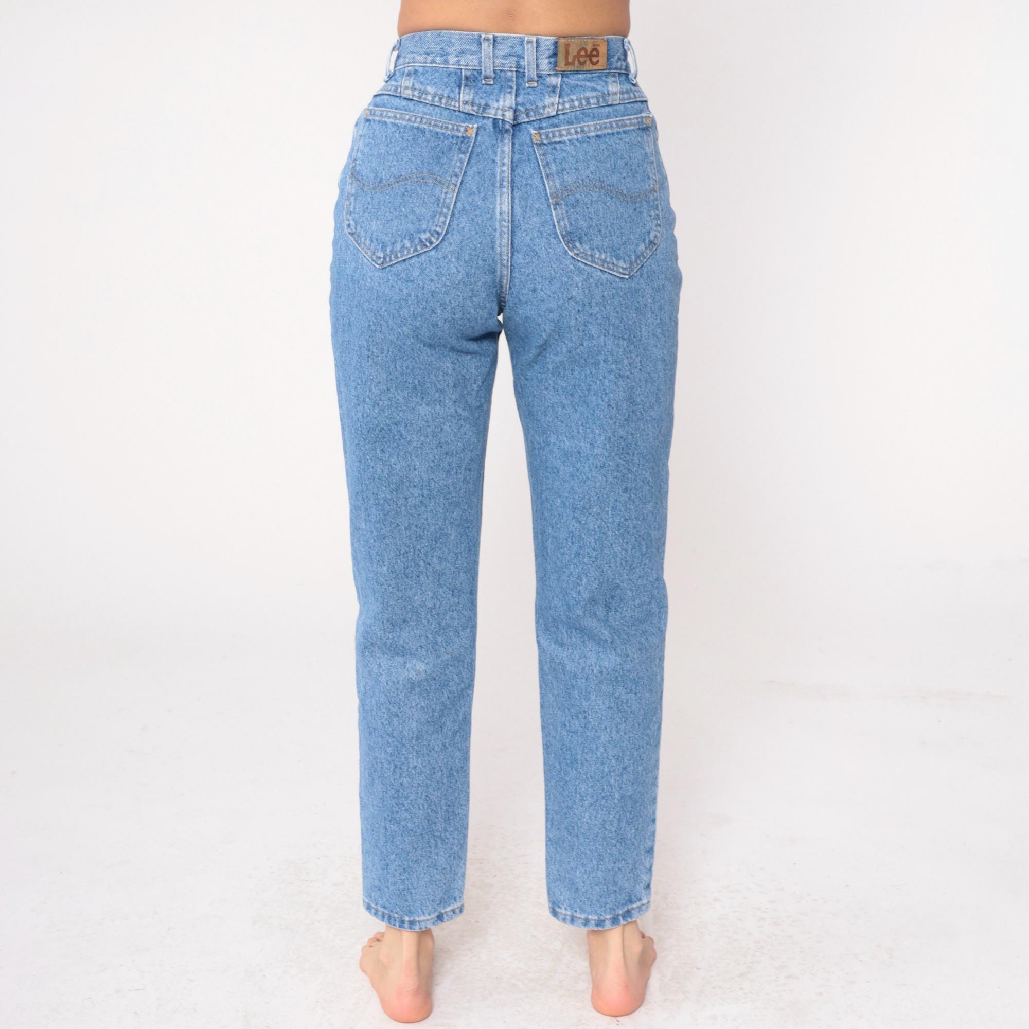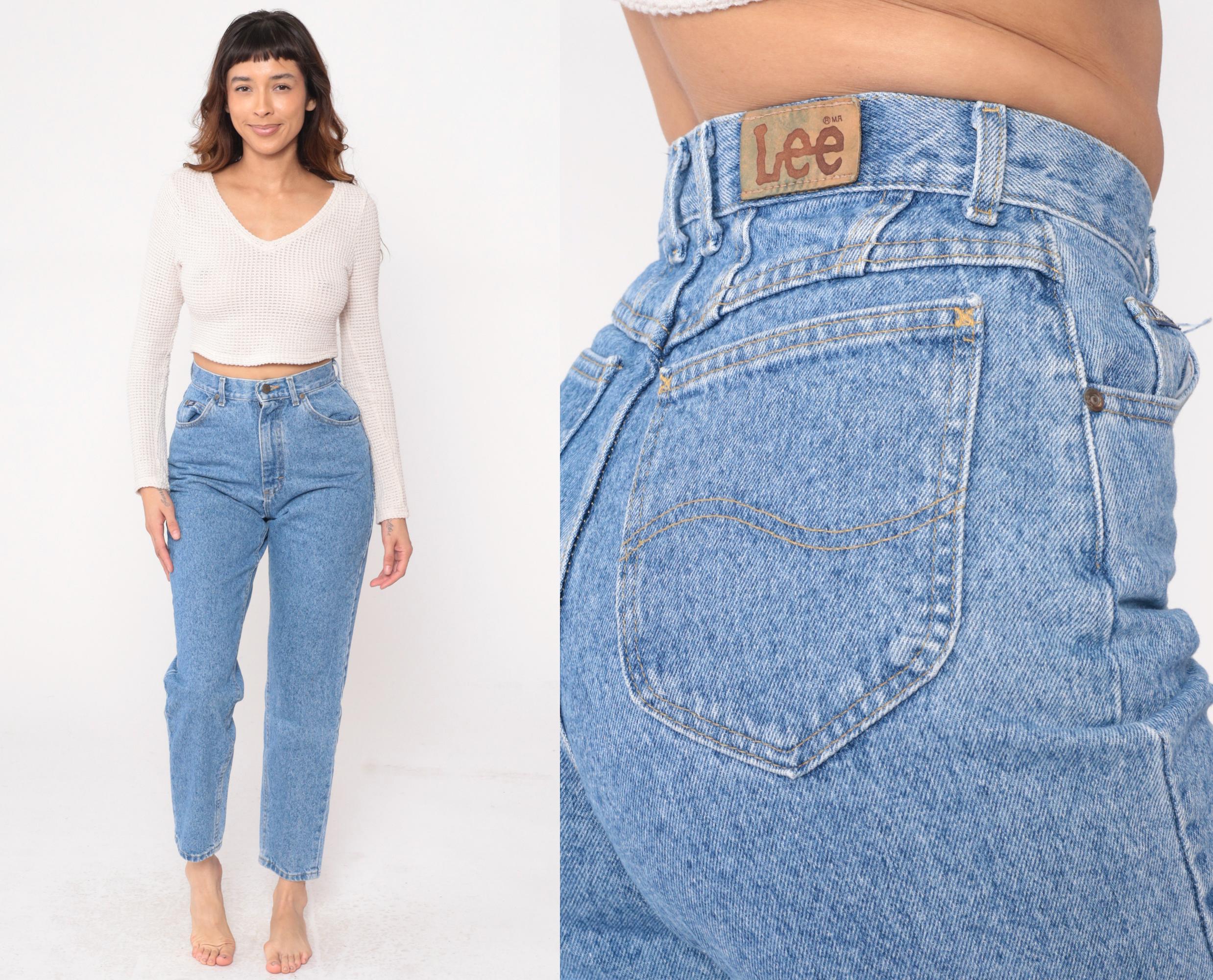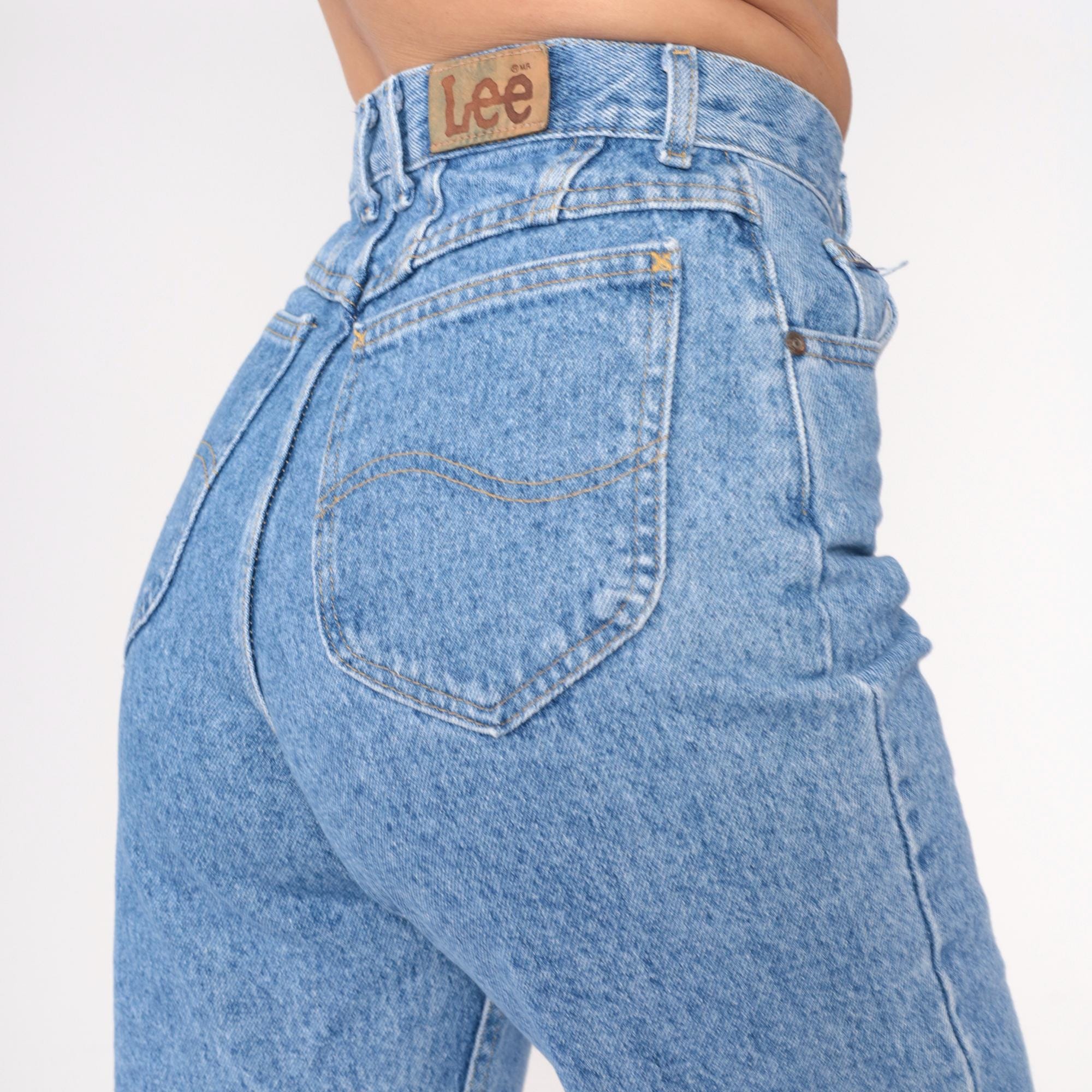 90s light blue high-waisted jeans from Lee with classic straight leg cut and ankle-length inseam. Five-pocket styling with button fly closure and signature Lee leather patch at back waistband.
