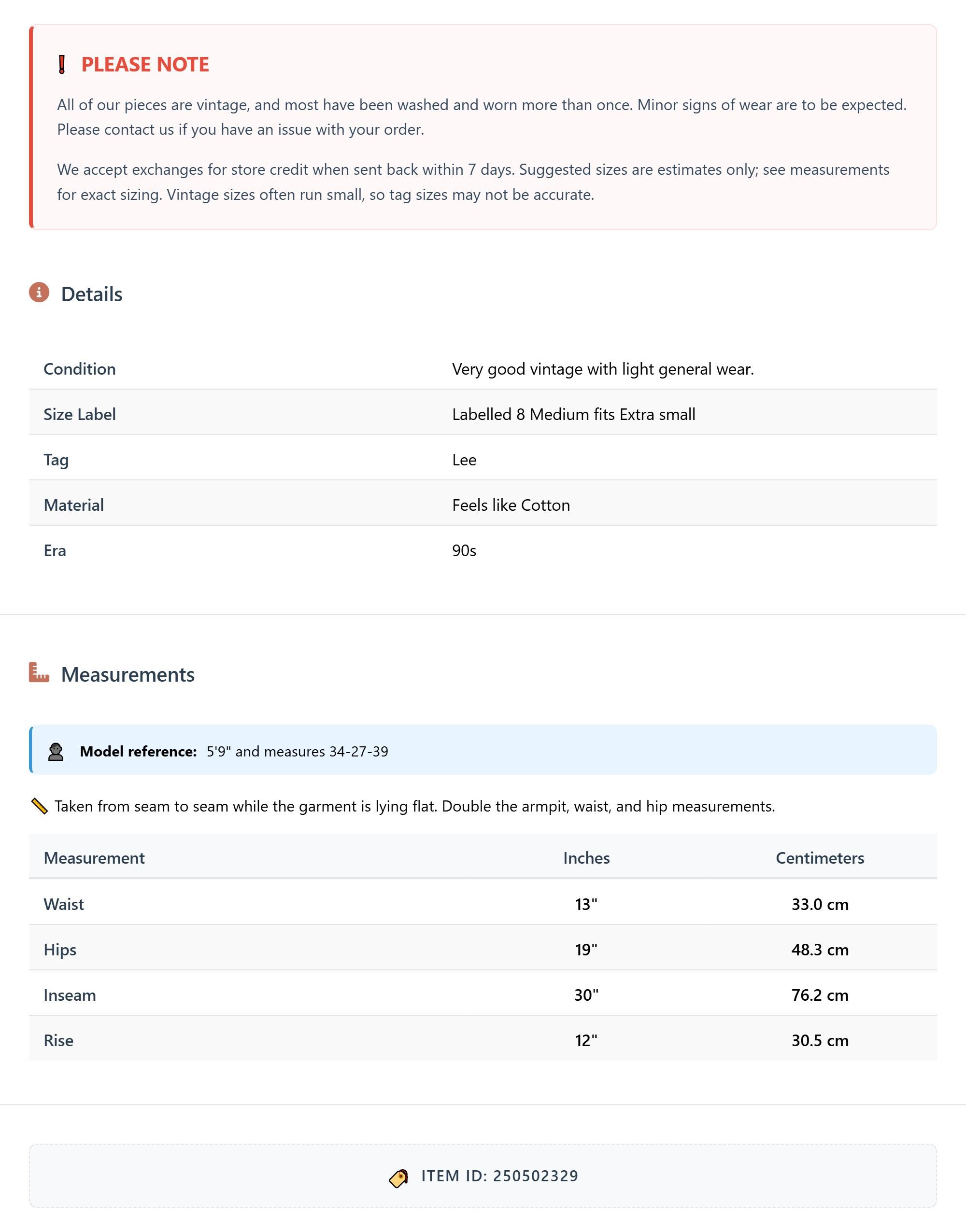 Vintage denim was usually made without any stretch, unlike modern jeans. Check the measurements to ensure proper fit, and remember to give yourself a little wiggle room in the waist and hips, depending on your preferred fit.