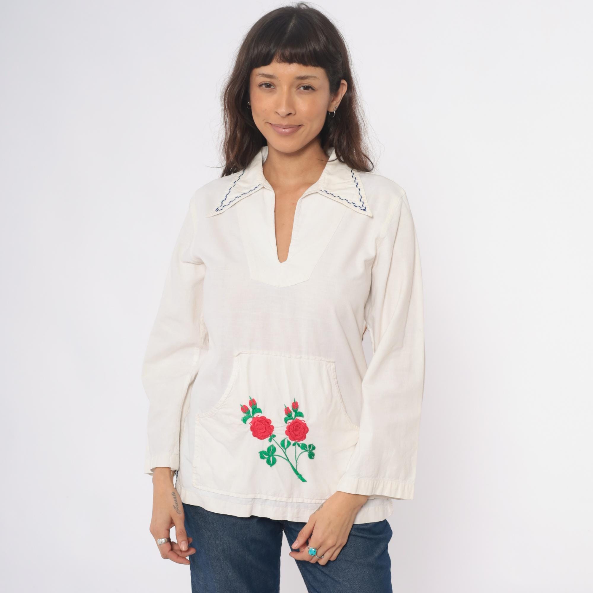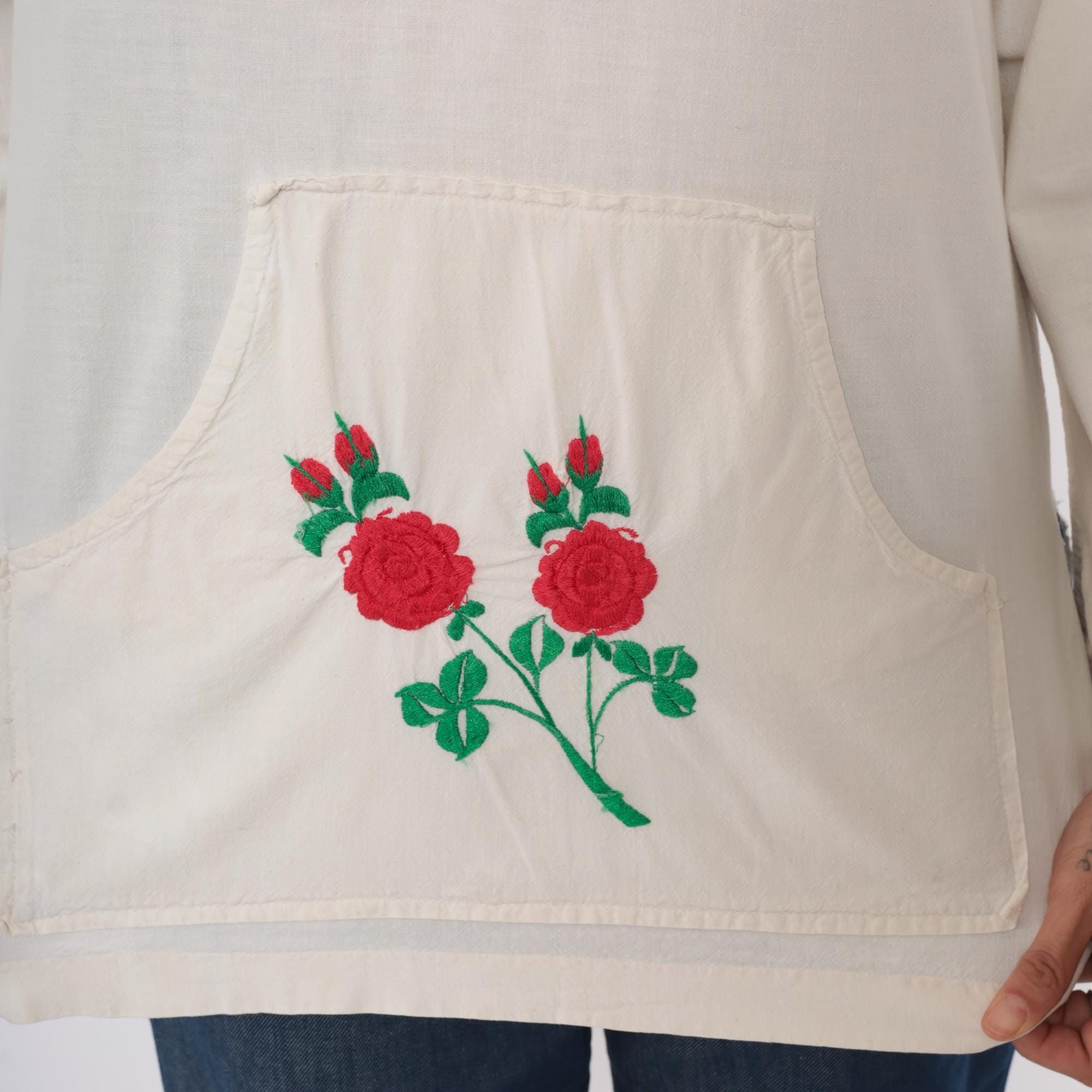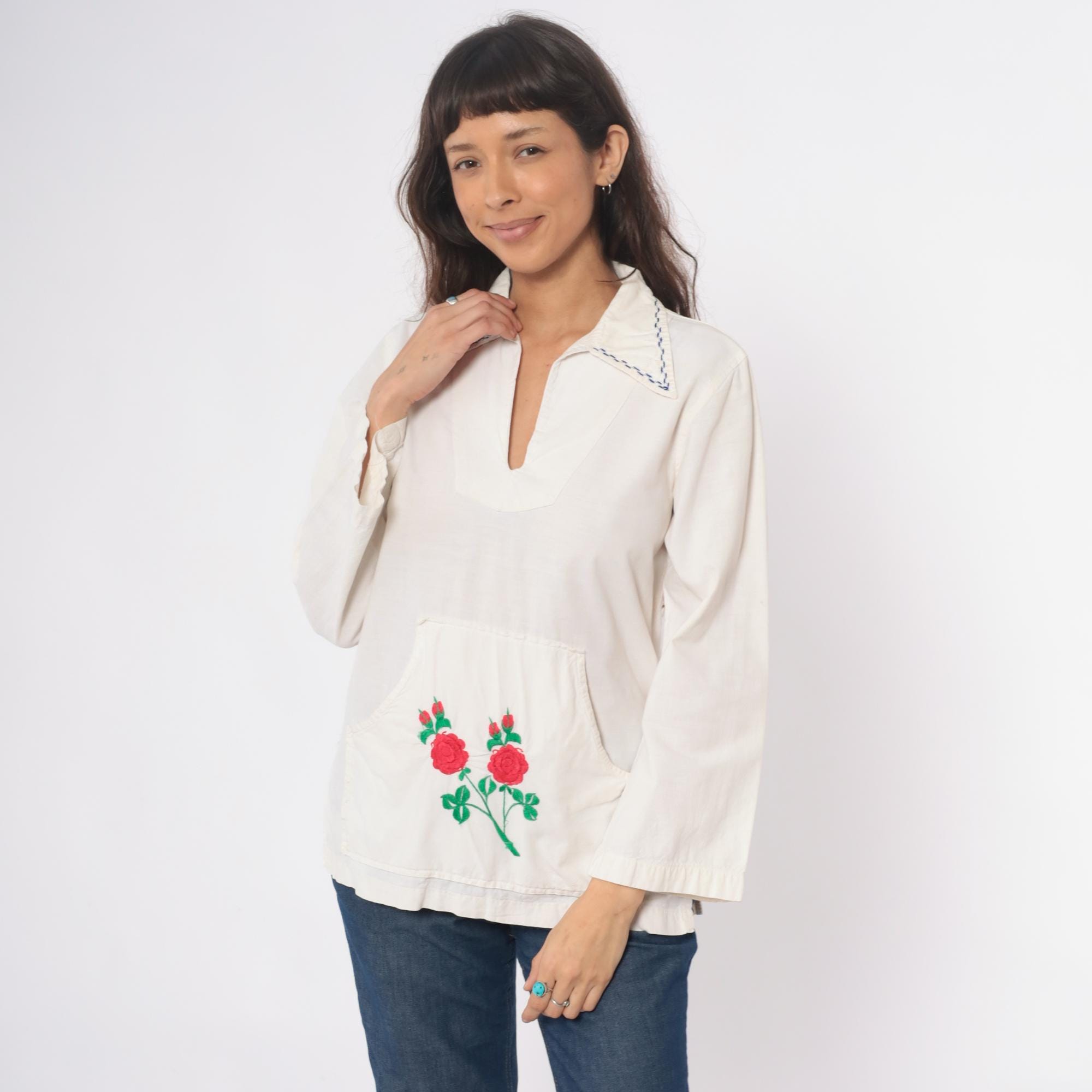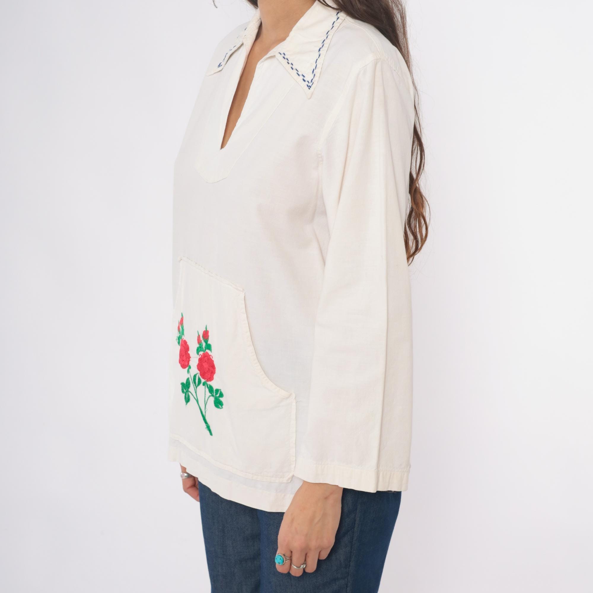70s cream tunic with embroidered red and pink roses on the lower front pocket area, green stems and leaves extending across the fabric. Wide spread collar with blue decorative stitching, V-neck opening, long sleeves. Front kangaroo-style pocket. Feels like cotton.