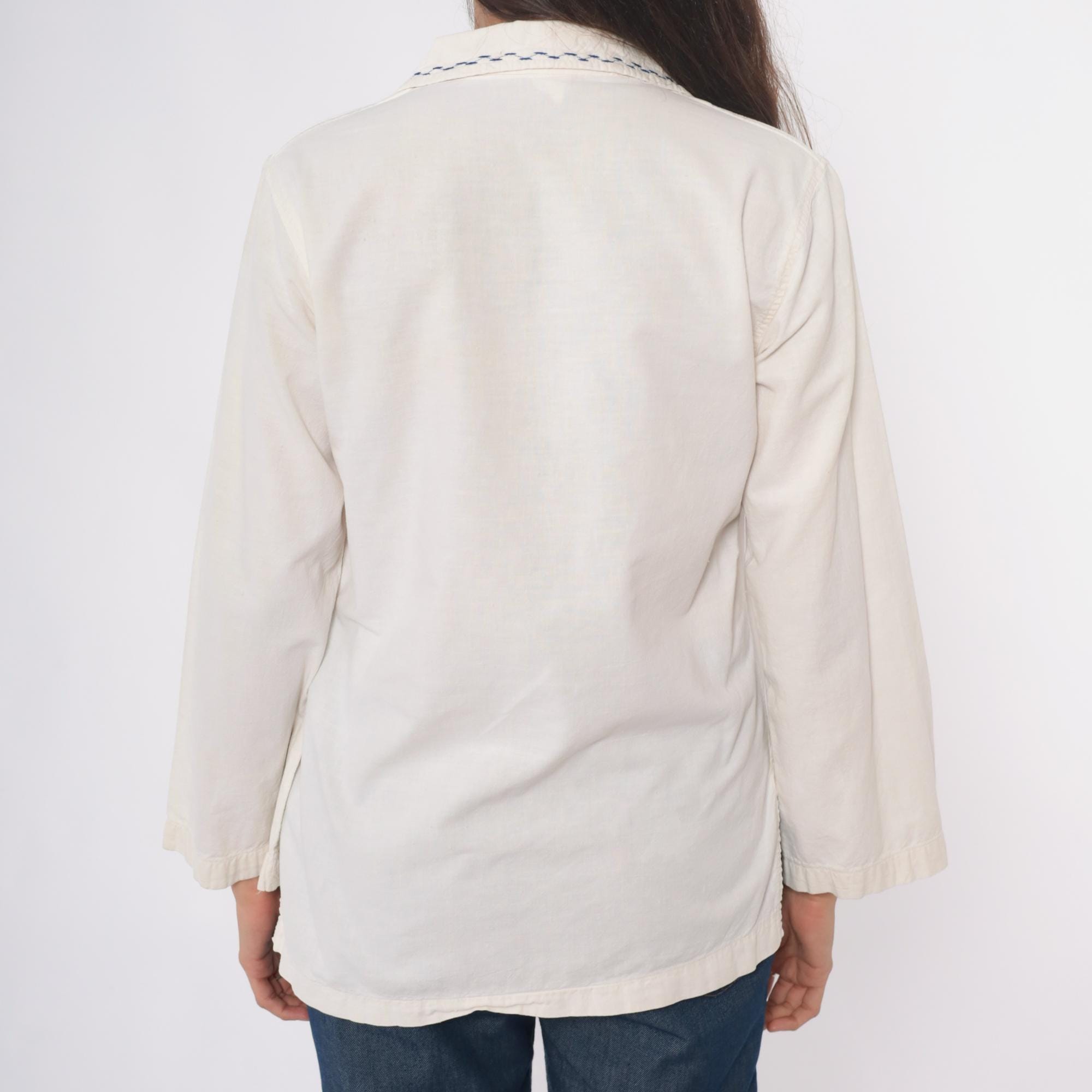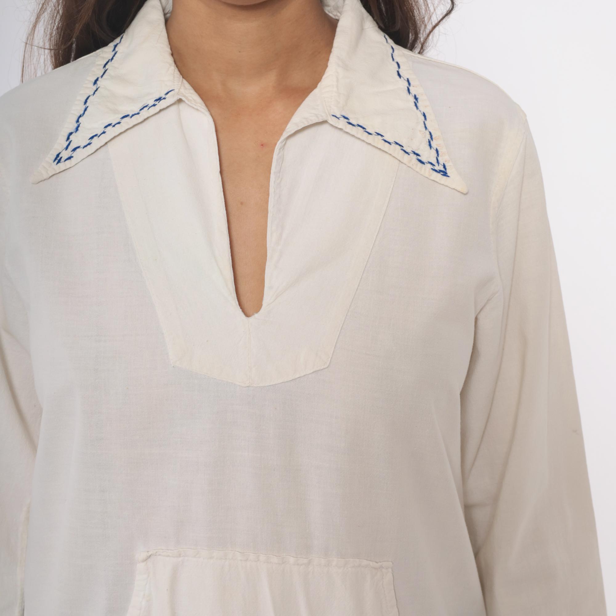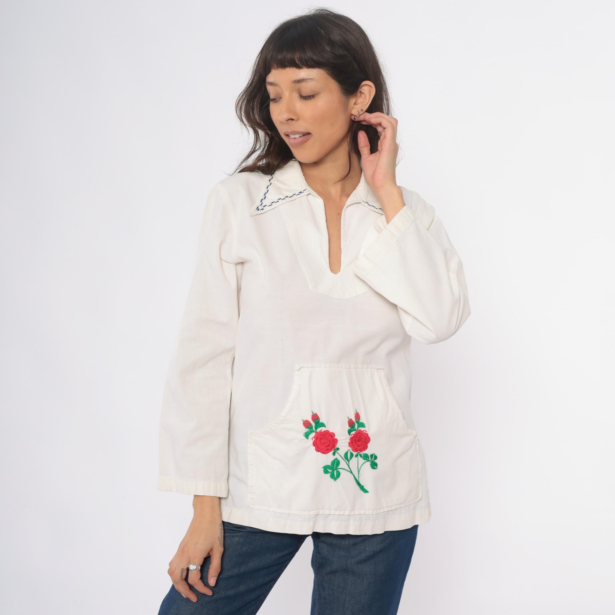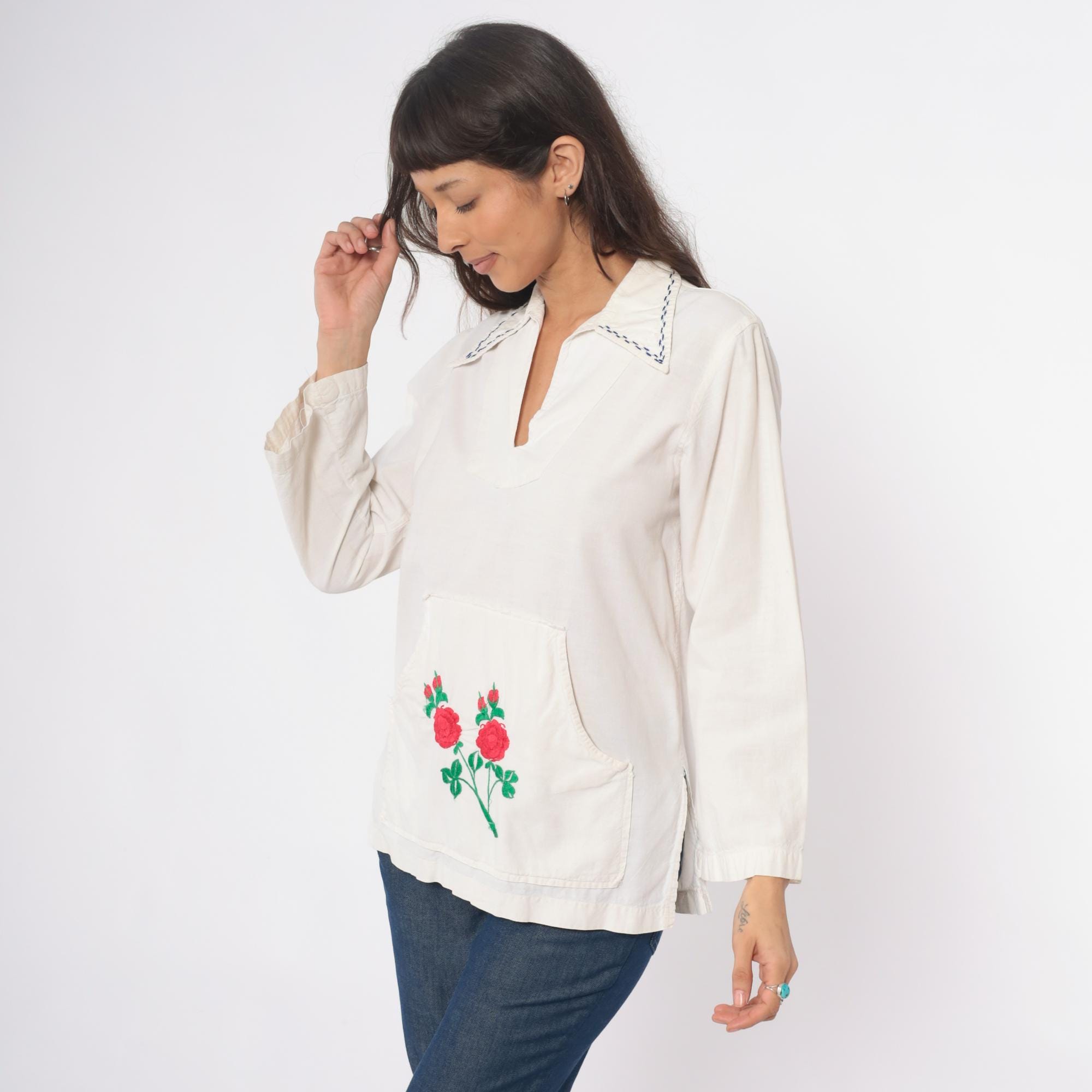 70s cream tunic with embroidered red and pink roses on the lower front pocket area, green stems and leaves extending across the fabric. Wide spread collar with blue decorative stitching, V-neck opening, long sleeves. Front kangaroo-style pocket. Feels like cotton.