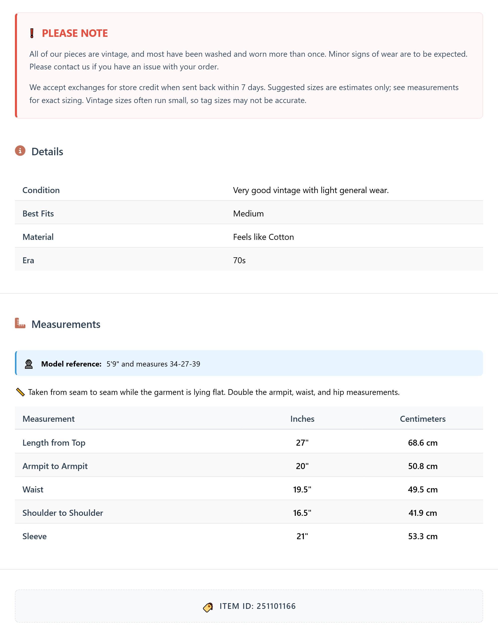 All of our pieces are vintage, and most have been washed and worn more than once. Minor signs of wear are to be expected. Please contact us if you have an issue with your order. We accept exchanges for store credit when sent back within 7 days.