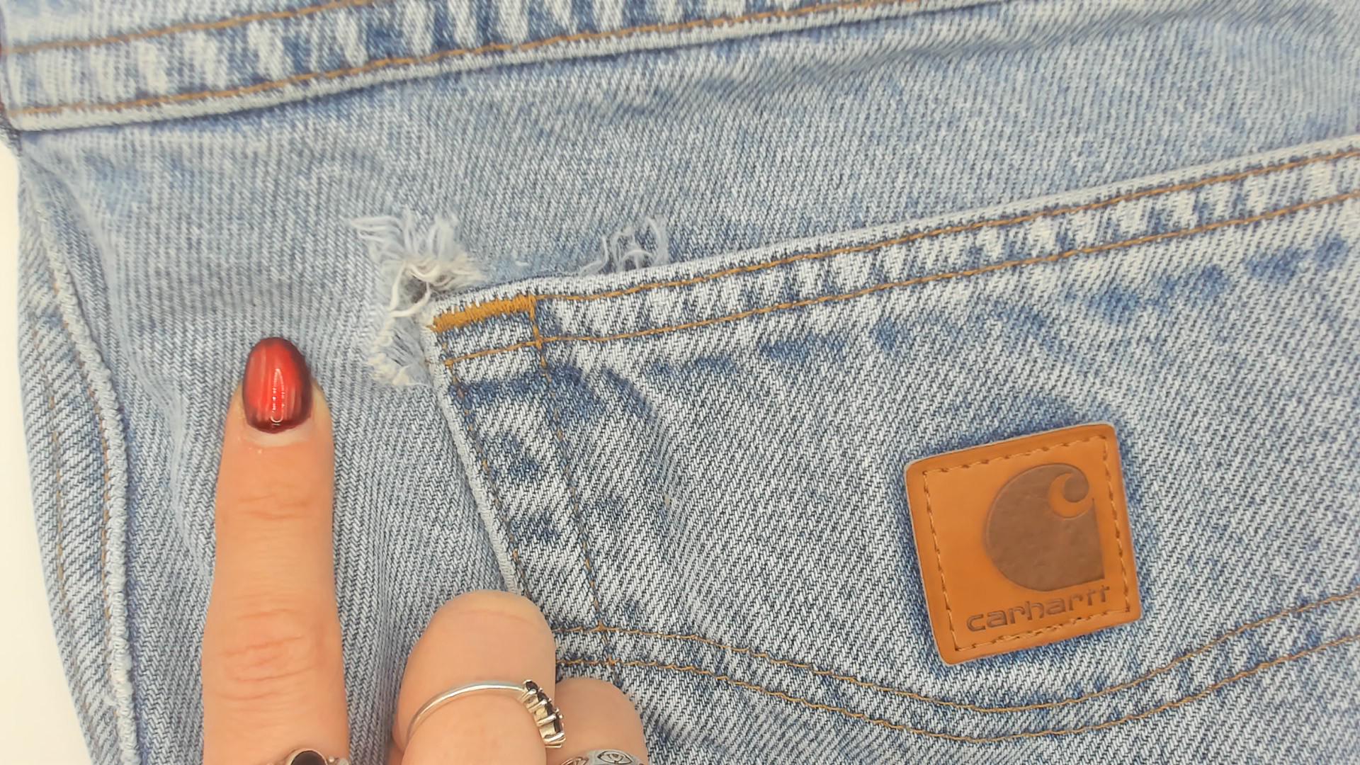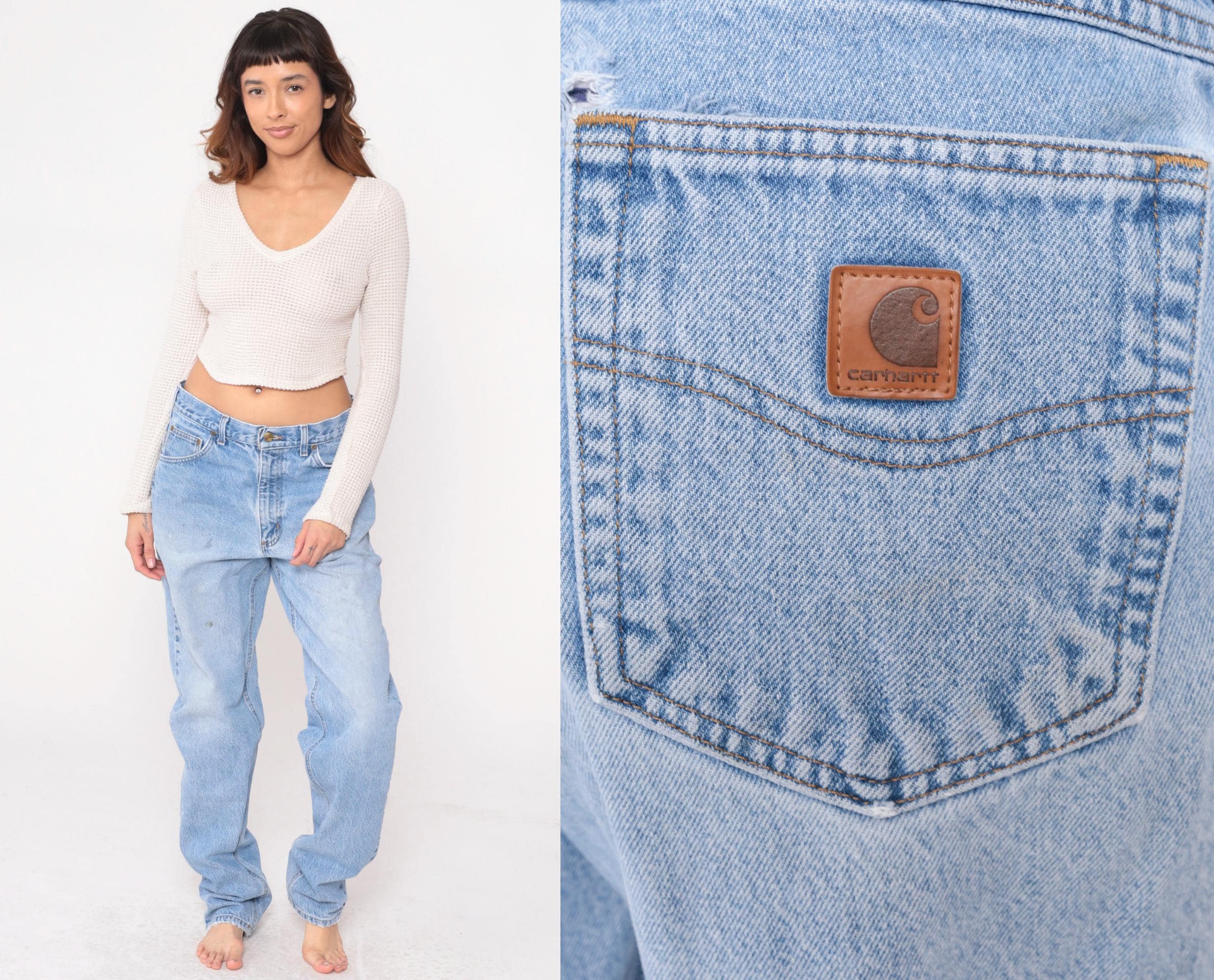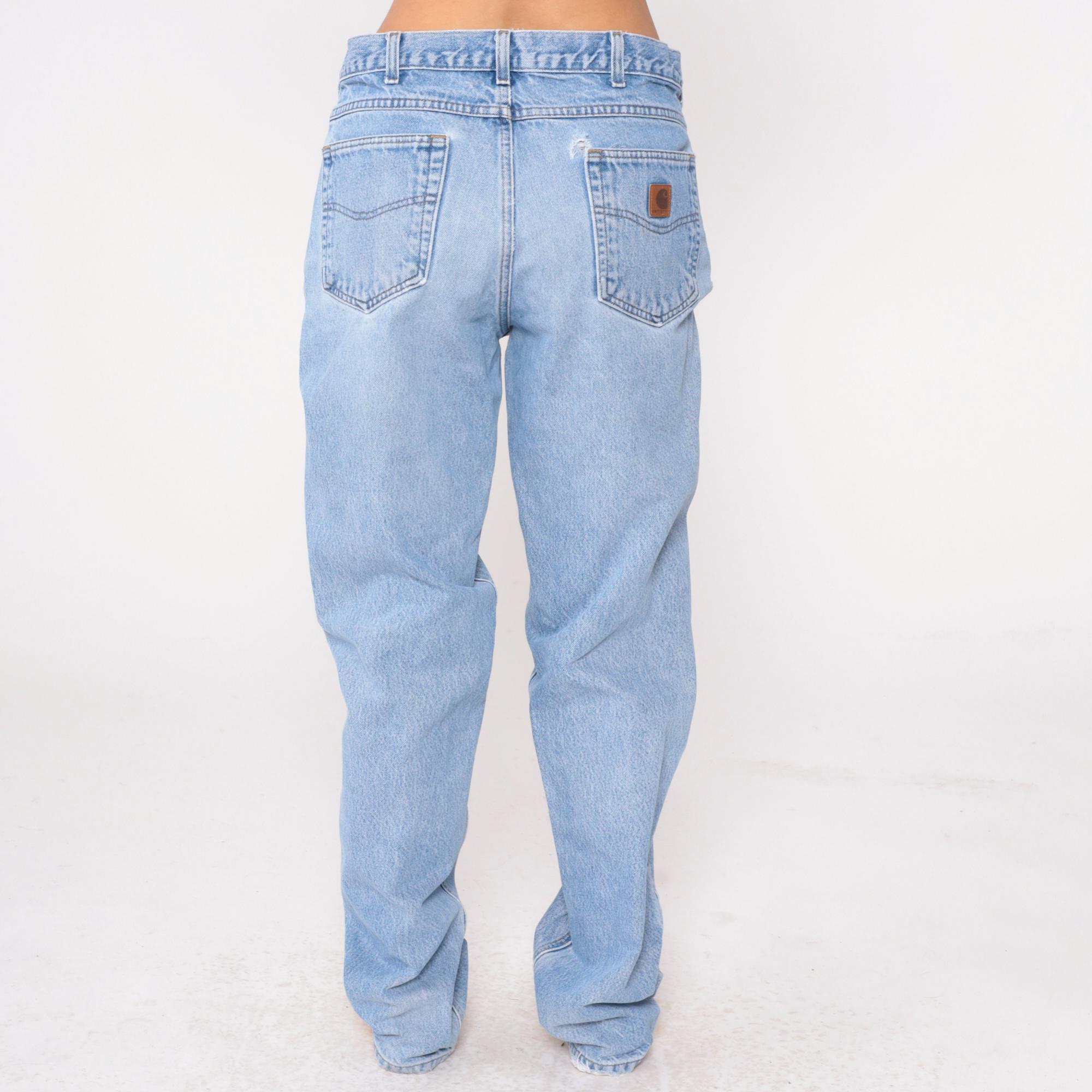 90s light wash denim jeans from Carhartt with straight leg fit and classic five-pocket styling. Leather Carhartt patch on back right pocket. Gently distressed with faint spots, fraying at hem and pocket edges, and small hole near front pocket.