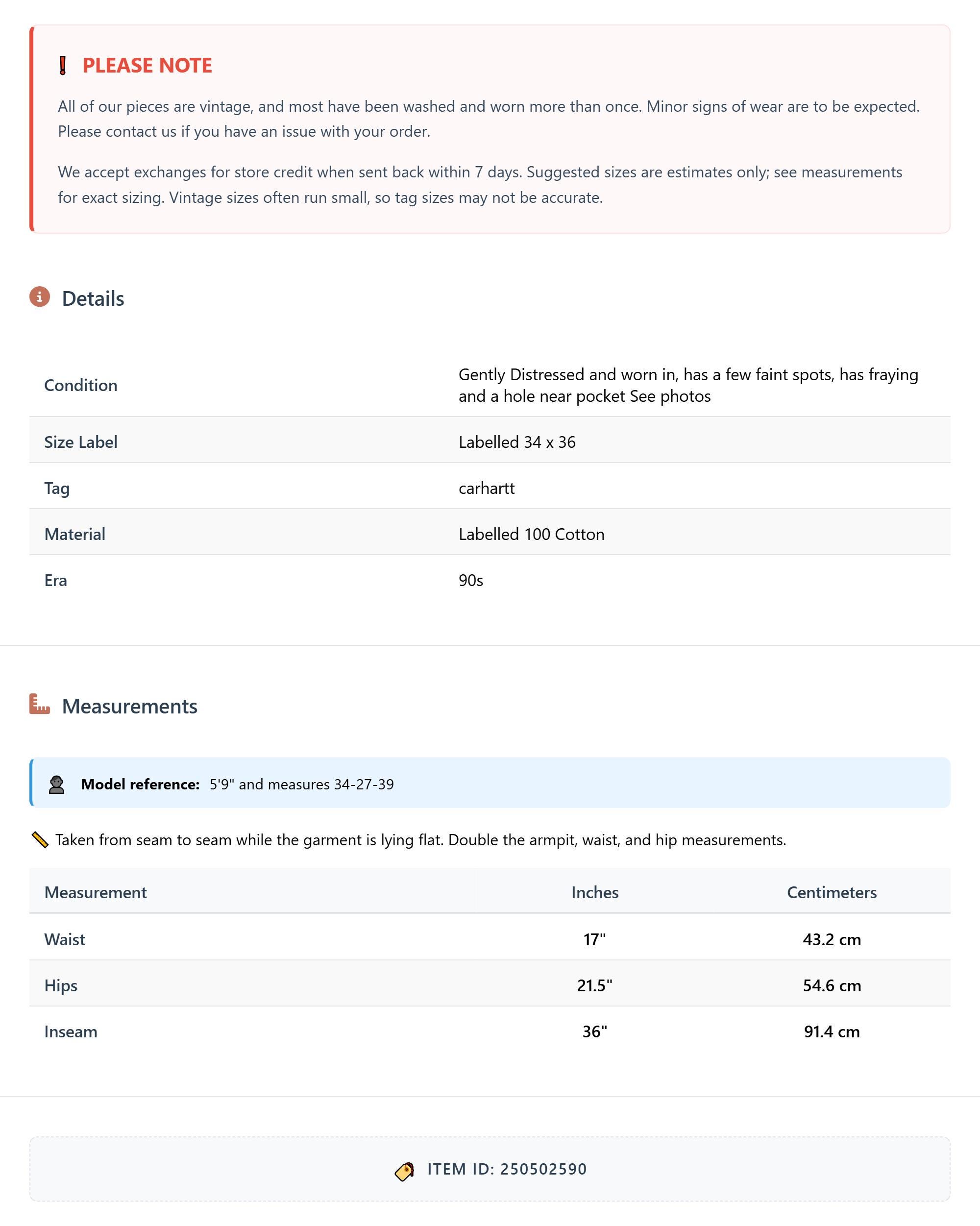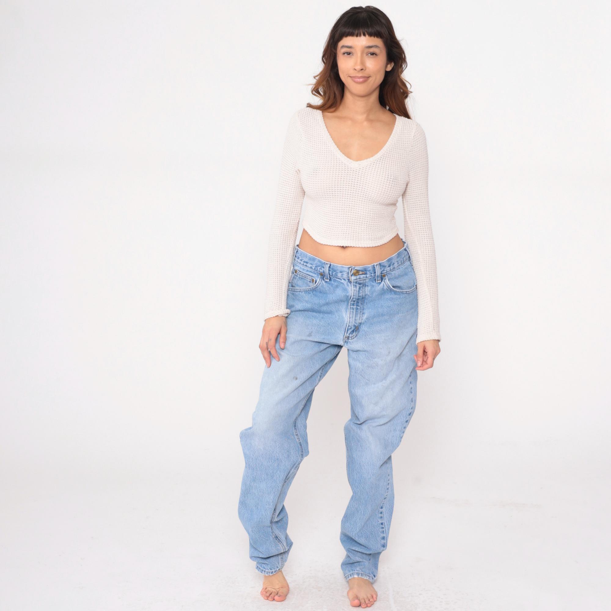 Vintage denim was usually made without any stretch, unlike modern jeans. Check the measurements to ensure proper fit, and remember to give yourself a little wiggle room in the waist and hips, depending on your preferred fit.