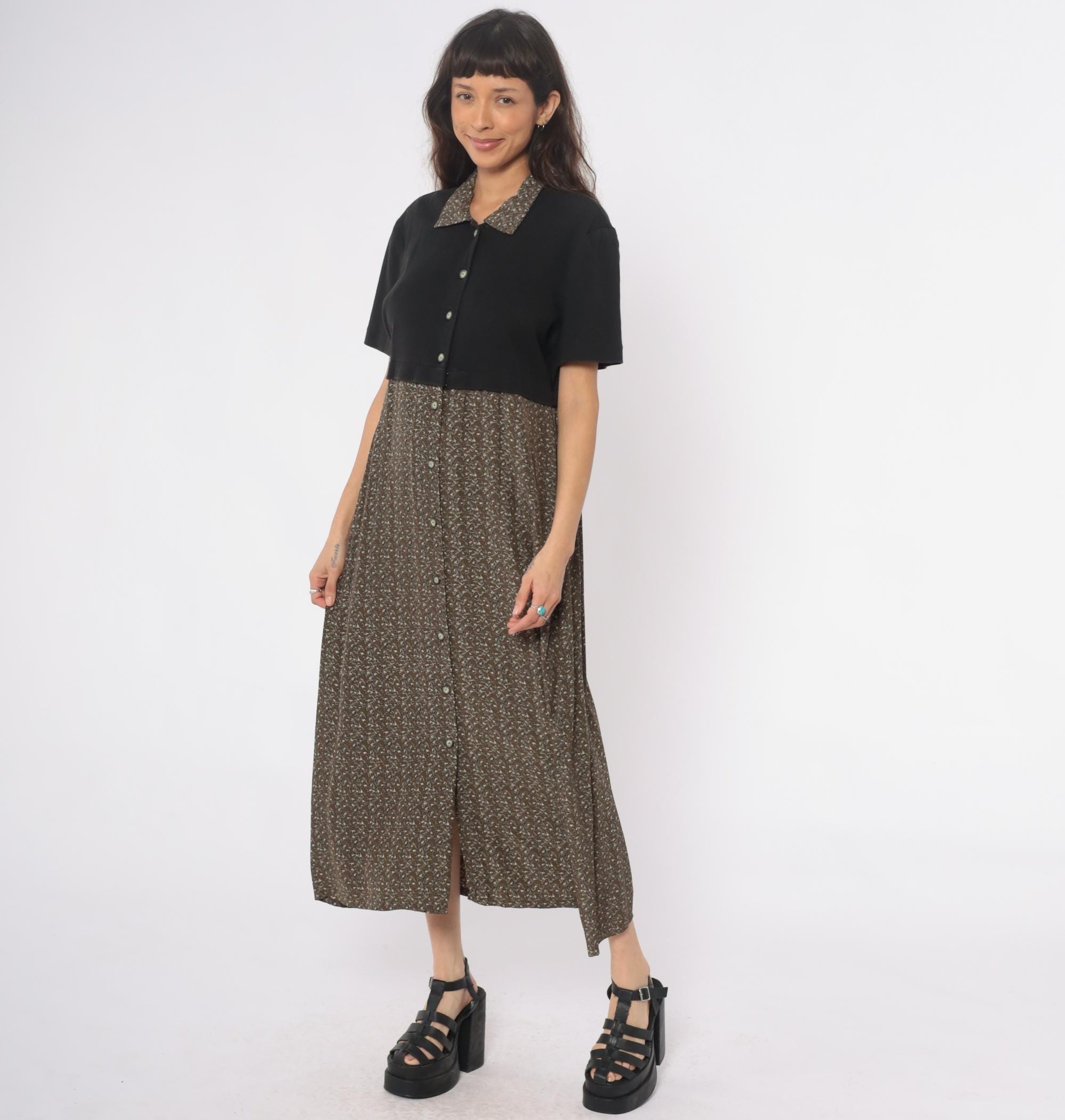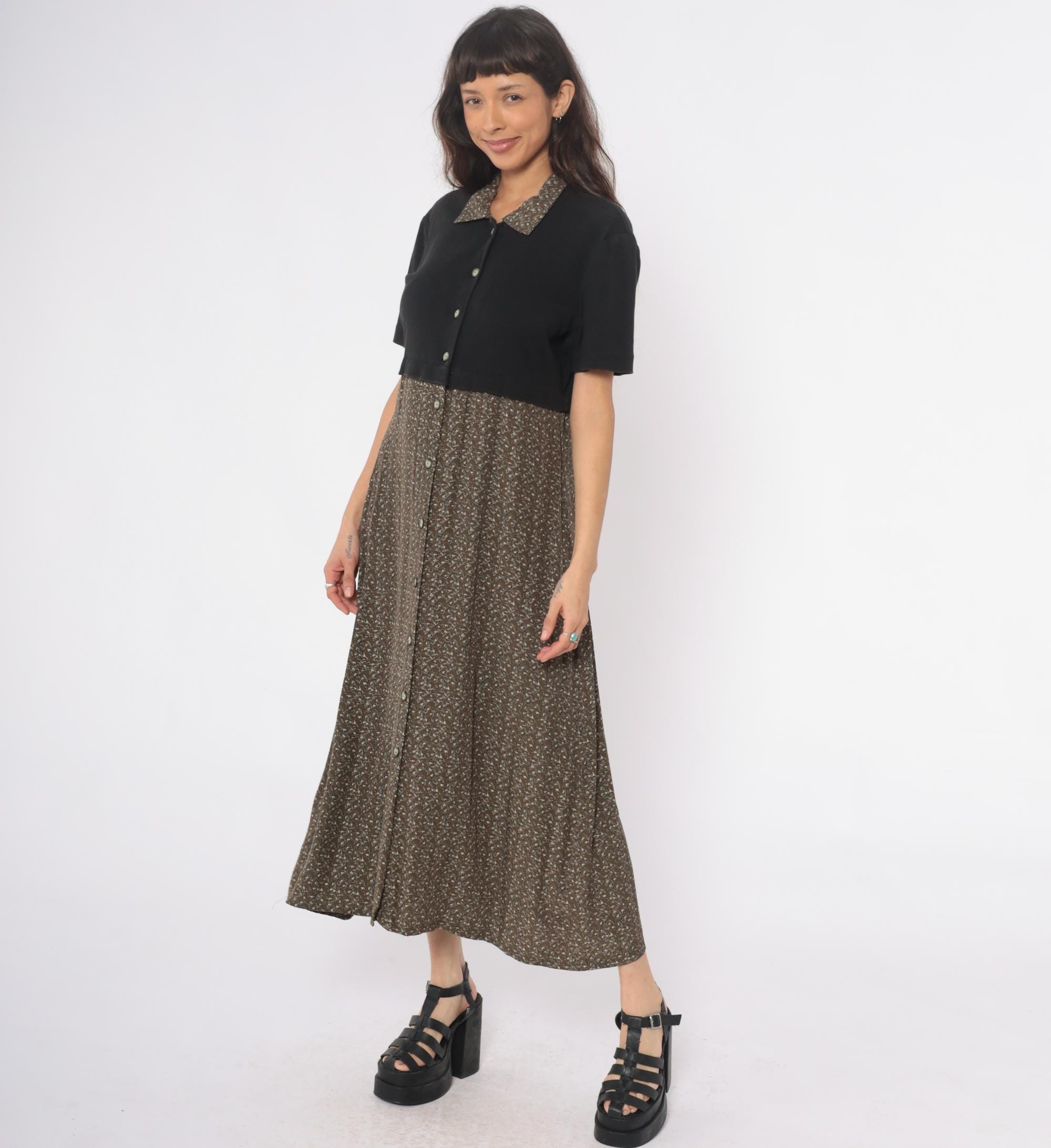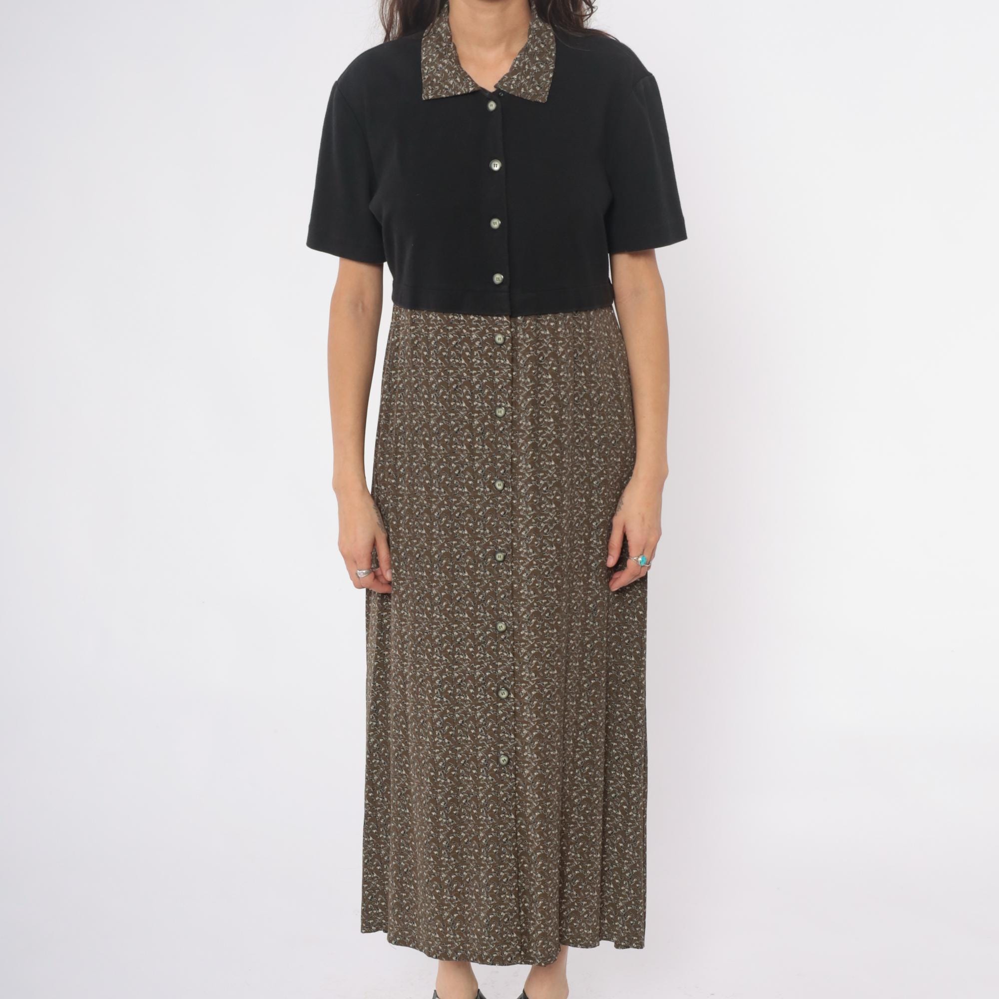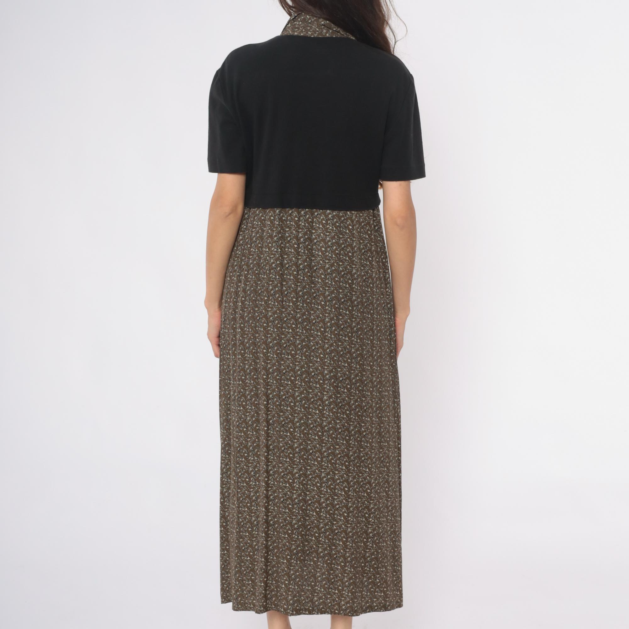 90s maxi dress from Karin Stevens with color-blocked design, black short-sleeve bodice and brown ditsy floral skirt. Button front closure through bodice and down skirt, contrast collar in matching floral fabric. Acrylic top with rayon skirt.