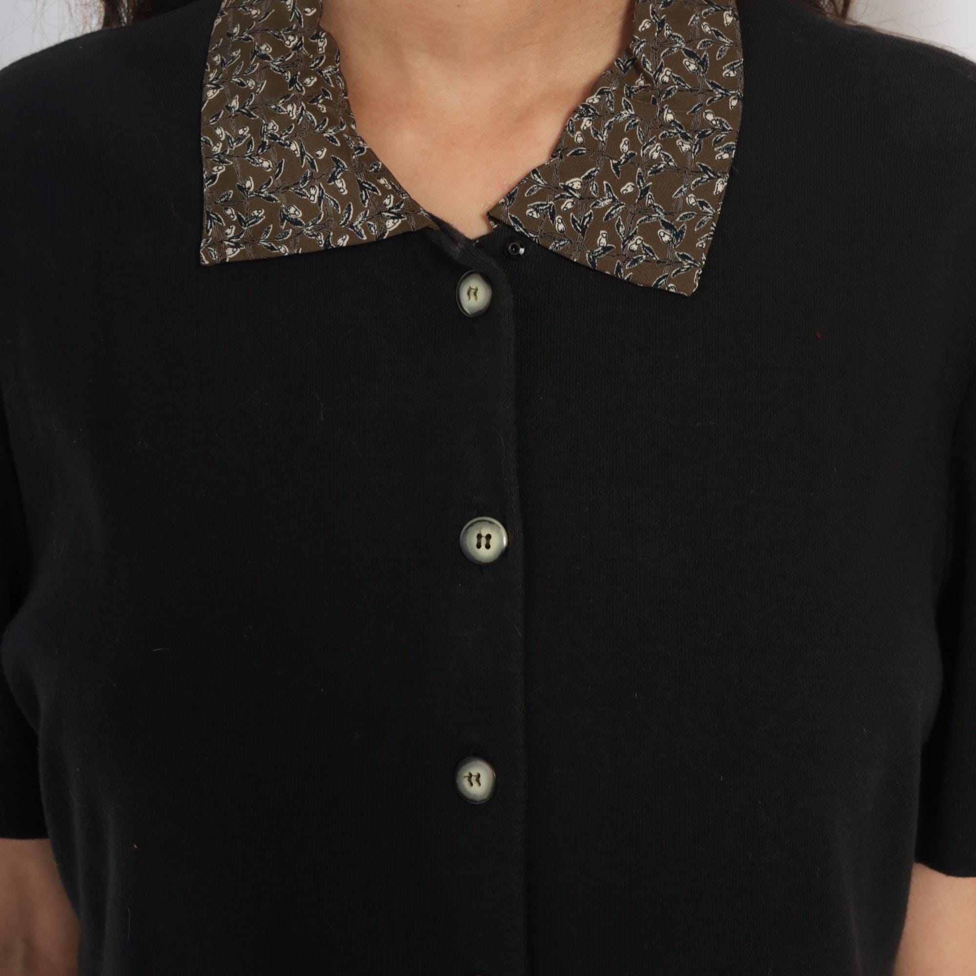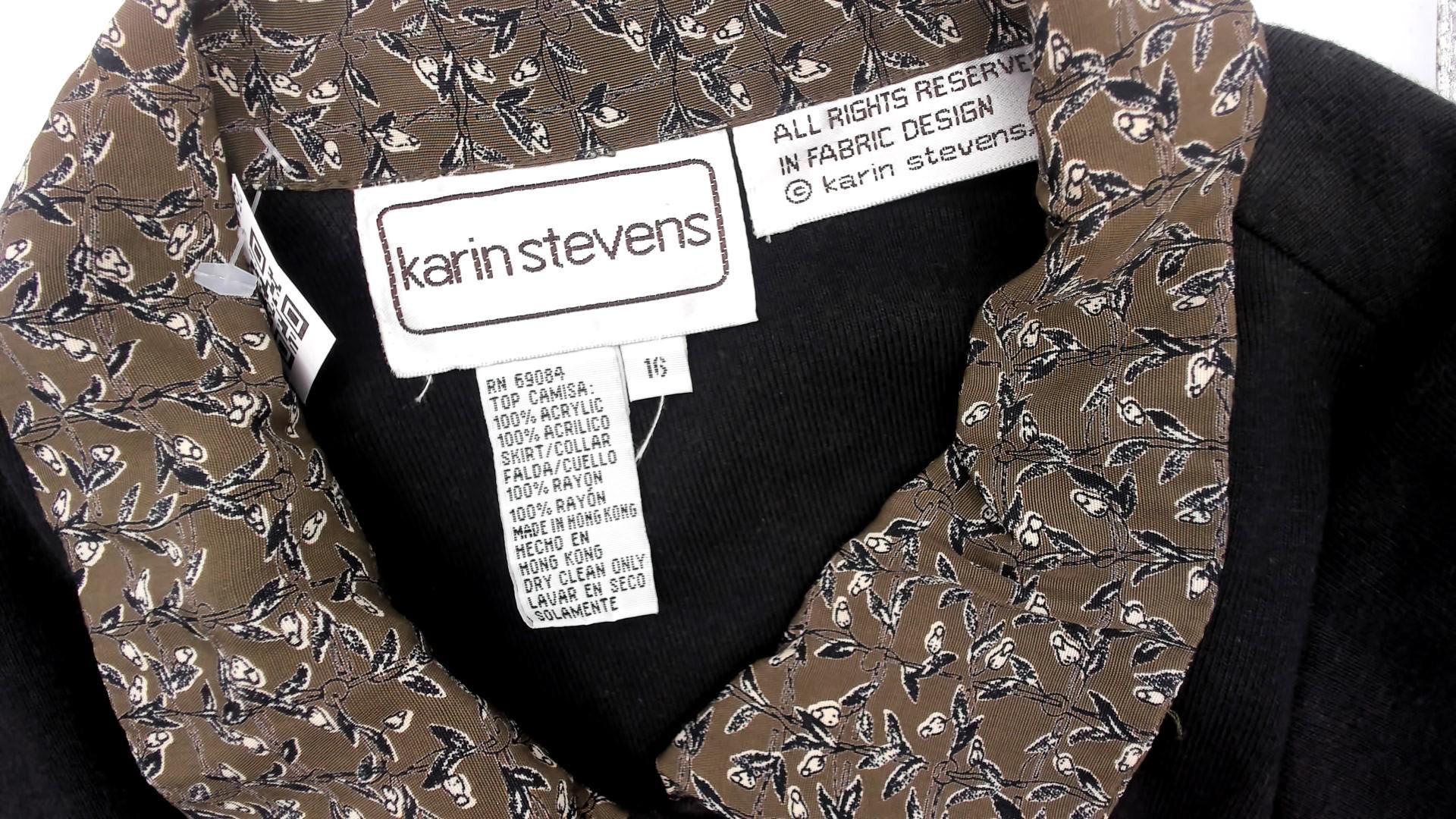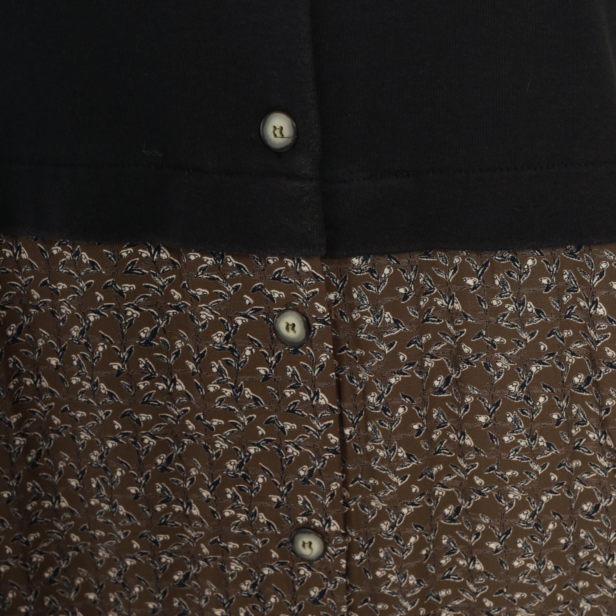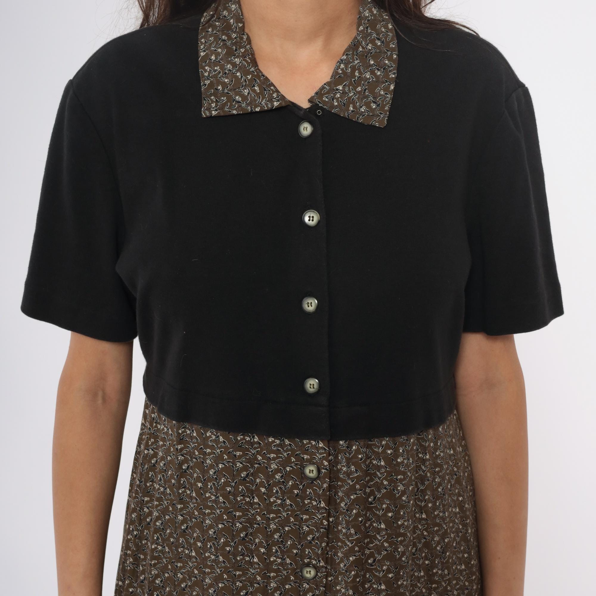 90s maxi dress from Karin Stevens with color-blocked design, black short-sleeve bodice and brown ditsy floral skirt. Button front closure through bodice and down skirt, contrast collar in matching floral fabric. Acrylic top with rayon skirt.