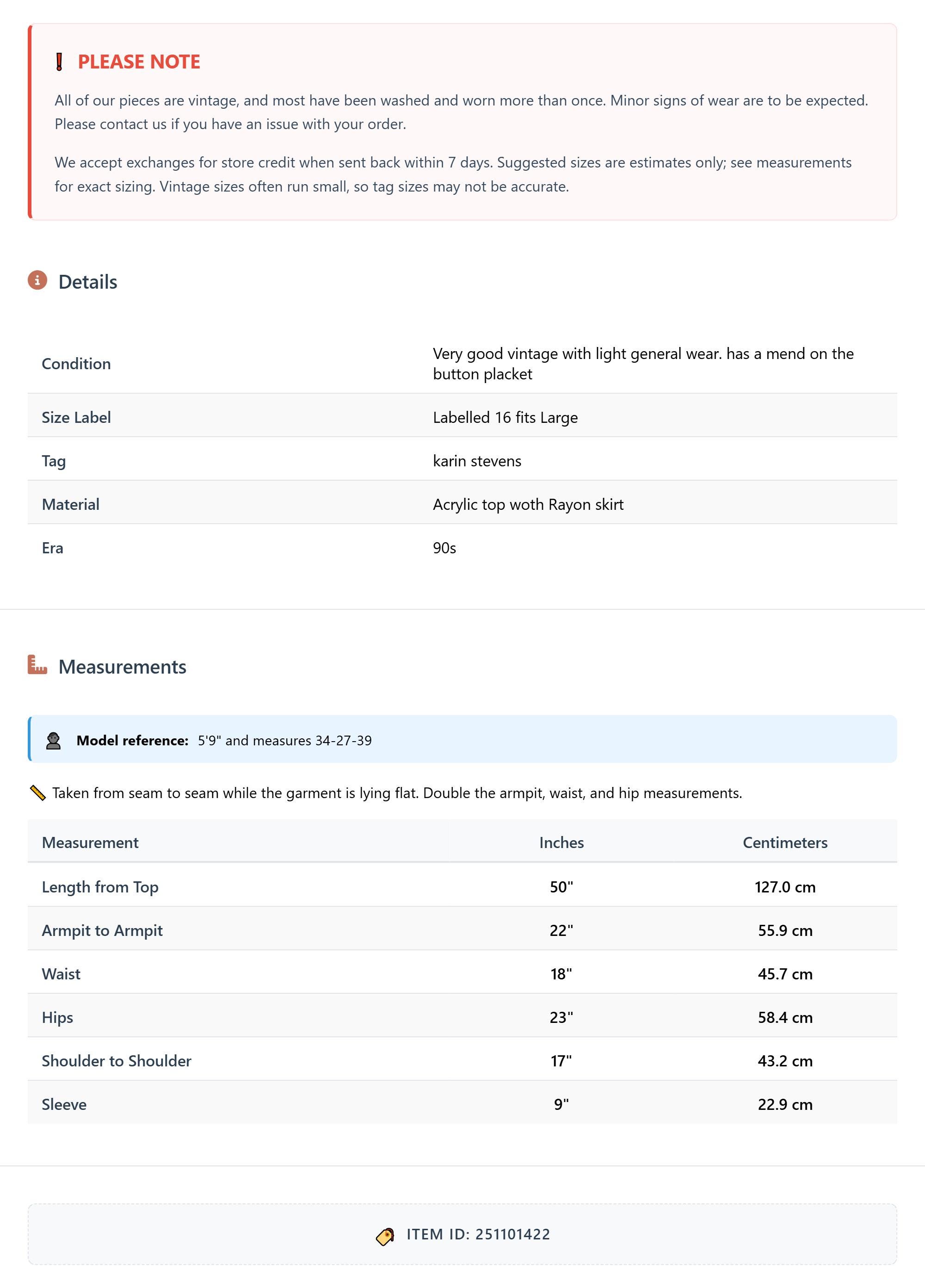 Measurements are taken laying flat and should be doubled where applicable. The "best fits" size is just an estimate, and vintage sizing can vary from modern sizing. Please use measurements to ensure proper fit. The best thing to do is measure a similar item of your own, and compare. When an item has stretch, we will list the unstretched dimensions with the stretched measurement afterwards.