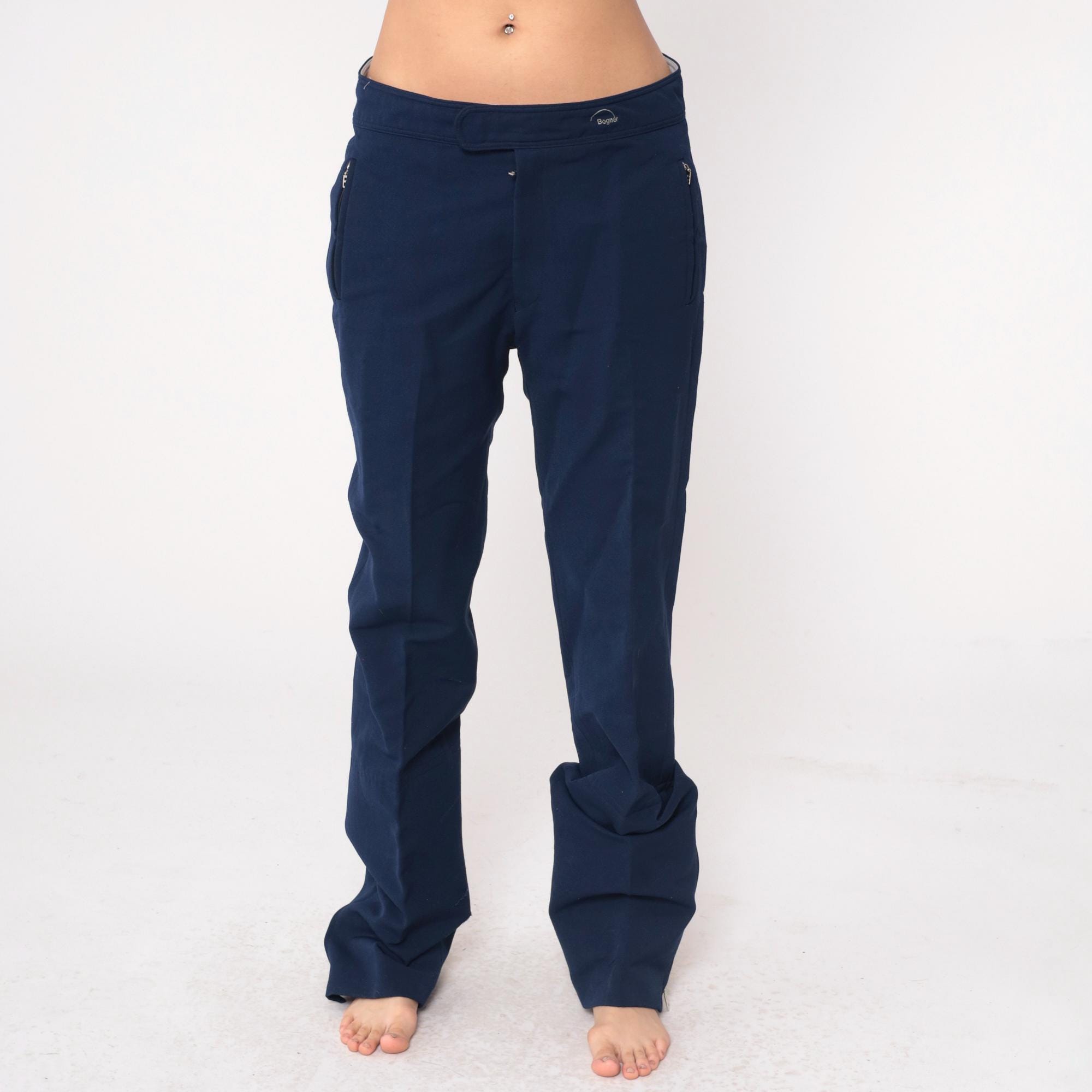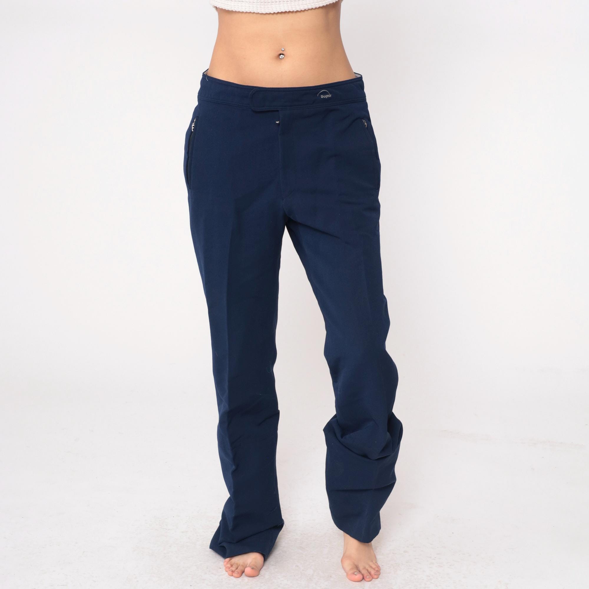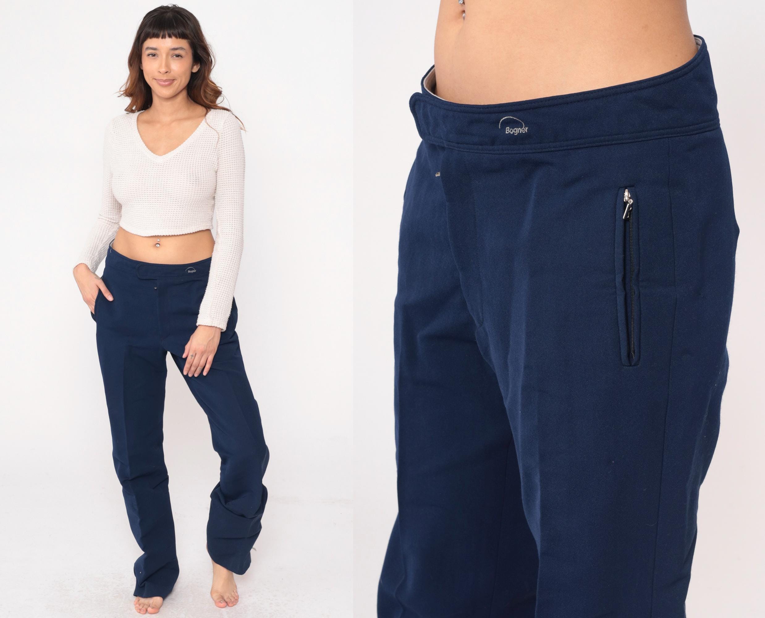 80s navy blue track pants from Bogner with elastic waistband, button closure at front, and zippered pockets at hip and back. Straight leg cut with wool, nylon, and elastane blend construction.