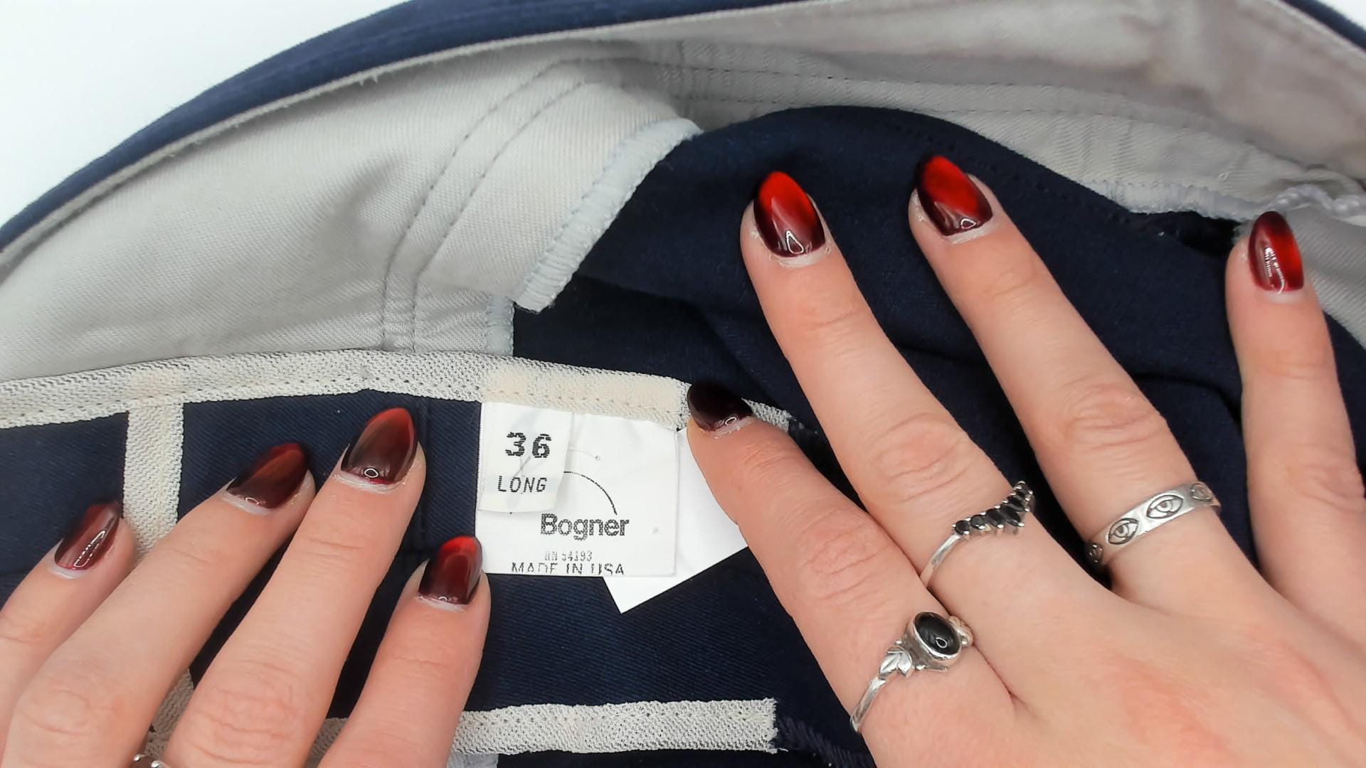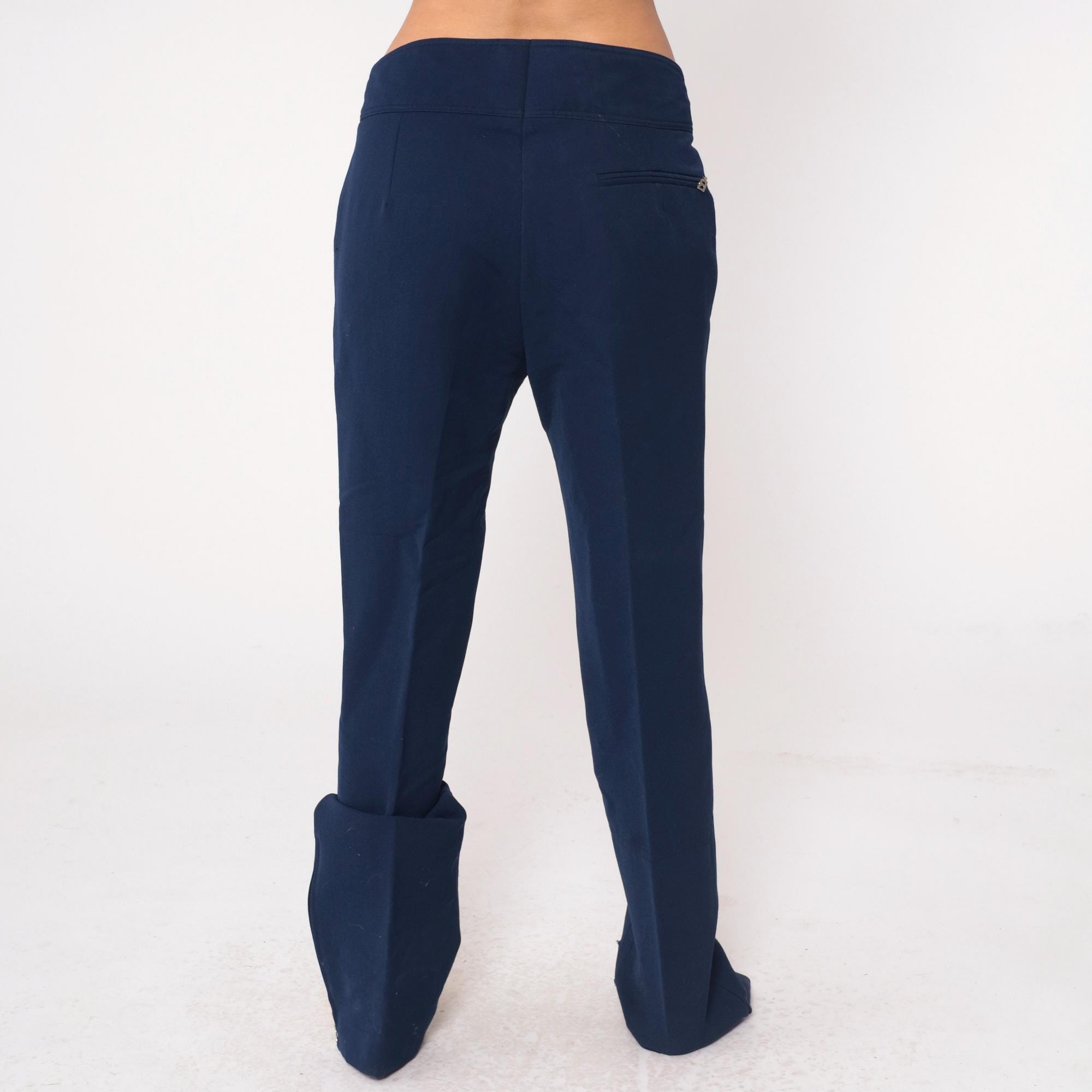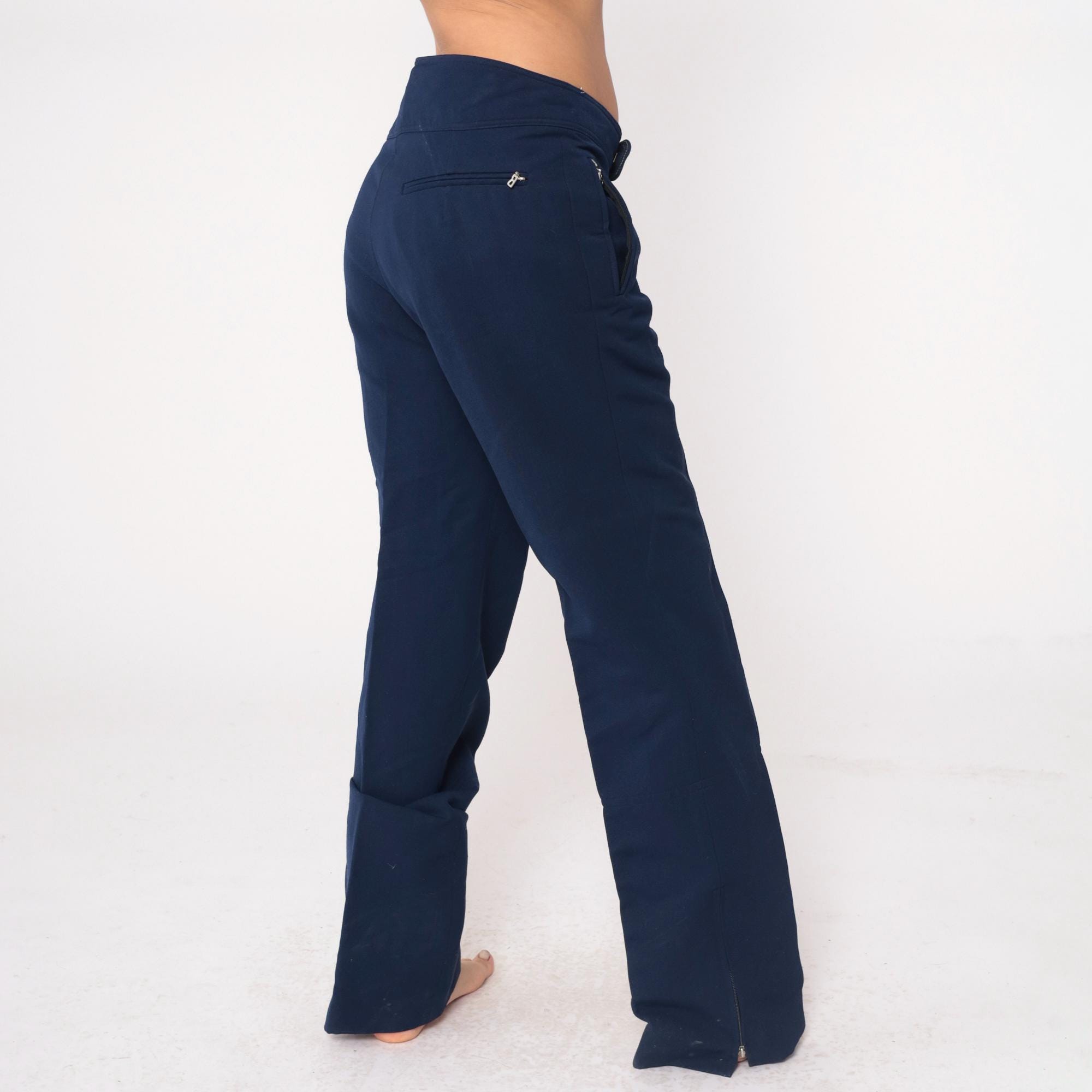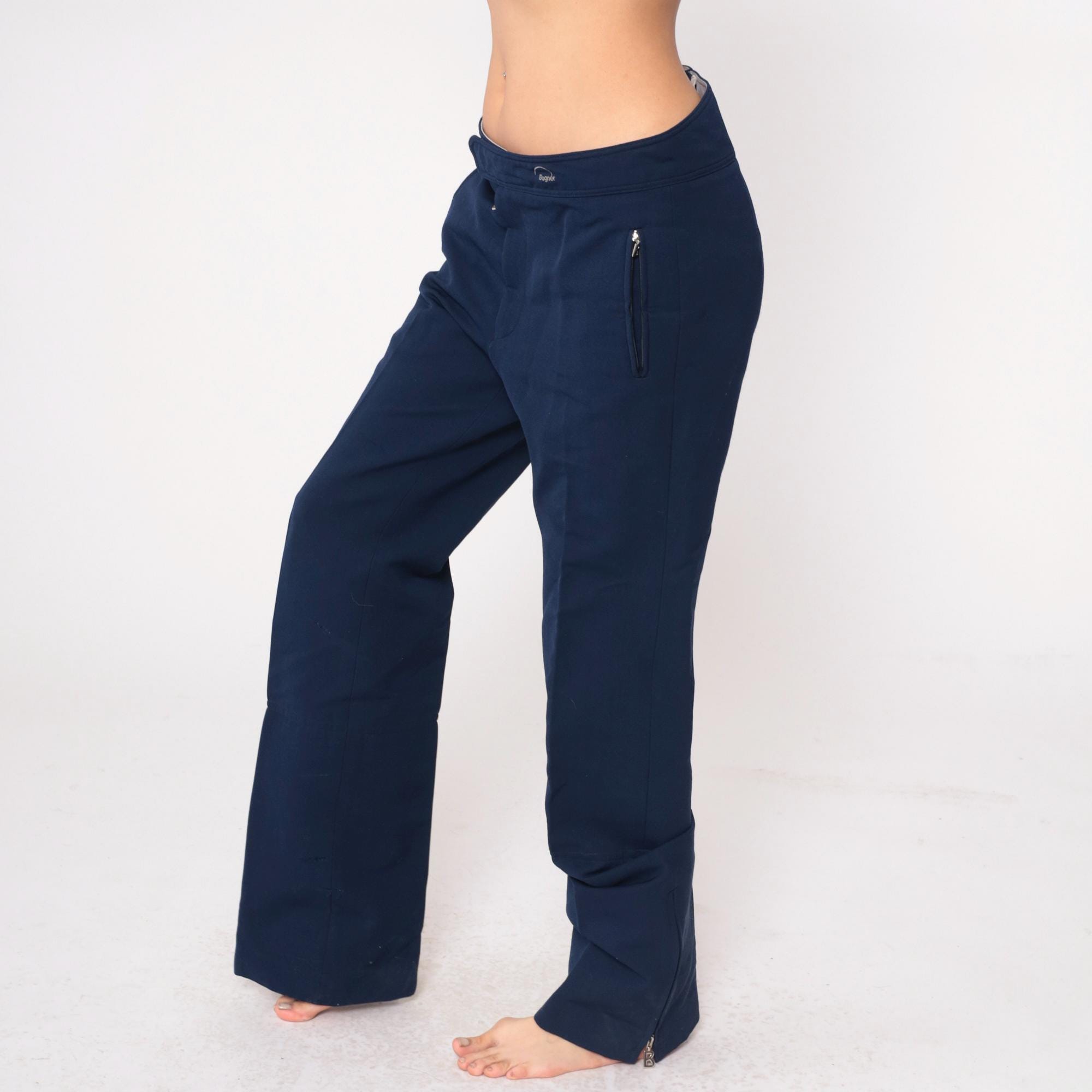 80s navy blue track pants from Bogner with elastic waistband, button closure at front, and zippered pockets at hip and back. Straight leg cut with wool, nylon, and elastane blend construction.