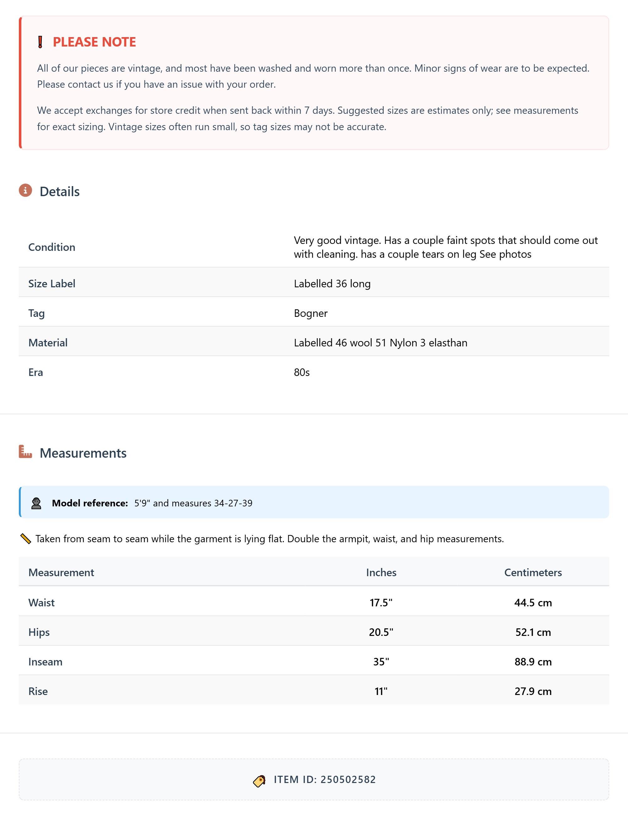 All of our pieces are vintage, and most have been washed and worn more than once. Minor signs of wear are to be expected. Please contact us if you have an issue with your order. We accept exchanges for store credit when sent back within 7 days.
