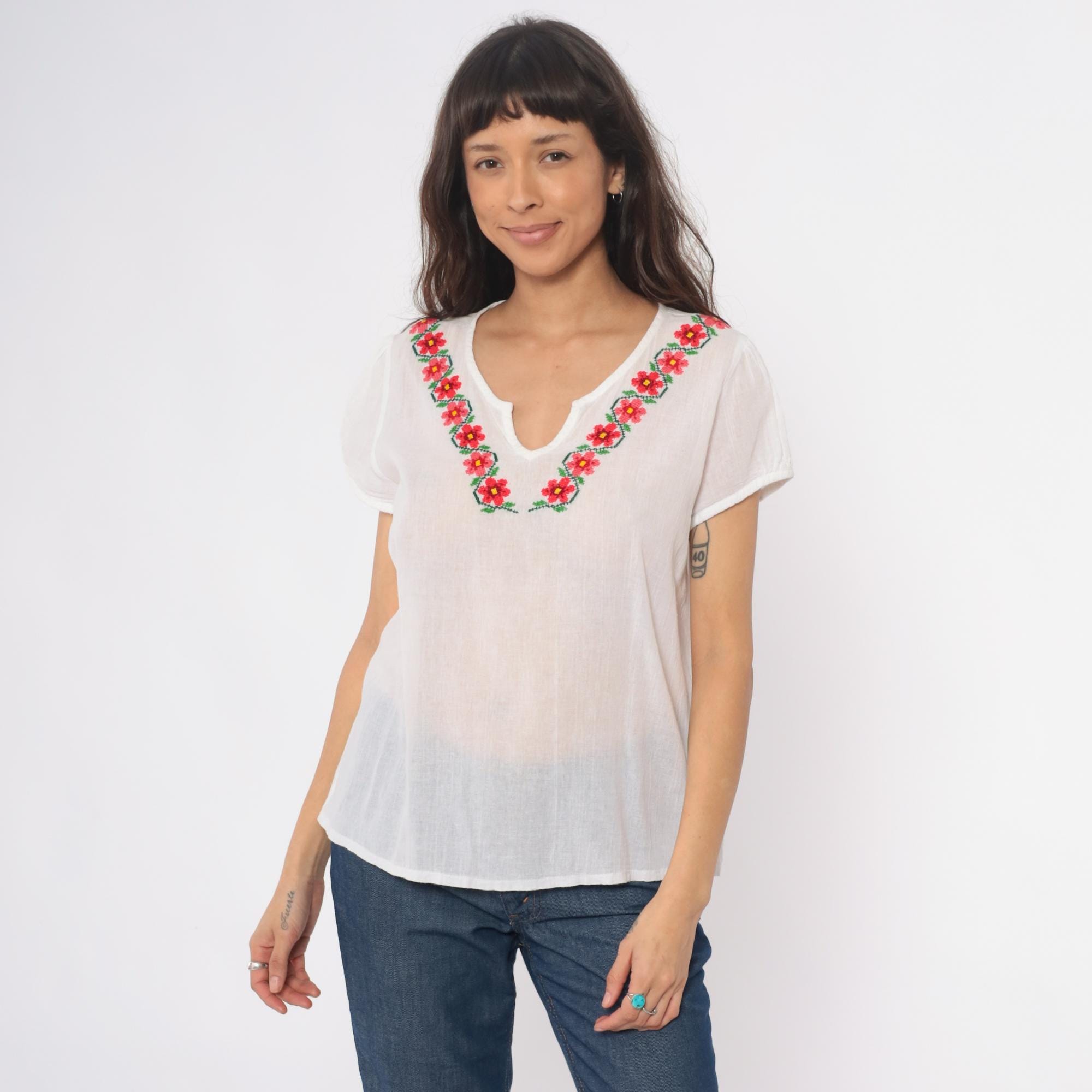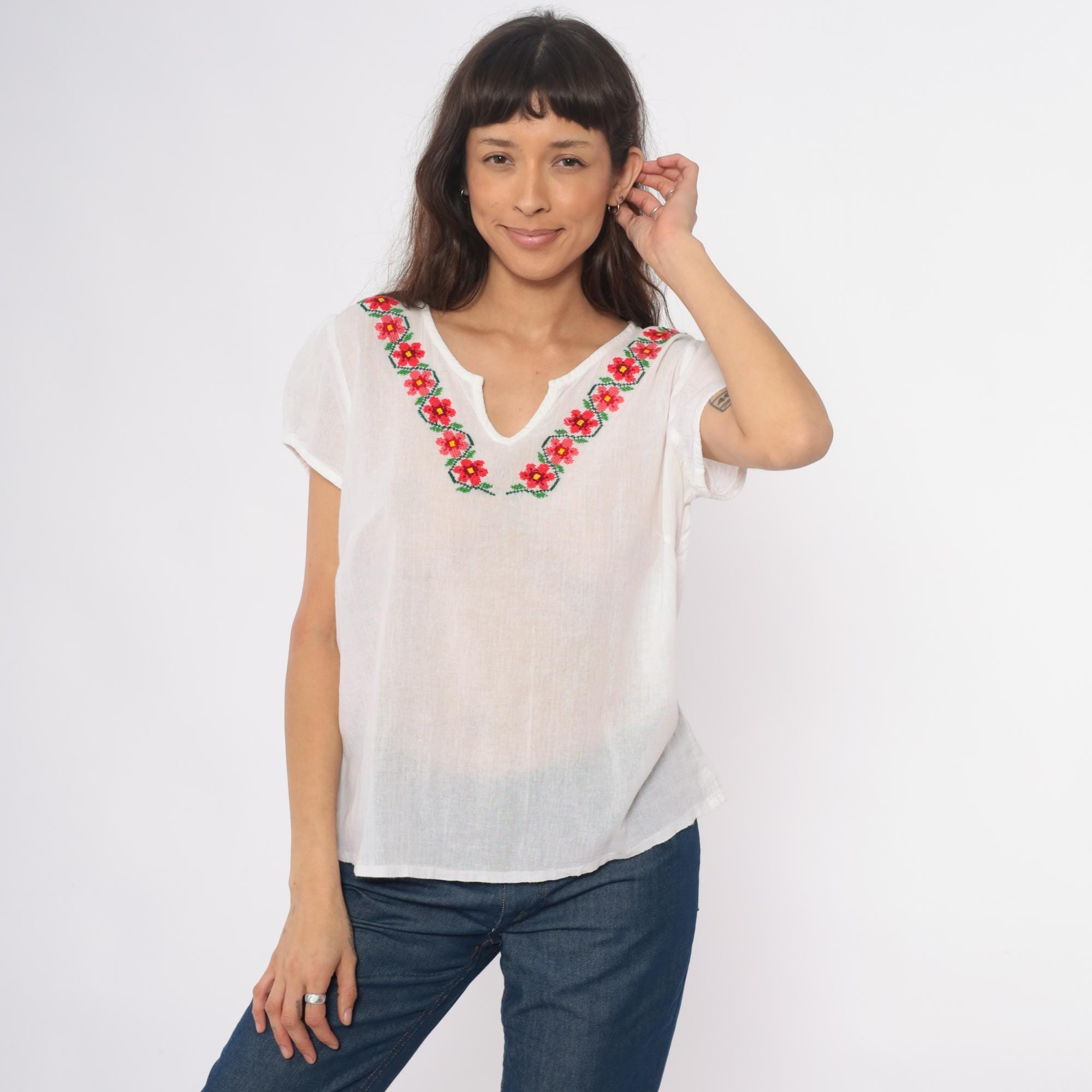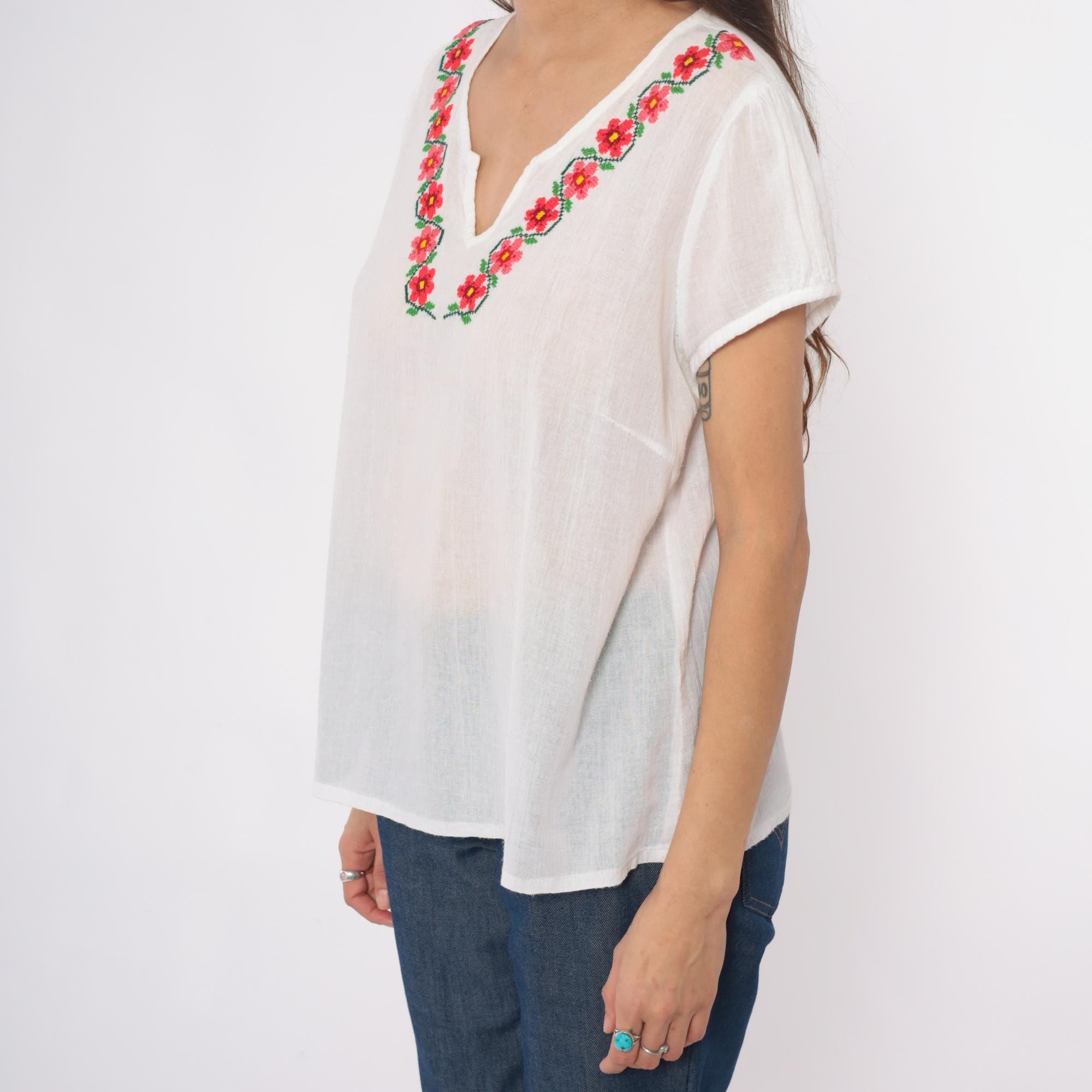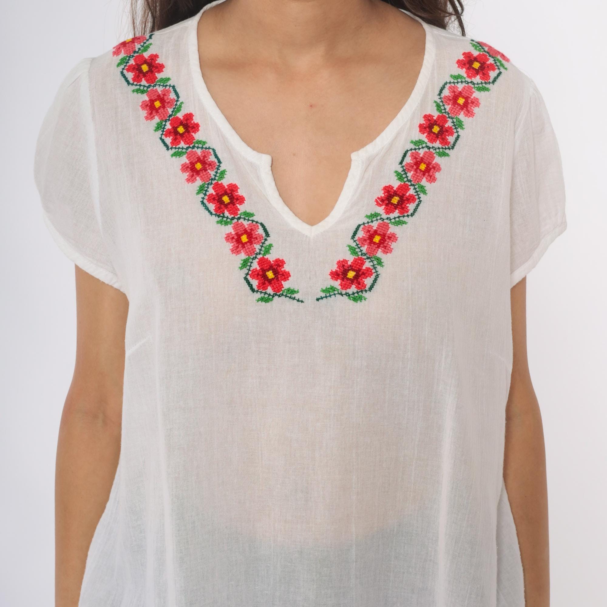 90s white embroidered Mexican blouse with floral design around the V-neckline in red, pink, yellow, and green. Short rolled sleeves, split V-neck opening, loose boxy fit. Semi-sheer cotton.