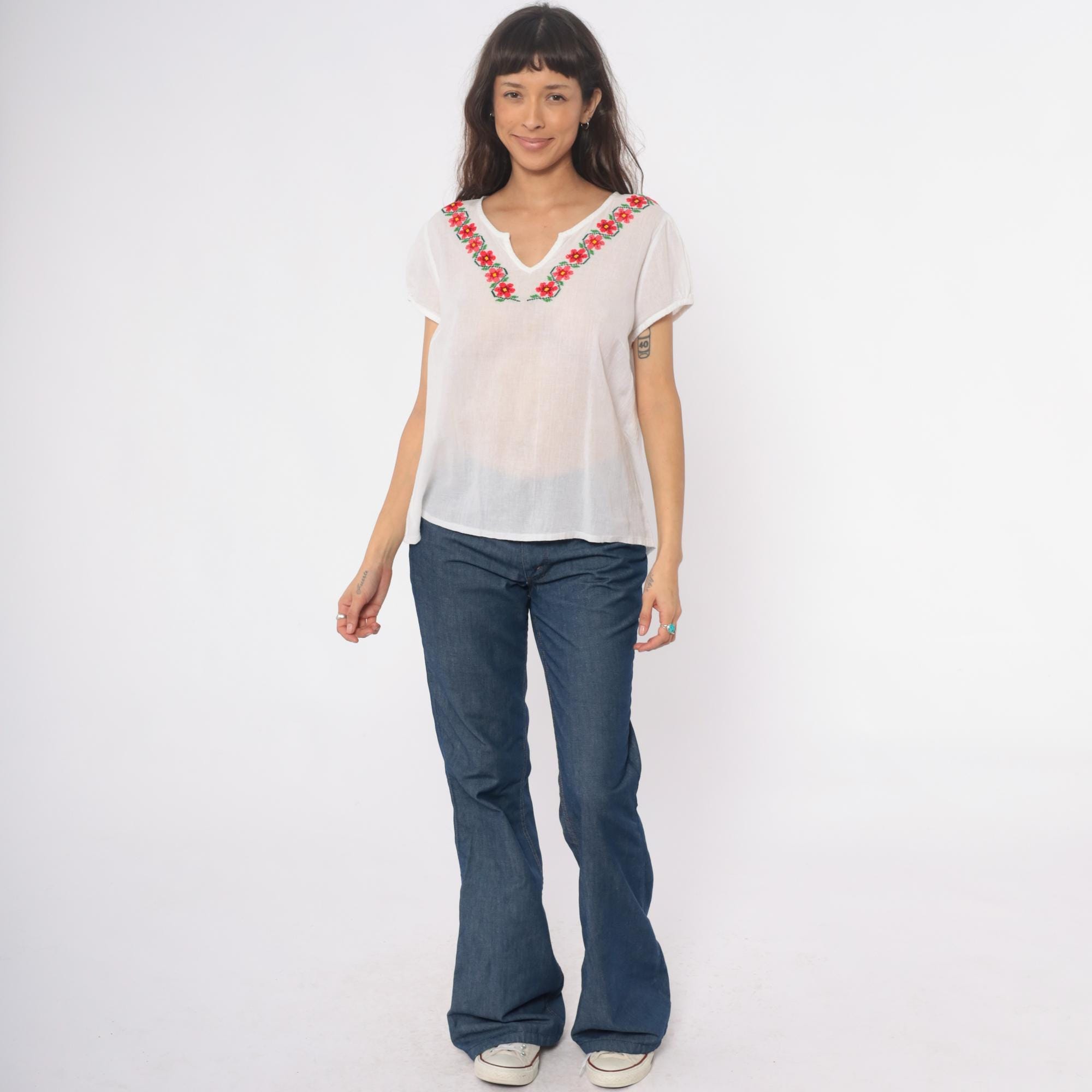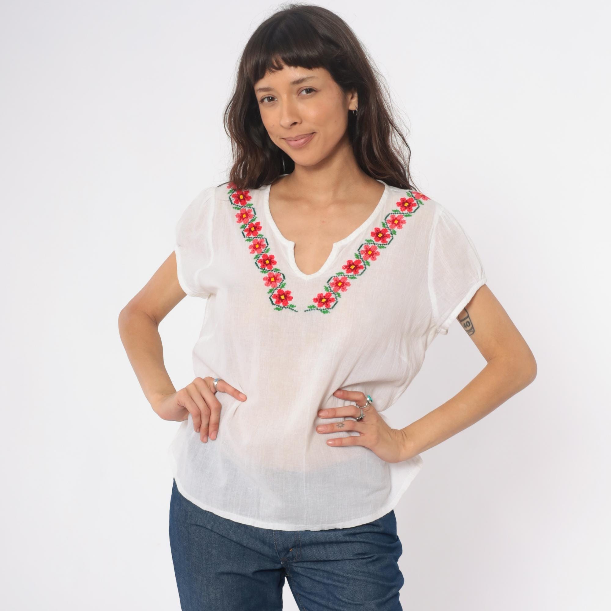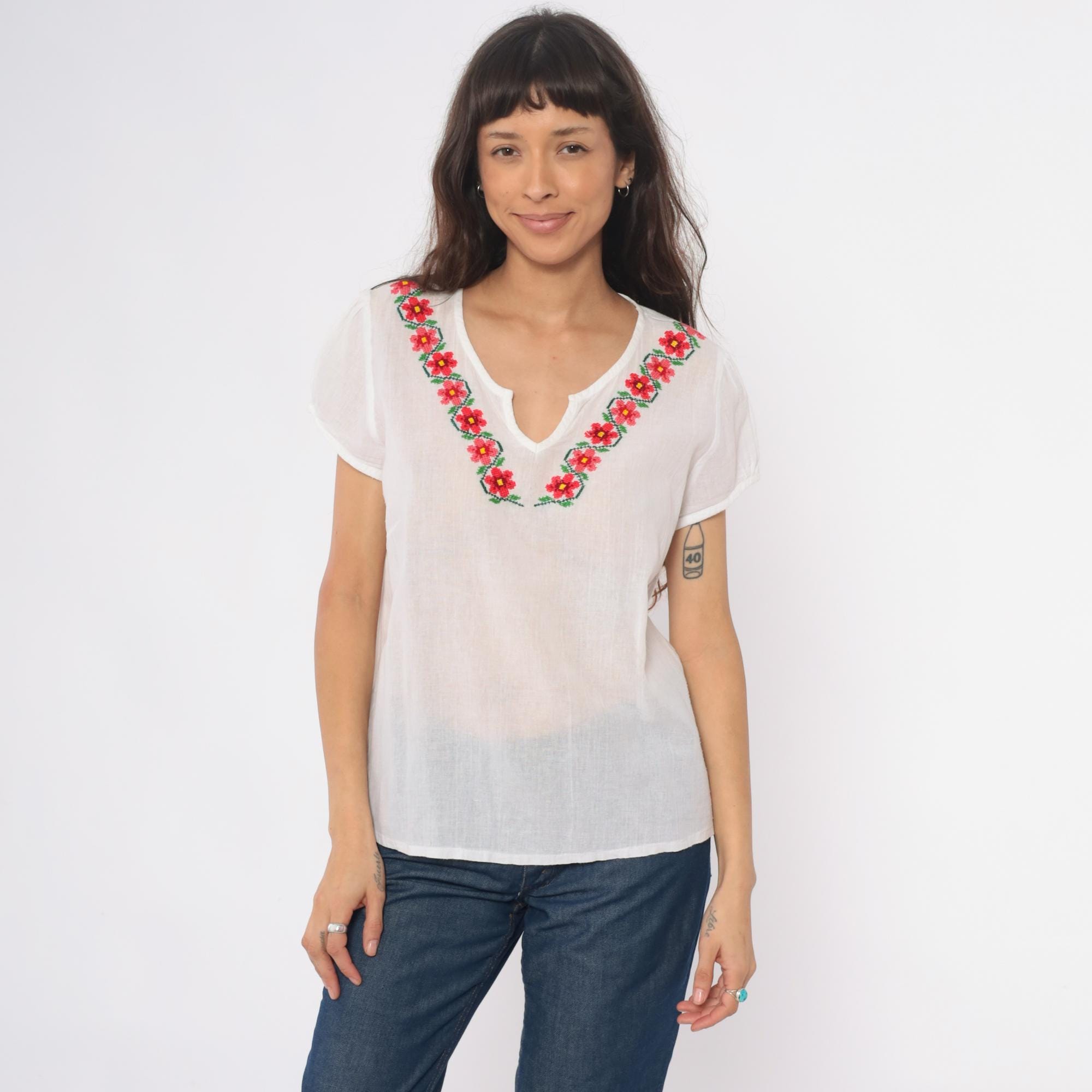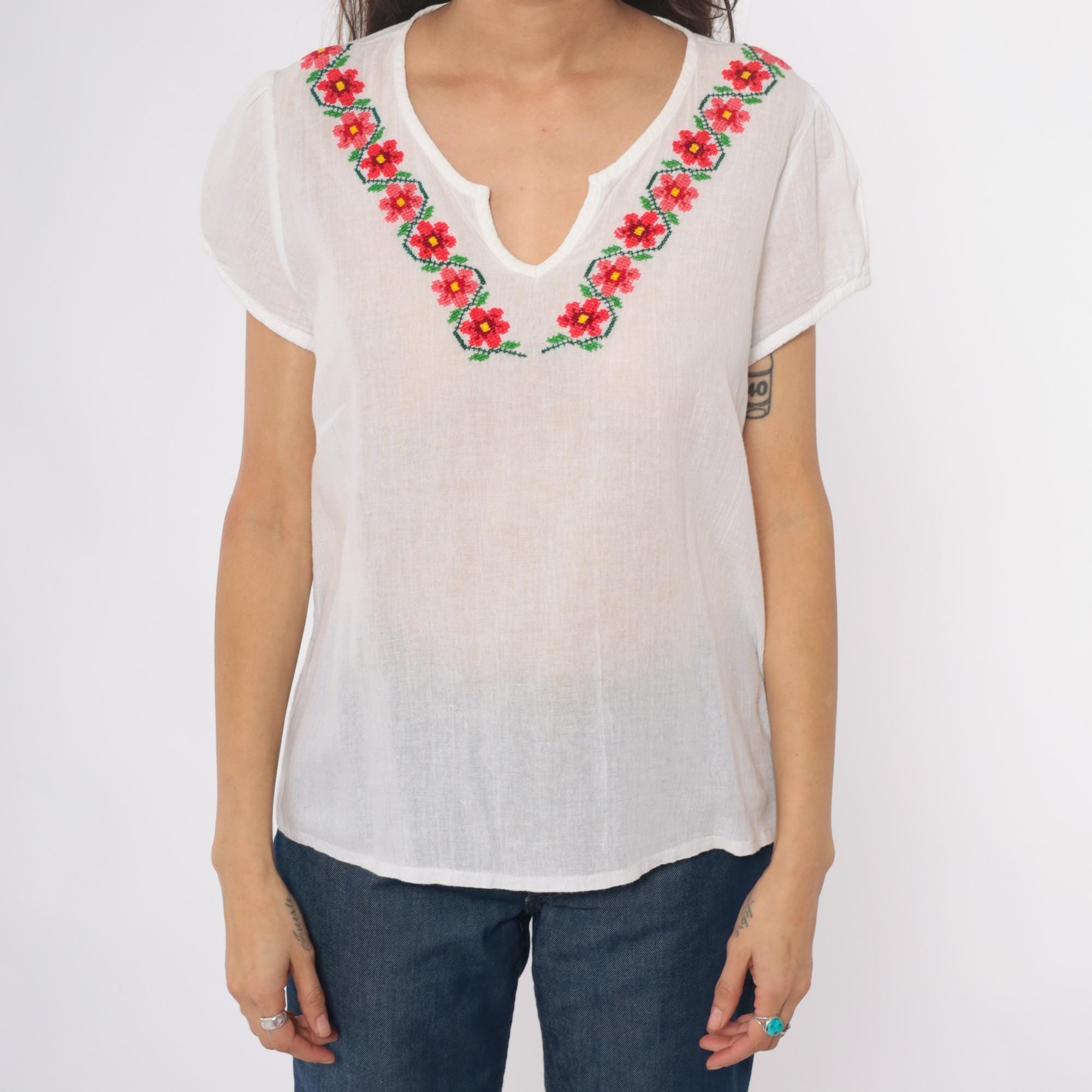 90s white embroidered Mexican blouse with floral design around the V-neckline in red, pink, yellow, and green. Short rolled sleeves, split V-neck opening, loose boxy fit. Semi-sheer cotton.