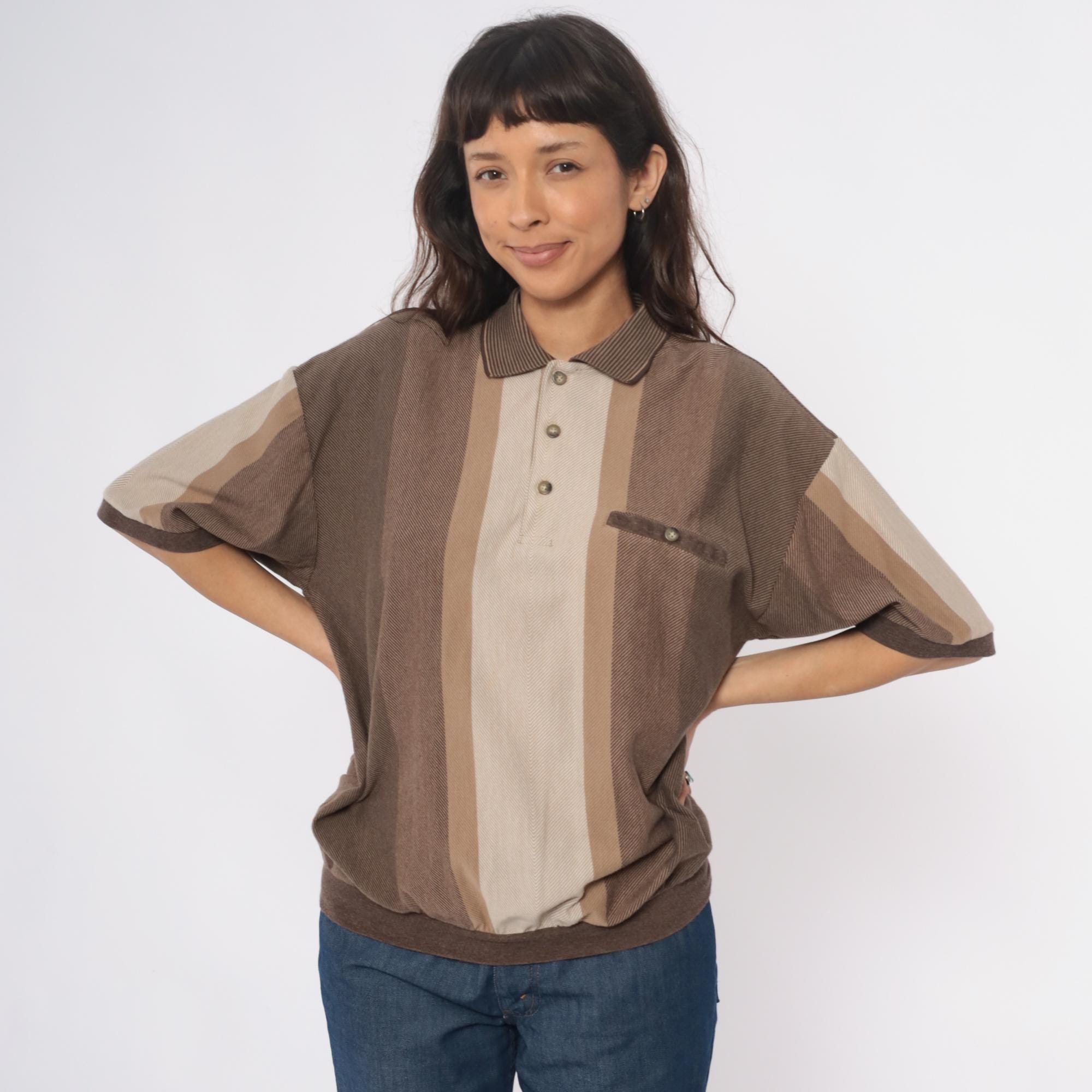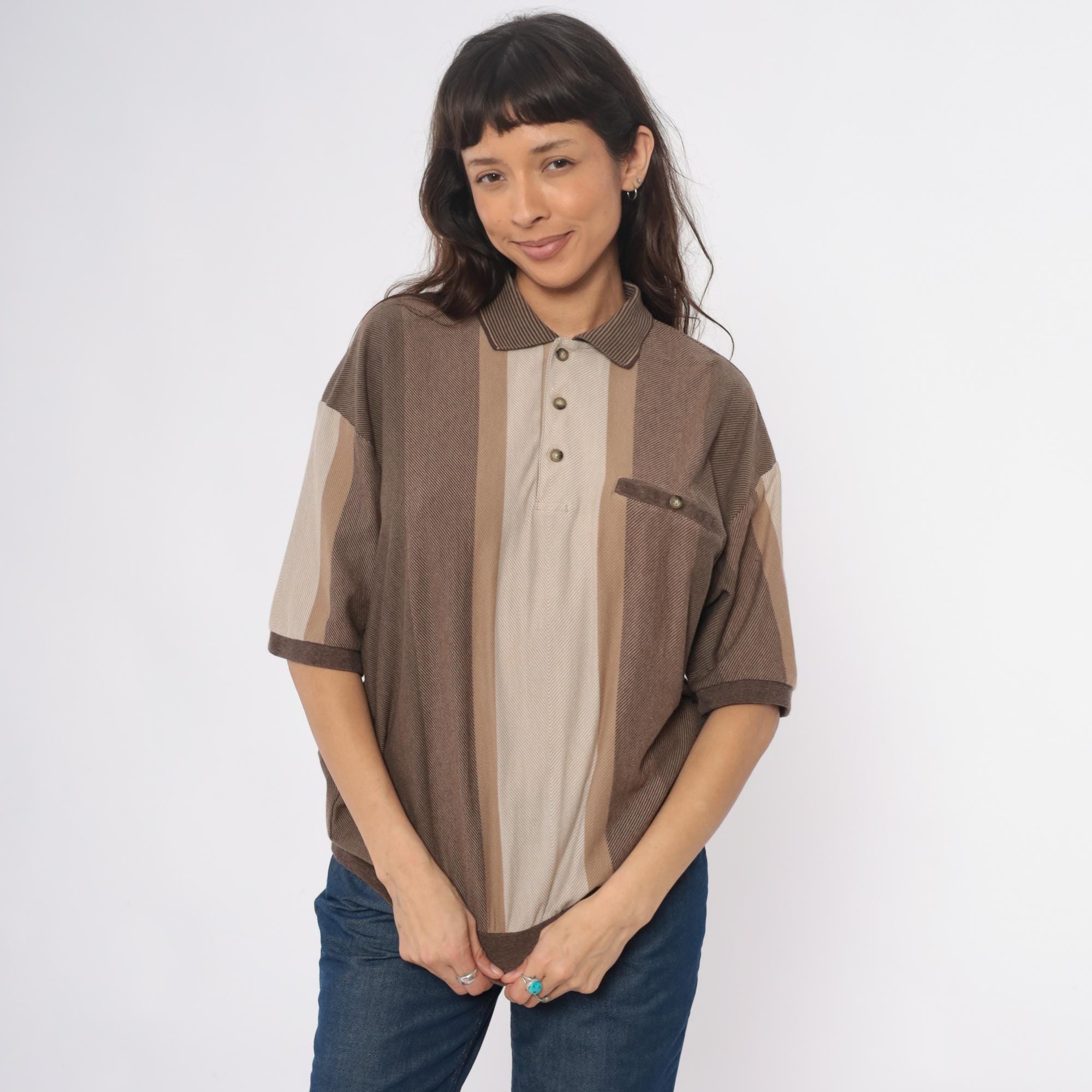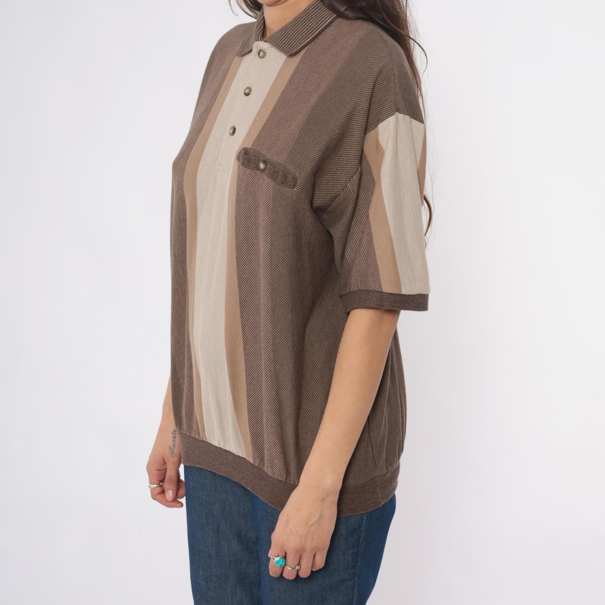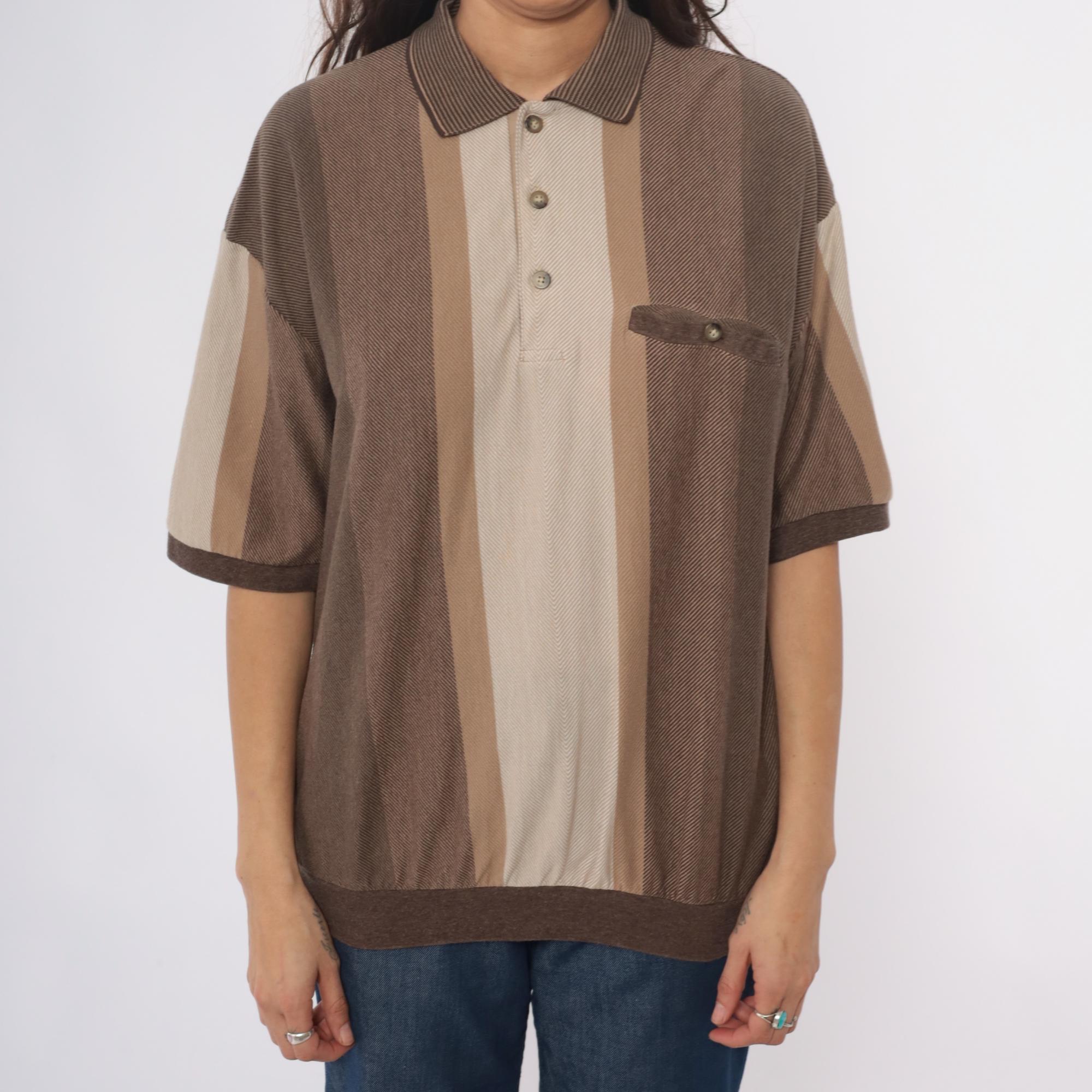 90s striped polo shirt from id sport in brown and tan vertical color blocking. Three-button placket, chest pocket with button closure, short sleeves. Ribbed collar, cuffs, and hem in brown.