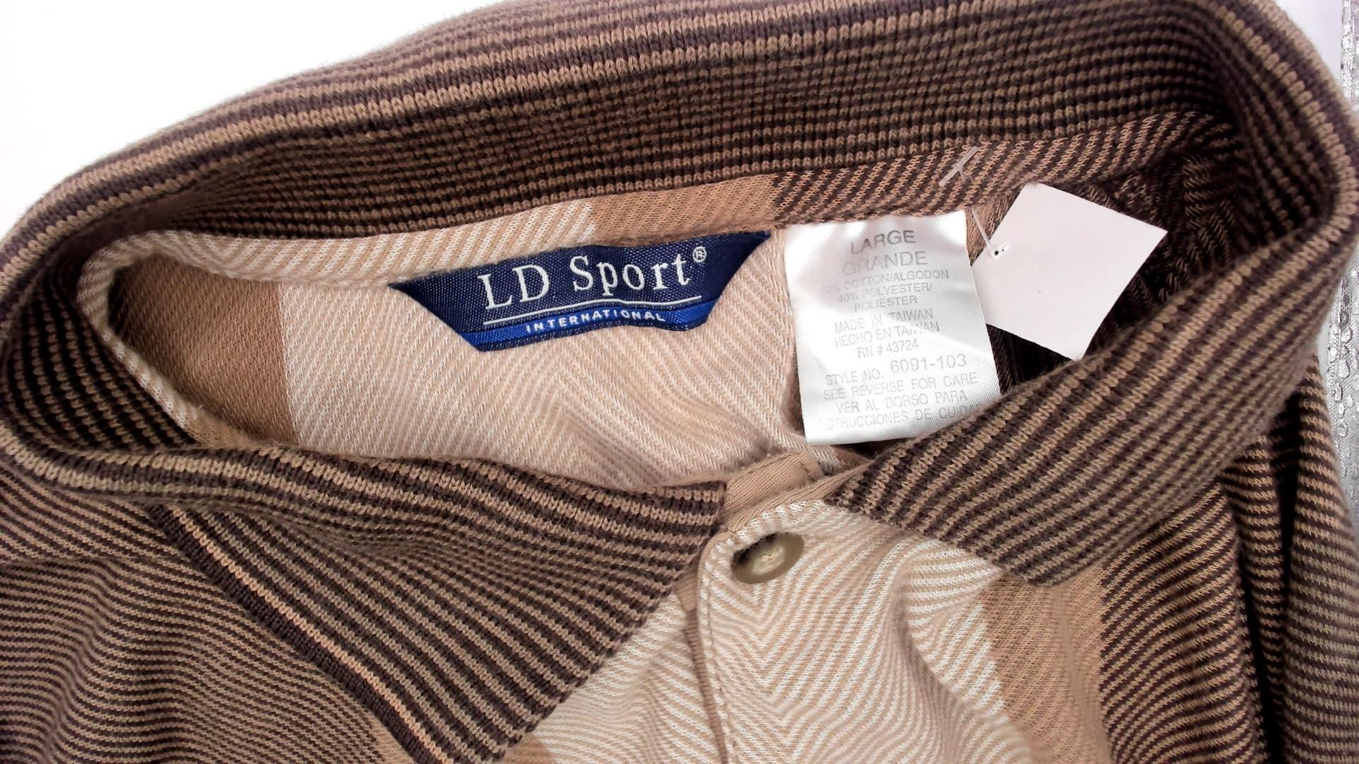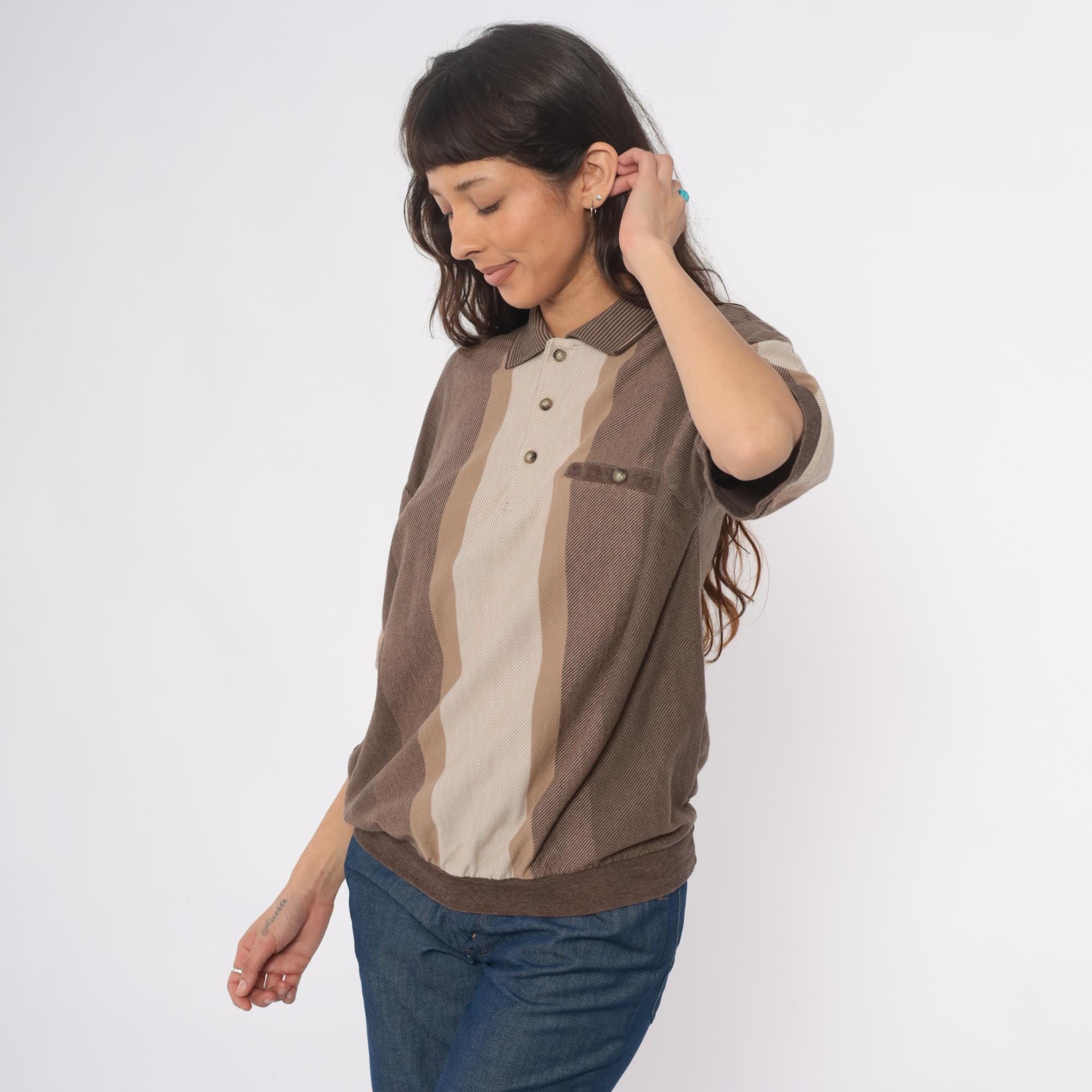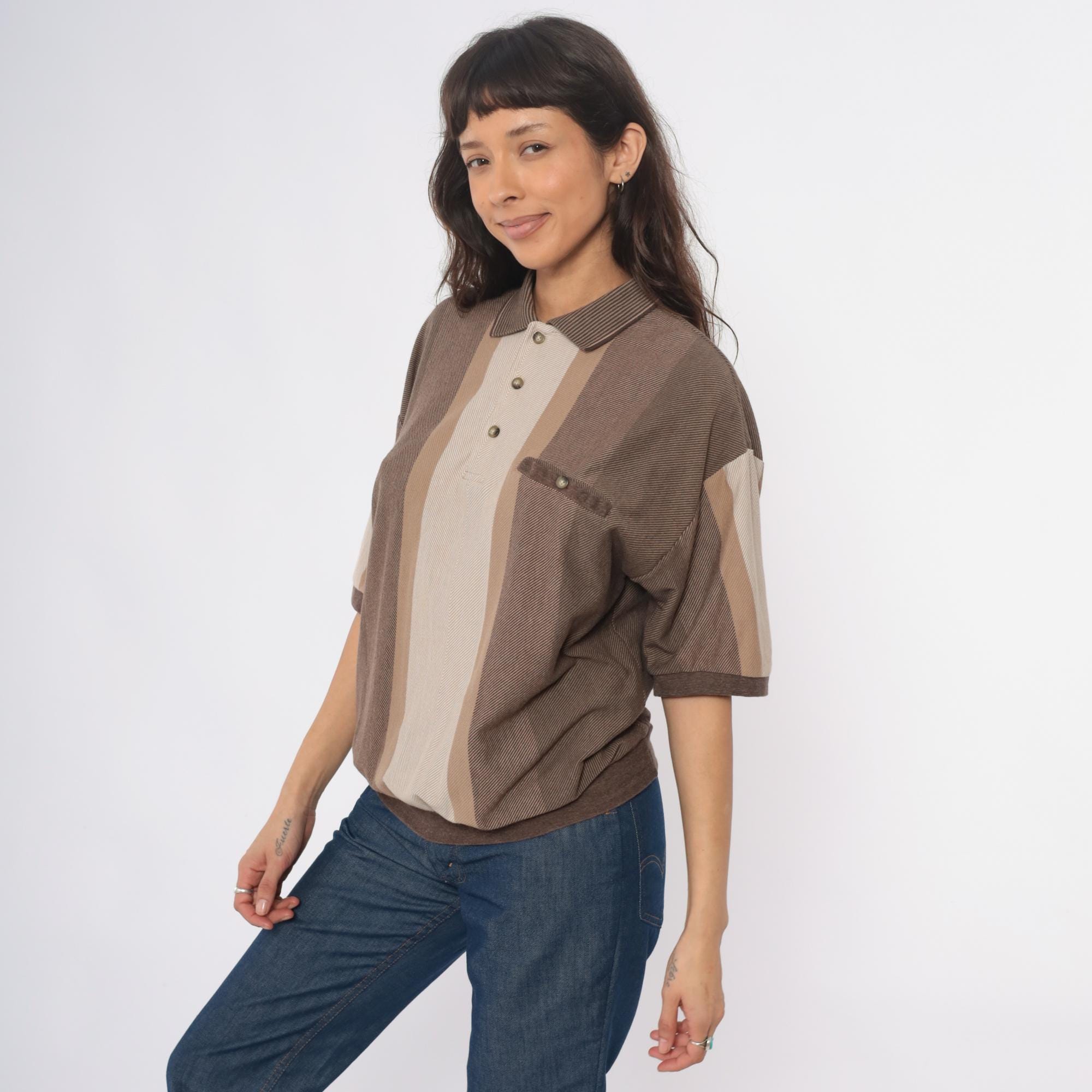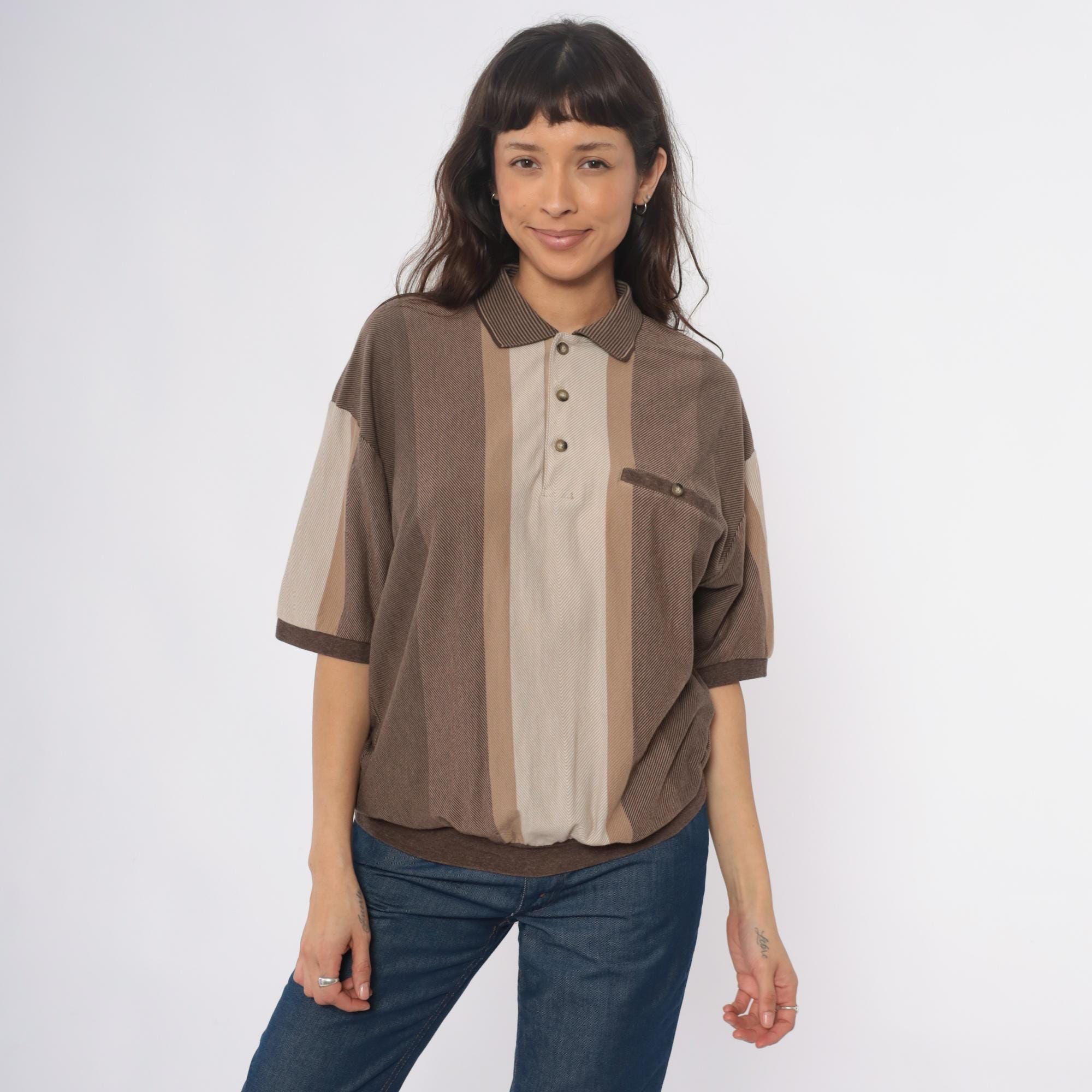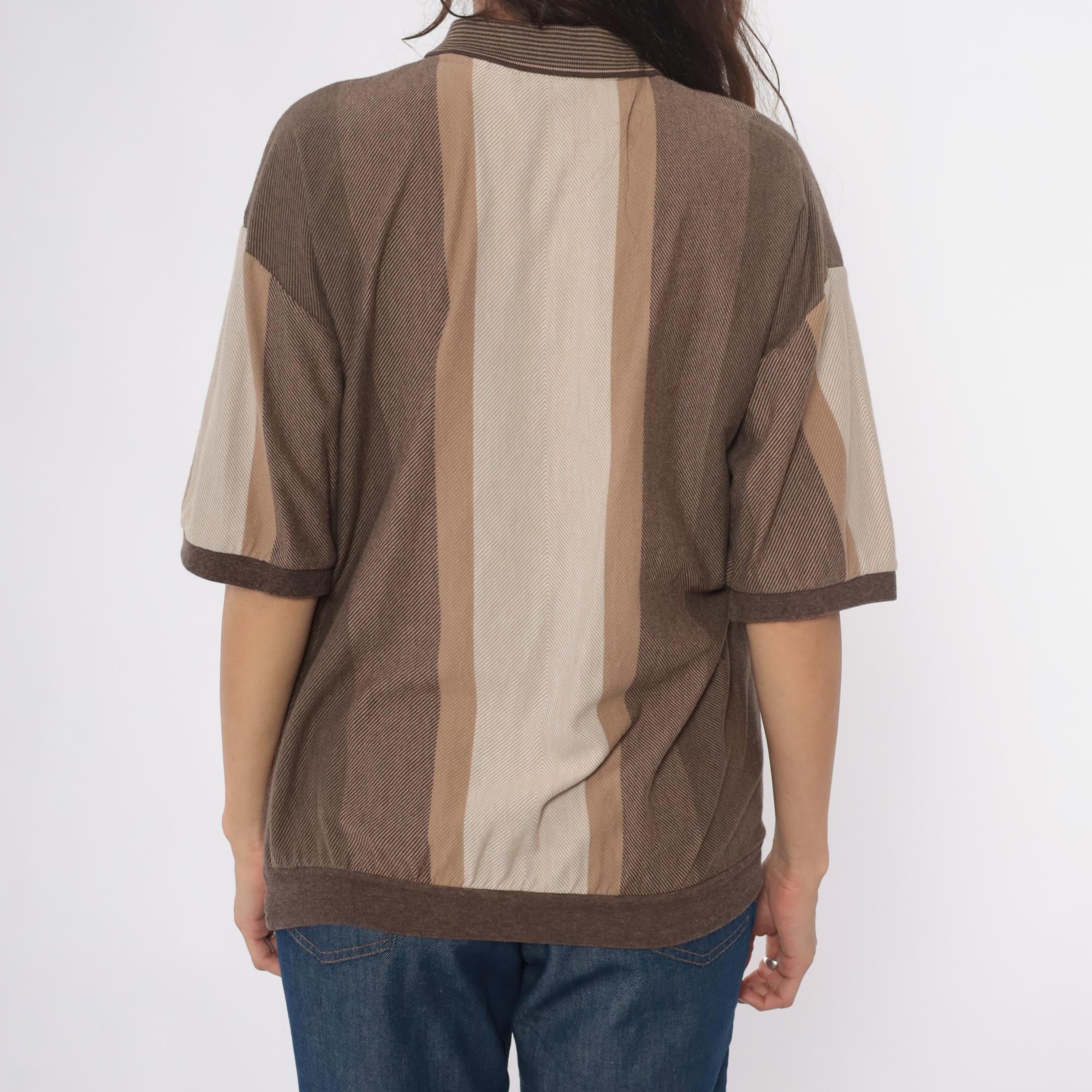 90s striped polo shirt from id sport in brown and tan vertical color blocking. Three-button placket, chest pocket with button closure, short sleeves. Ribbed collar, cuffs, and hem in brown.