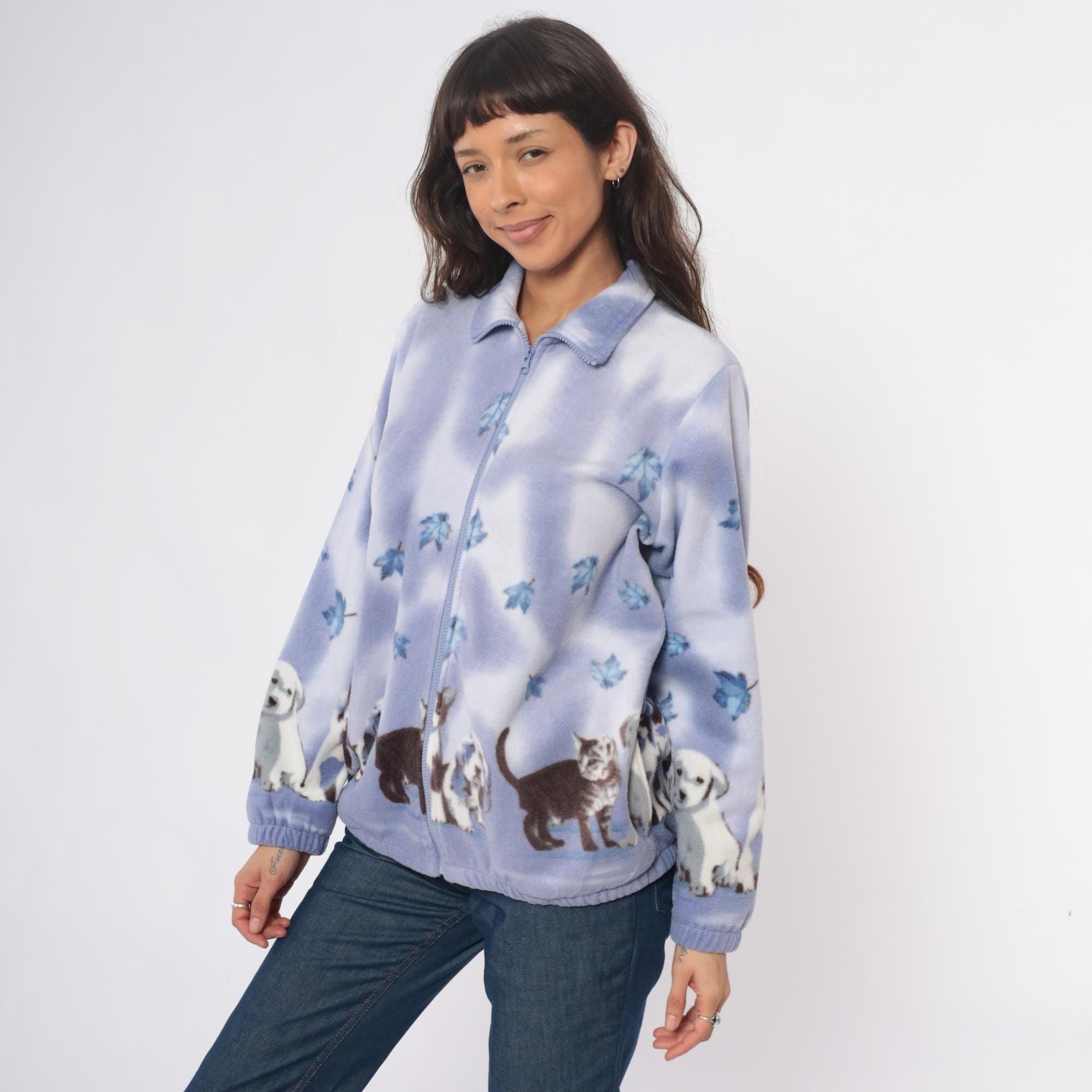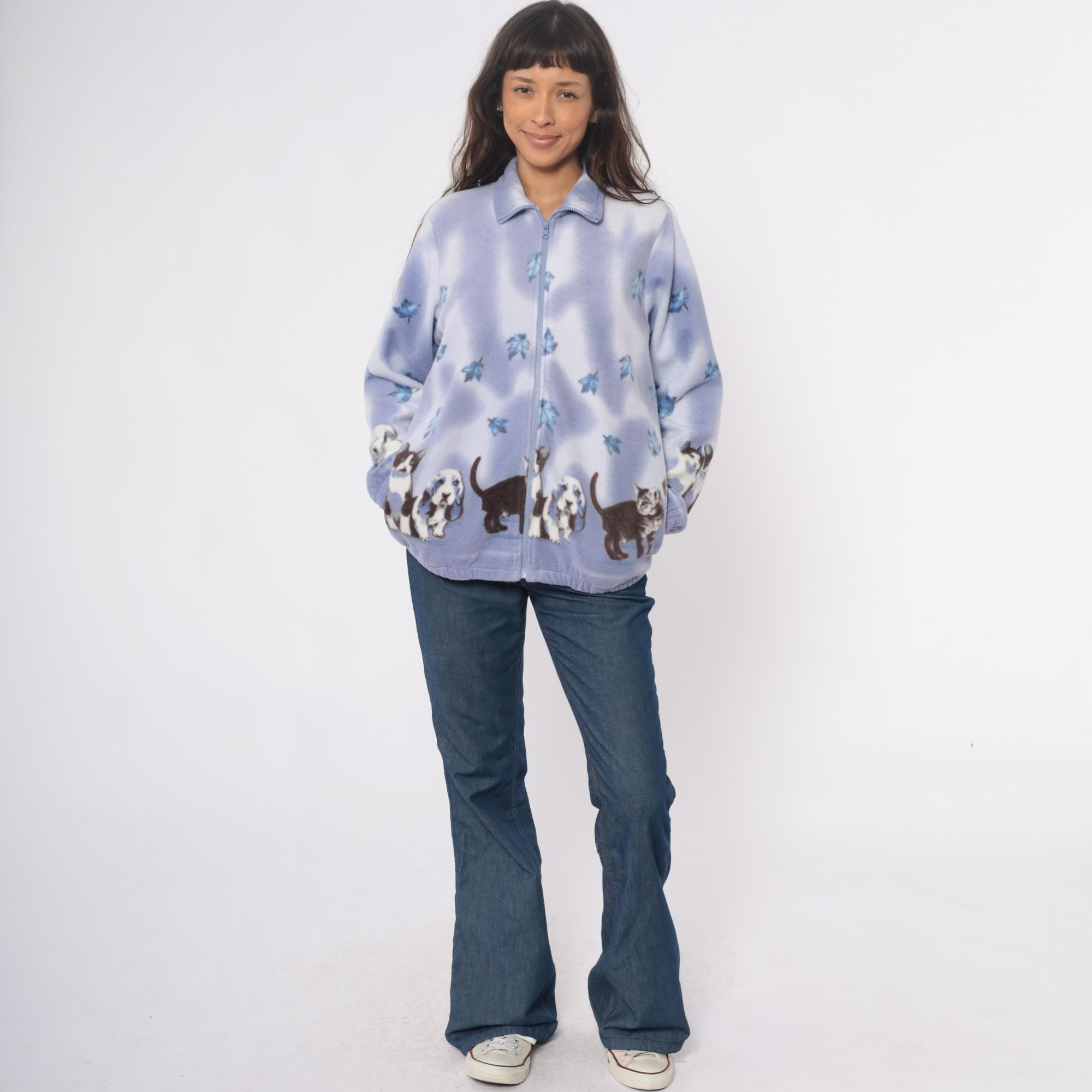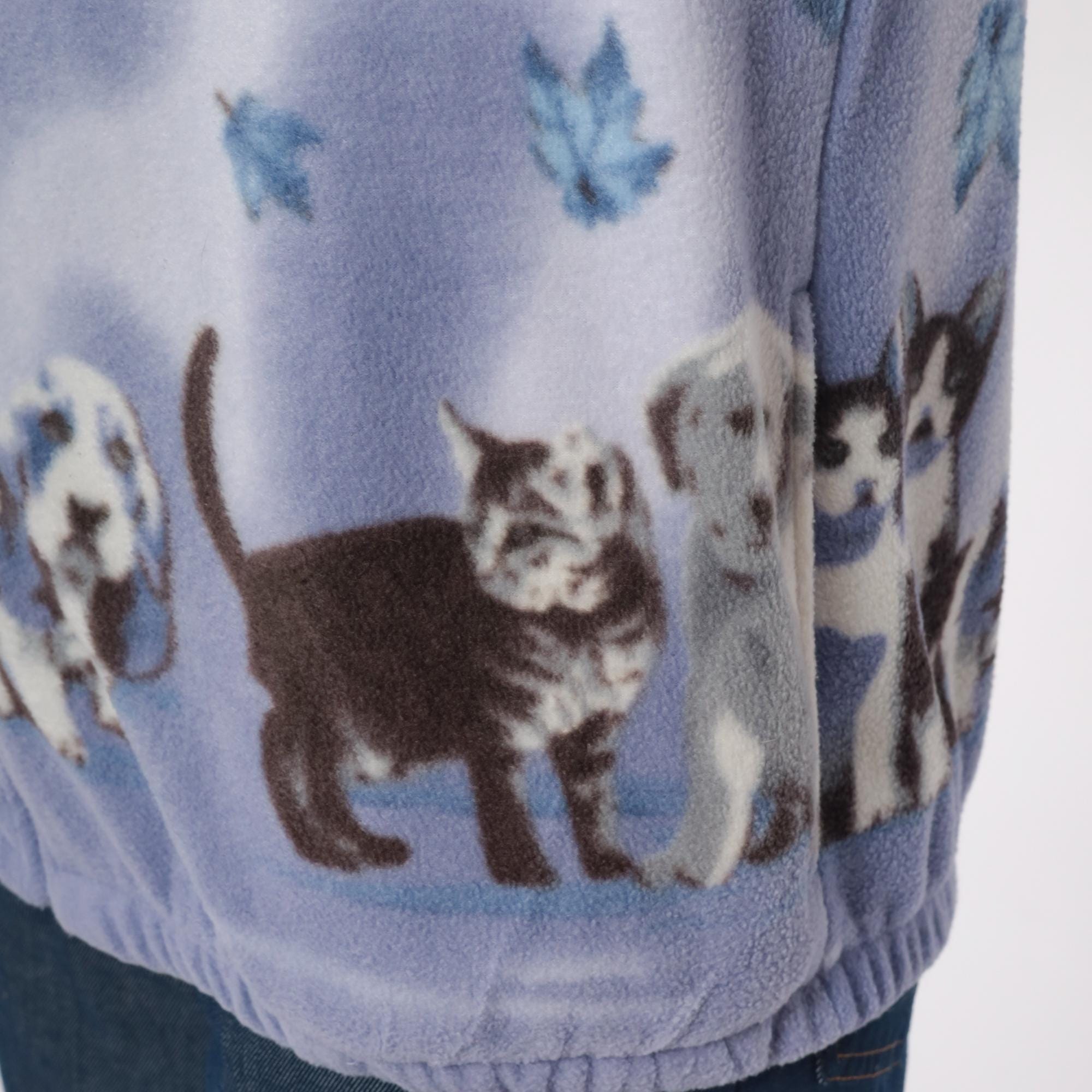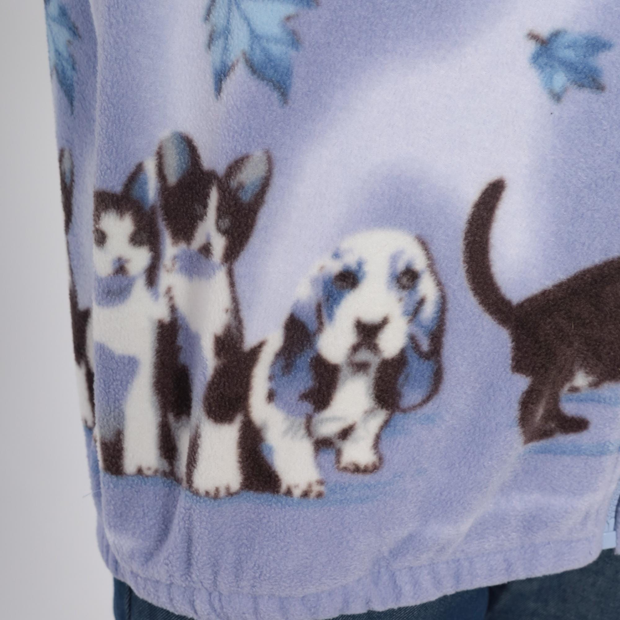 Y2K periwinkle blue fleece jacket from blair with puppy and kitten print border at hem and sleeves, scattered blue floral leaf pattern across body. Full zip front closure with ribbed collar. Long sleeves with ribbed cuffs and ribbed hem.