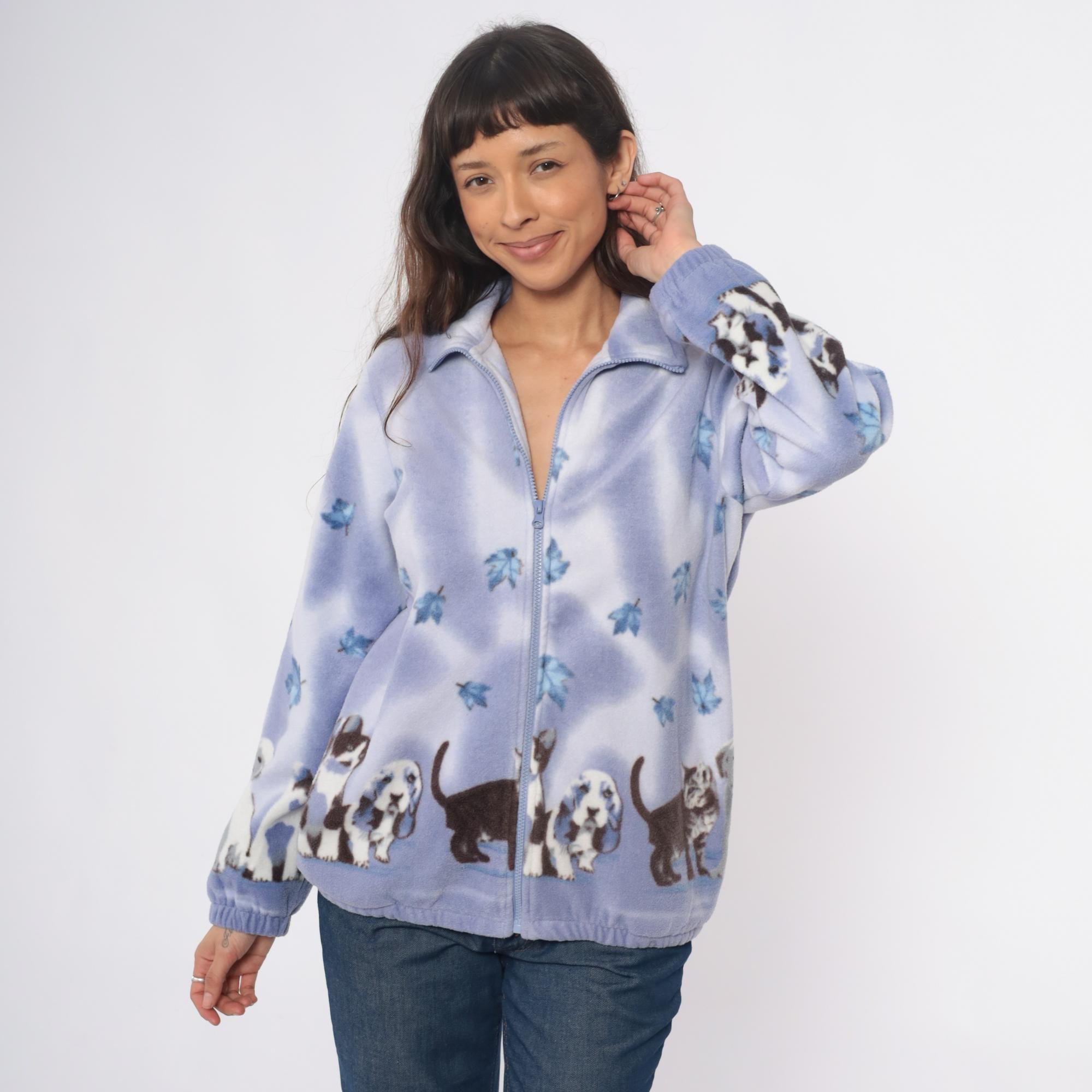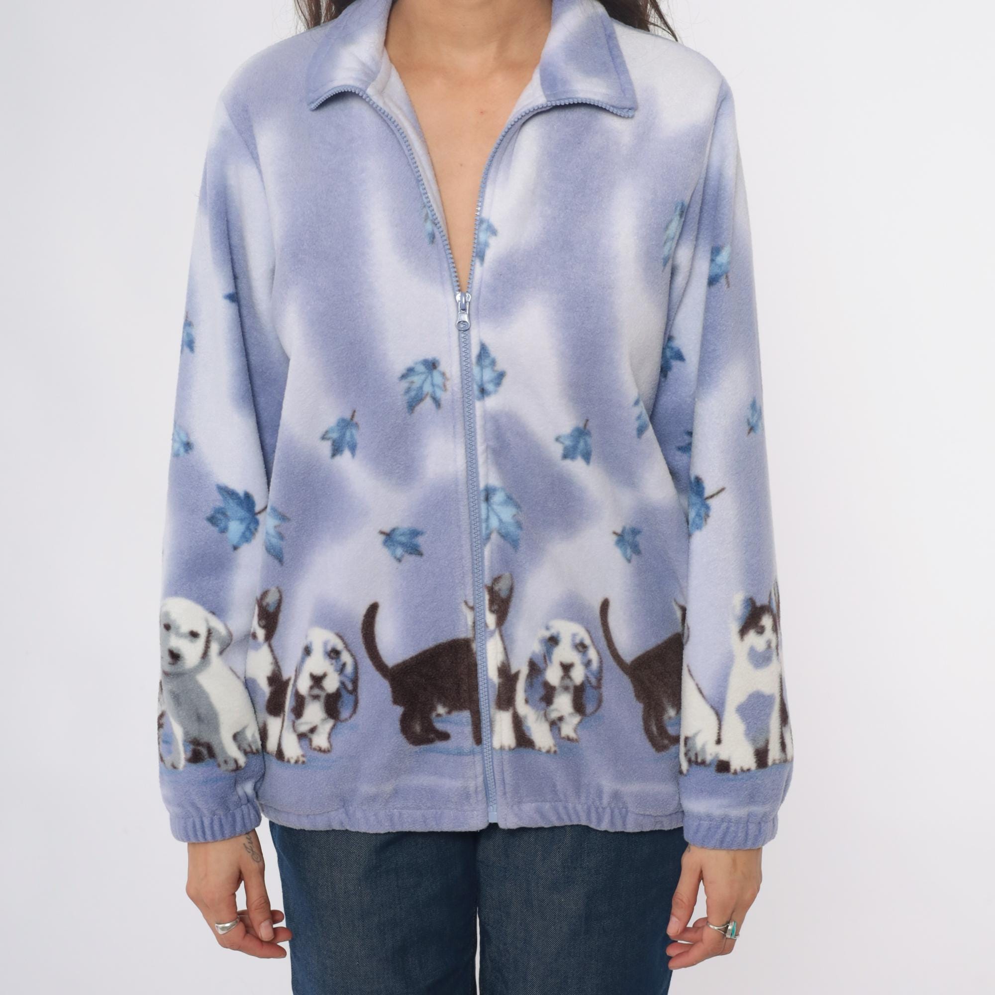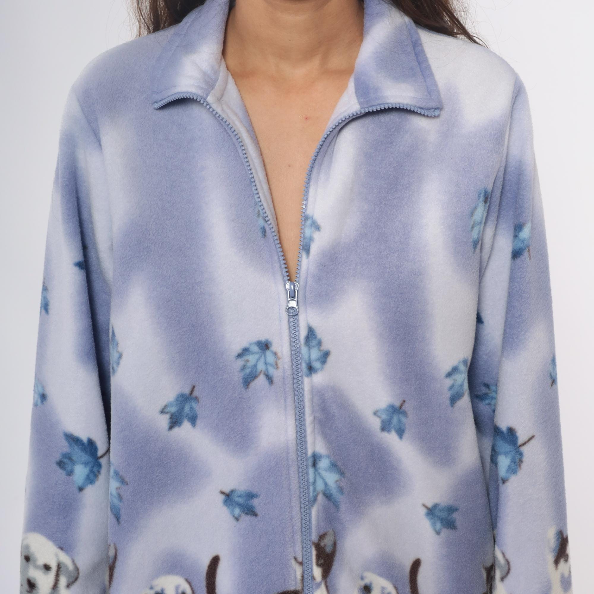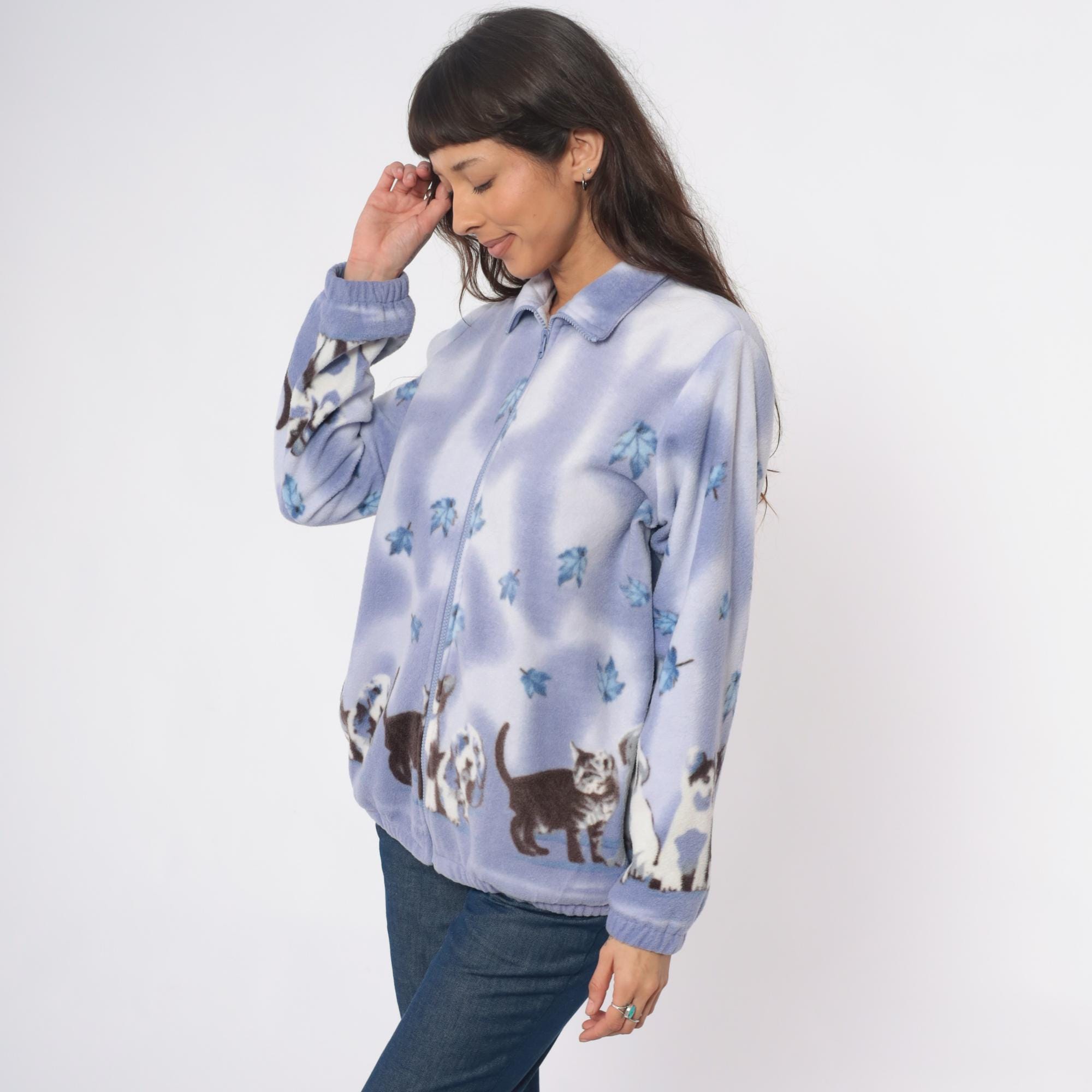 Y2K periwinkle blue fleece jacket from blair with puppy and kitten print border at hem and sleeves, scattered blue floral leaf pattern across body. Full zip front closure with ribbed collar. Long sleeves with ribbed cuffs and ribbed hem.