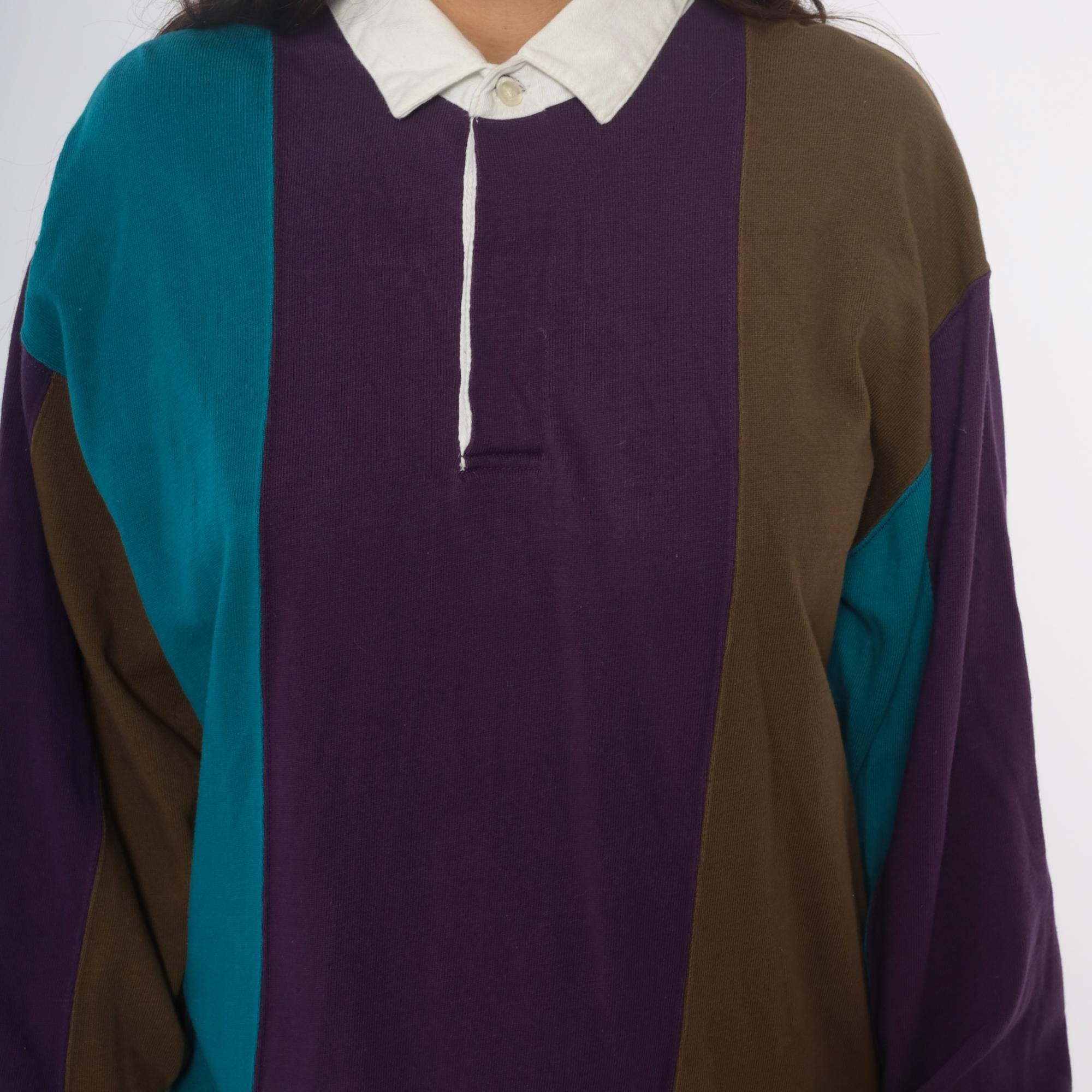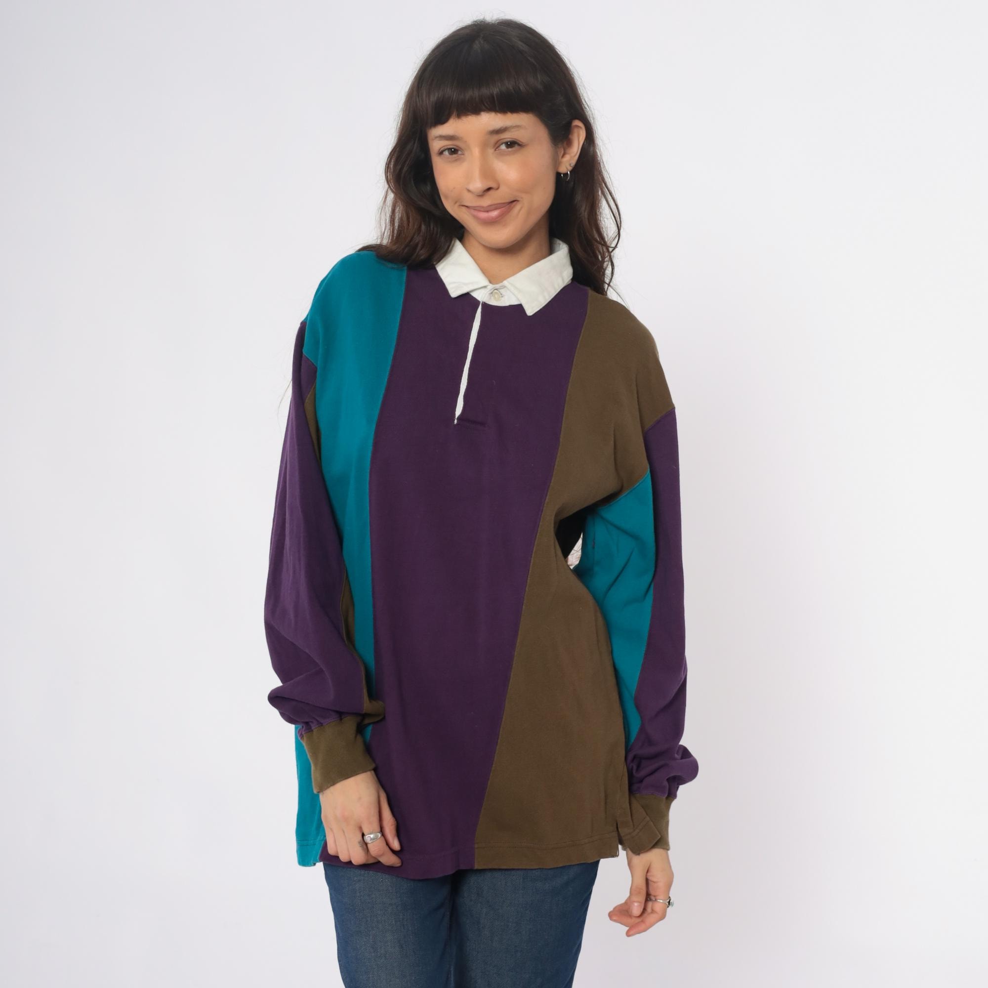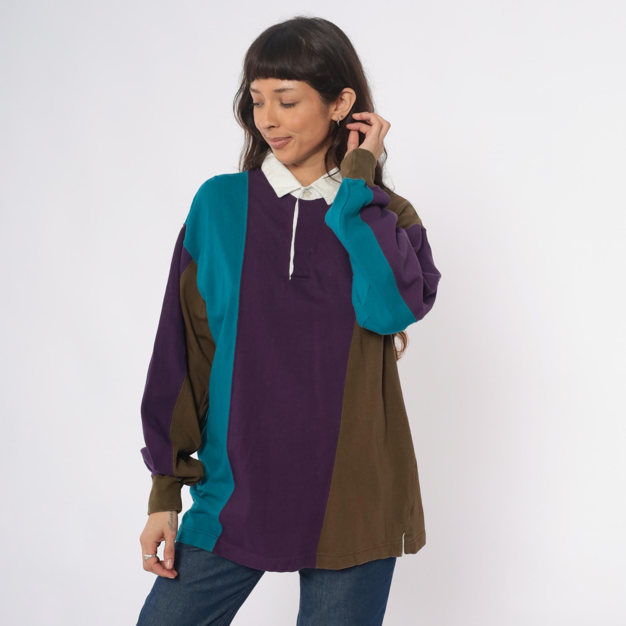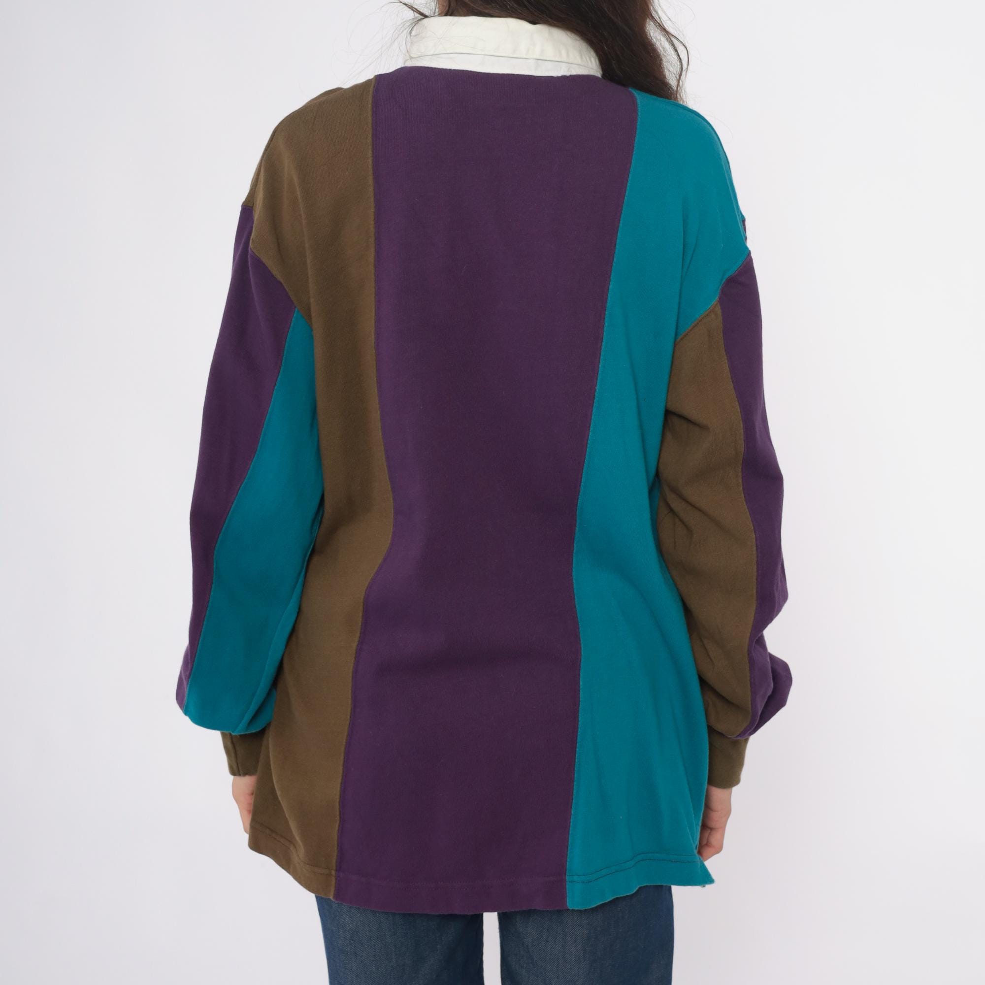 90s color blocked rugby shirt from Cambridge Classics with vertical panels in purple, olive, and teal. White contrast collar, partial front zipper closure, long sleeves with ribbed cuffs.