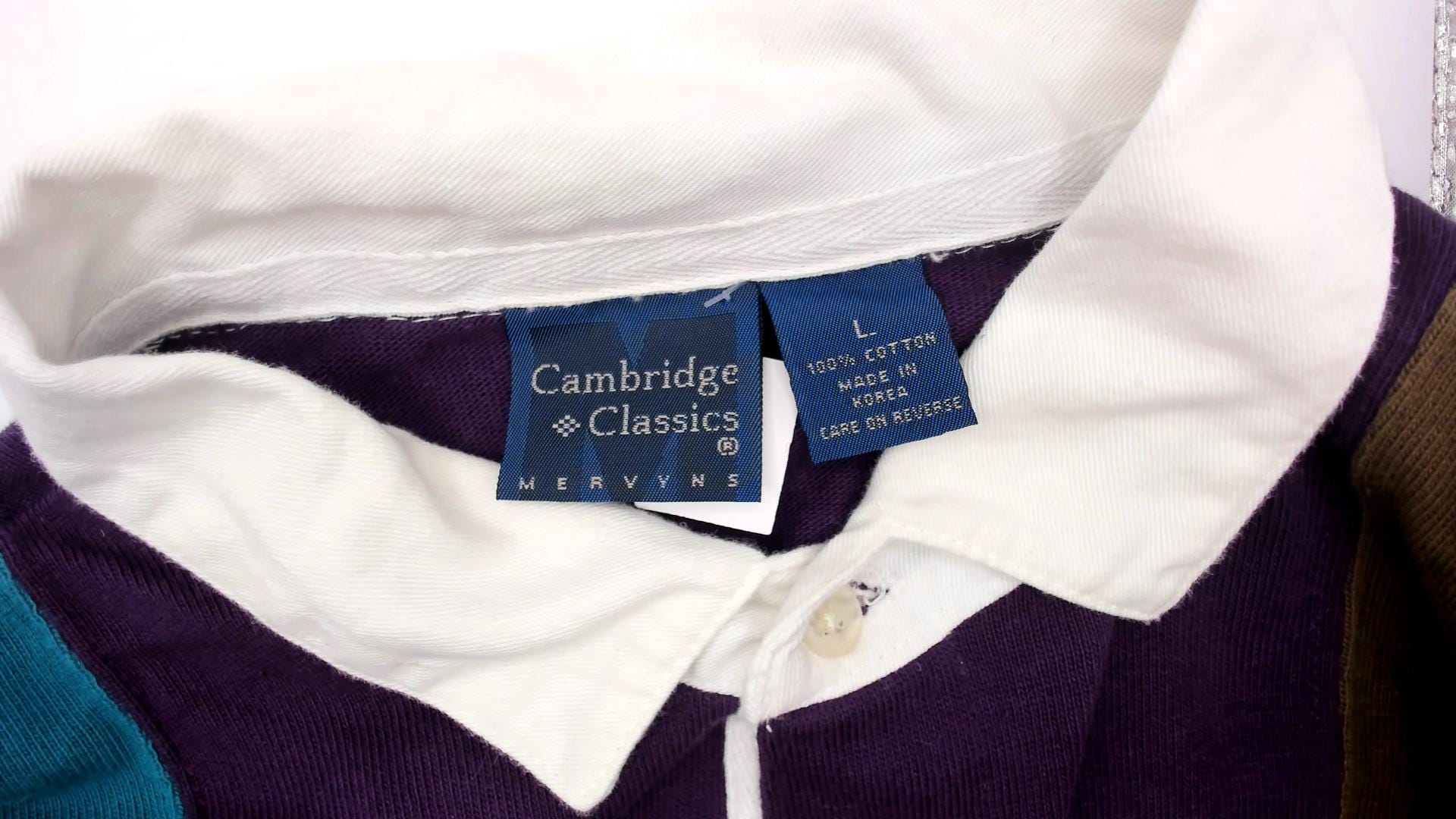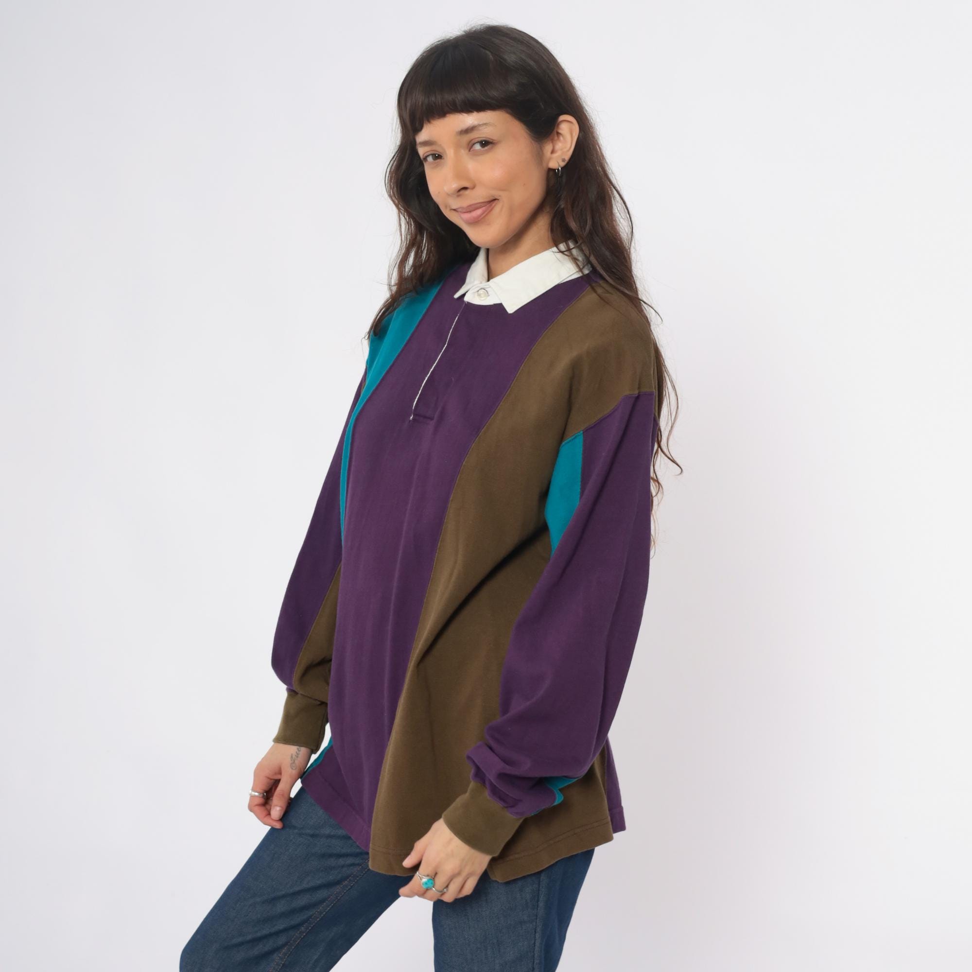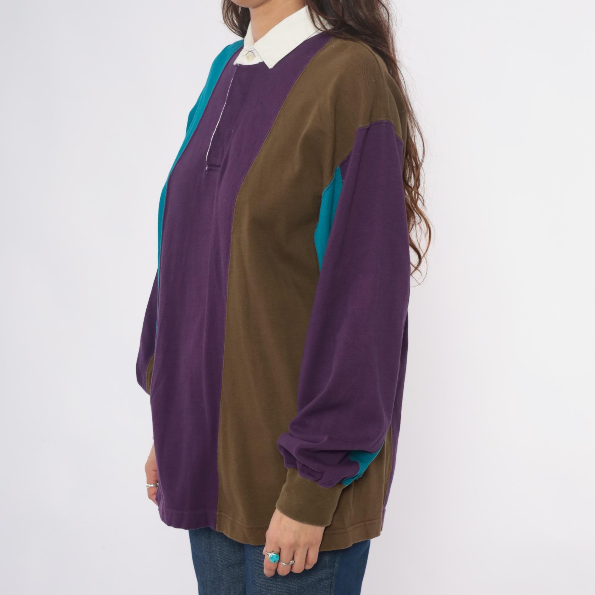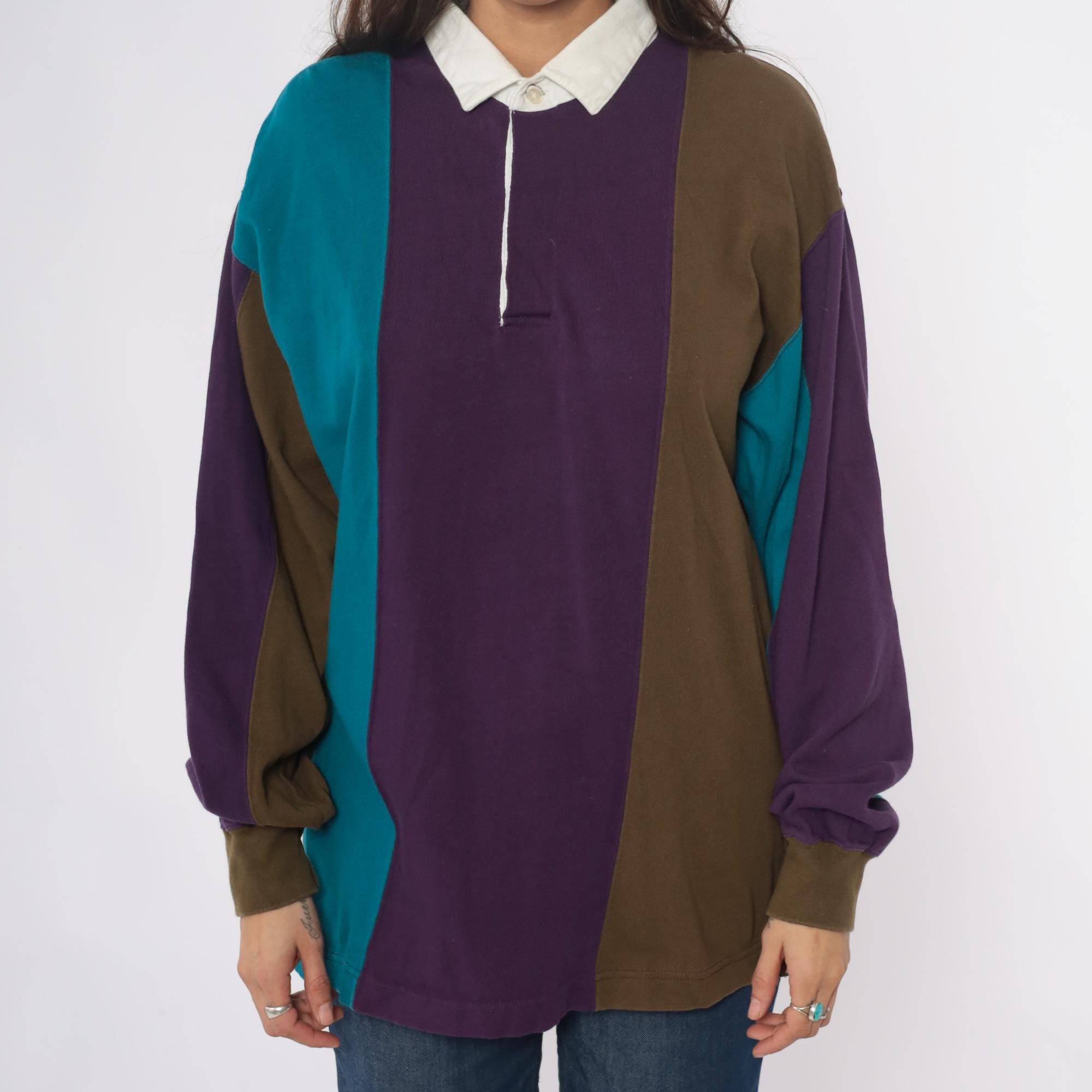 90s color blocked rugby shirt from Cambridge Classics with vertical panels in purple, olive, and teal. White contrast collar, partial front zipper closure, long sleeves with ribbed cuffs.