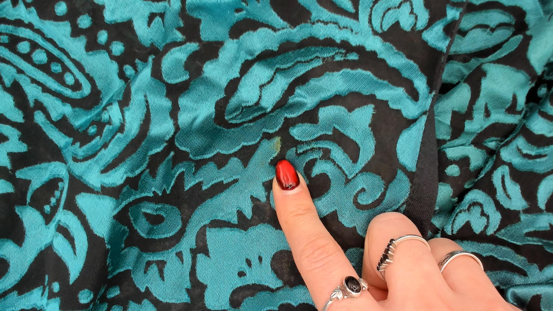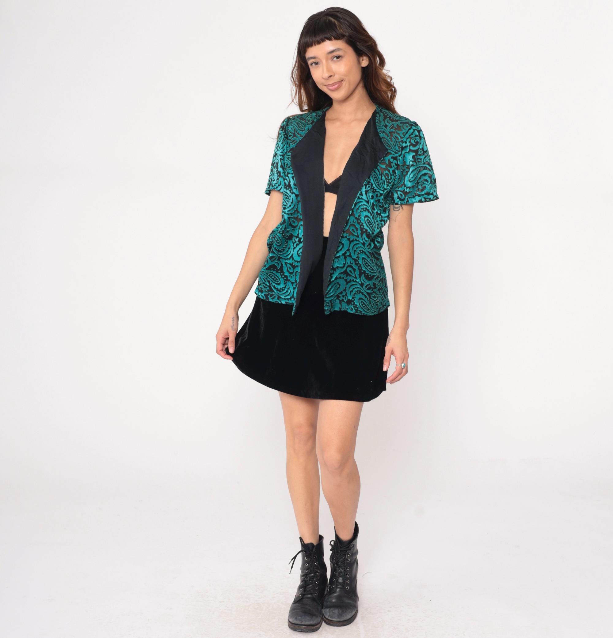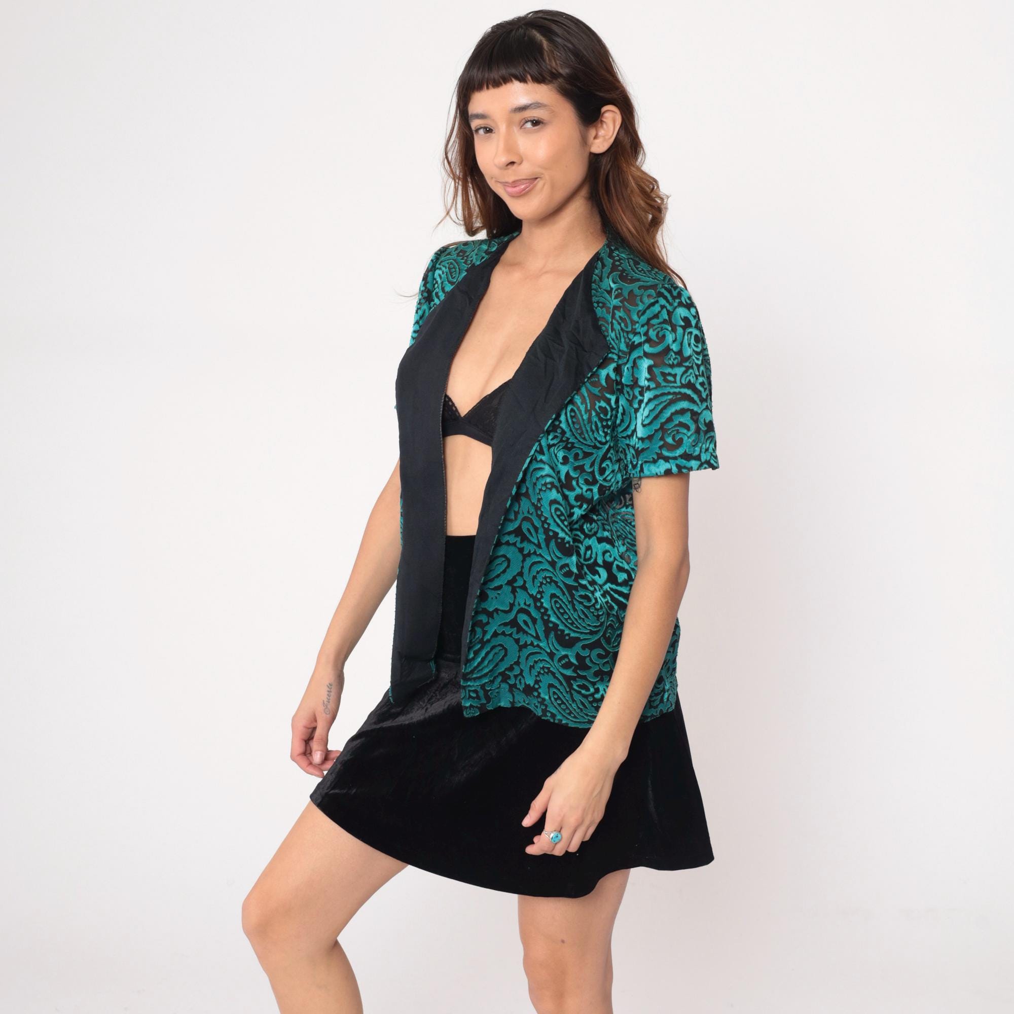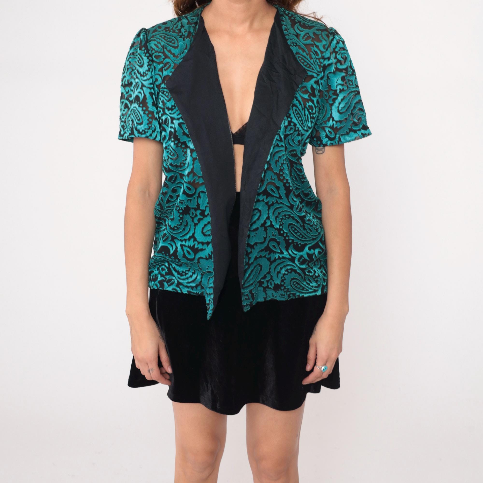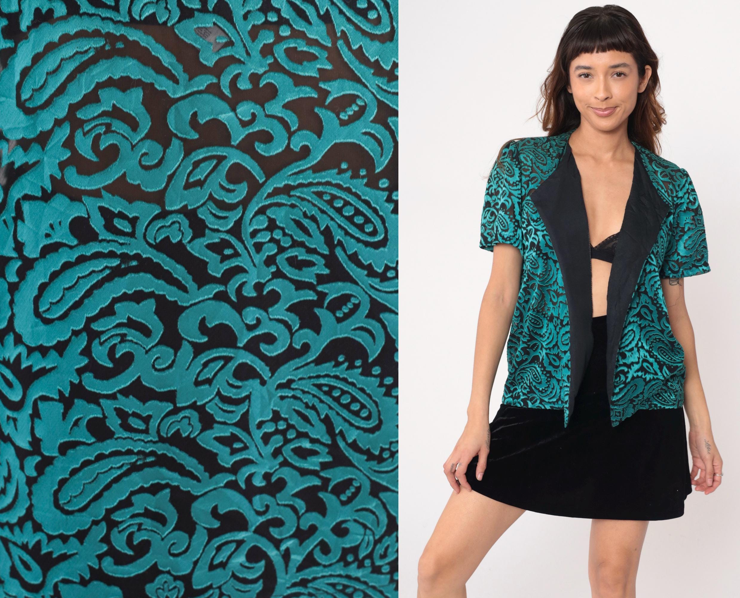 90s turquoise and black paisley open front jacket with raised velvet paisley pattern on semi-sheer base. Short sleeves, black satin-like lapels and front panels. Teal green paisley design throughout body and sleeves.