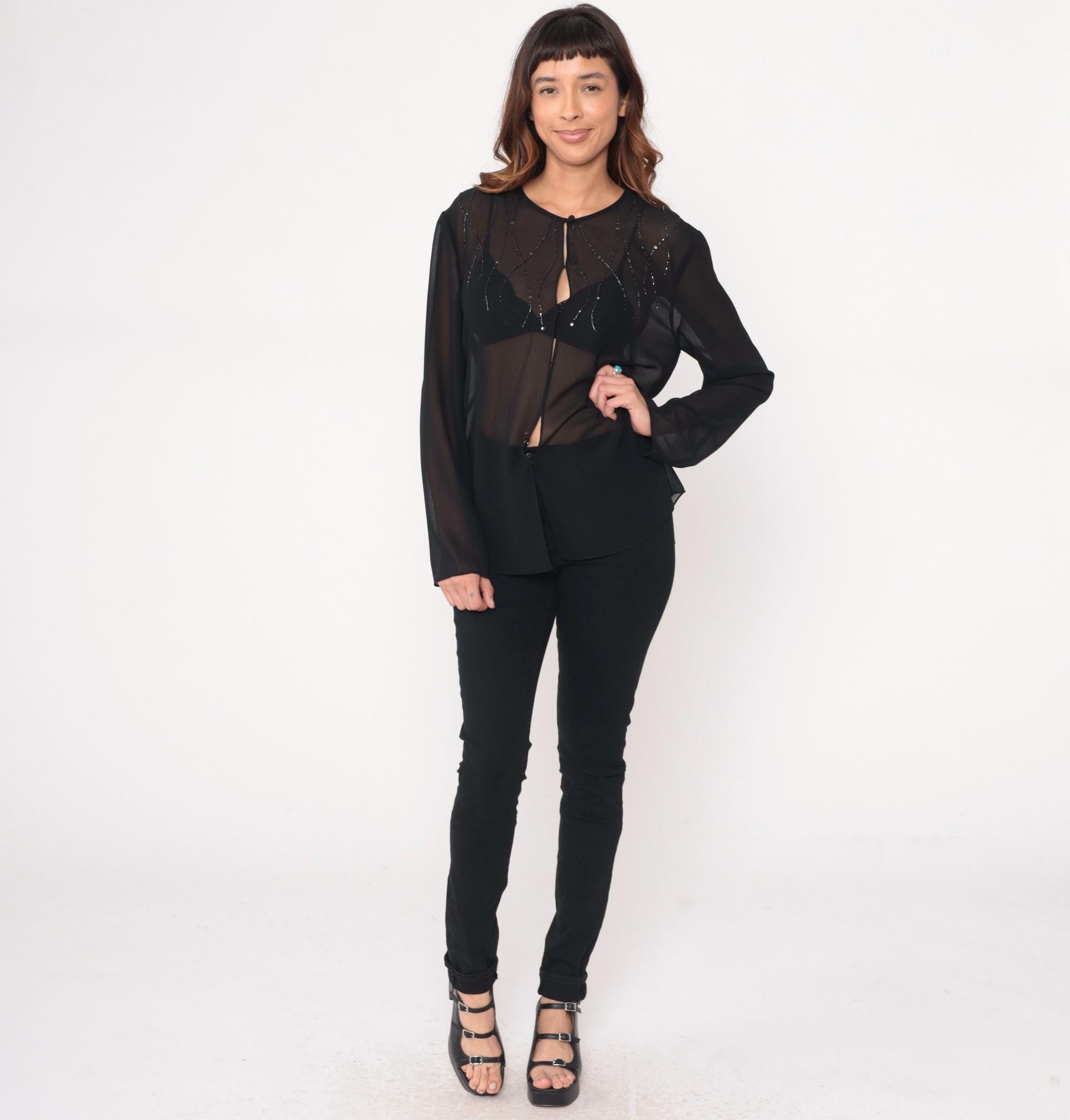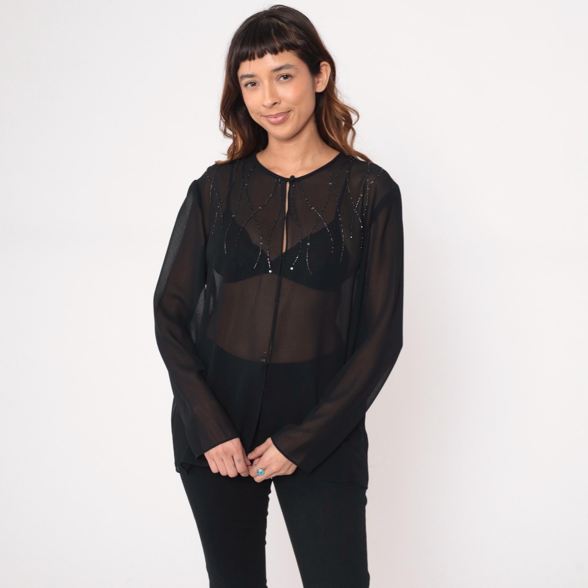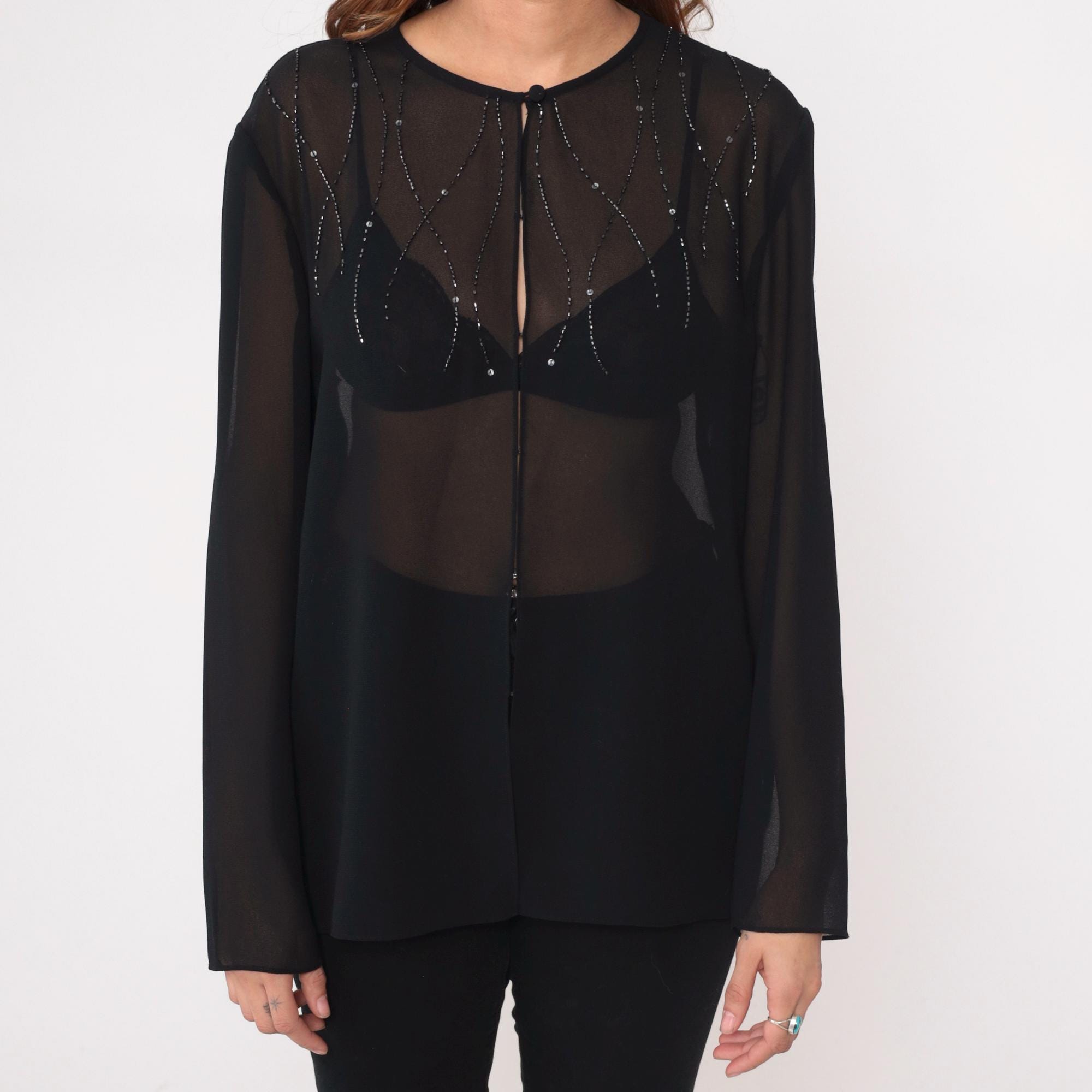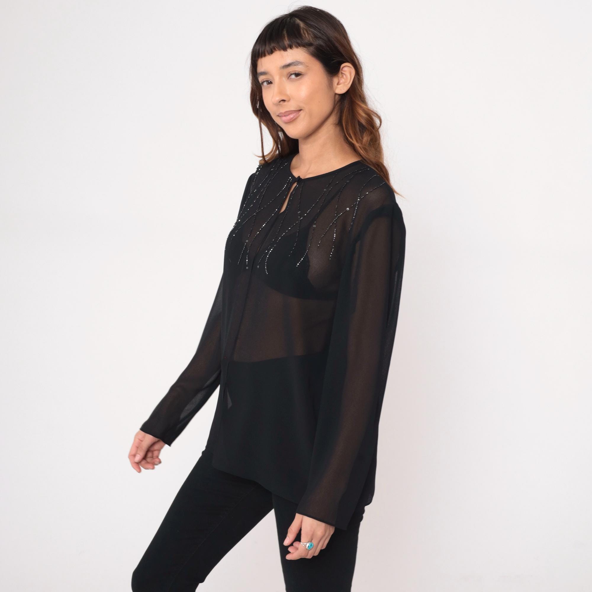 90s black sheer blouse from Adrianna Papell with beaded embellishment in radiating sunburst pattern across the chest and shoulders. Round neckline with keyhole opening and tie closure, button front, long sleeves.