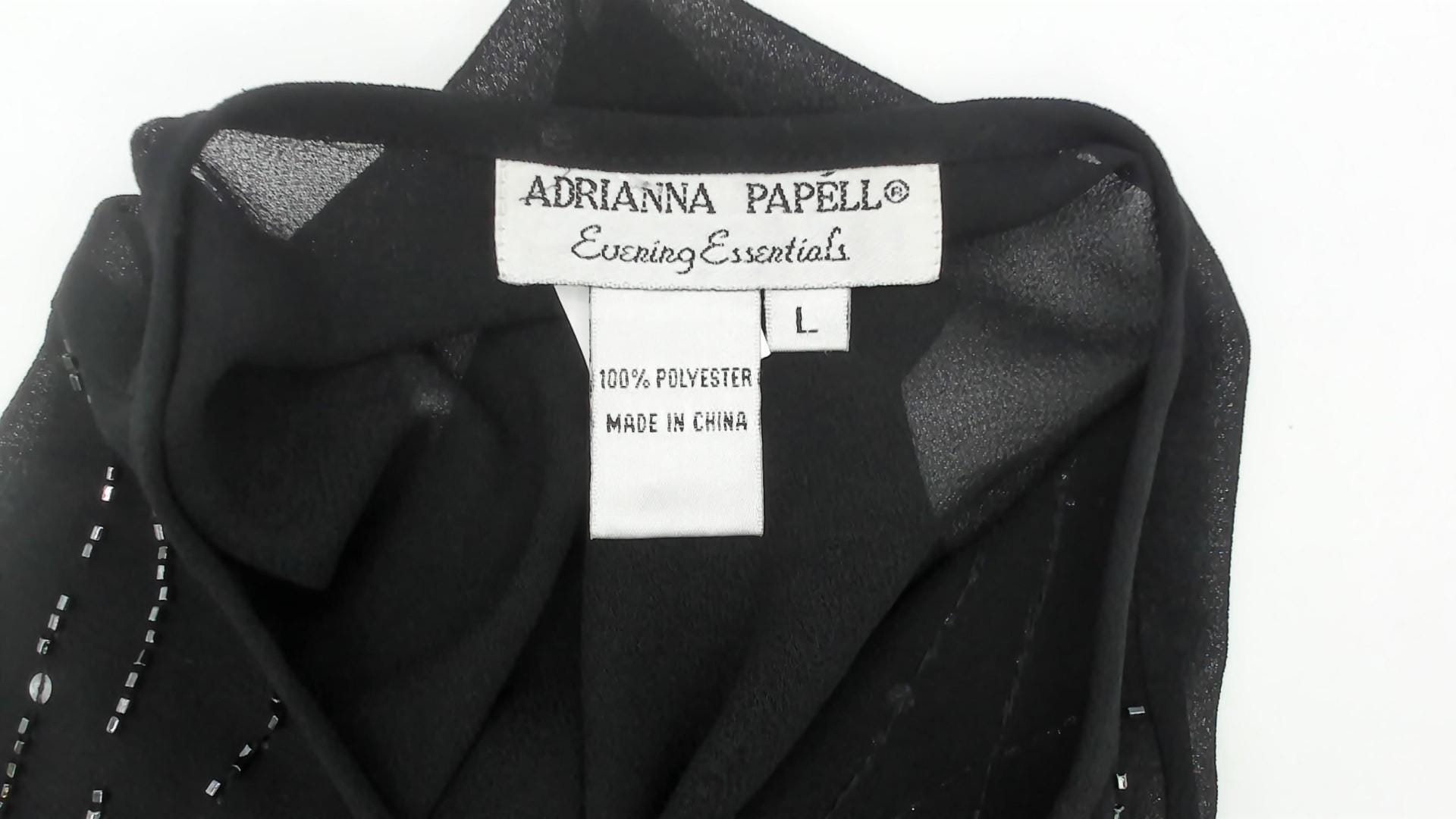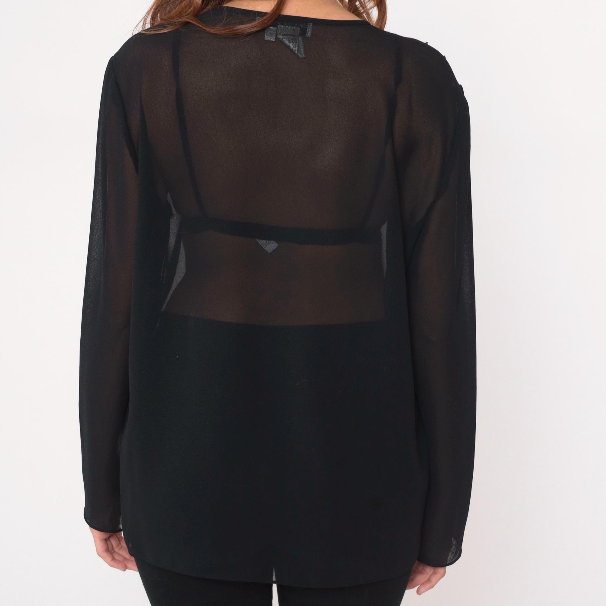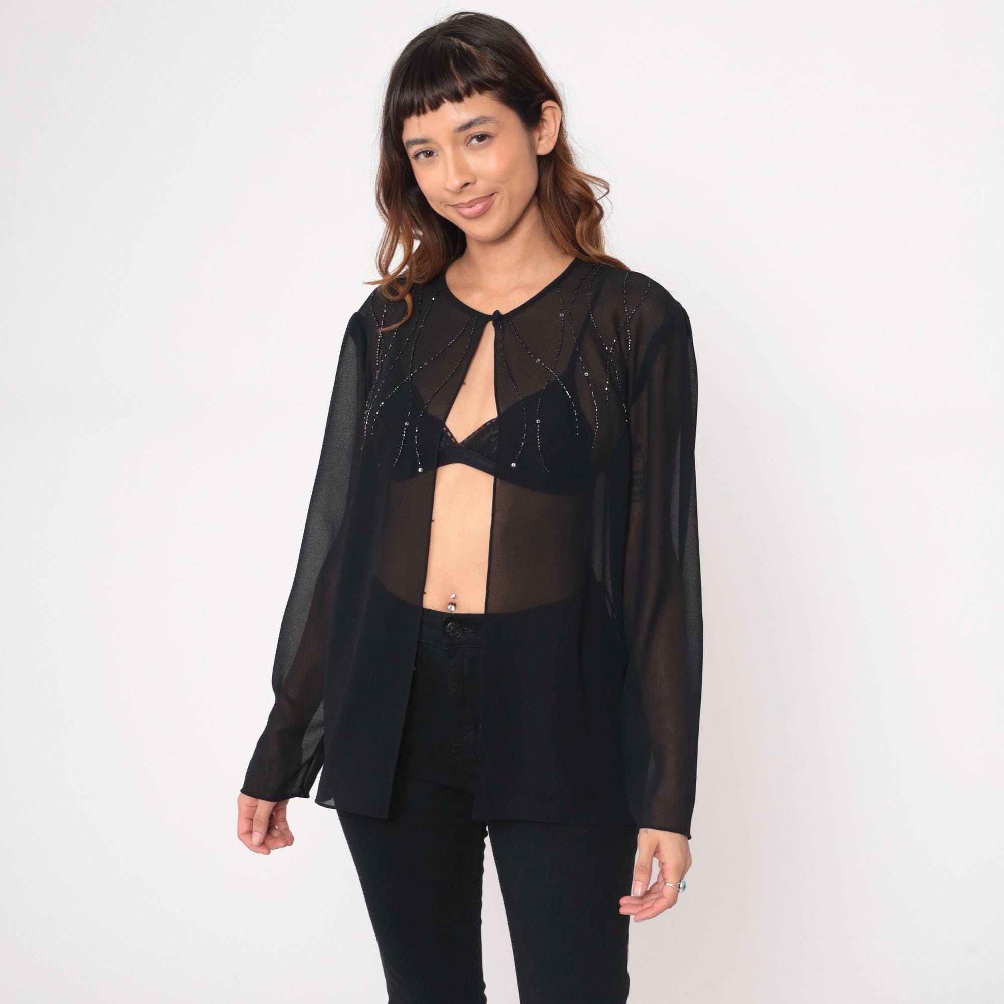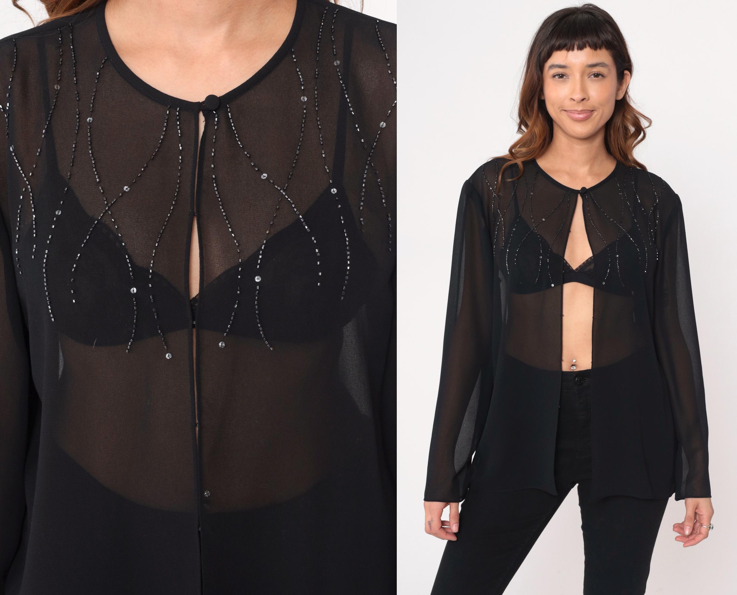 90s black sheer blouse from Adrianna Papell with beaded embellishment in radiating sunburst pattern across the chest and shoulders. Round neckline with keyhole opening and tie closure, button front, long sleeves.