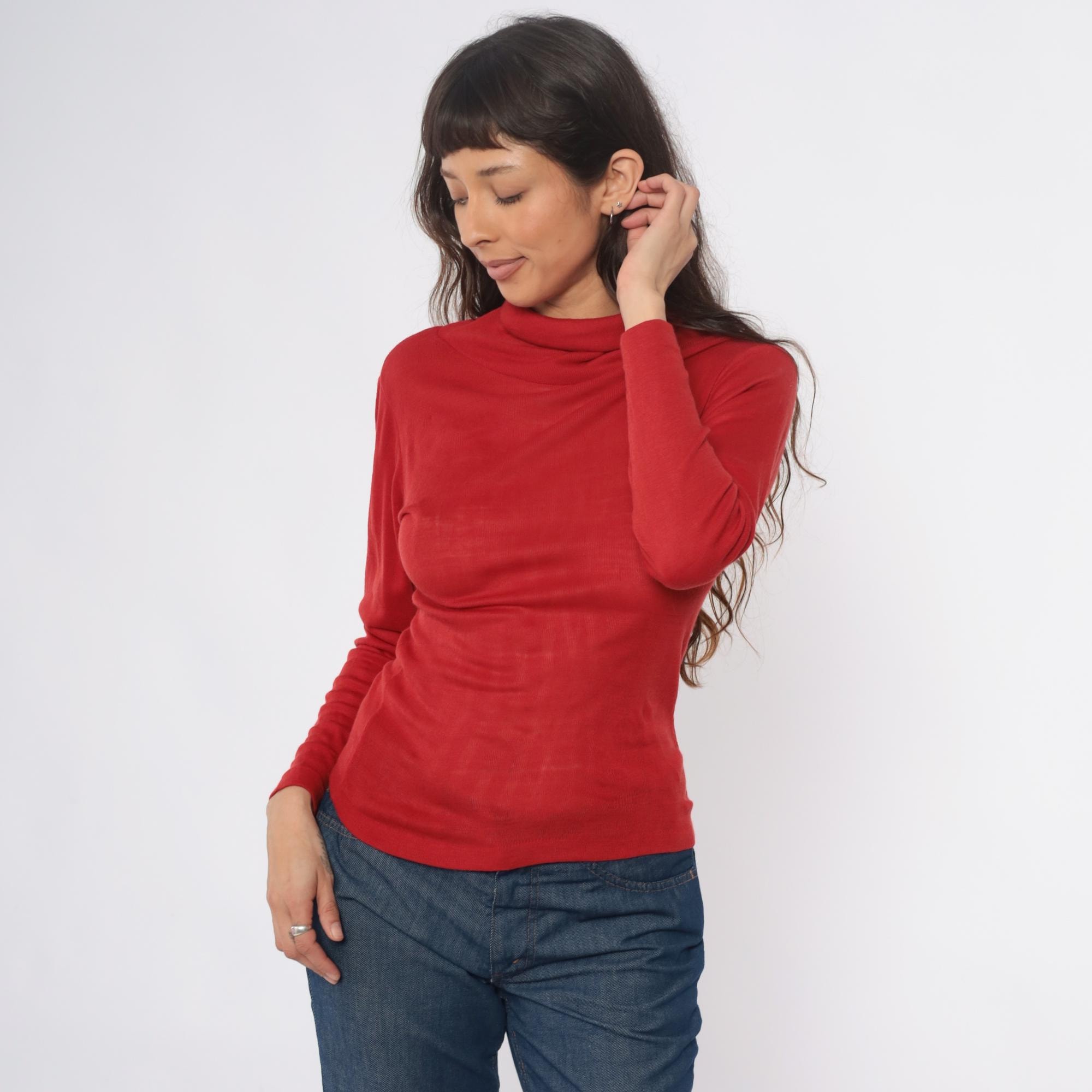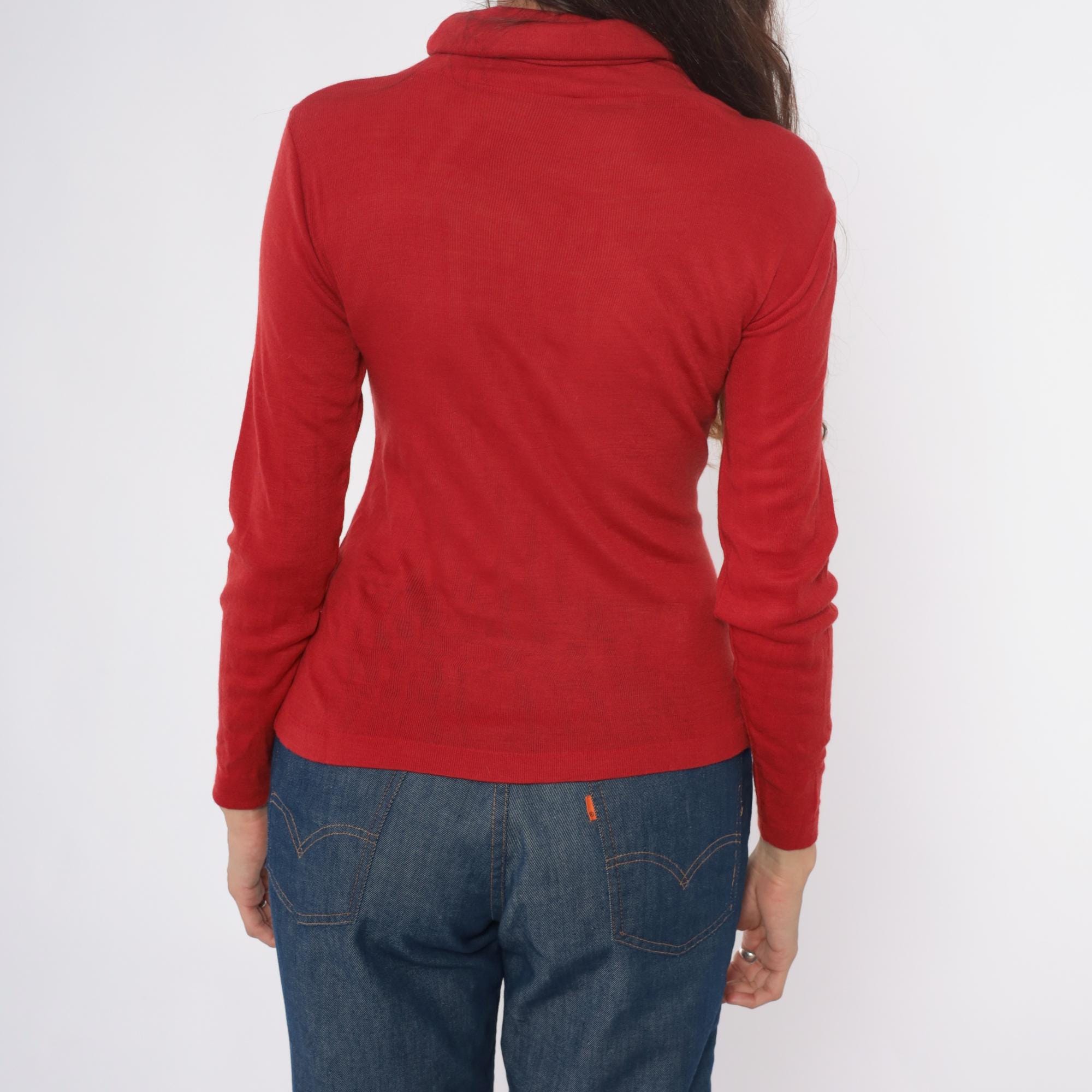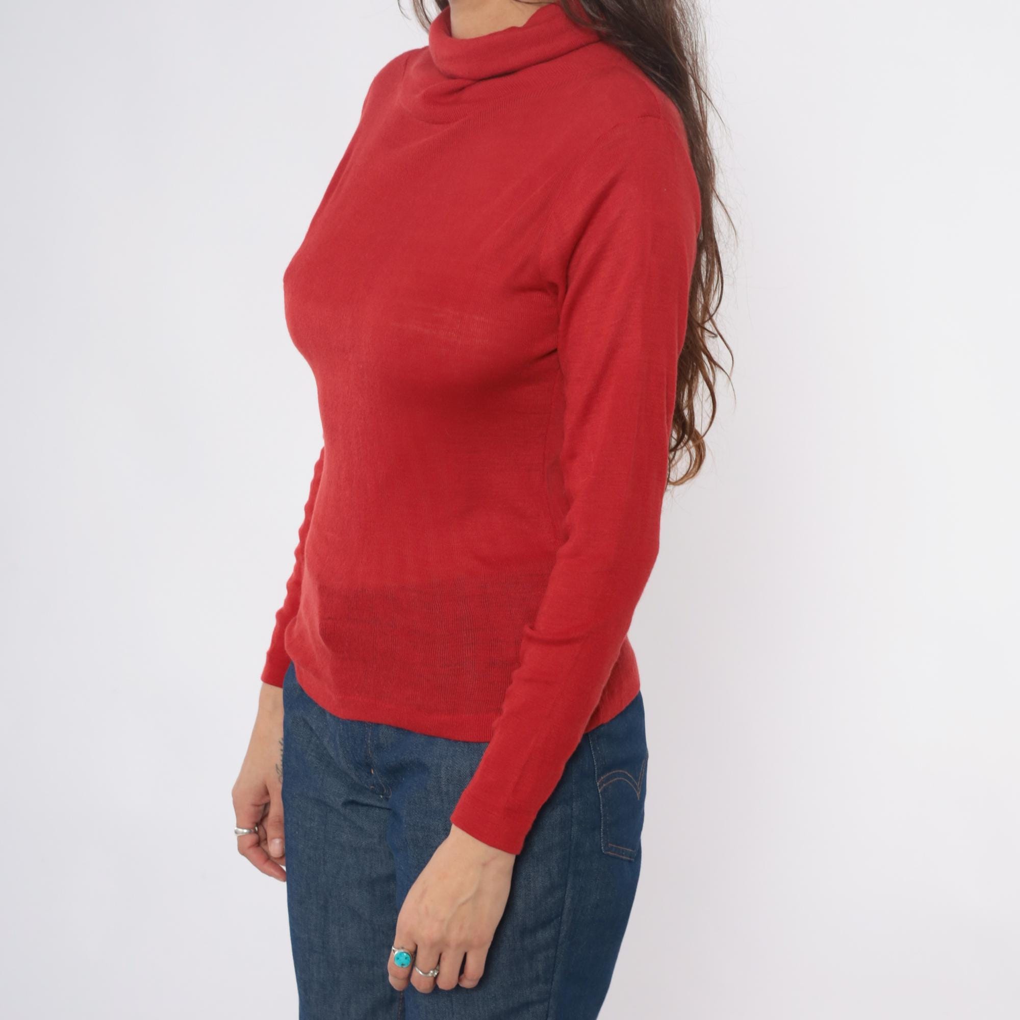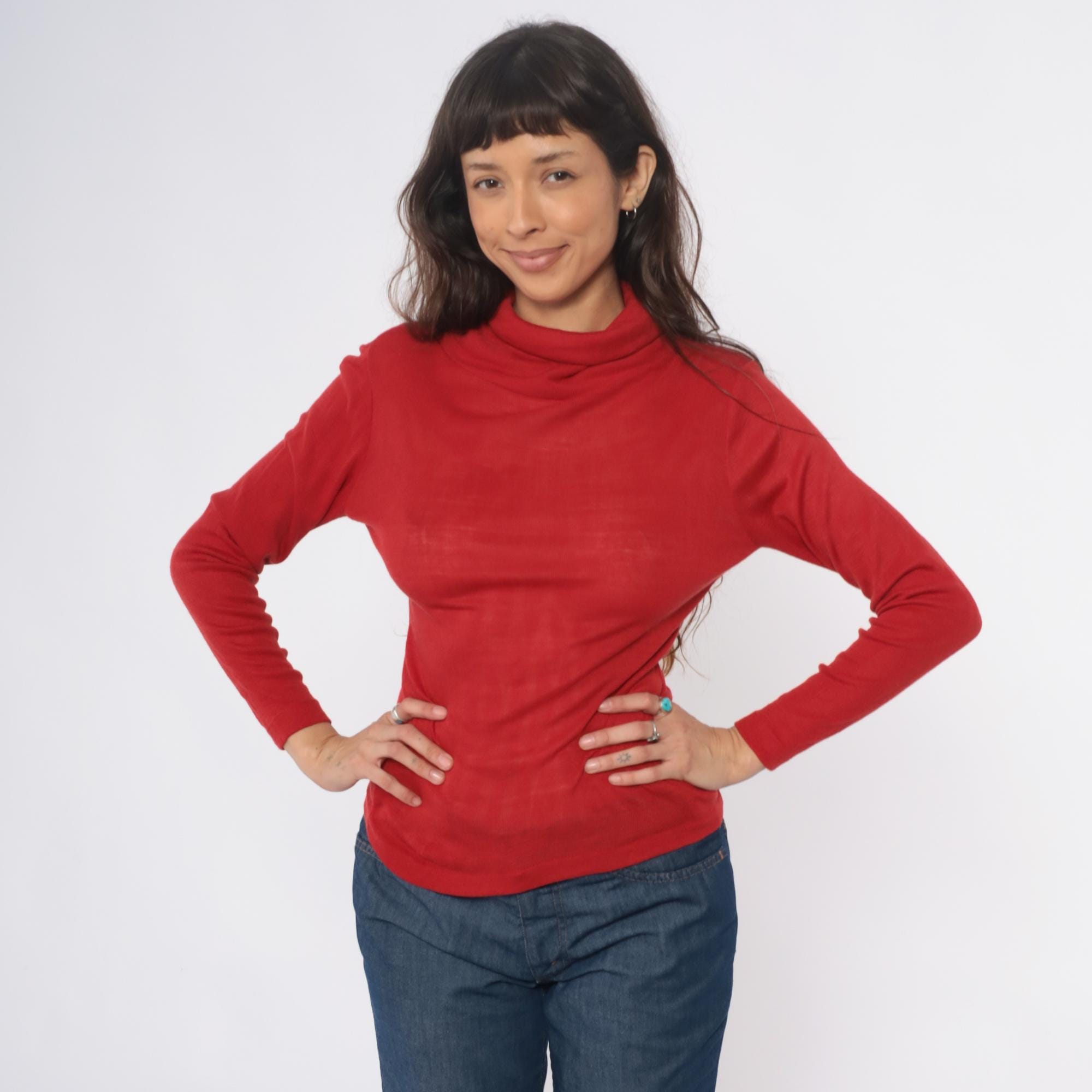 80s red turtleneck shirt in ribbed acrylic knit with fitted silhouette and long sleeves. Coral-red color throughout with fold-over turtleneck collar and ribbed cuffs.