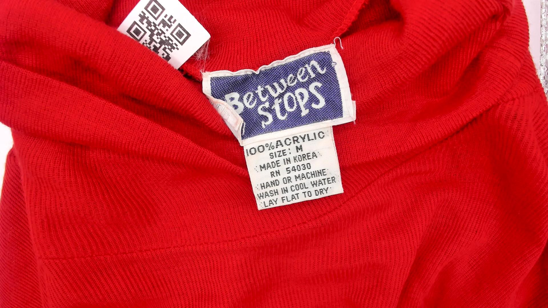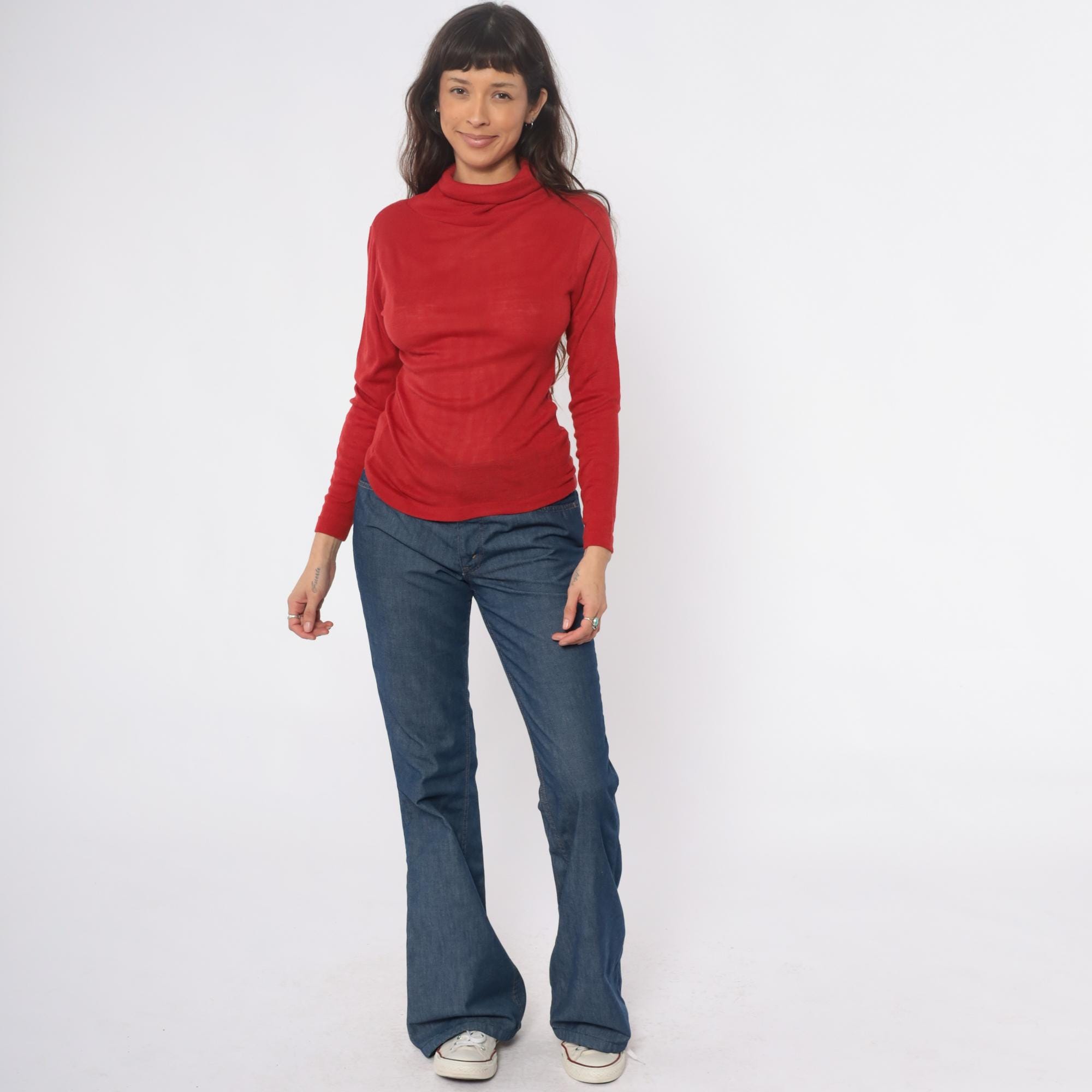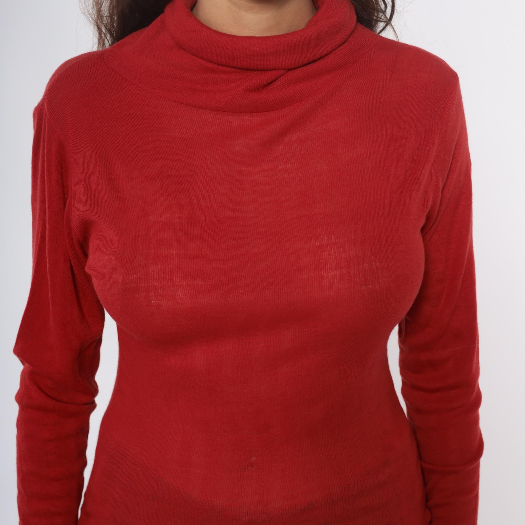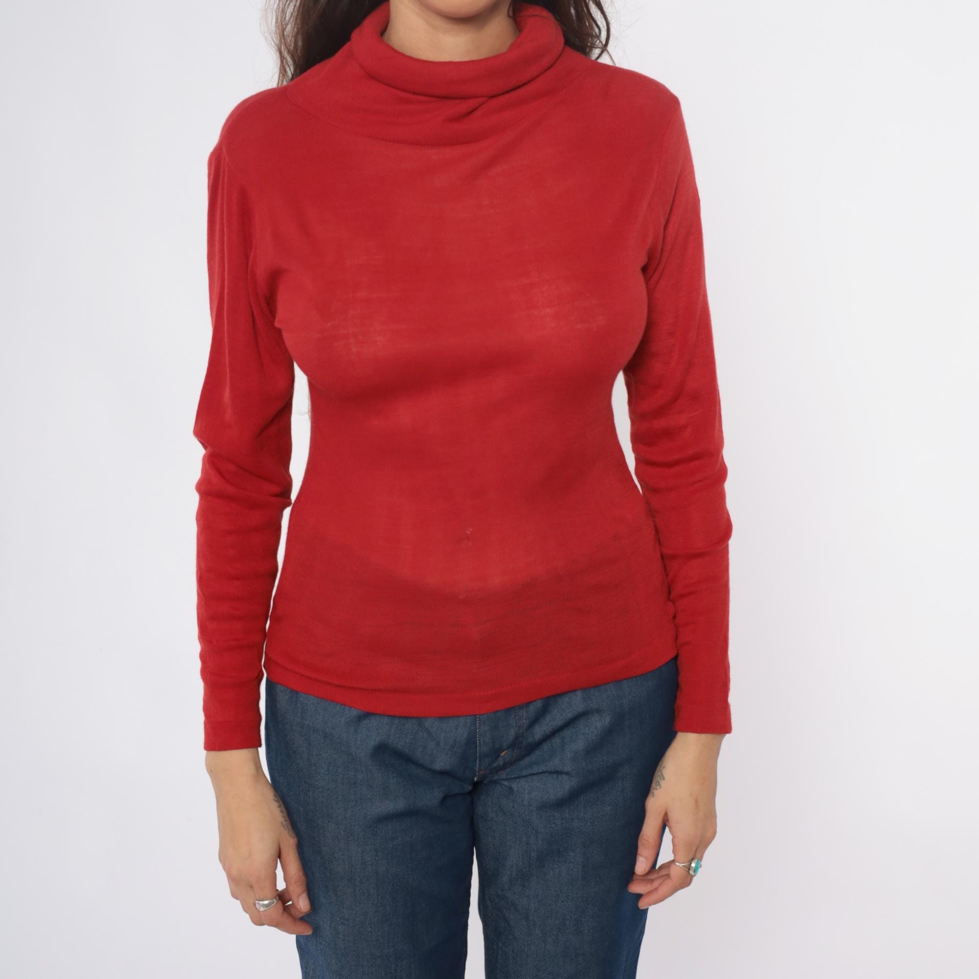 80s red turtleneck shirt in ribbed acrylic knit with fitted silhouette and long sleeves. Coral-red color throughout with fold-over turtleneck collar and ribbed cuffs.