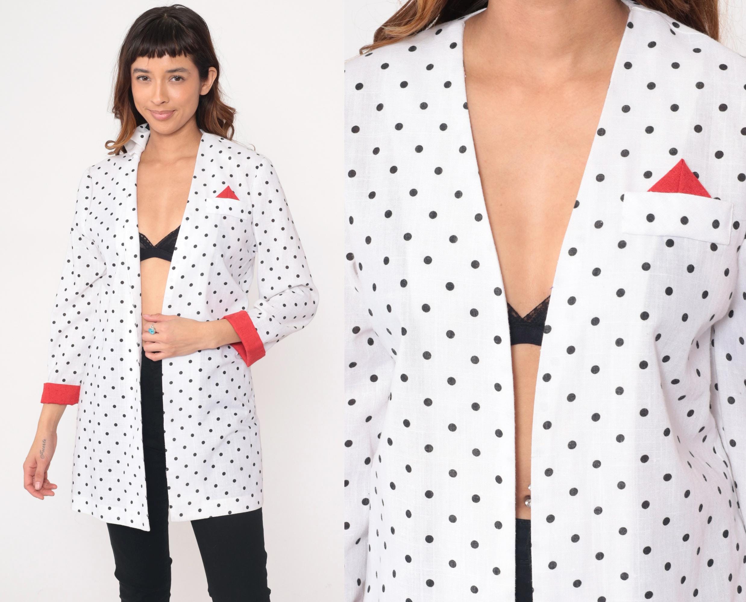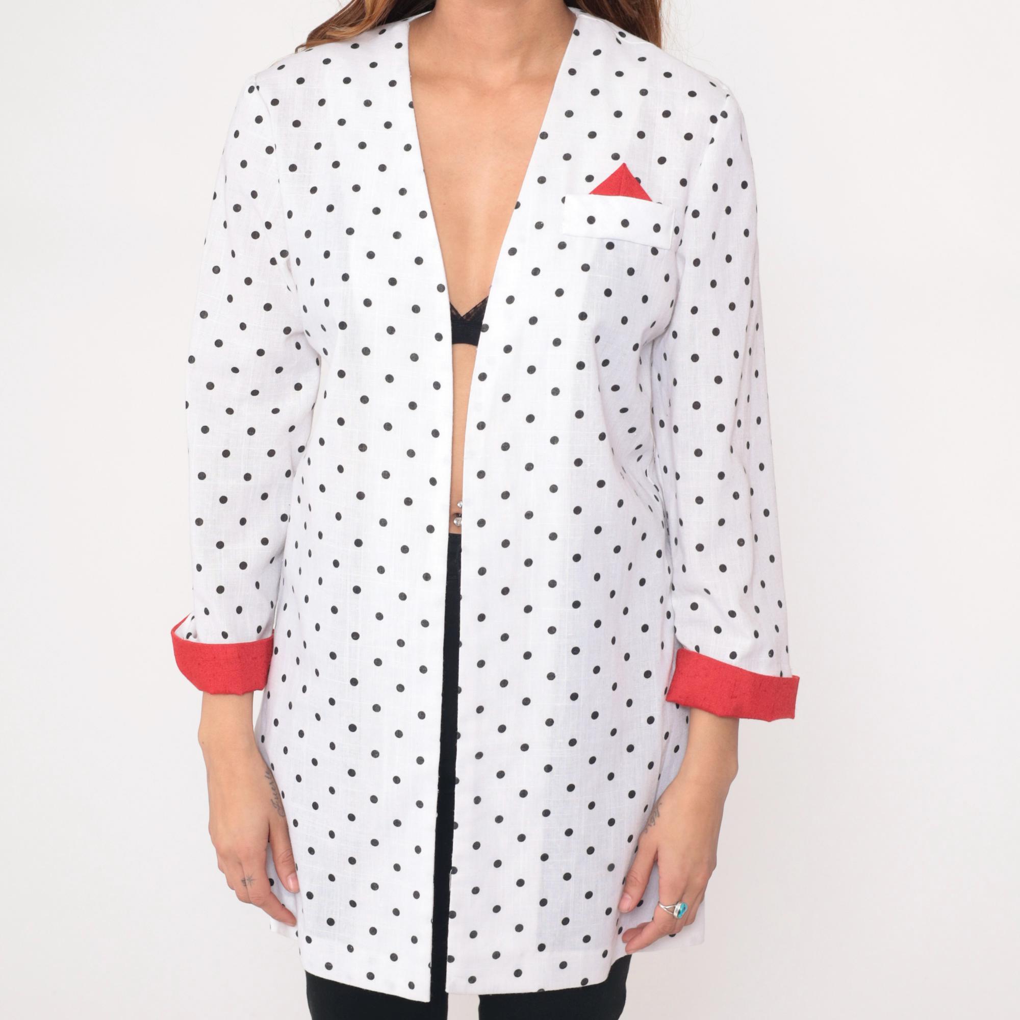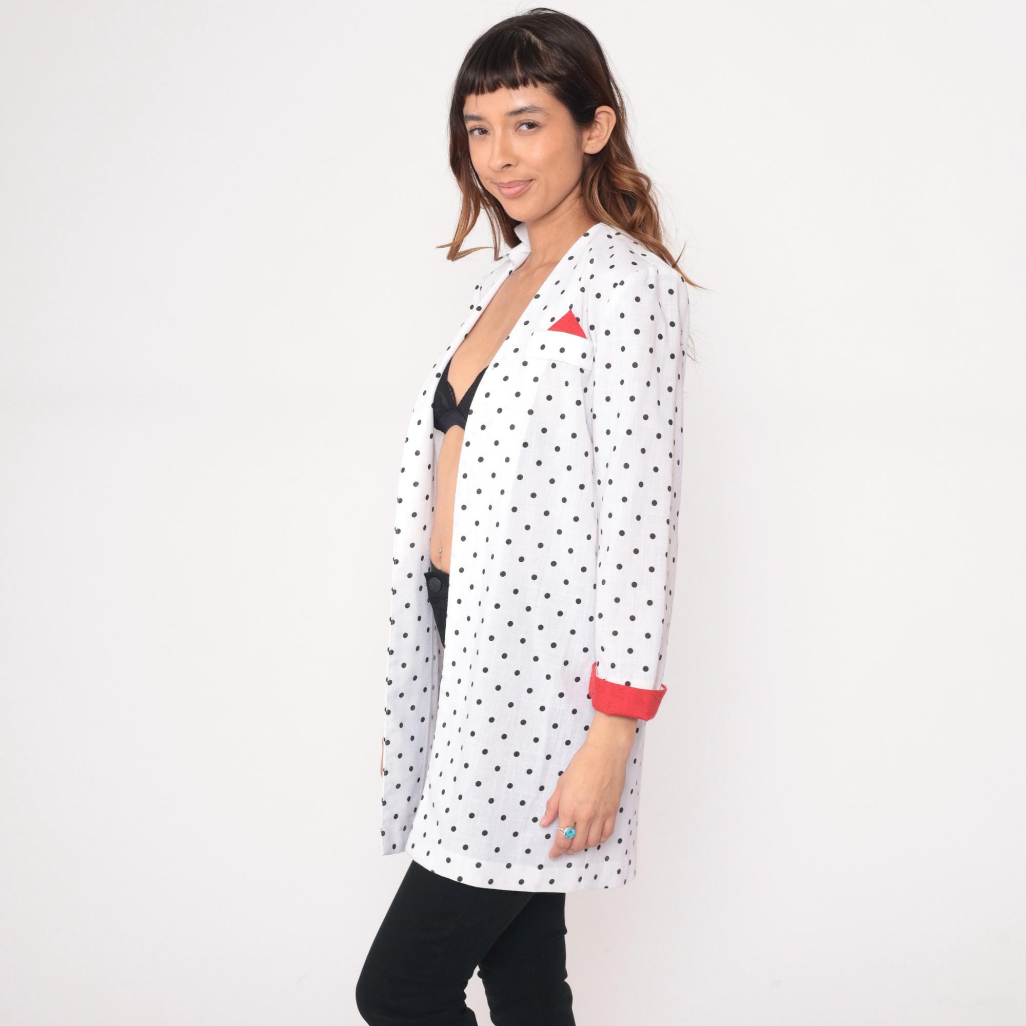 90s white polka dot blazer from Just in Thyme LTD with black dots scattered across the fabric and black piping along the open front edges. Long sleeves with red contrast cuffs, red pocket square detail at chest.