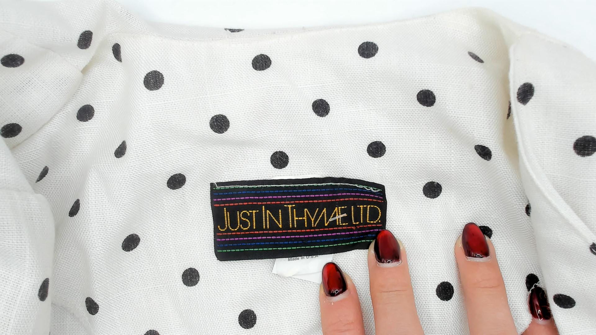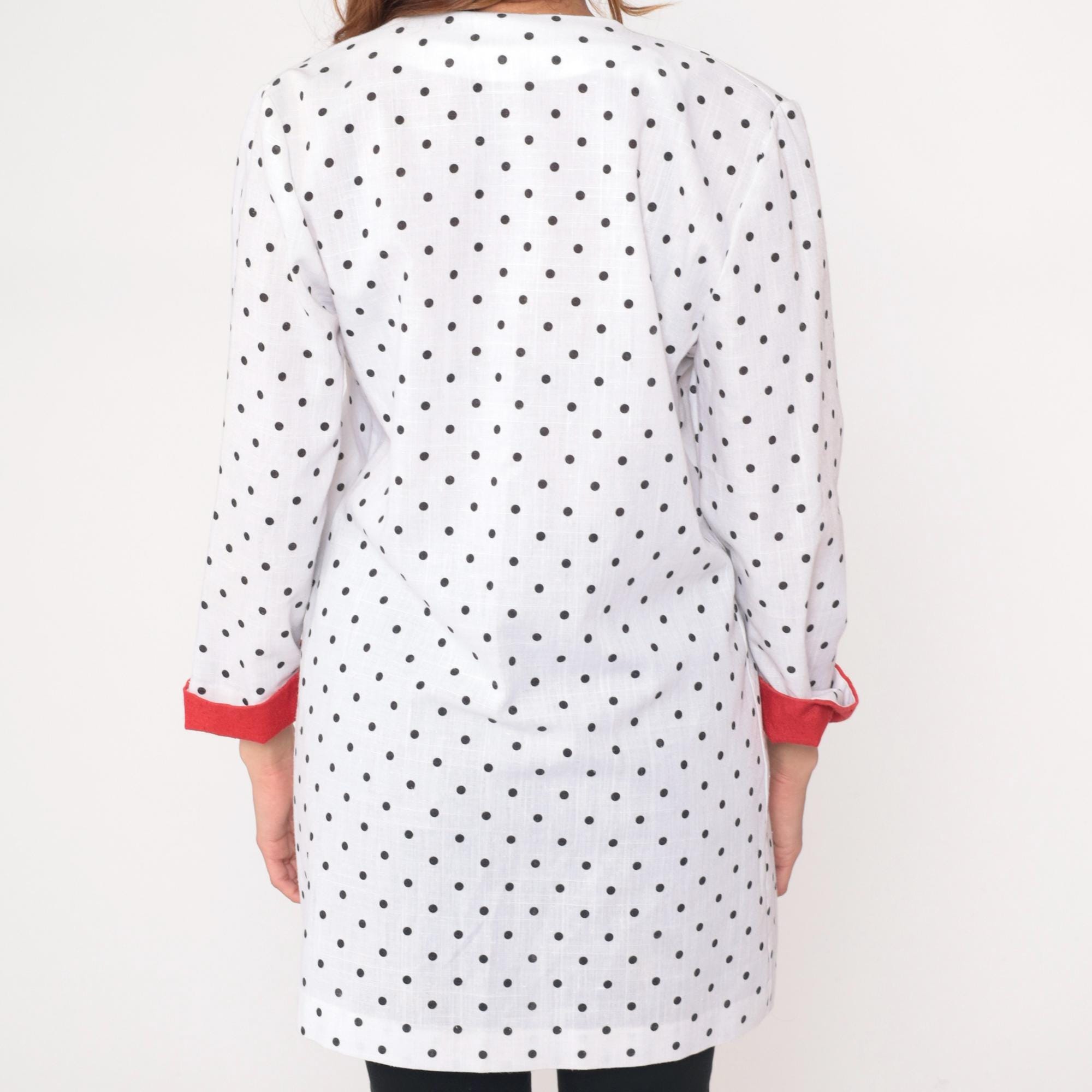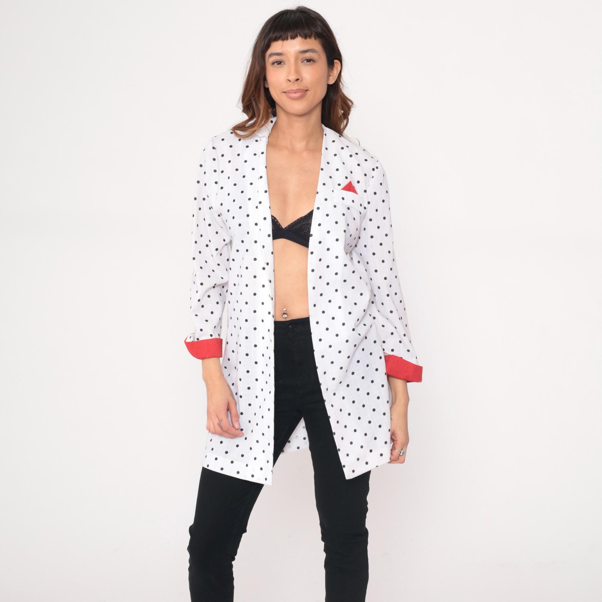 90s white polka dot blazer from Just in Thyme LTD with black dots scattered across the fabric and black piping along the open front edges. Long sleeves with red contrast cuffs, red pocket square detail at chest.