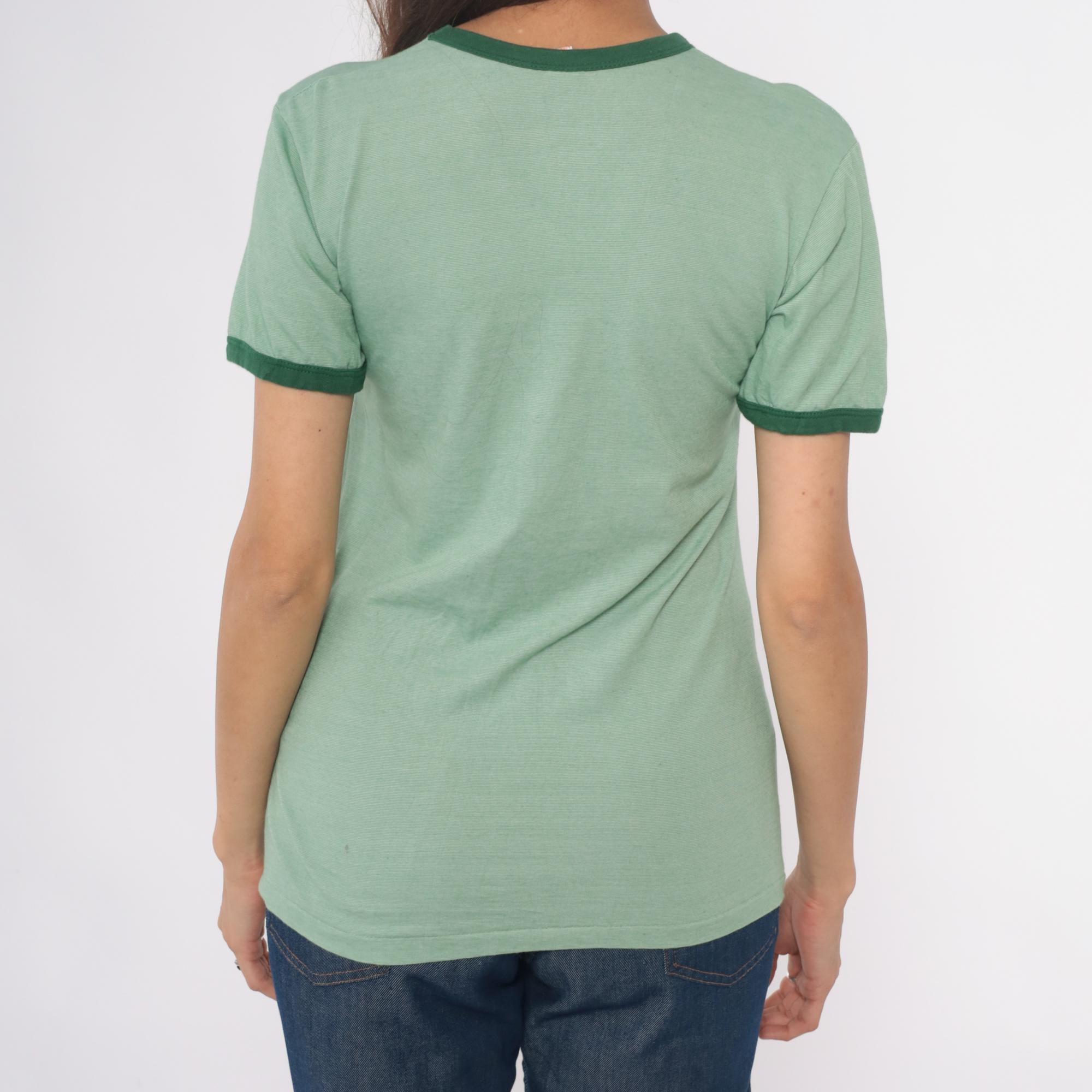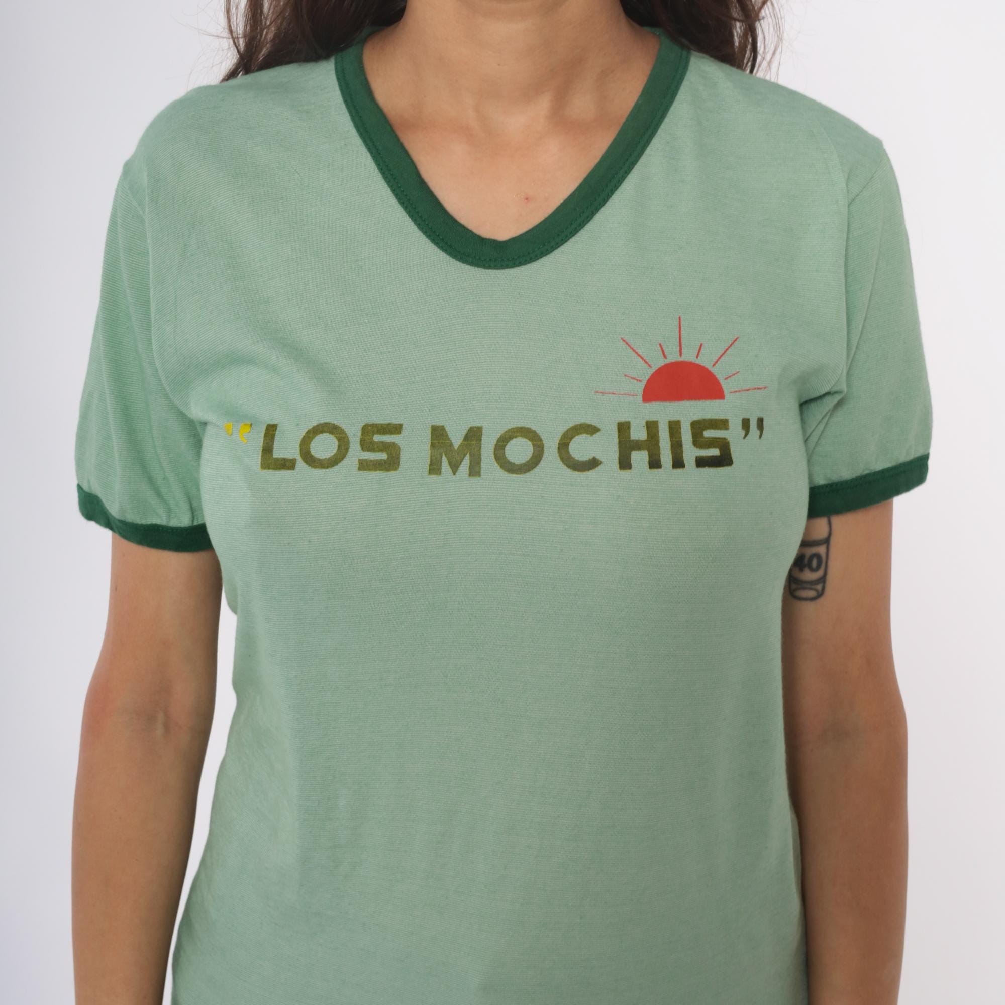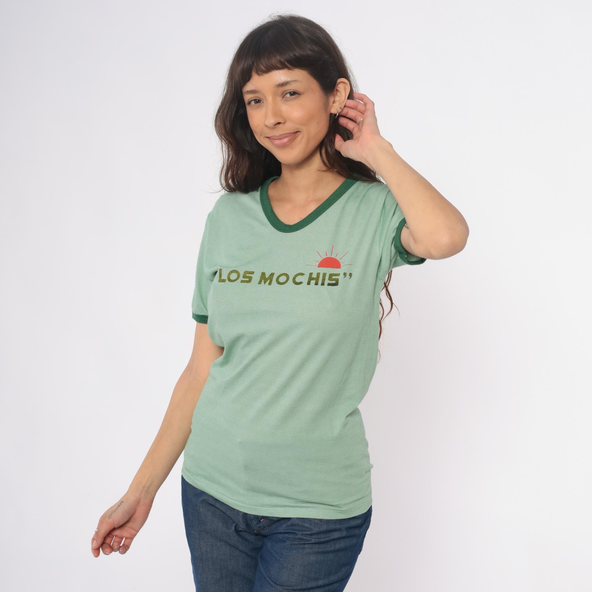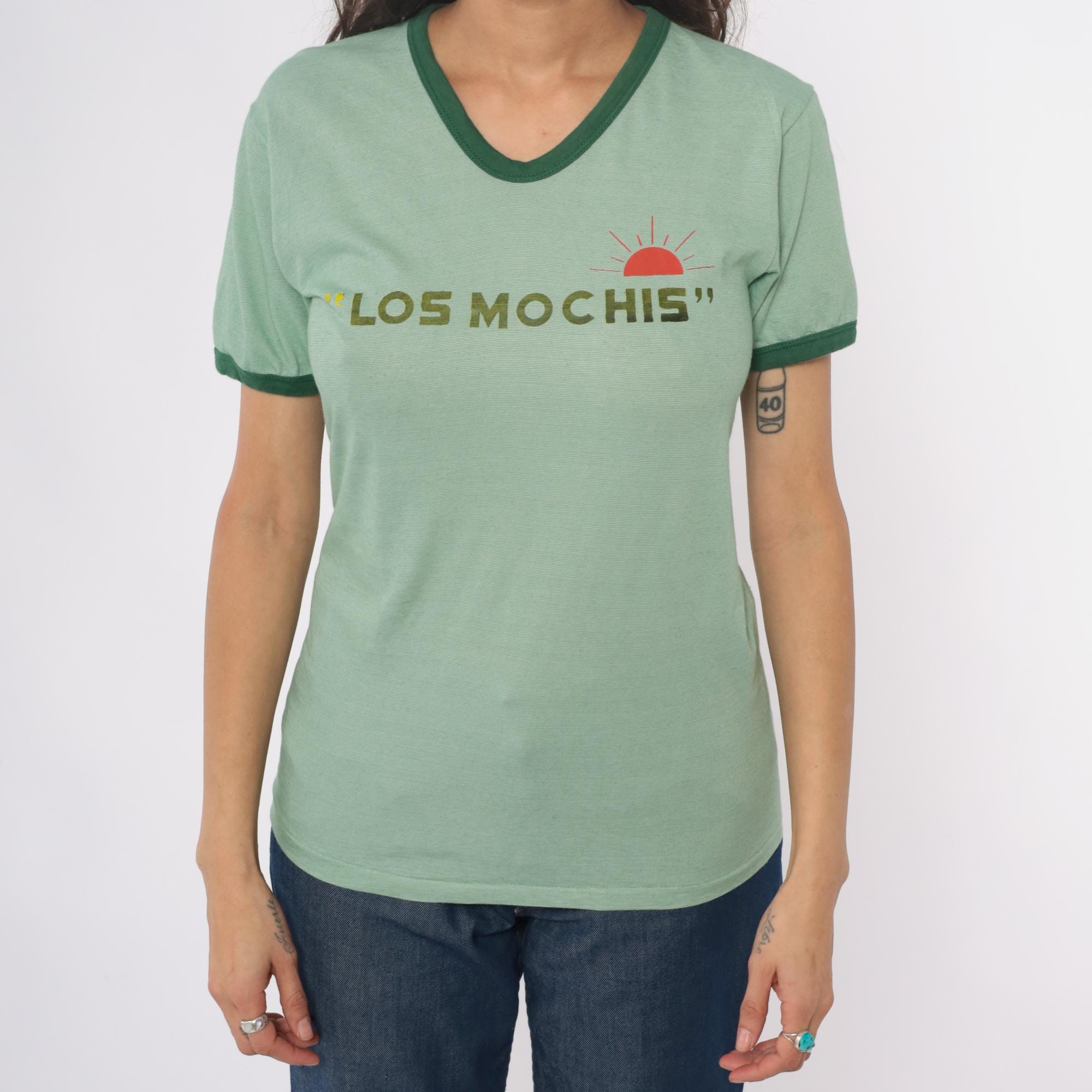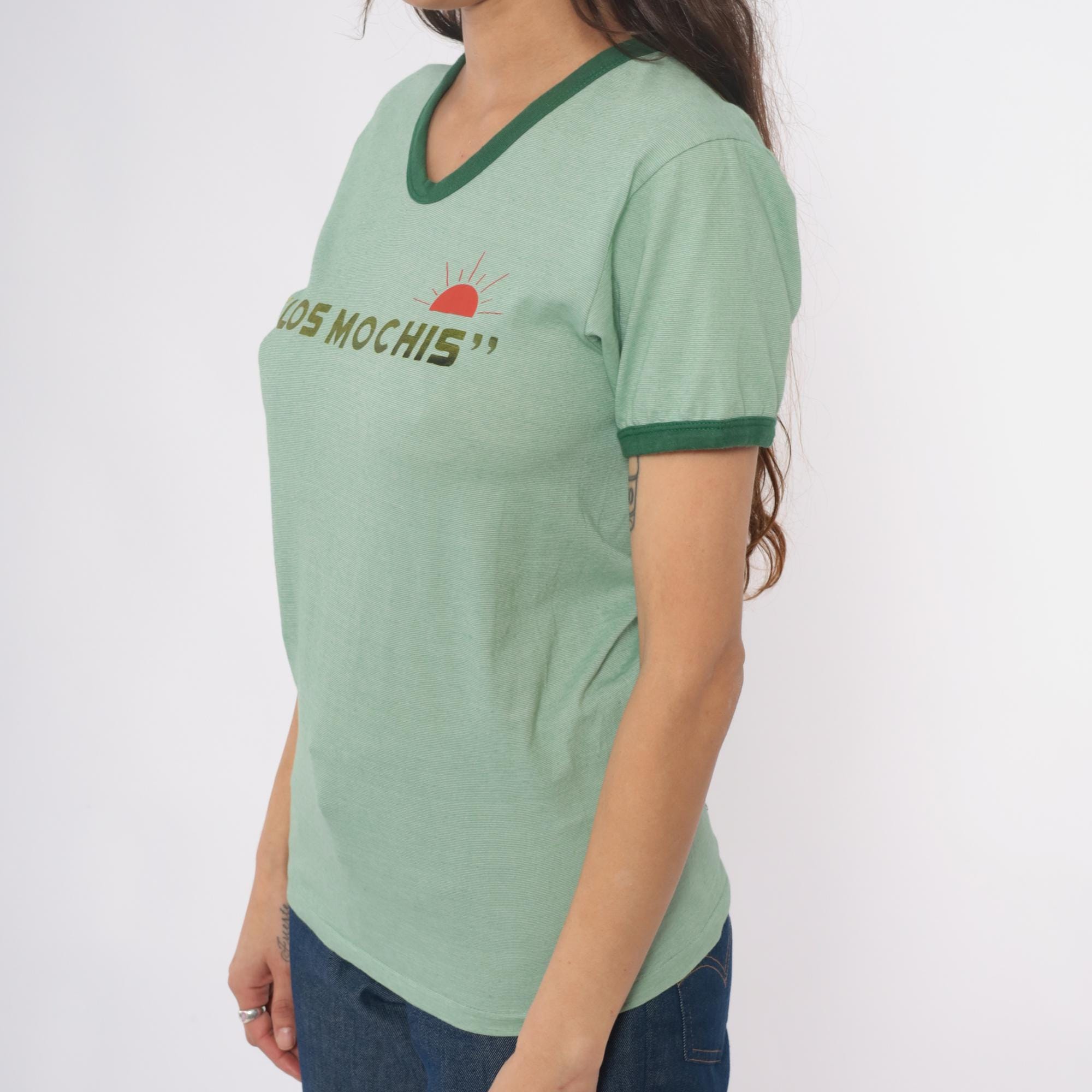 Y2k mint green ringer tee with "Los Mochis" text across the chest in olive lettering and red semicircle sun graphic with radiating lines. Ringer neck and short sleeves with contrasting dark green trim.