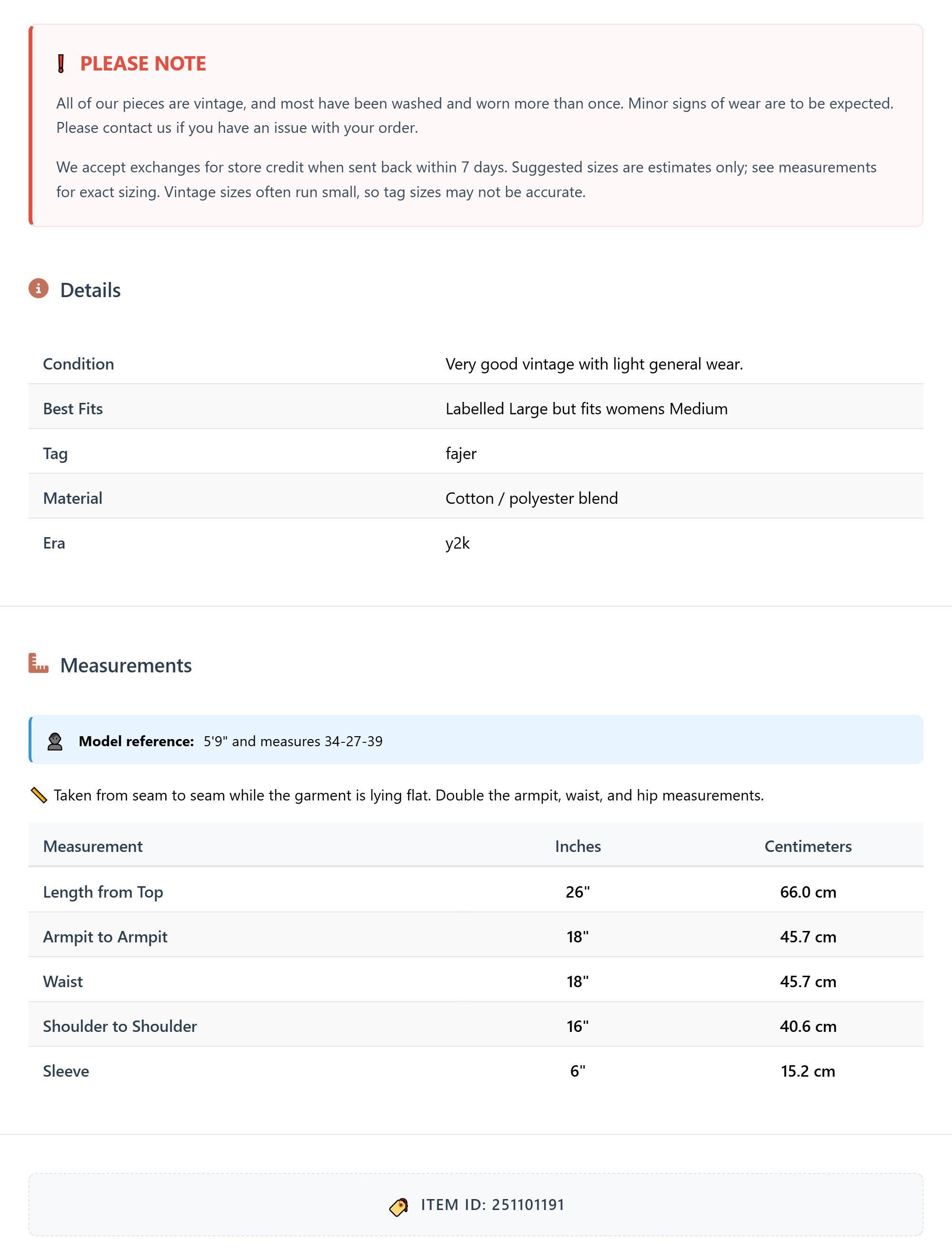 All of our pieces are vintage, and most have been washed and worn more than once. Minor signs of wear are to be expected. Please contact us if you have an issue with your order. We accept exchanges for store credit when sent back within 7 days.